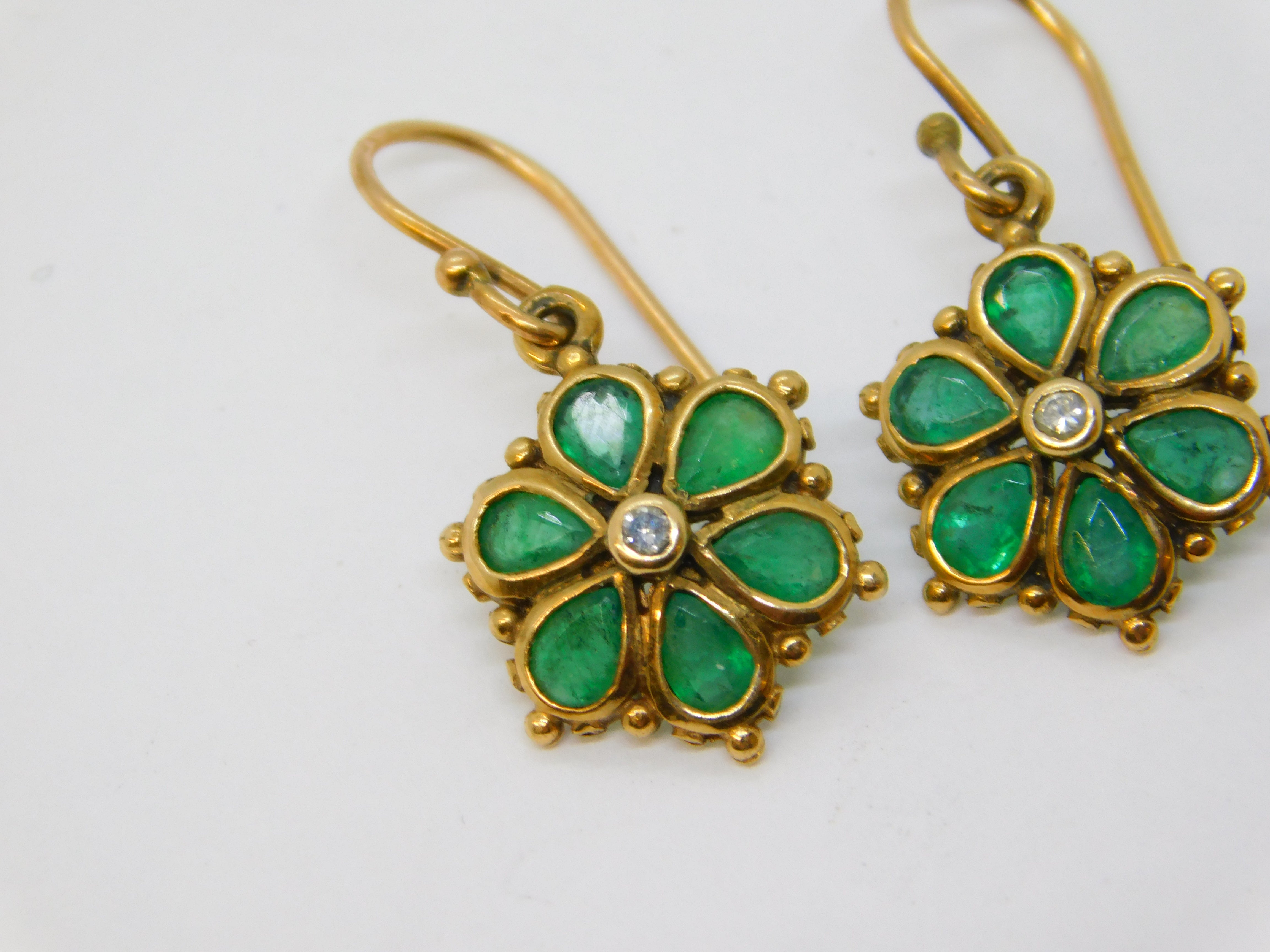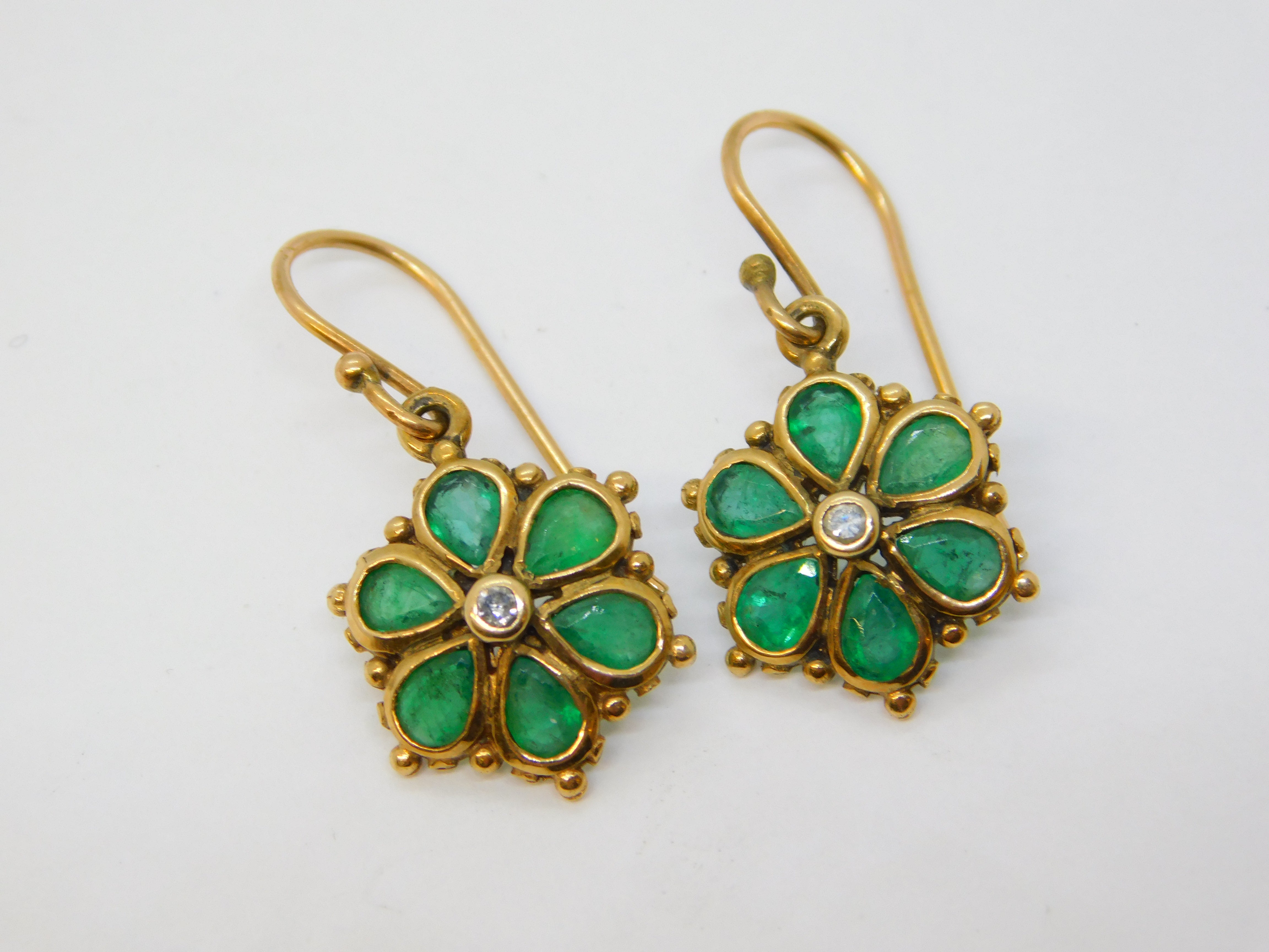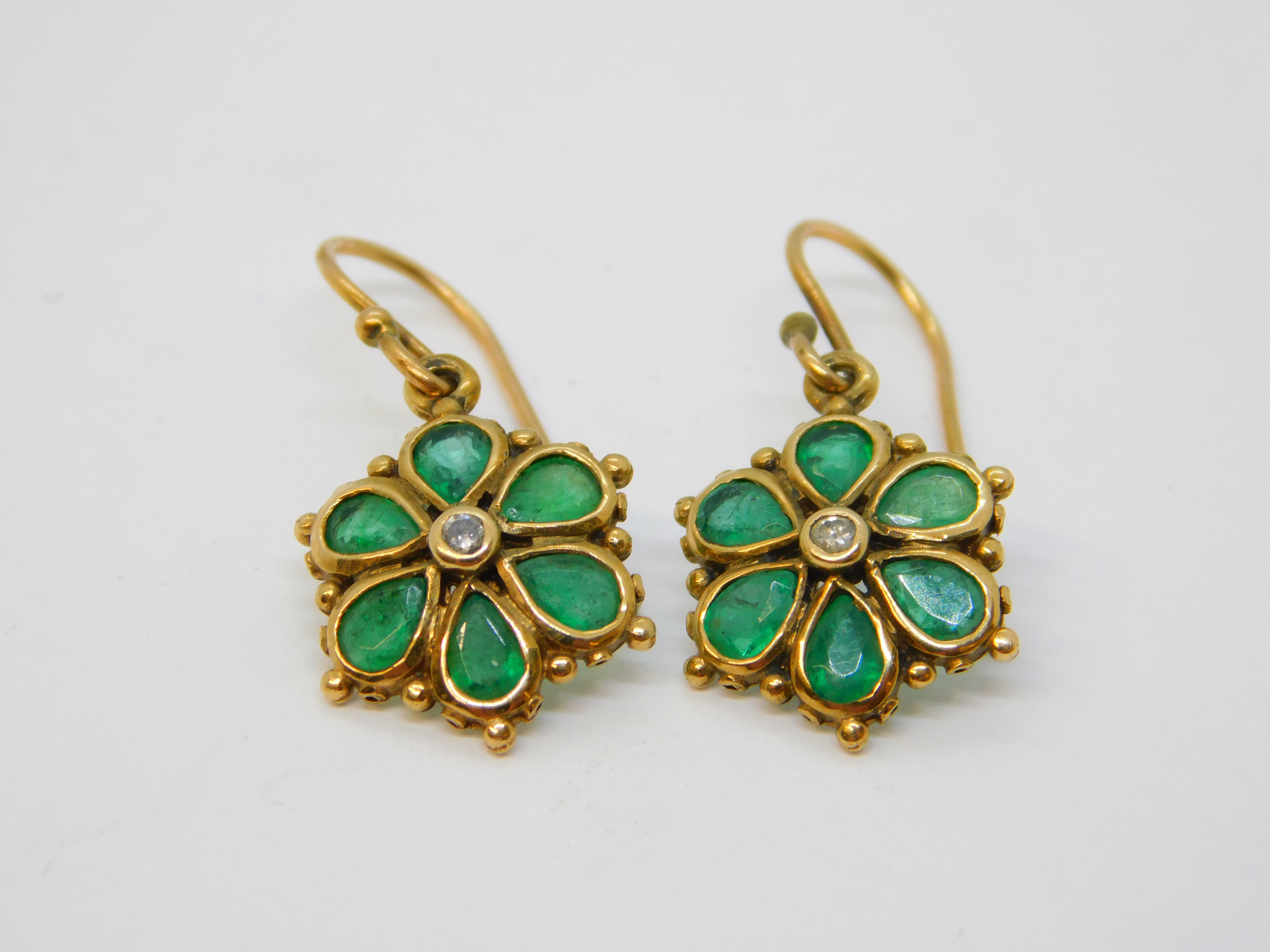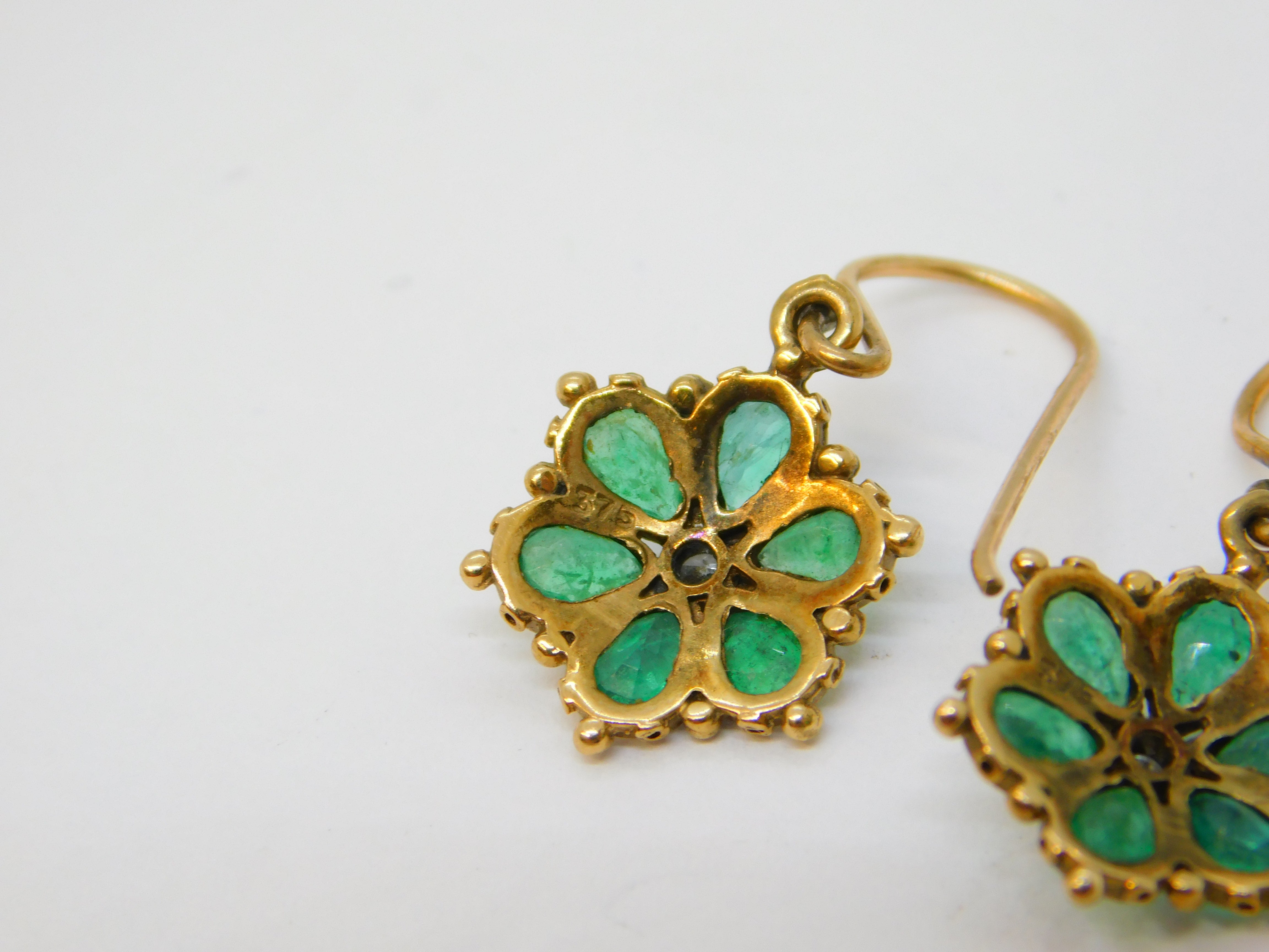 Details: A fantastic and wonderfully designed antique edwardian 9ct yellow gold pair of floral drop earrings set with green emeralds around a central diamond, hallmarked to the reverse and XRF tested c1910. This is a wonderful item that would make a perfect gift or addition to any collection. We are more than happy to provide XRF reports for items upon request.
