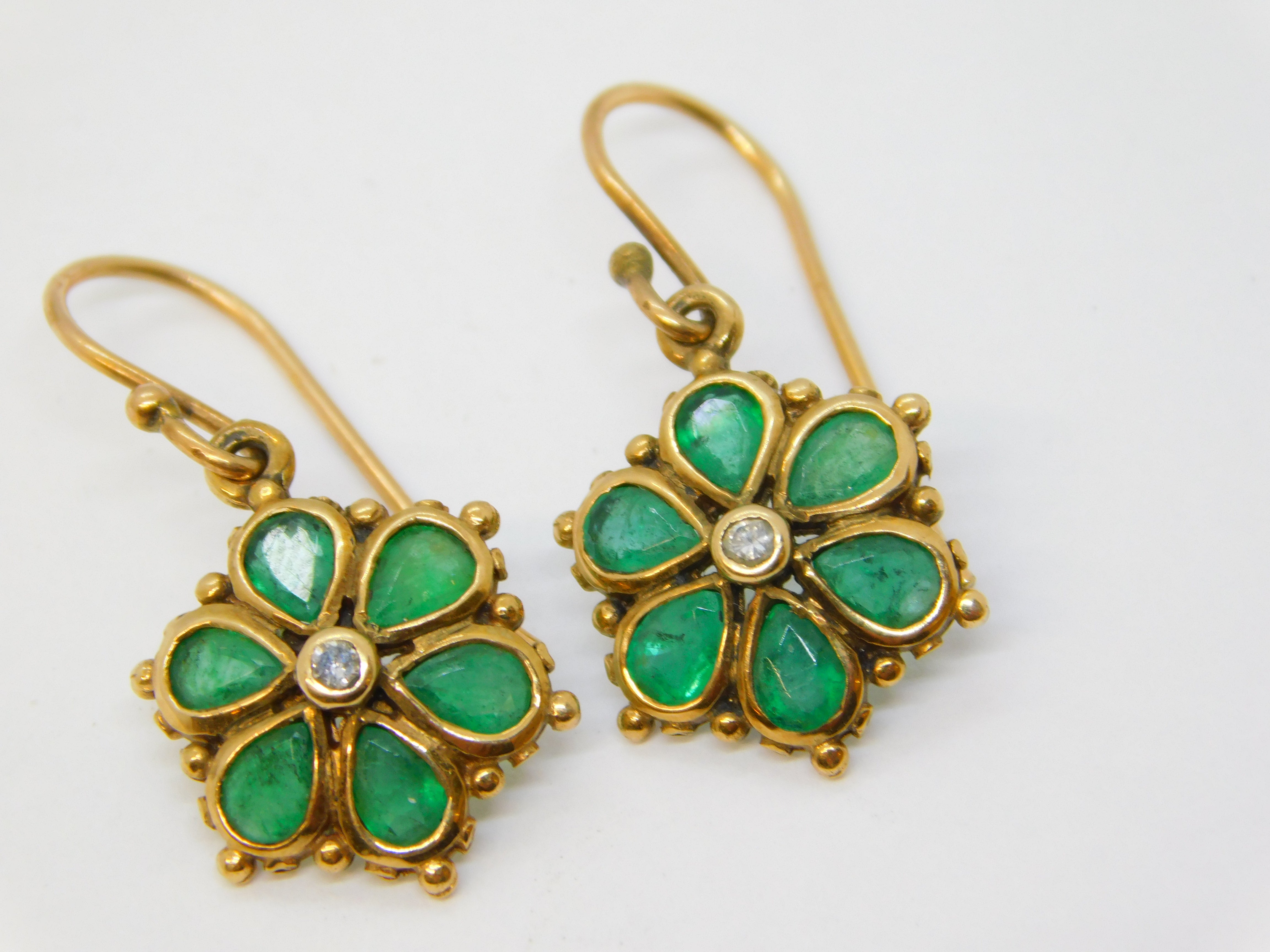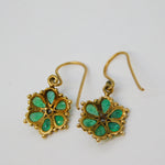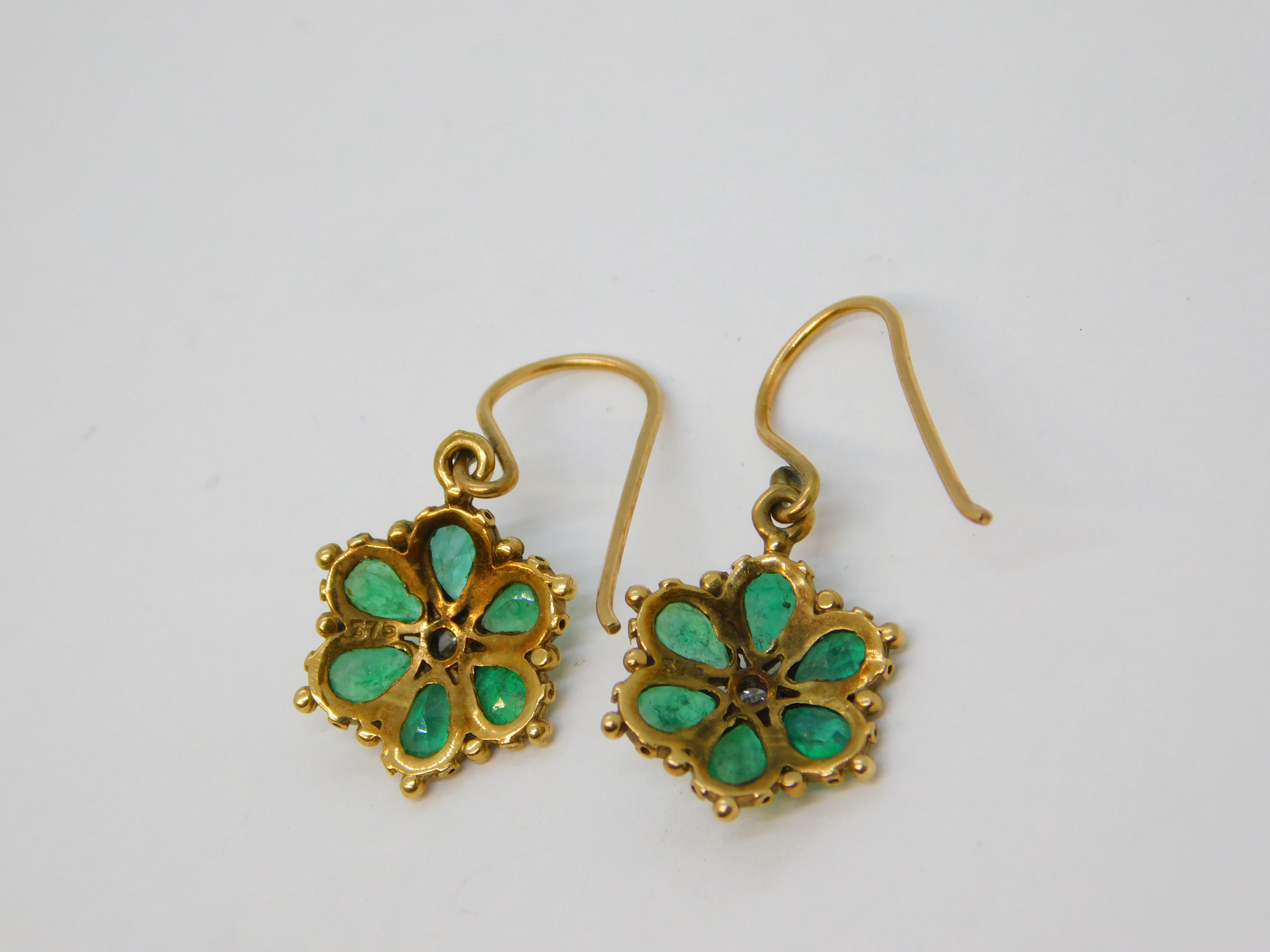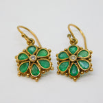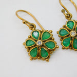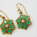 Edwardian 9ct Yellow Gold, Emerald & Diamond Floral Hook Earrings Antique c1910