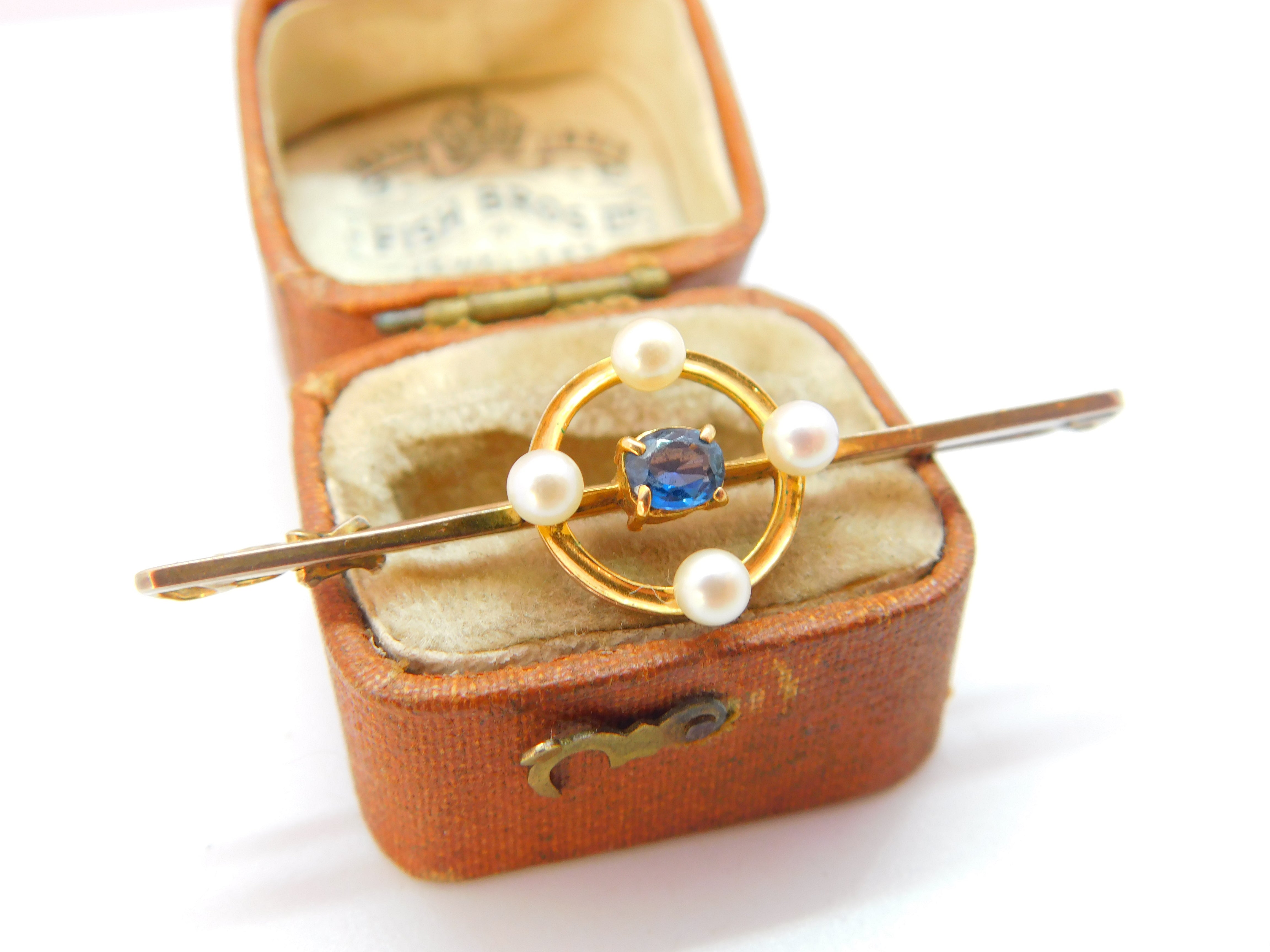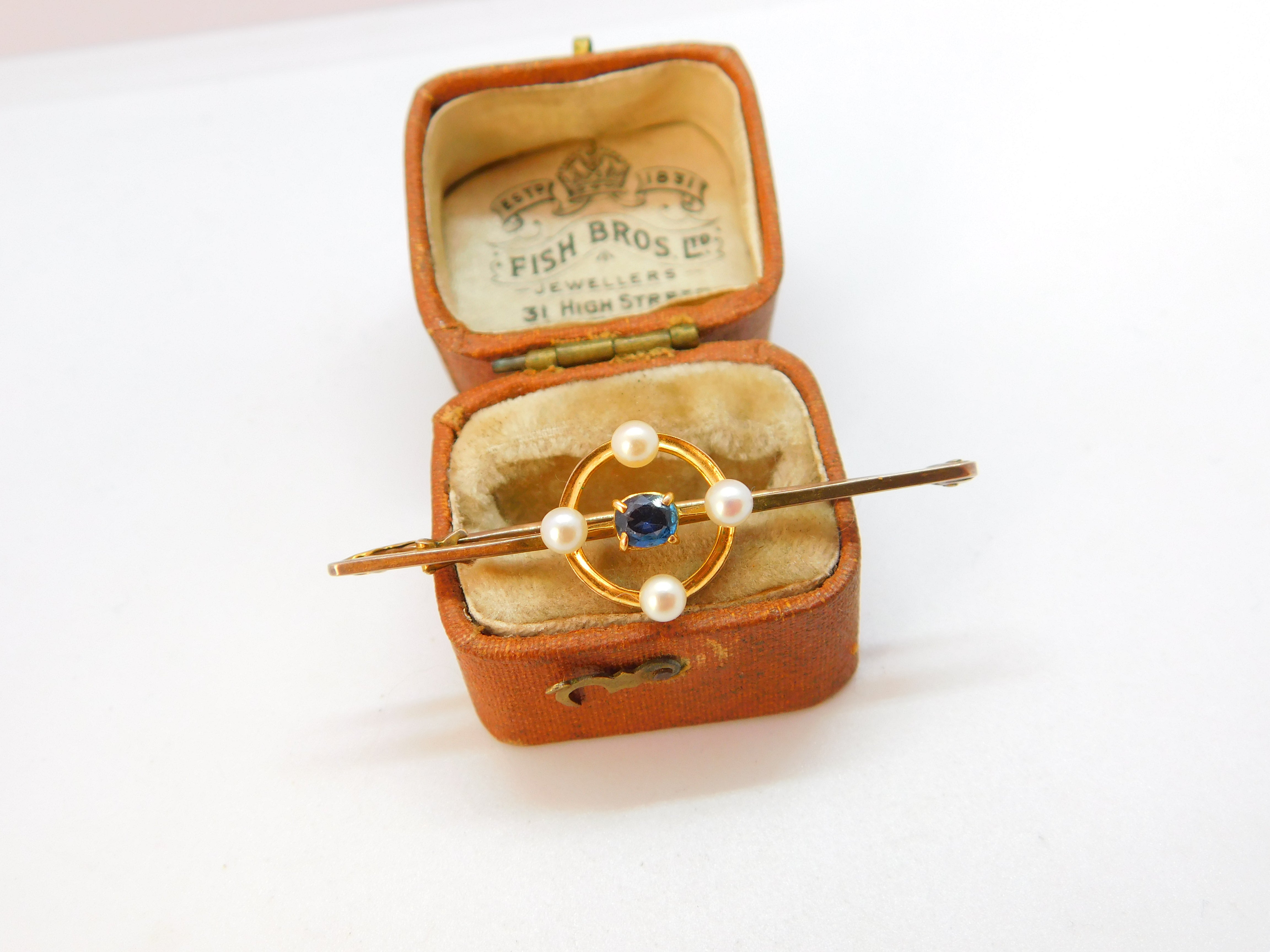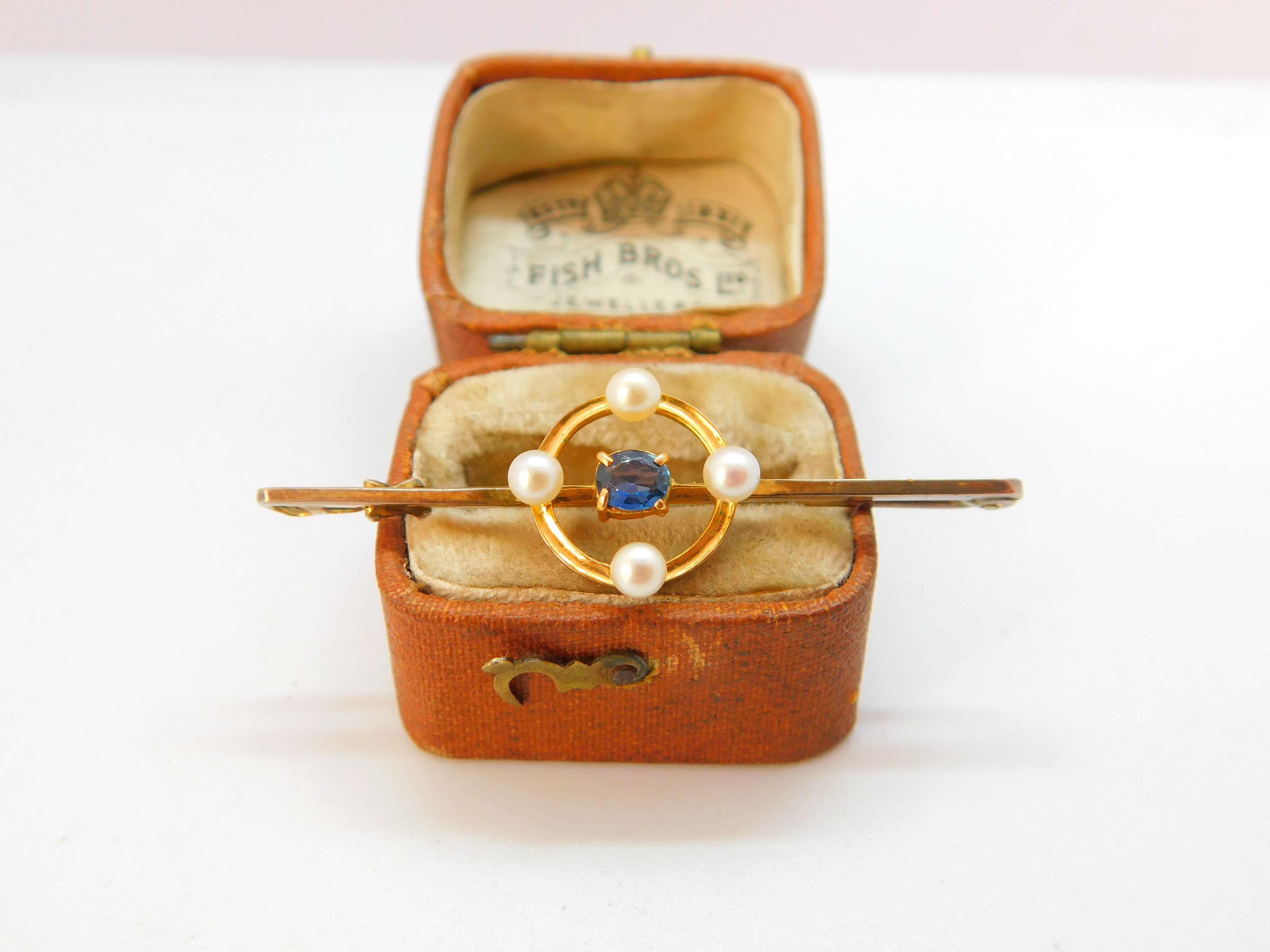 Details: A fantastic and wonderfully designed antique Edwardian 9ct yellow gold bar brooch set with pearls around a central sapphire hallmarked 9ct to the reverse c1910. This is a wonderful item that would make a perfect gift or addition to any collection. The BOX pictured is for PRESENTATION ONLY and is NOT included in the listings but used to frame the pictures unless specifically stated otherwise.