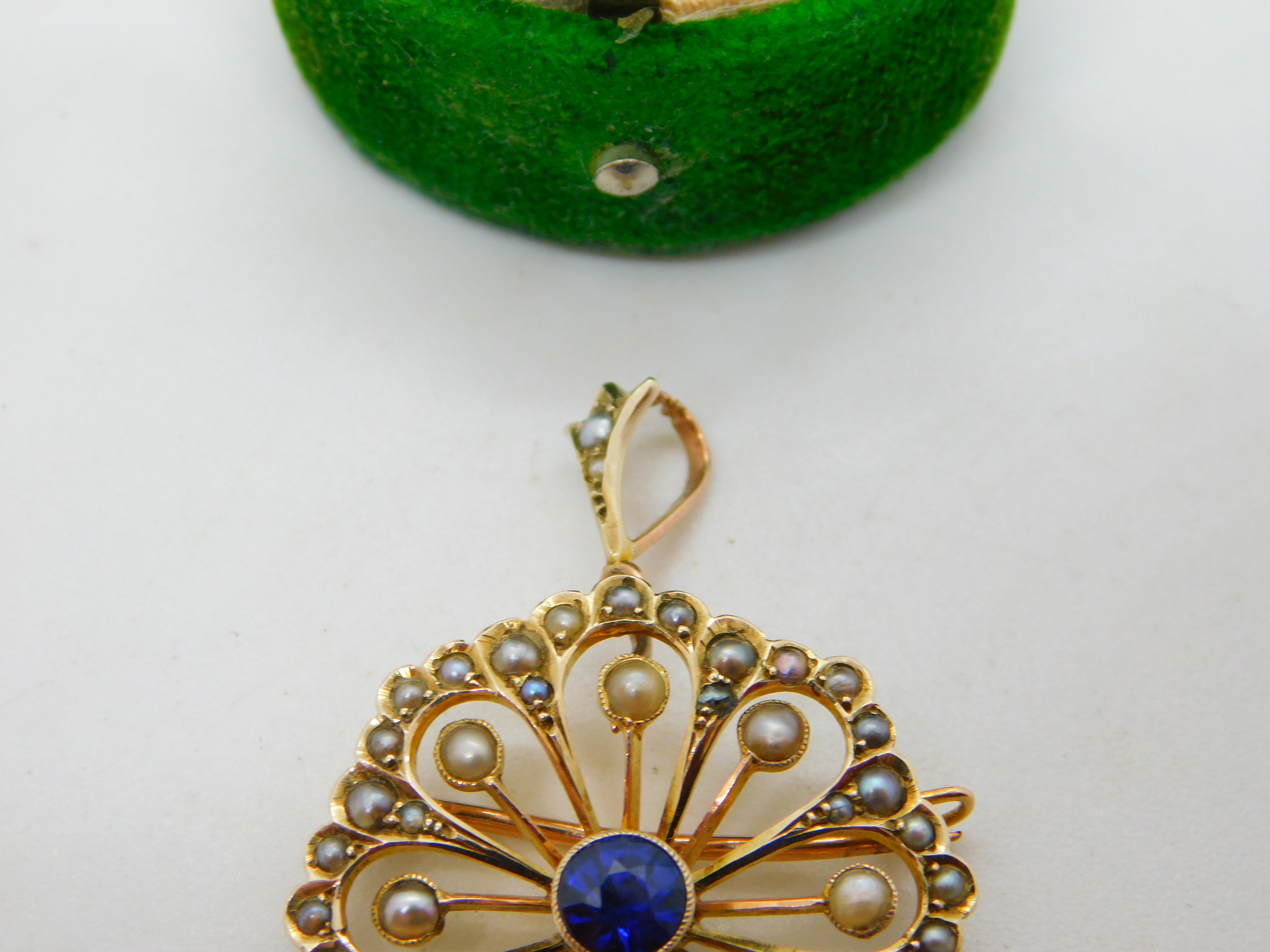 Details: A fantastic and wonderfully designed antique Edwardian 9ct yellow gold floral drop pendant or brooch set with central sapphire surrounded by seed pearls hallmarked to the reverse c1910. This is a wonderful item that would make a perfect gift or addition to any collection. The BOX pictured is for PRESENTATION ONLY and is NOT included in the listings but used to frame the pictures unless specifically stated otherwise.