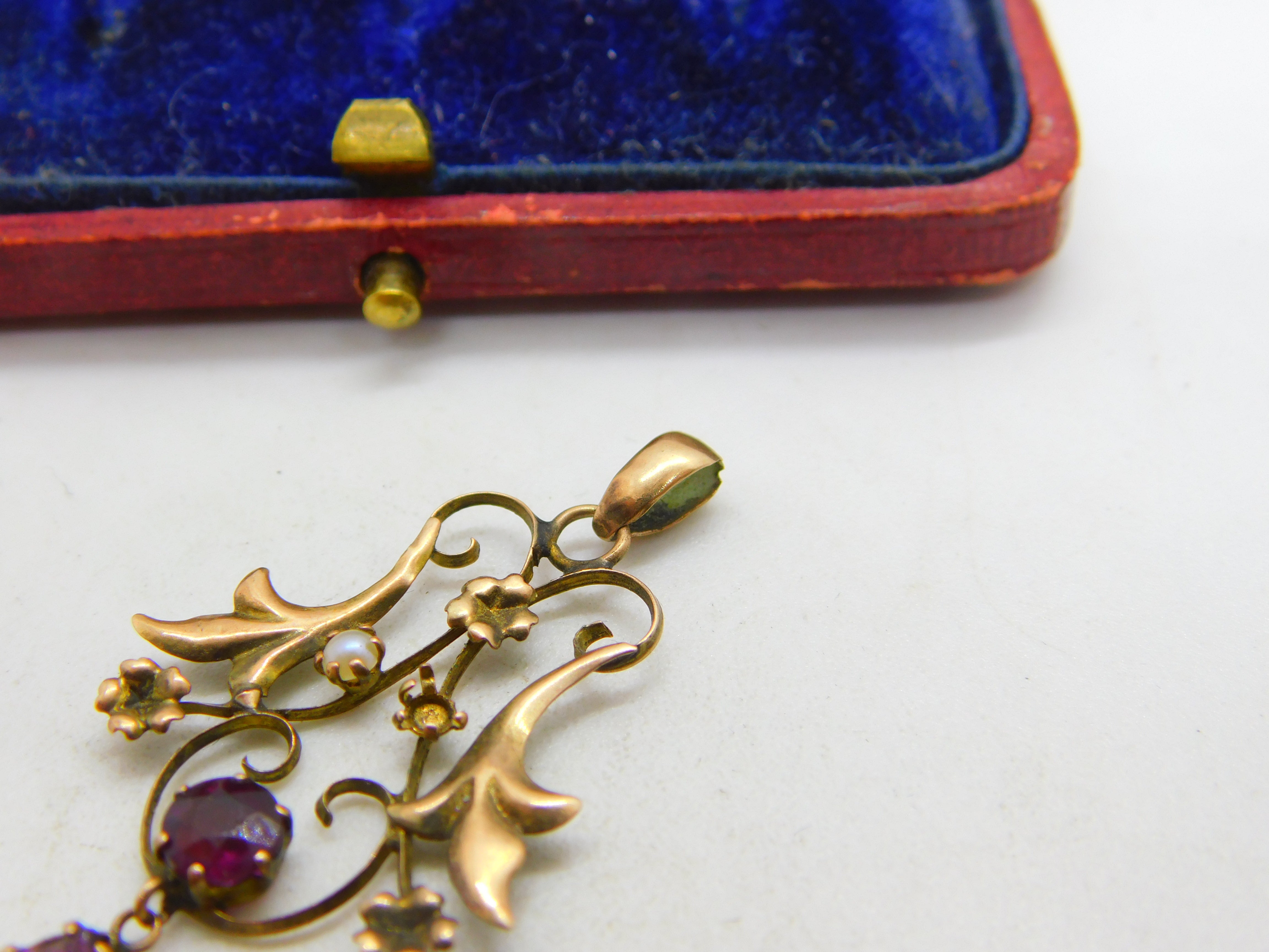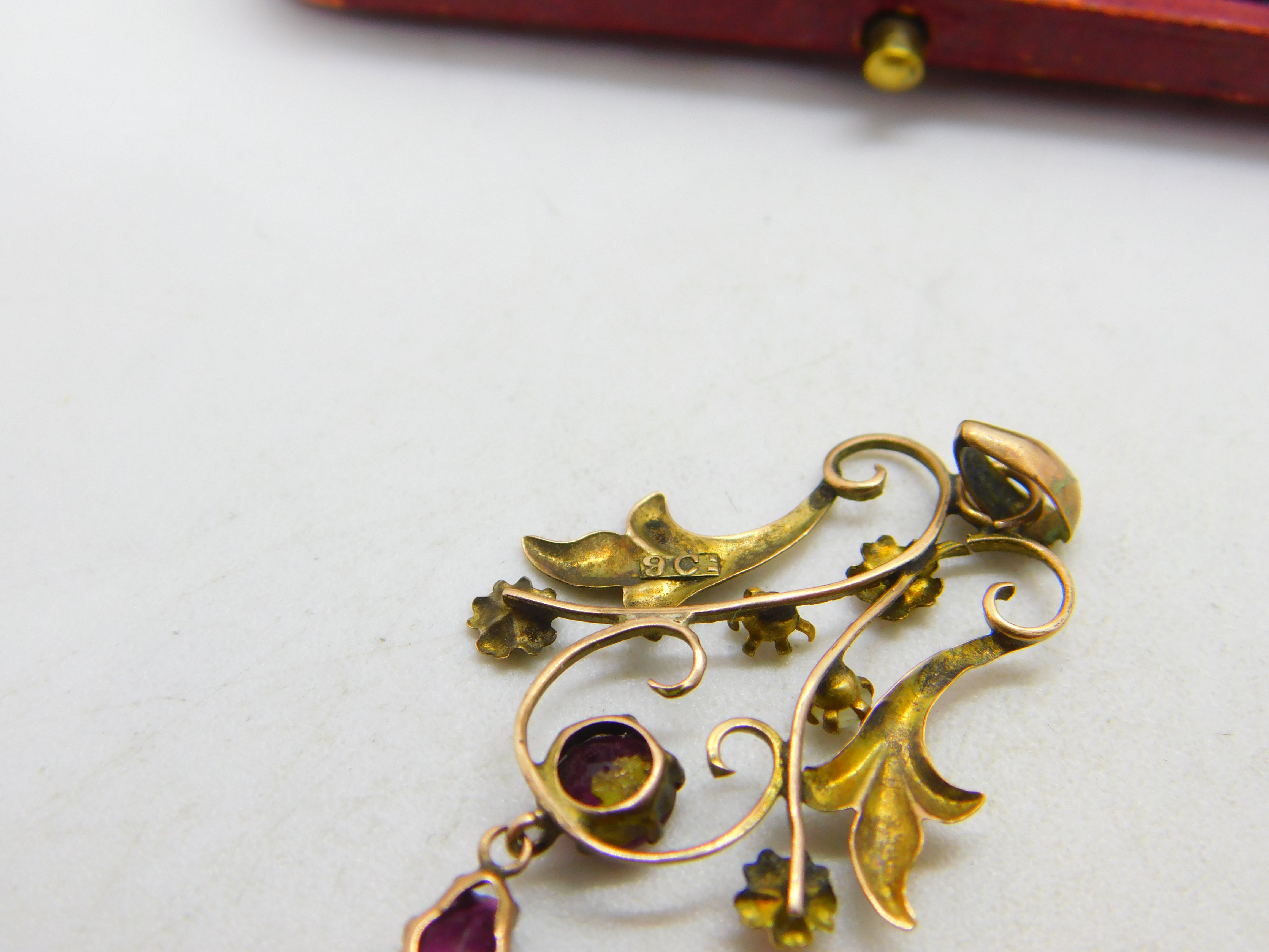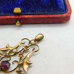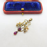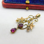 Details: A fantastic and wonderfully designed antique Edwardian 9ct yellow gold lavalier drop pendant set with garnets & seed pearls hallmarked to the reverse c1910. Missing one seed pearl please note. This is a wonderful item that would make a perfect gift or addition to any collection. The BOX pictured is for PRESENTATION ONLY and is NOT included in the listings but used to frame the pictures unless specifically stated otherwise.
