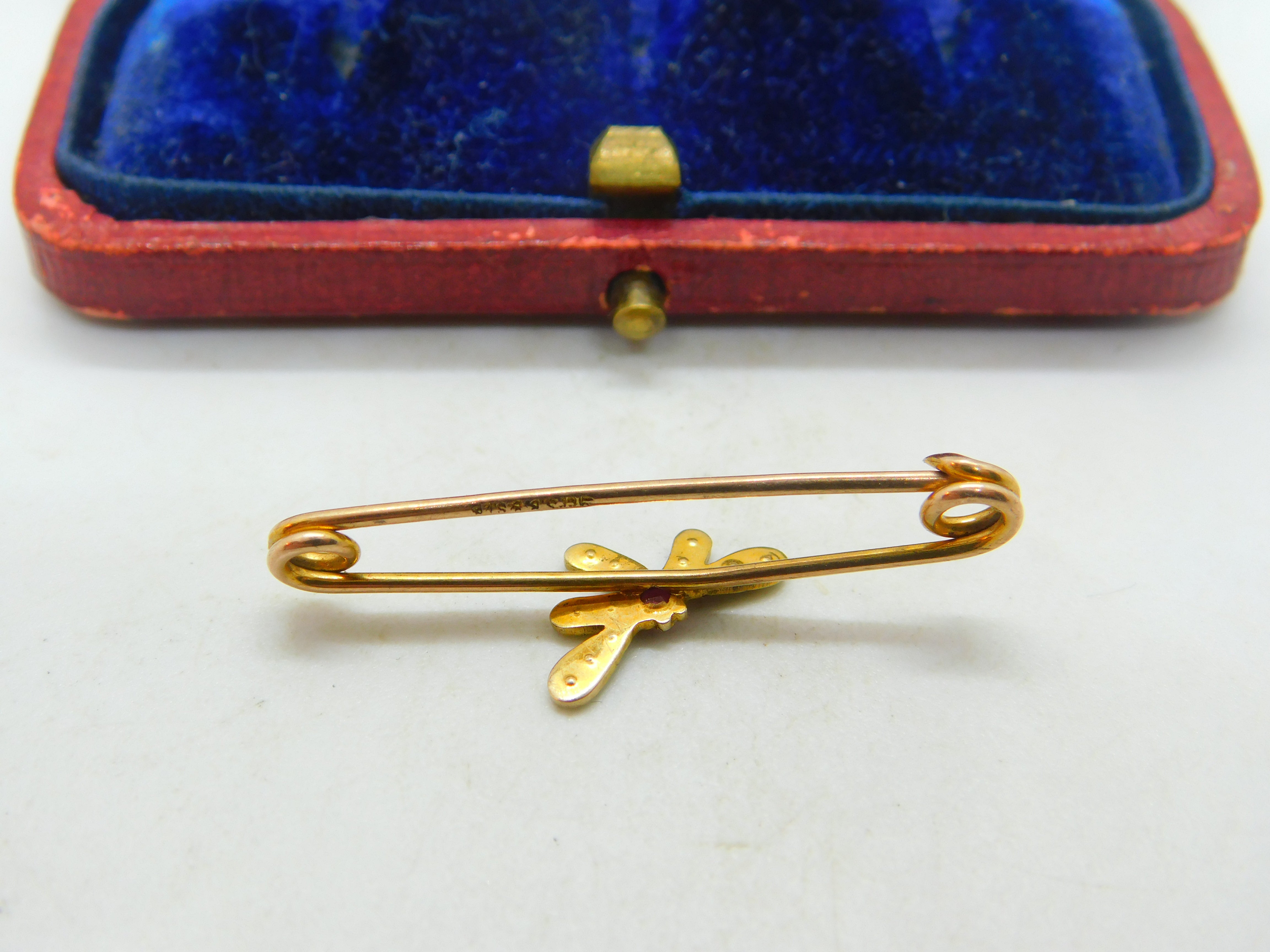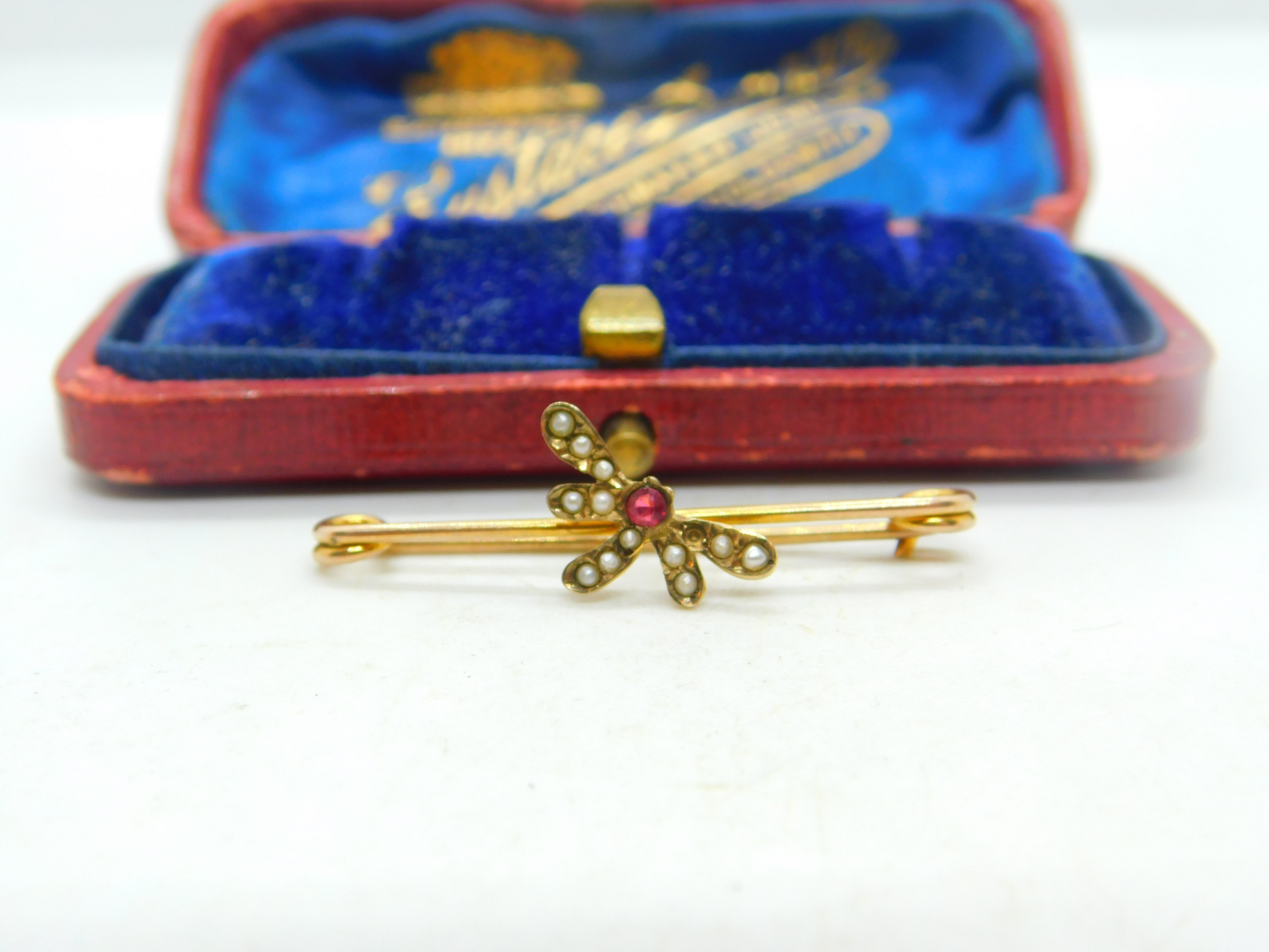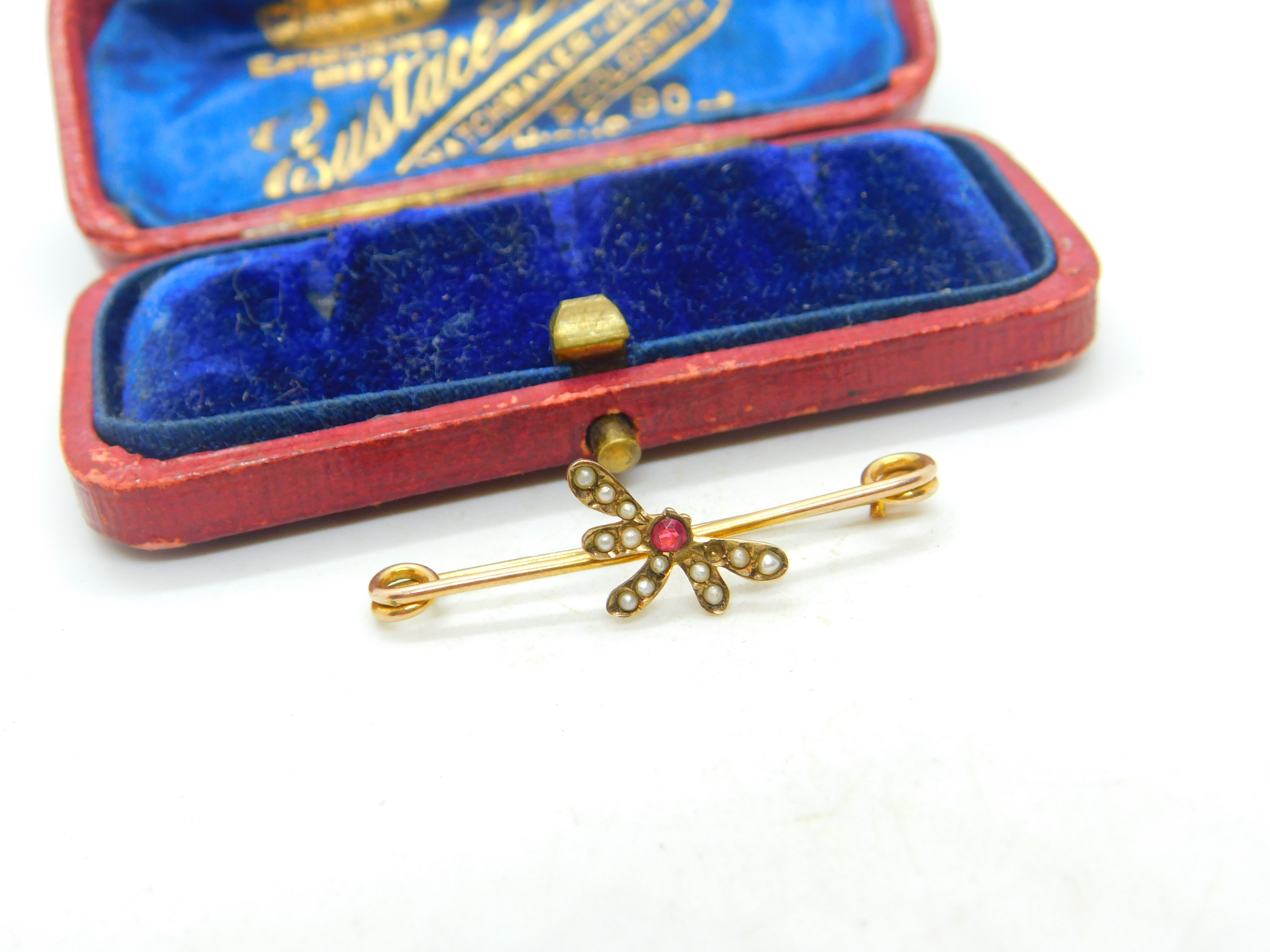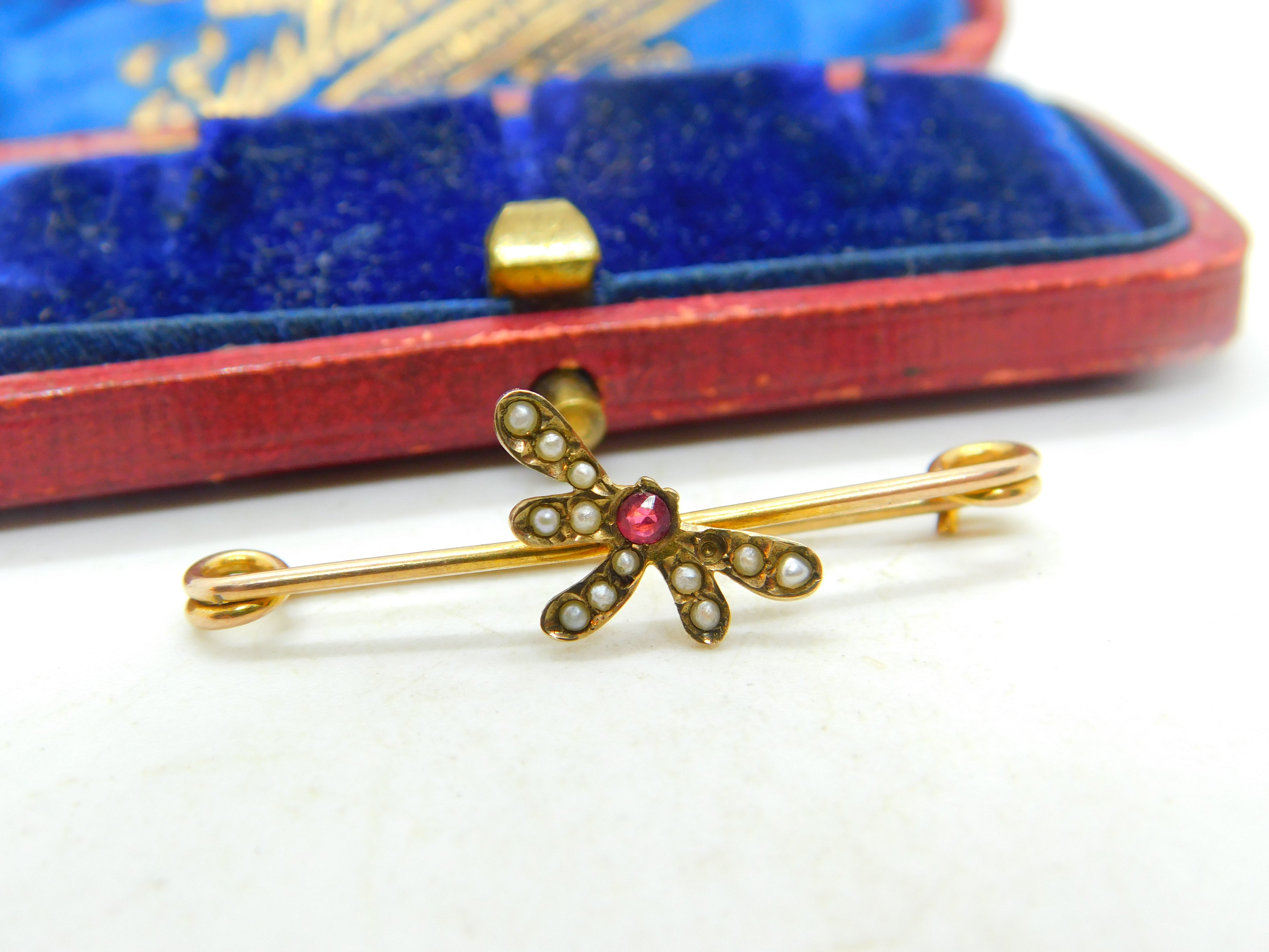 Edwardian 9ct Yellow Gold, Seed Pearl & Garnet Dragonfly Brooch Antique c1910