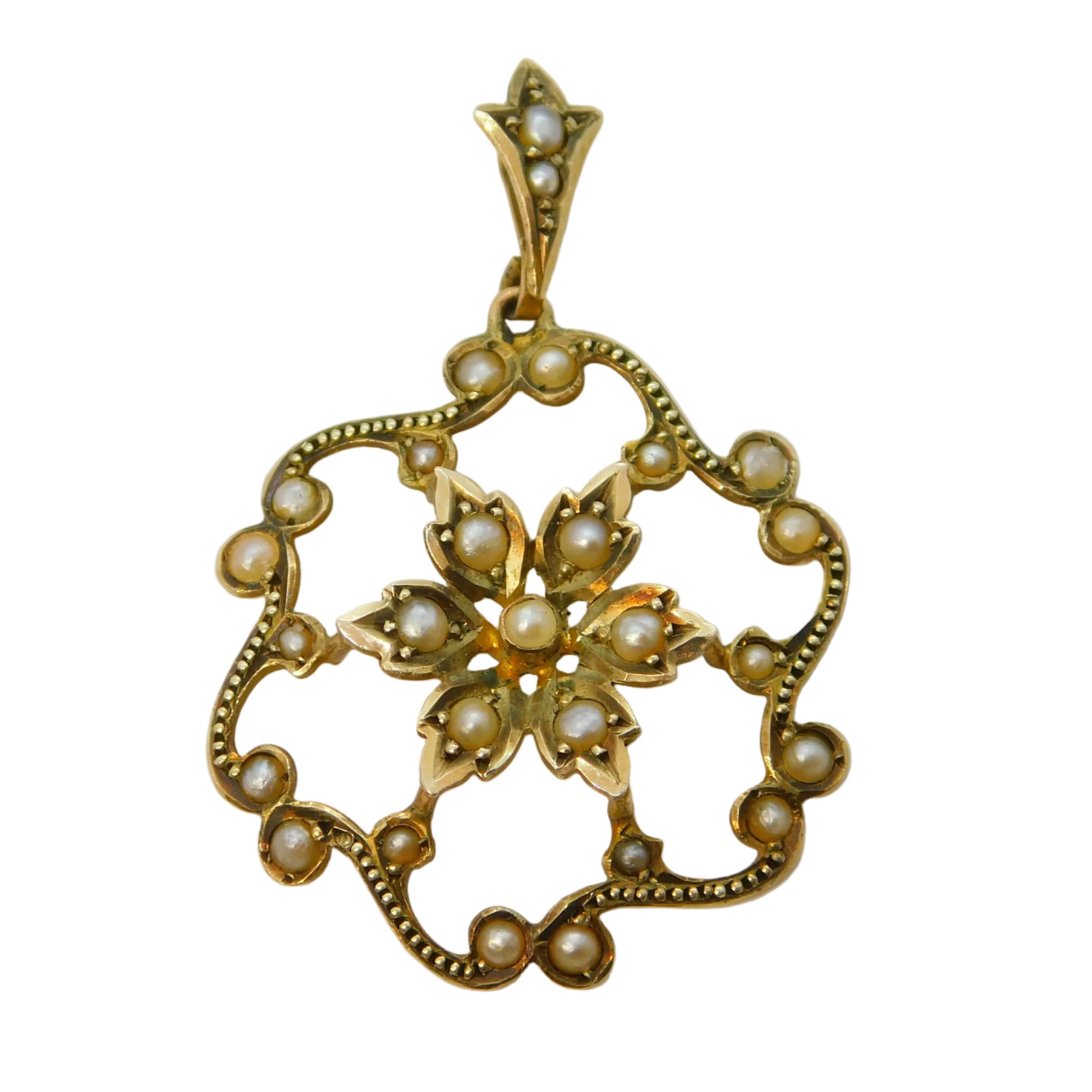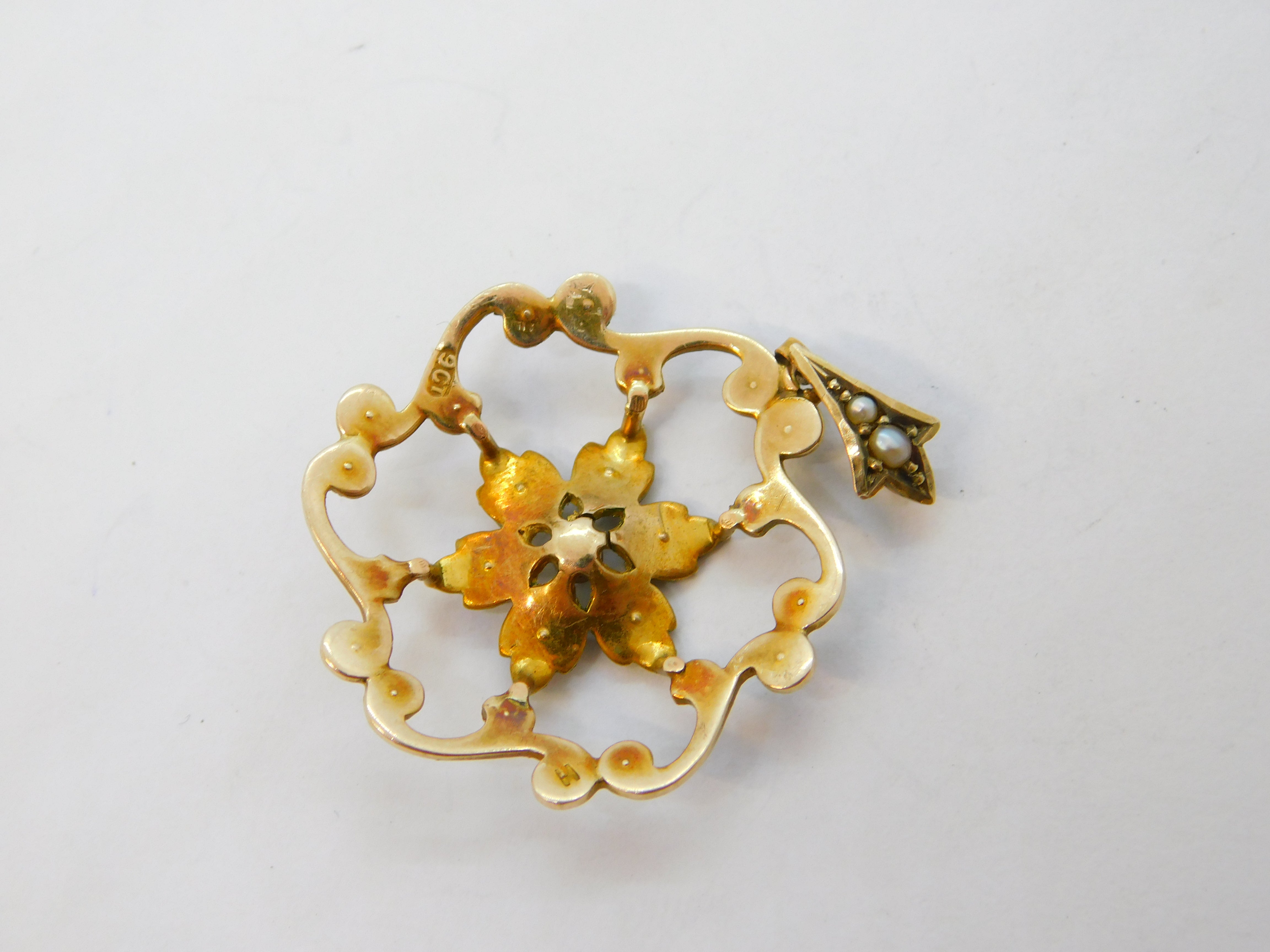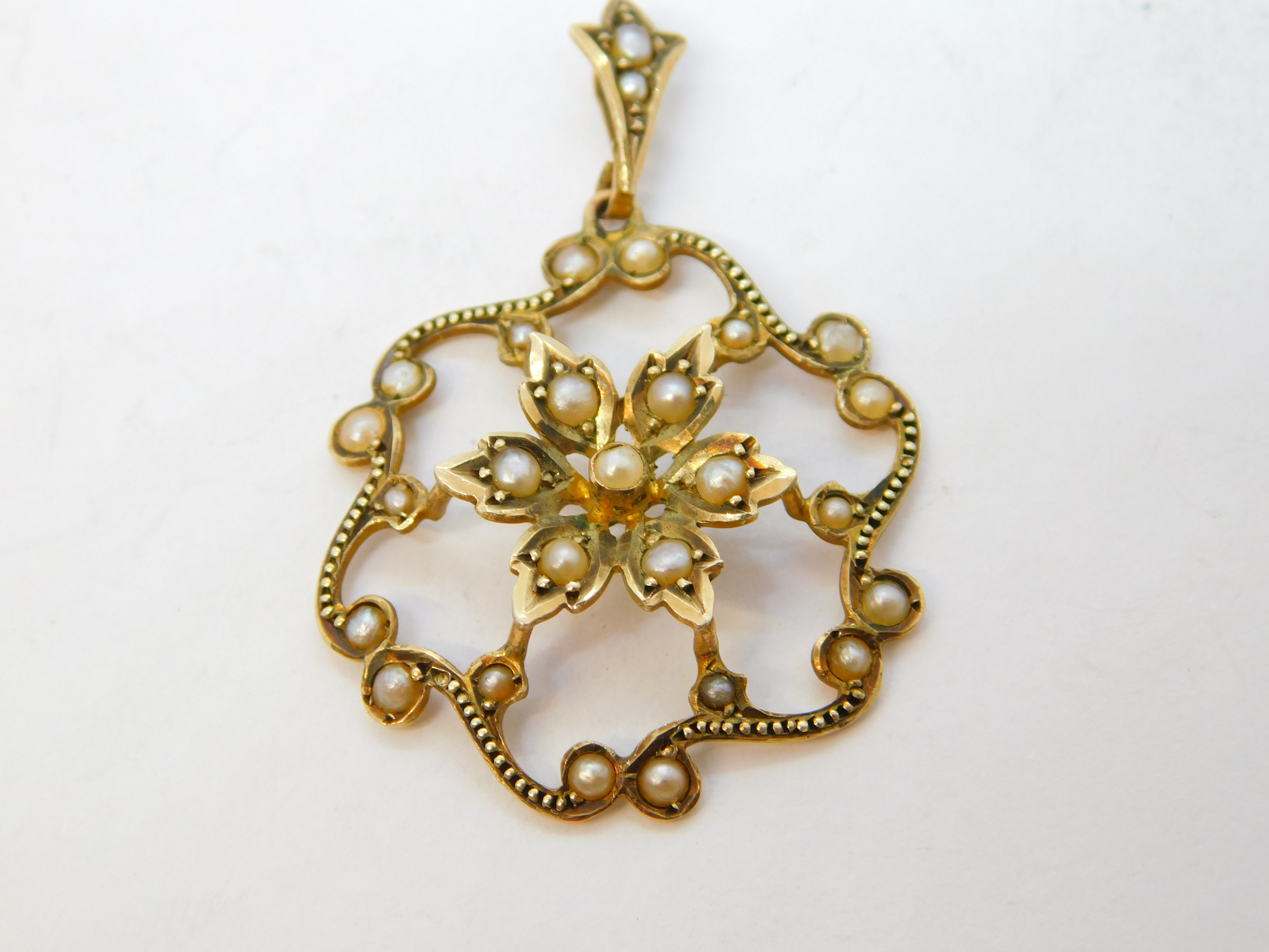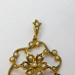 Edwardian 9ct Yellow Gold & Seed Pearl Set Floral Pendant Antique c1910