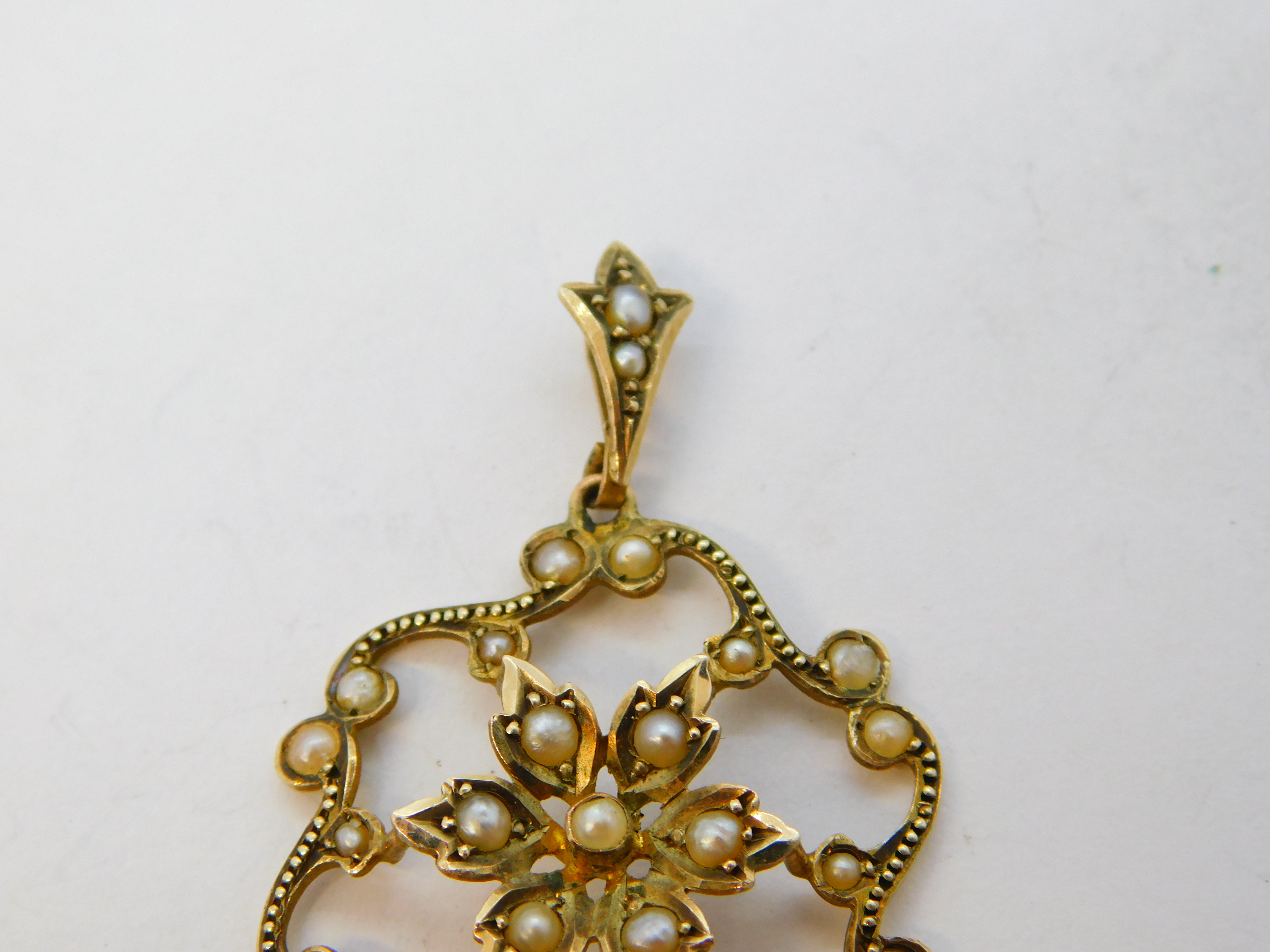 Details: A fantastic and wonderfully designed antique edwardian 9ct yellow gold & seed pearl set lavalier drop pendant hallmarked to the reverse c1910. This is a wonderful item that would make a perfect gift or addition to any collection. We are more than happy to provide XRF reports for items upon request.