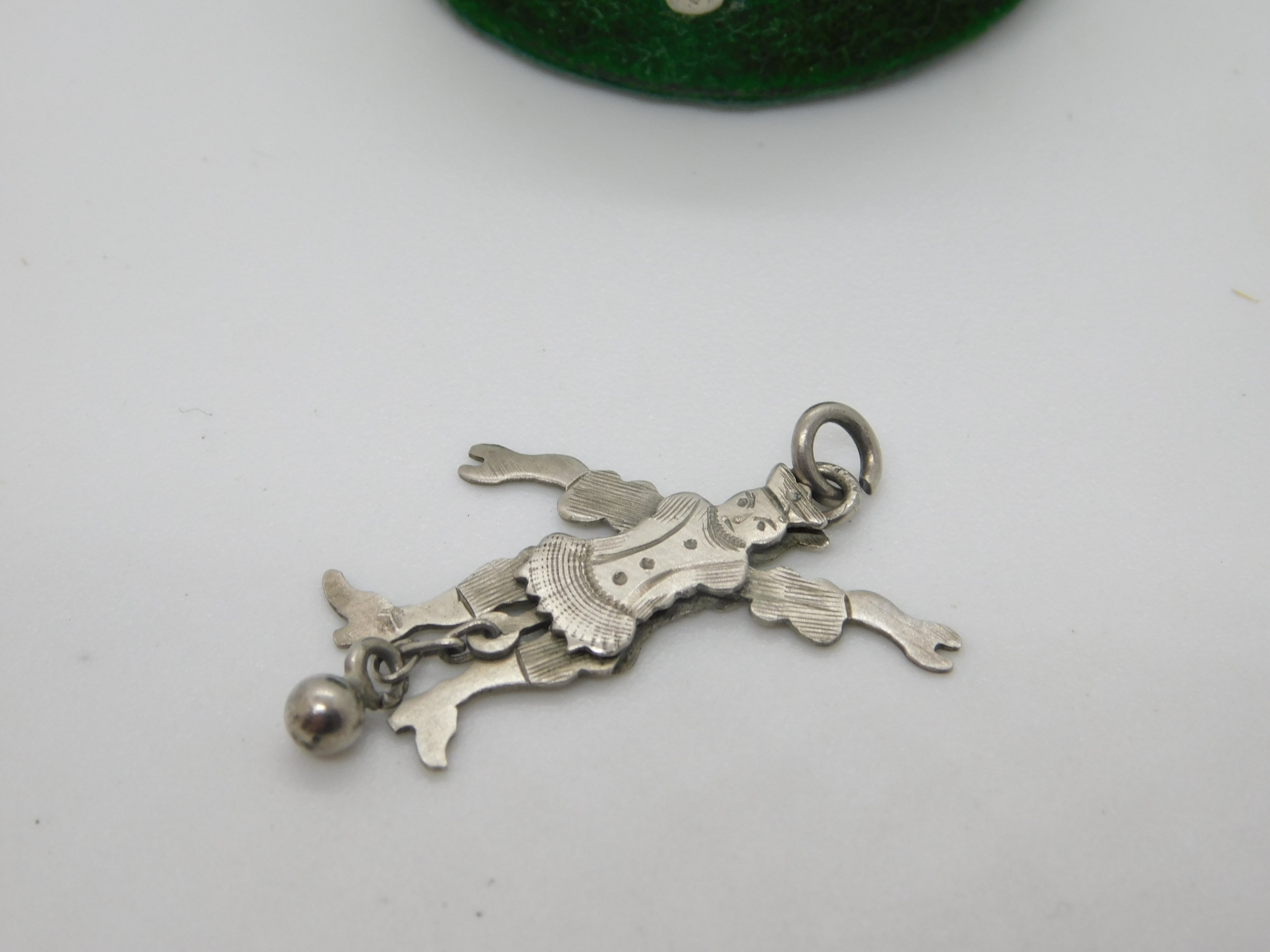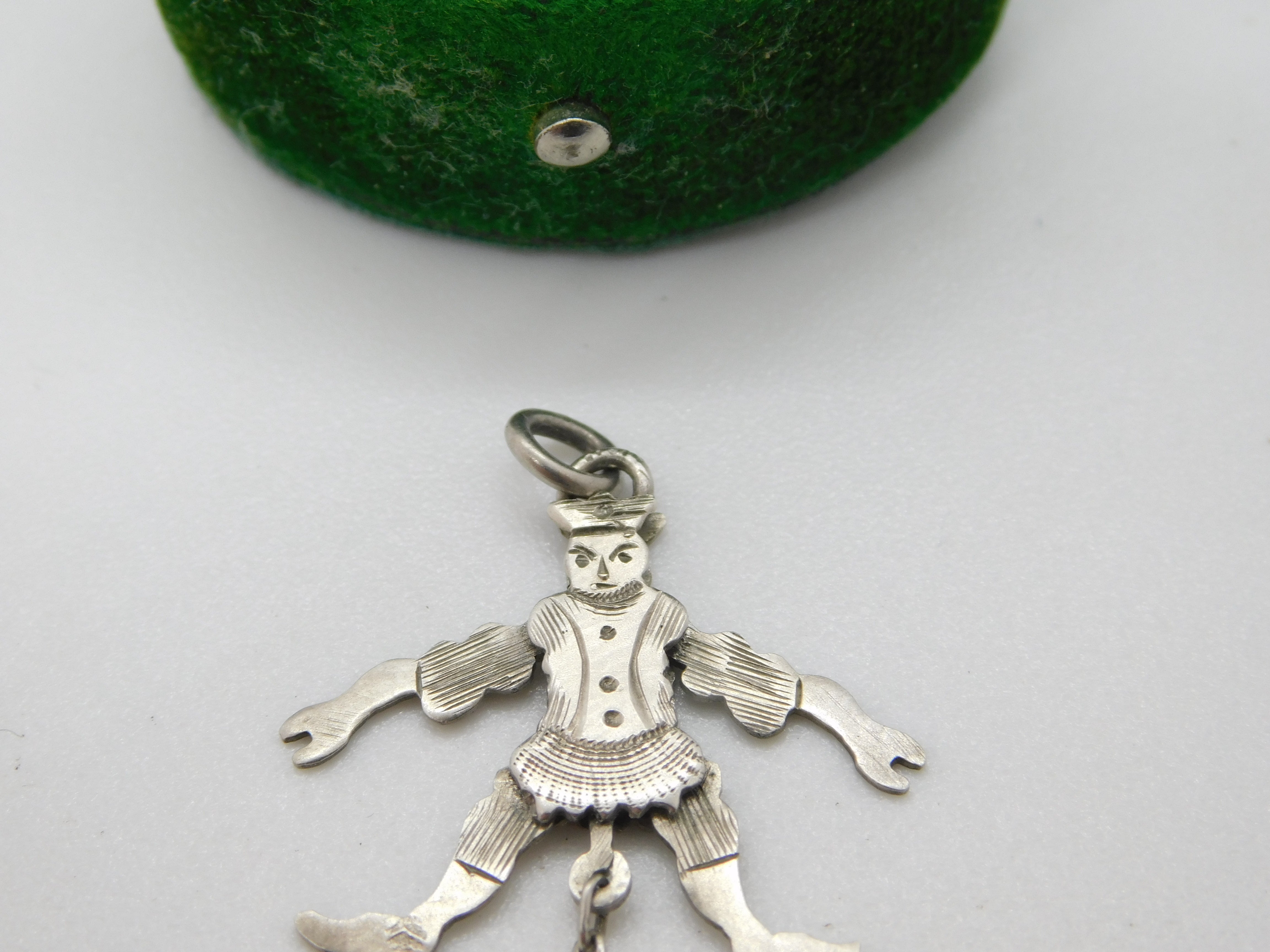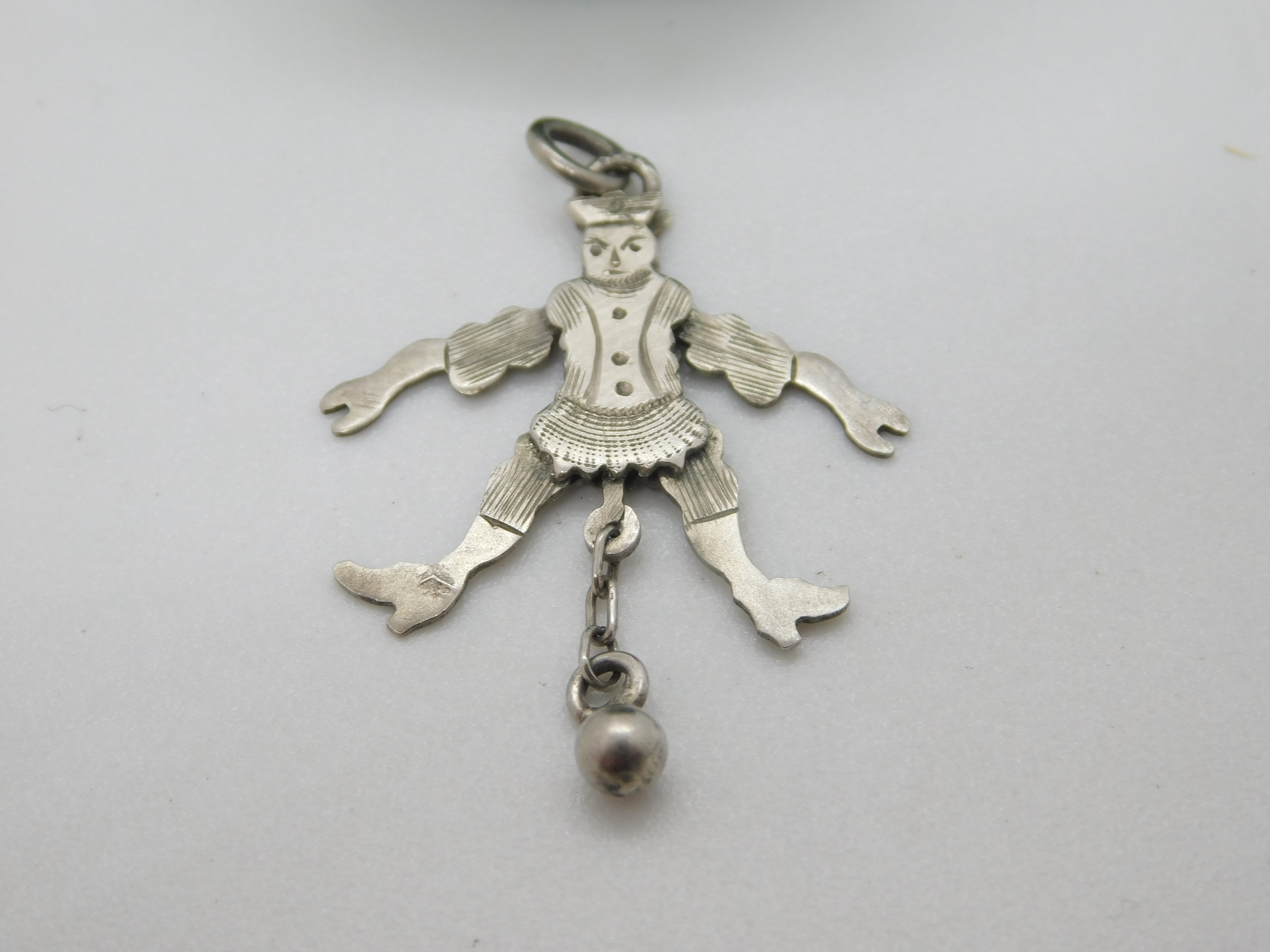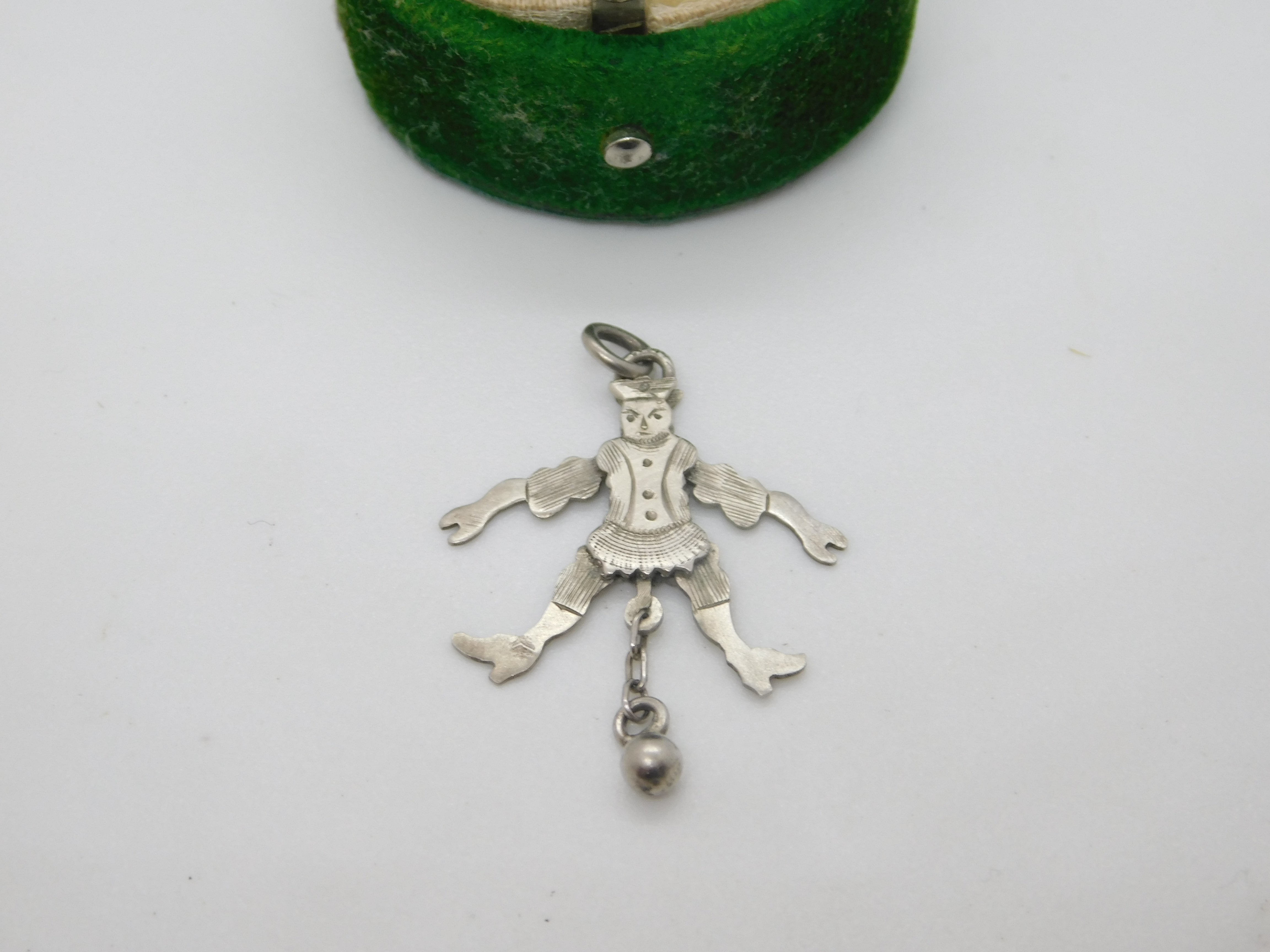 Details: A fantastic and wonderfully designed antique Edwardian sterling silver articulated clown with ball pendant hallmarked to the leg c1910. All the legs move well and lovely condition. This is a wonderful item that would make a perfect gift or addition to any collection. The BOX pictured is for PRESENTATION ONLY and is NOT included in the listings but used to frame the pictures unless specifically stated otherwise.