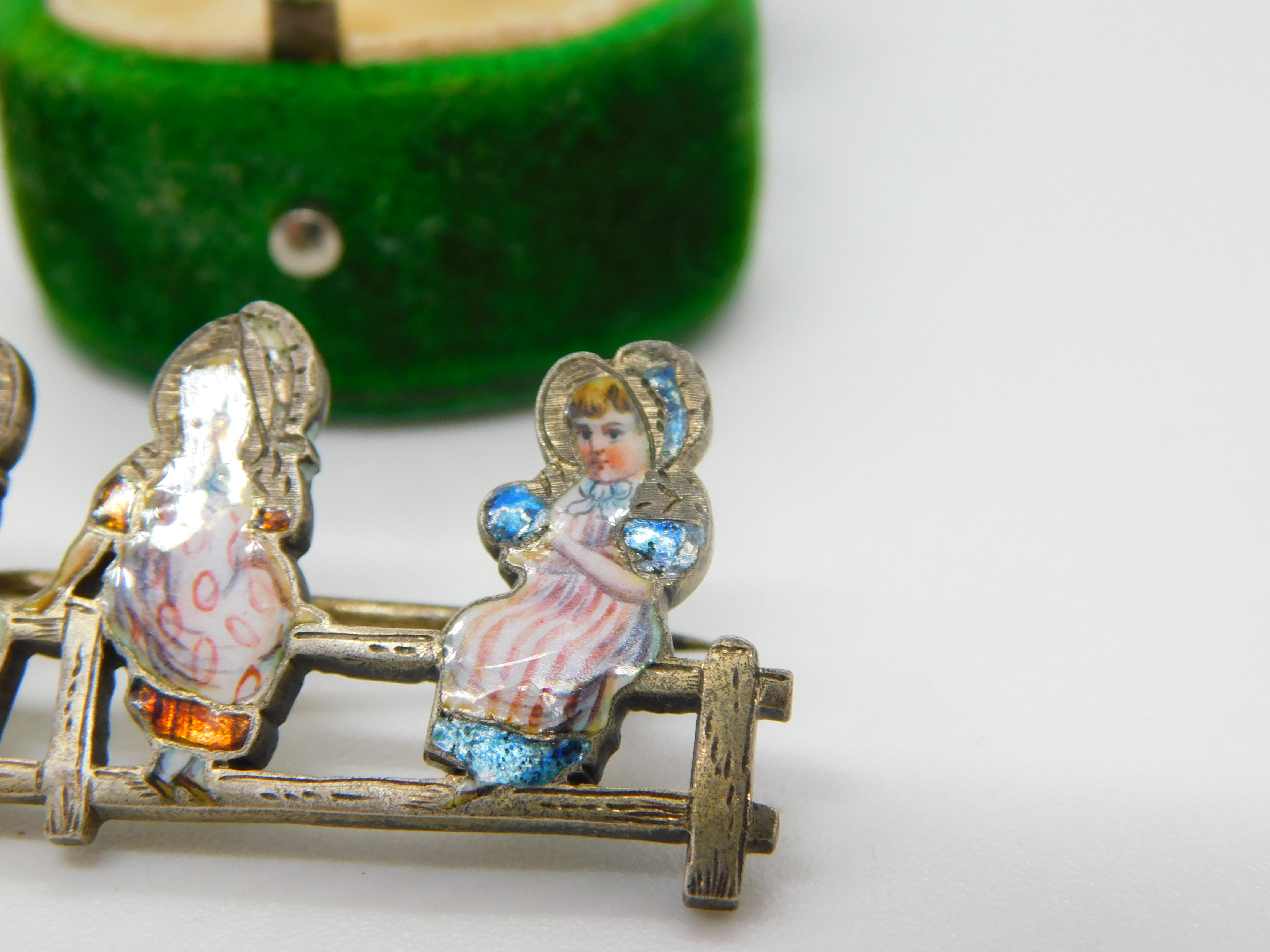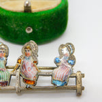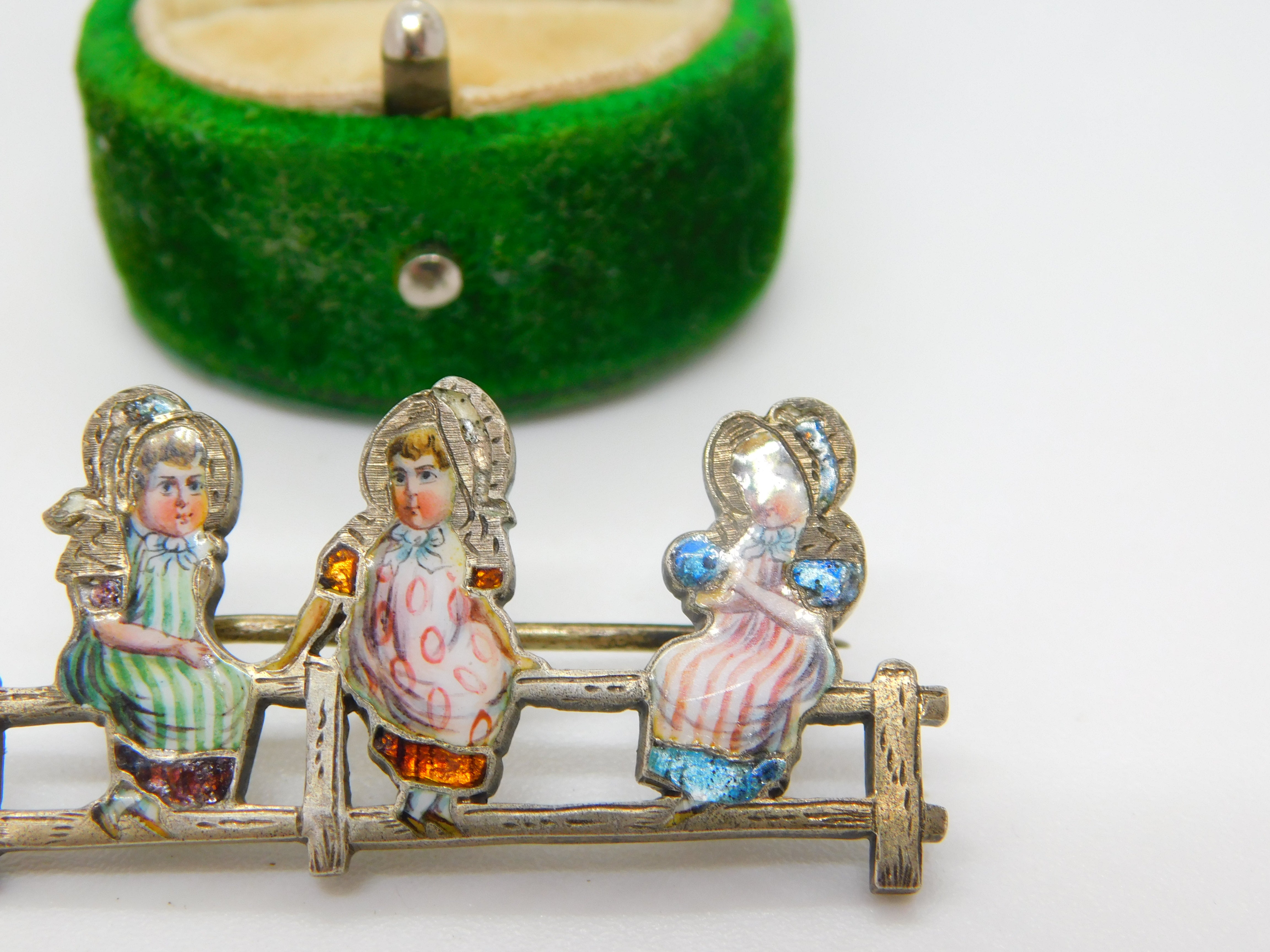 Details: A fantastic and wonderfully designed antique Edwardian sterling silver & colourful enamel nursery rhyme three girls sat on a fence sweetheart brooch c1910, the silver has been XRF tested as it is unmarked. This is a wonderful item that would make a perfect gift or addition to any collection. The BOX pictured is for PRESENTATION ONLY and is NOT included in the listings but used to frame the pictures unless specifically stated otherwise.