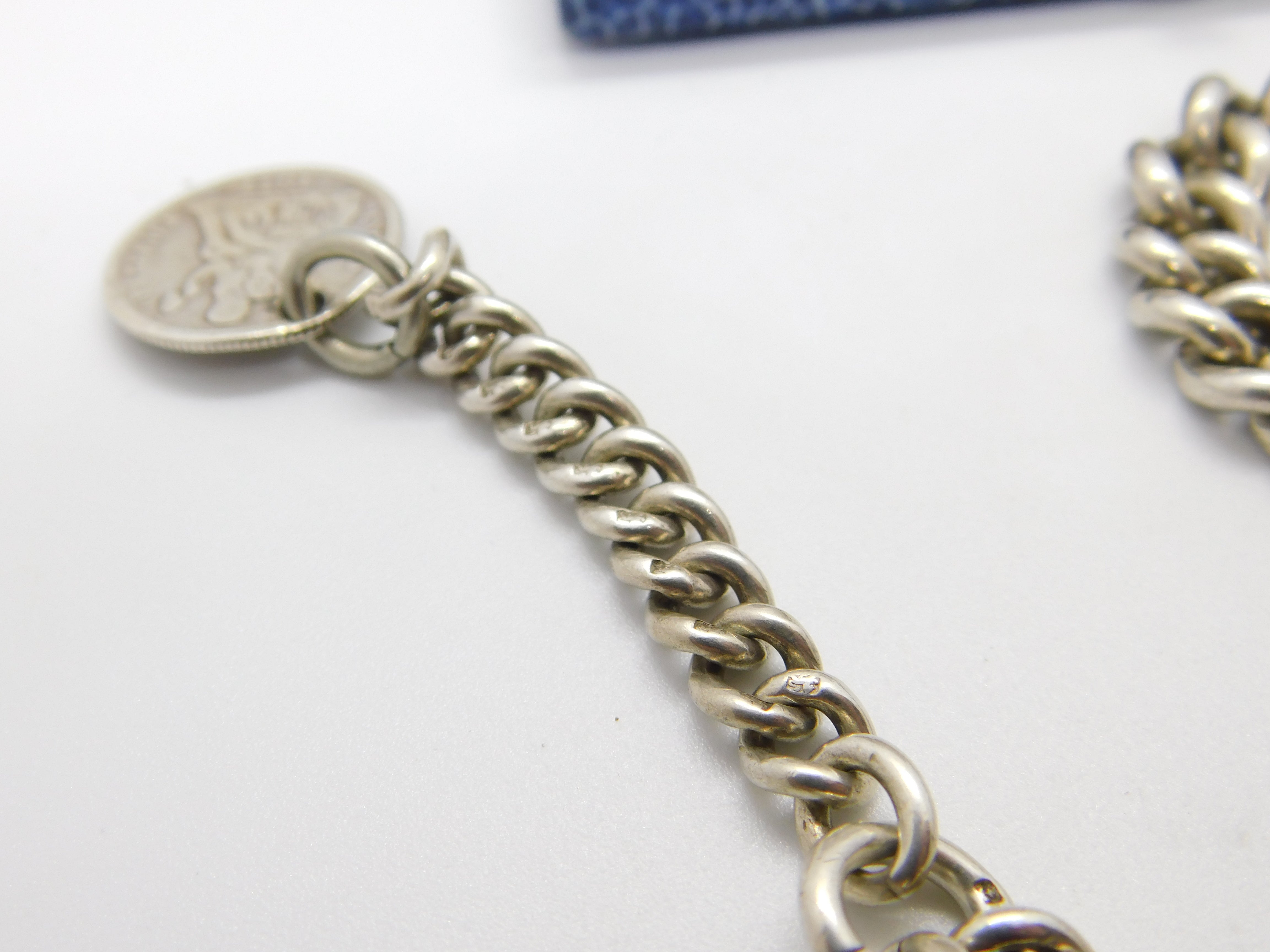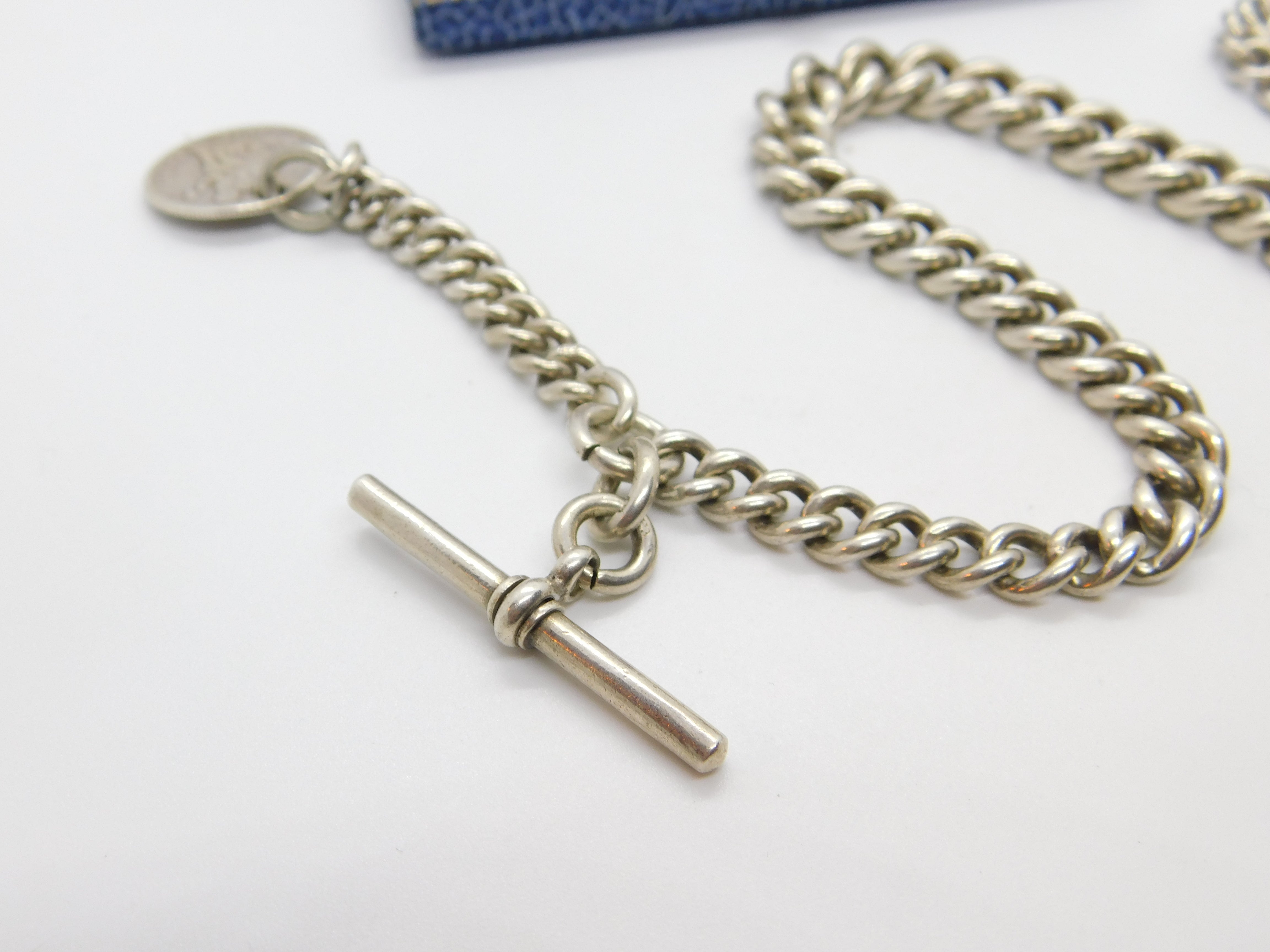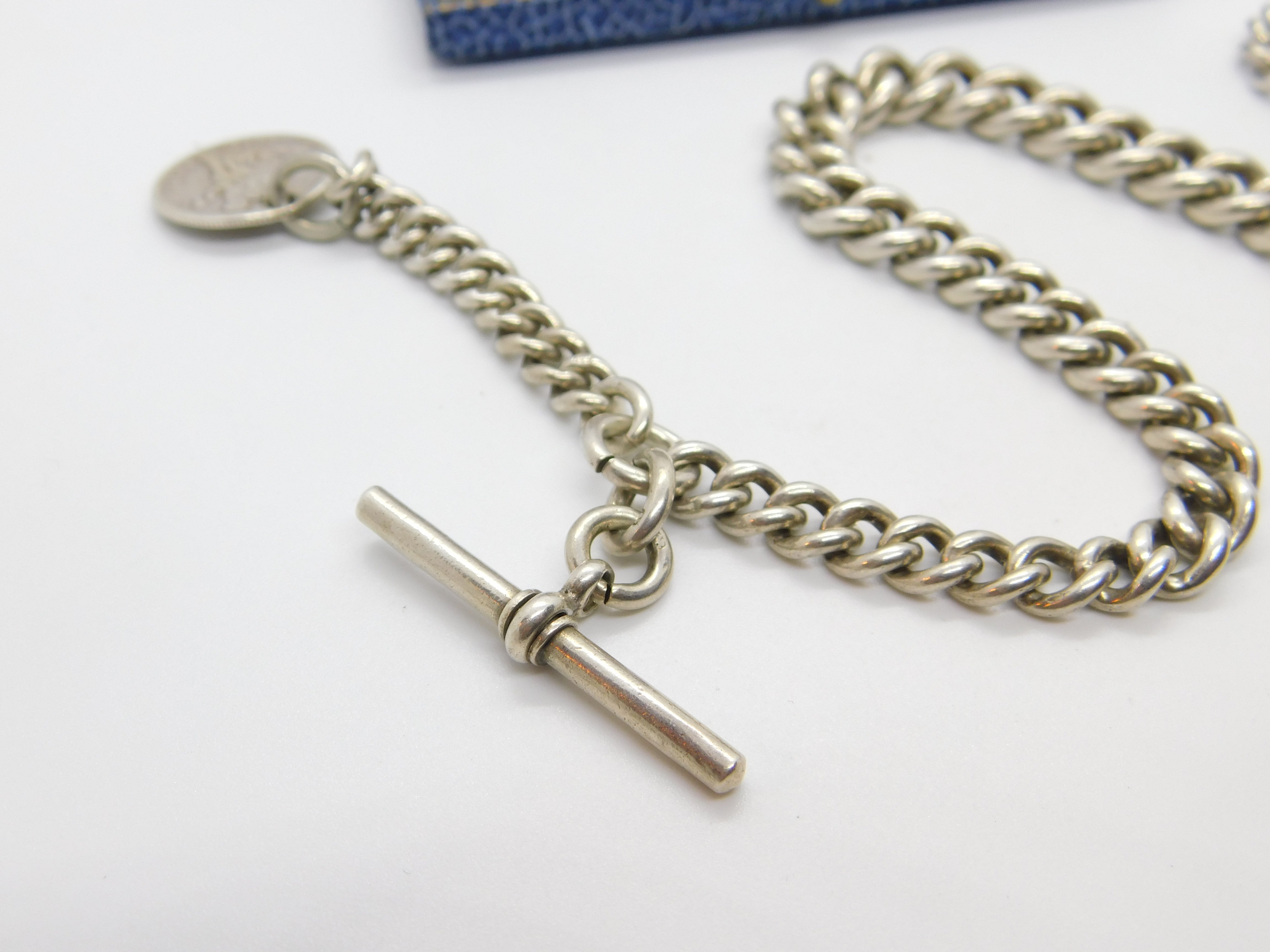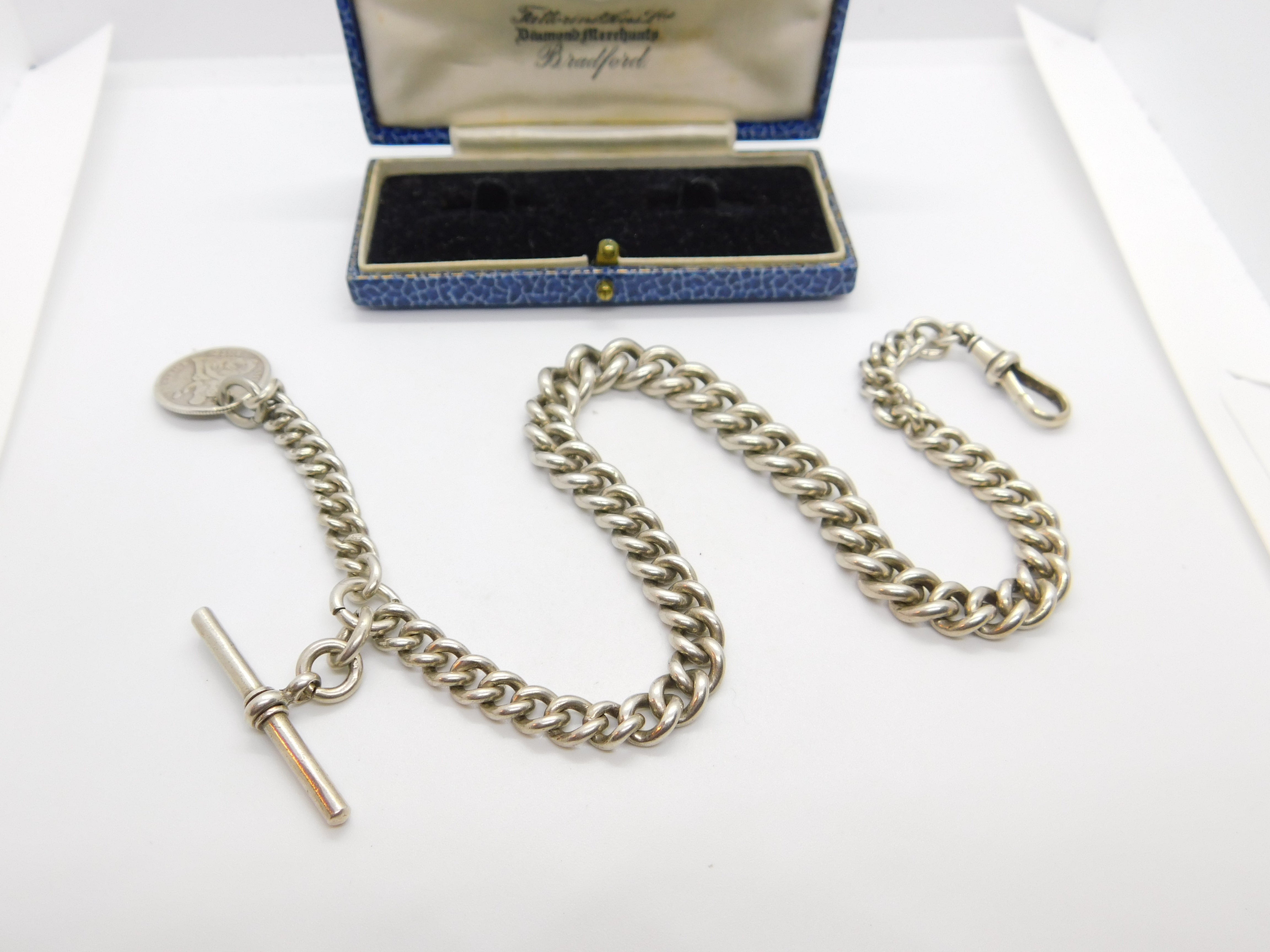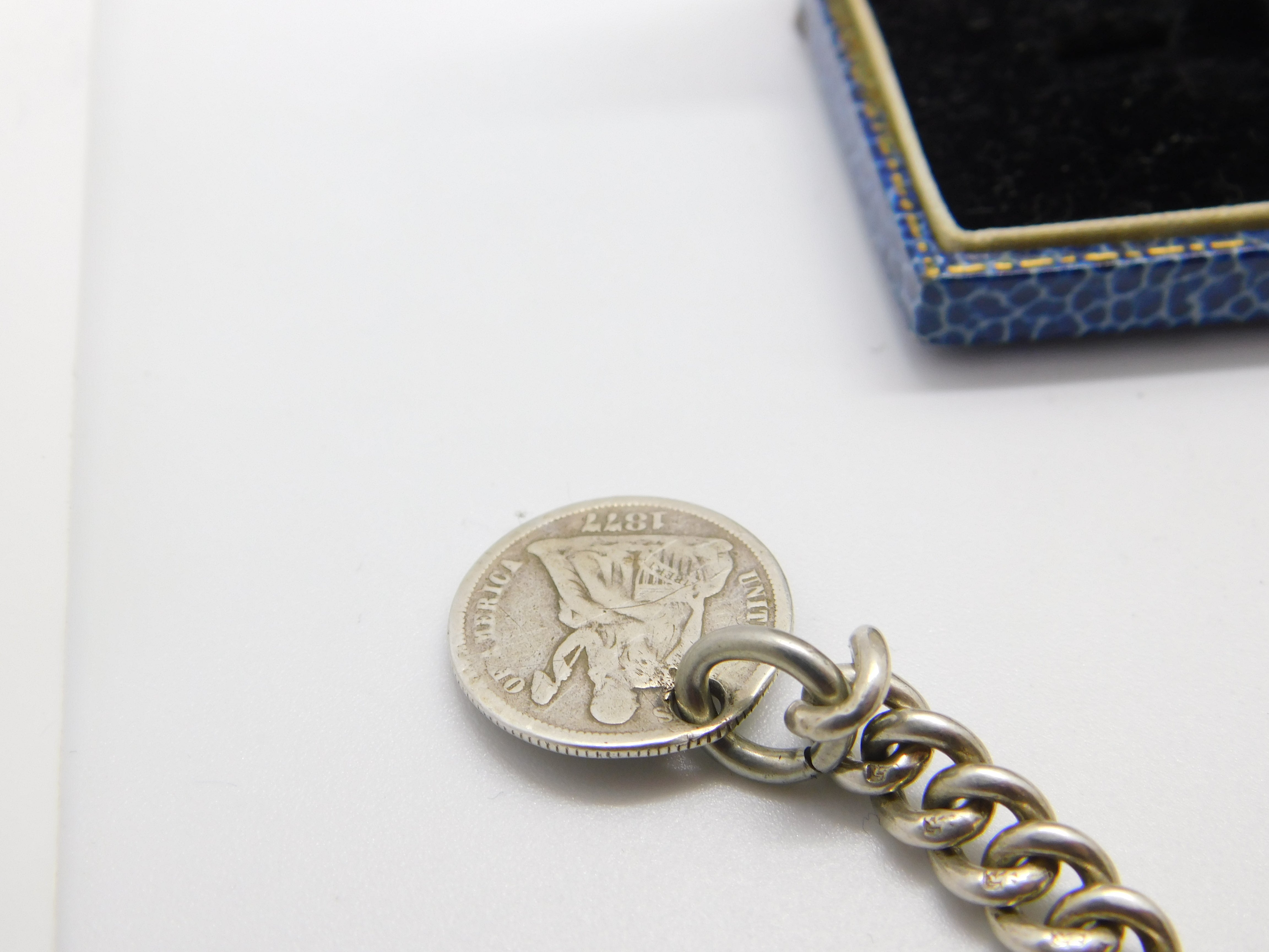 Details: A fantastic and wonderfully designed antique Edwardian sterling silver graduating albert link watch chain with American Dime coin fob dated 1877 the chain hallmarked to every link and to the T-bar for Birmingham 1905. Nice working dog clip and an allround lovely example. This is a wonderful item that would make a perfect gift or addition to any collection. The BOX pictured is for PRESENTATION ONLY and is NOT included in the listings but used to frame the pictures unless specifically stated otherwise.