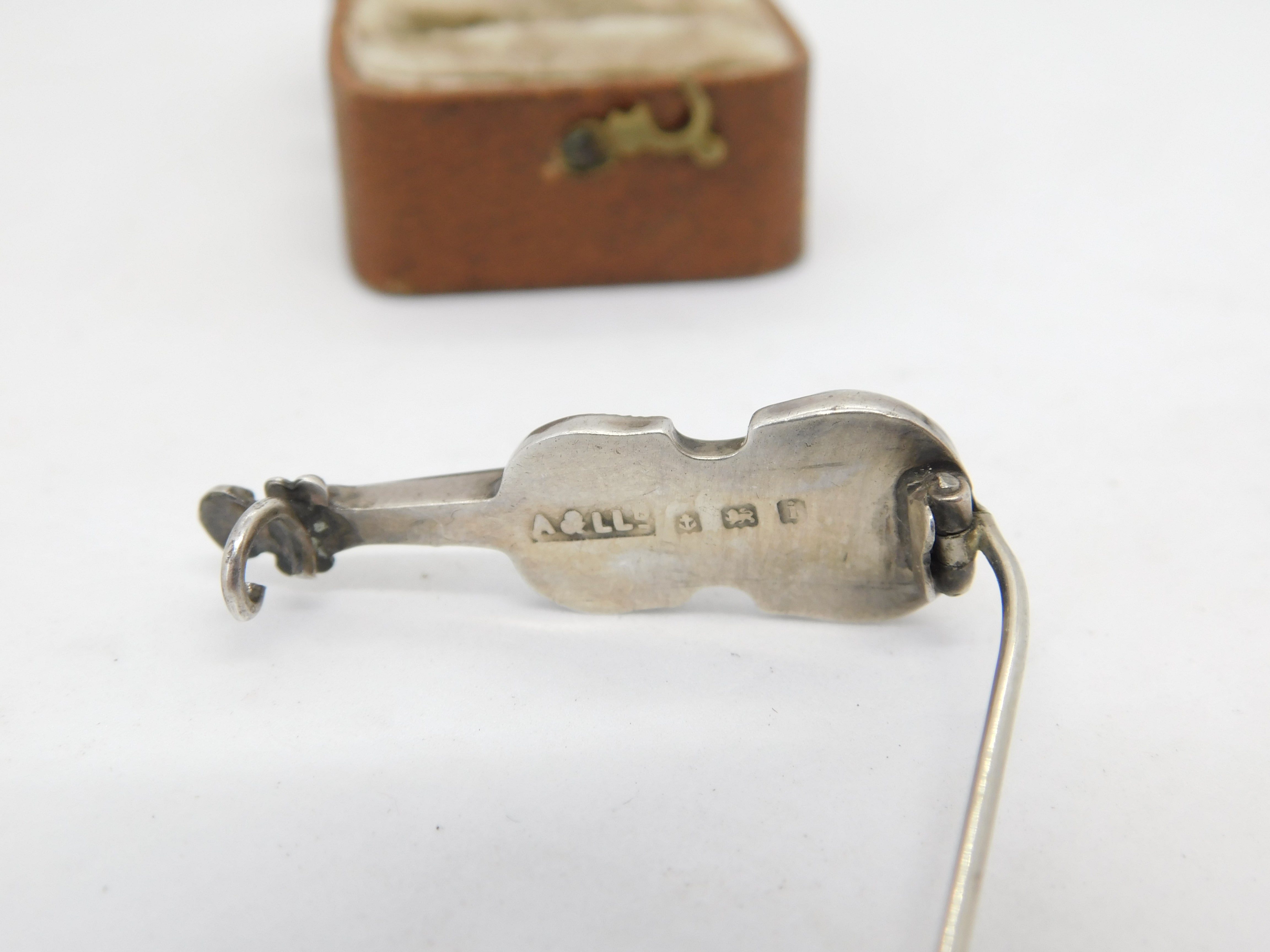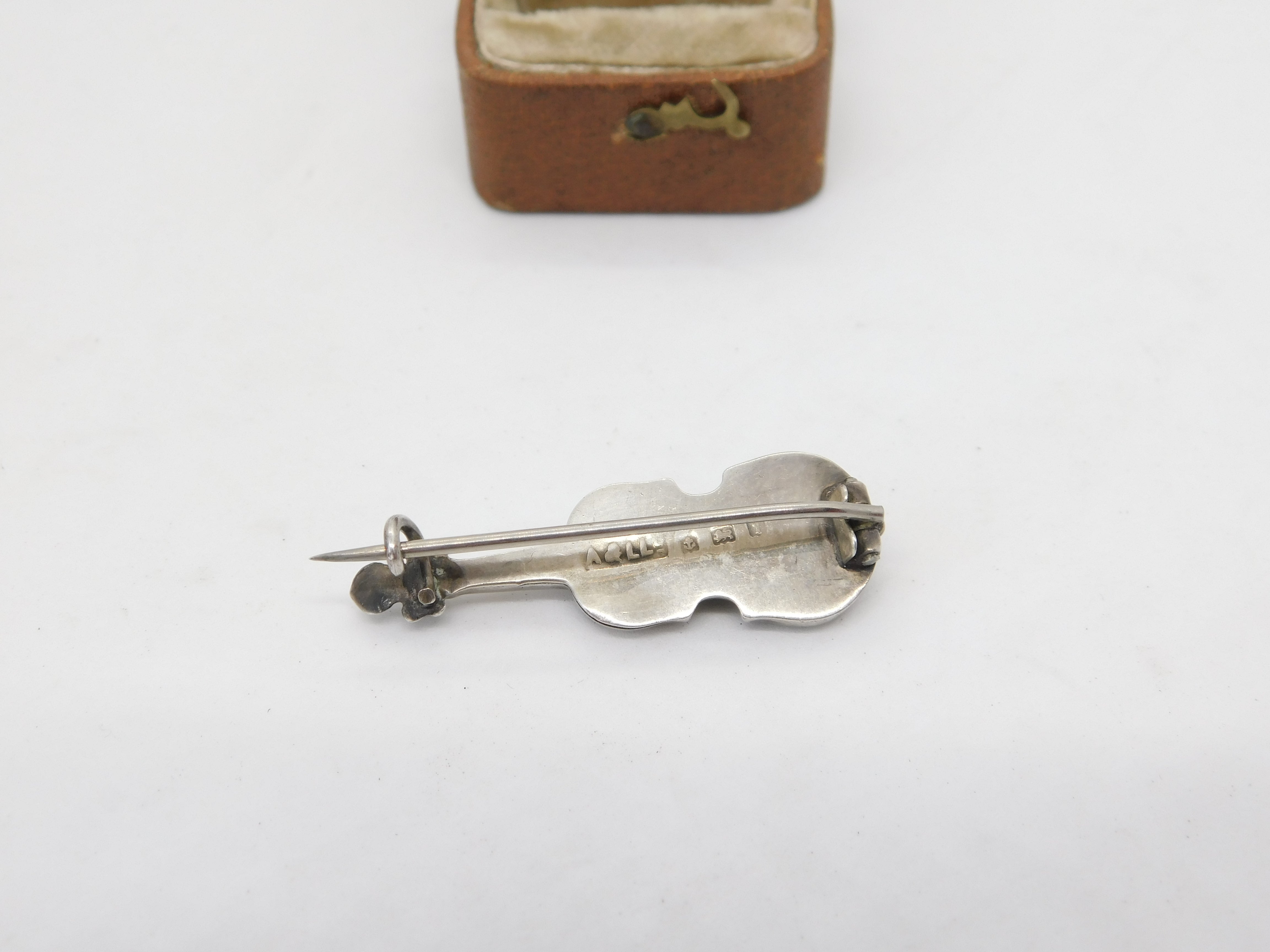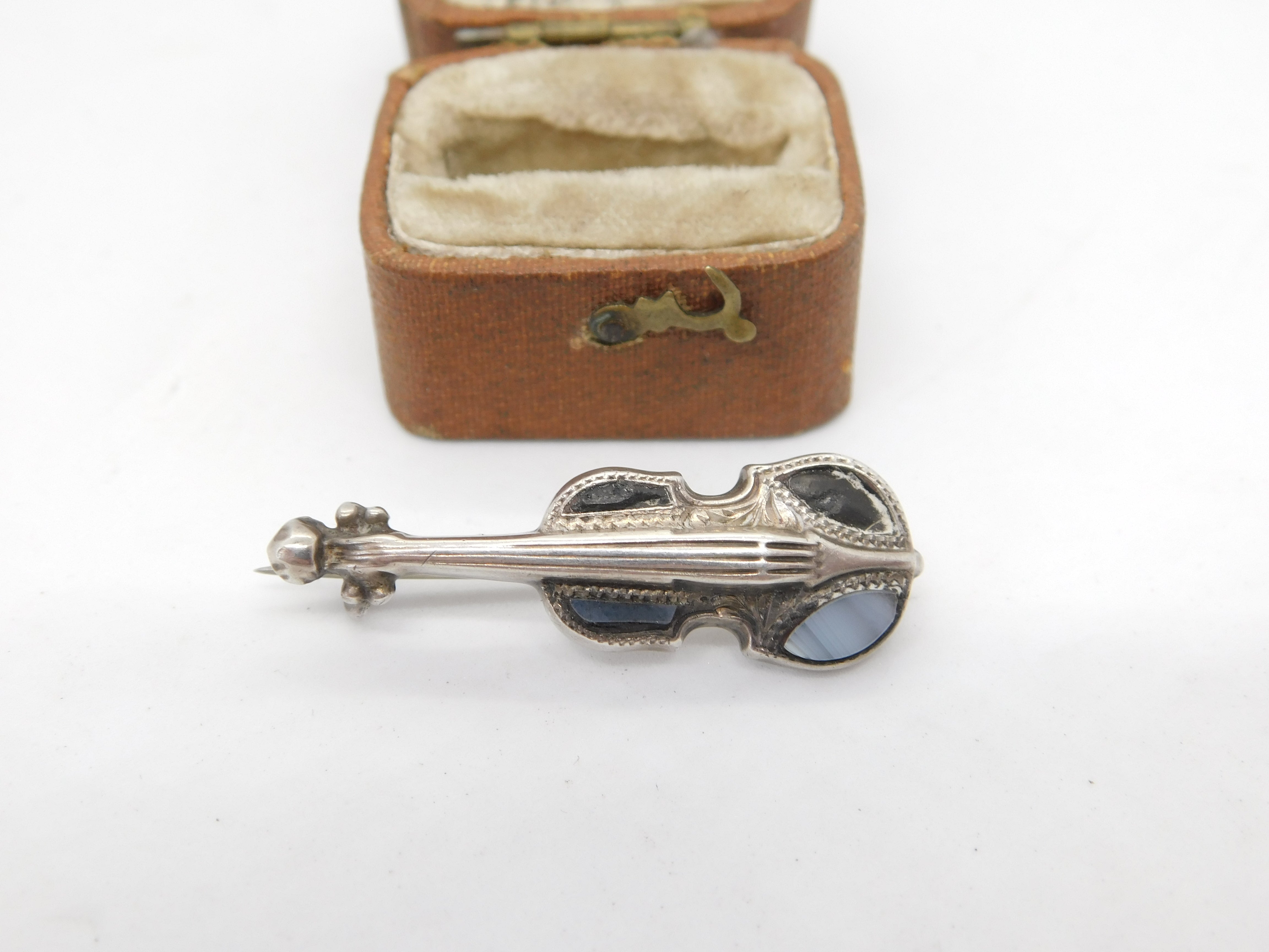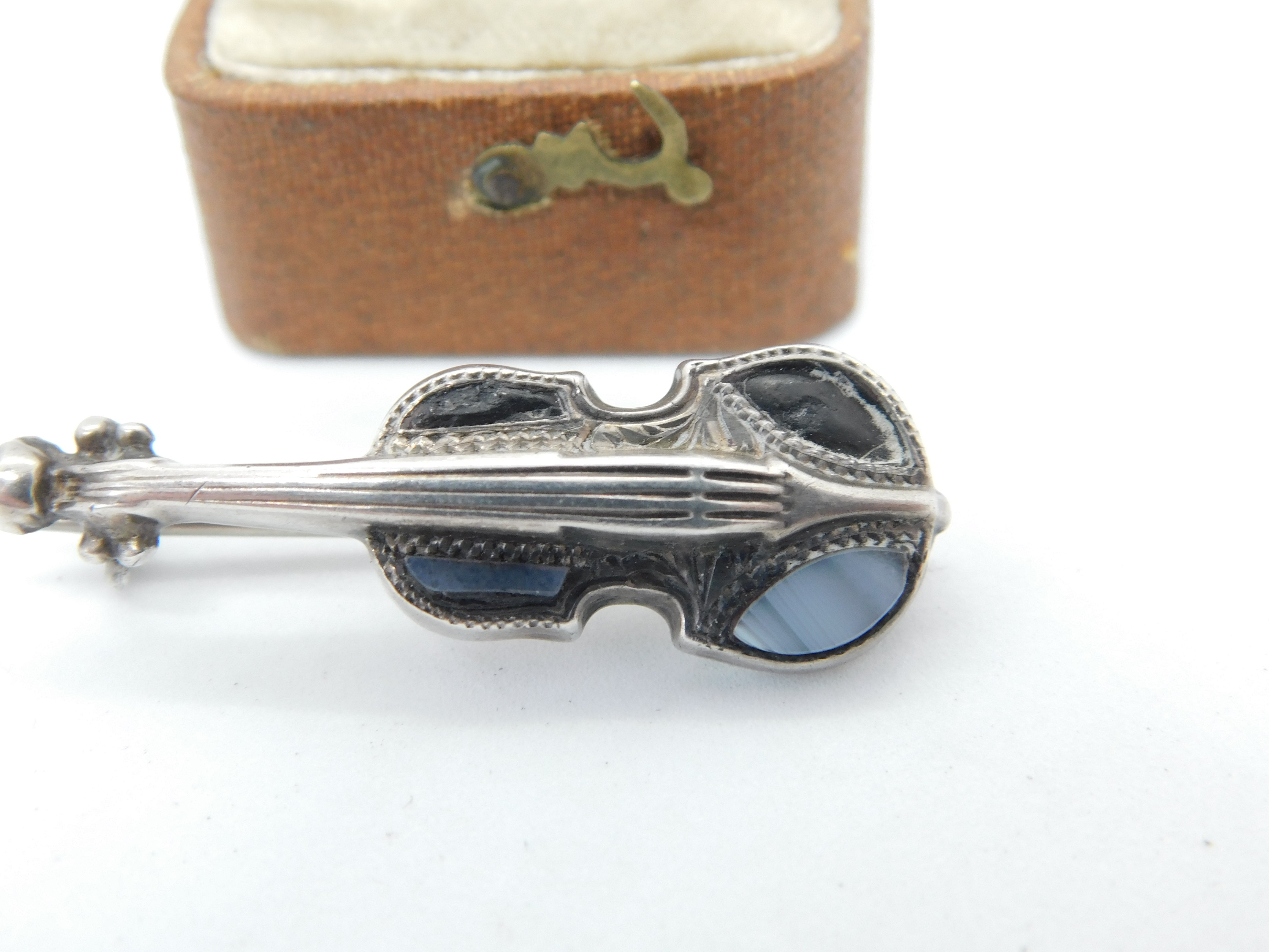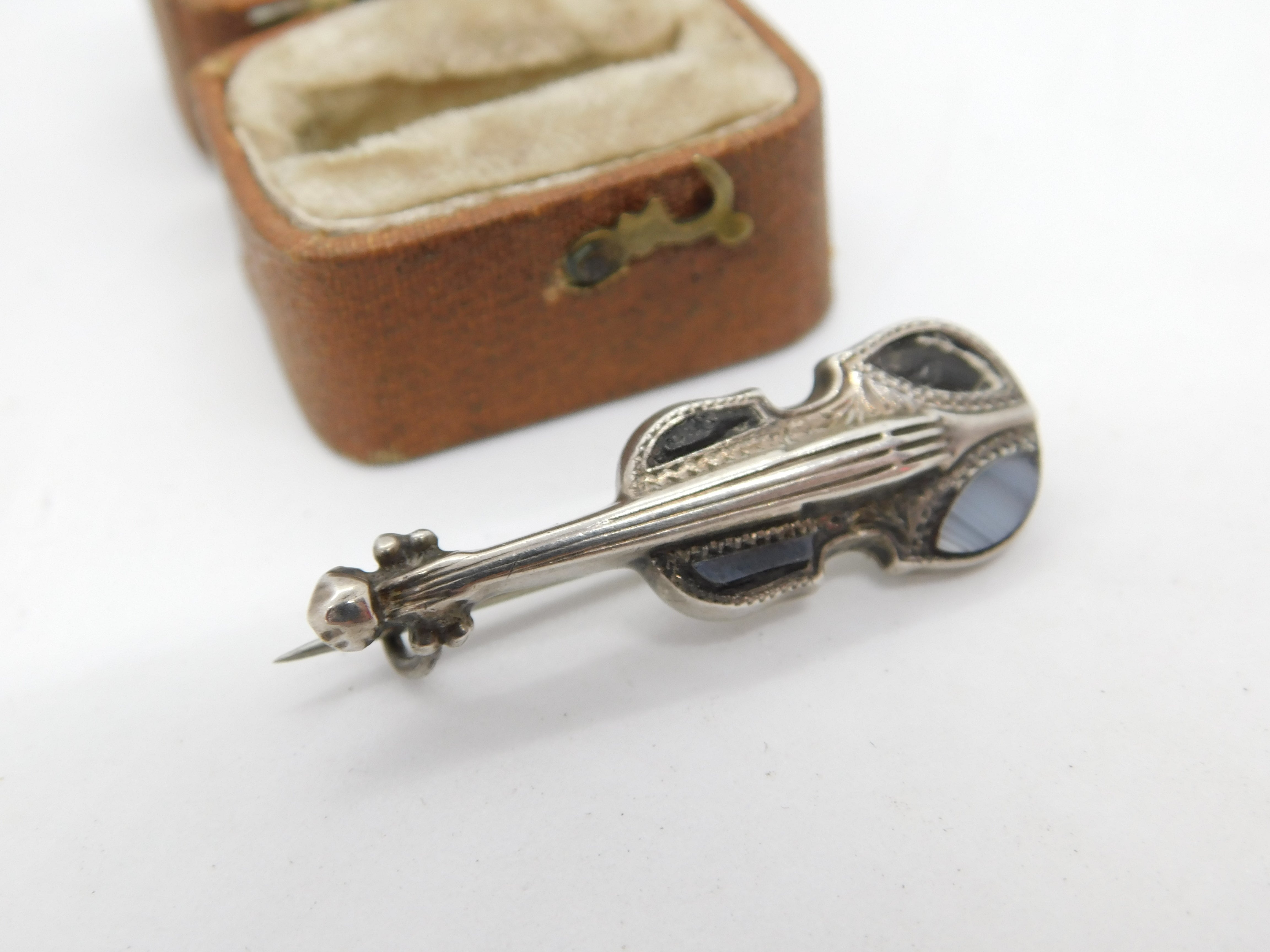 Details: A fantastic and wonderfully designed antique Edwardian sterling silver violin brooch pin set with Scottish montrose agate hallmarked Birmingham 1908 by Adie & Lovekin. A couple of the agate aspects well worn. This is a wonderful item that would make a perfect gift or addition to any collection. The BOX pictured is for PRESENTATION ONLY and is NOT included in the listings but used to frame the pictures unless specifically stated otherwise.
