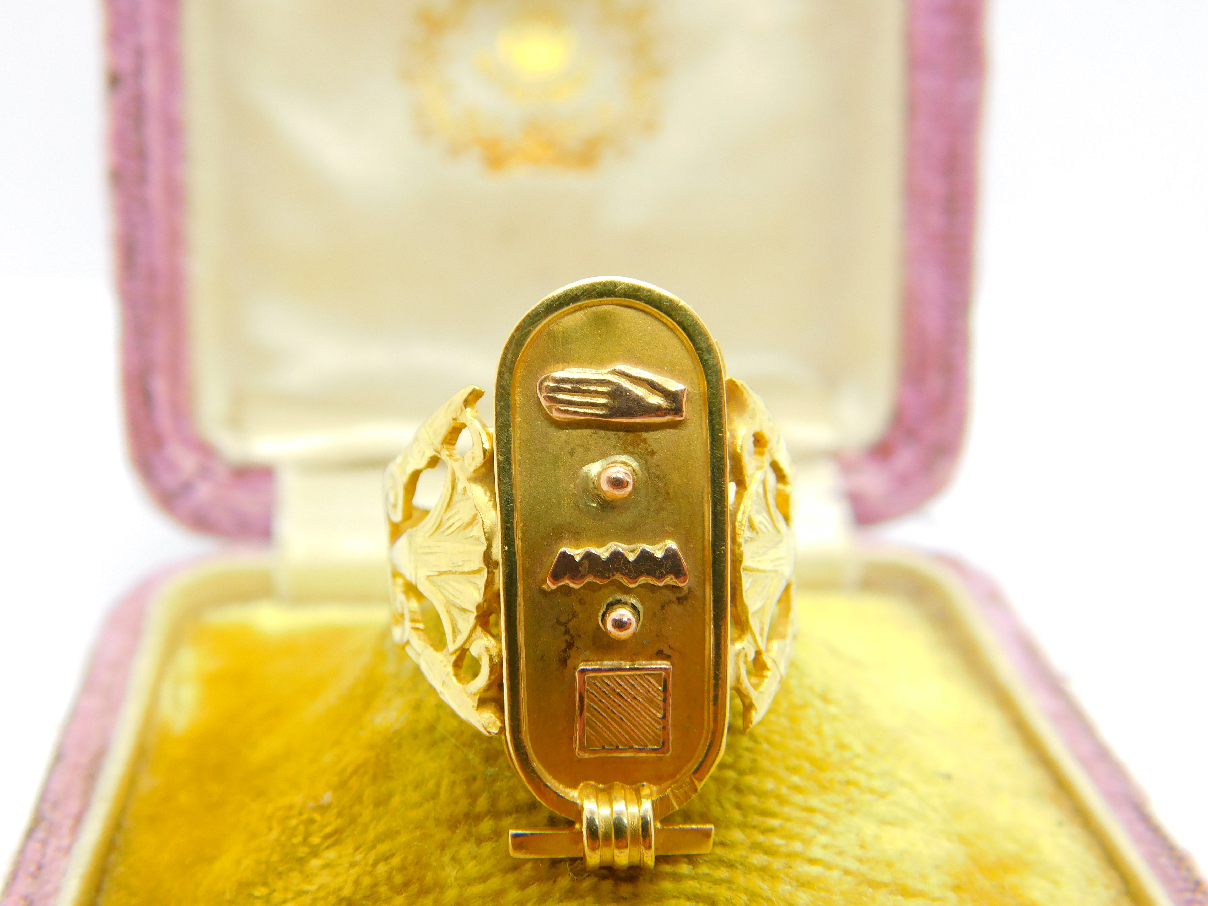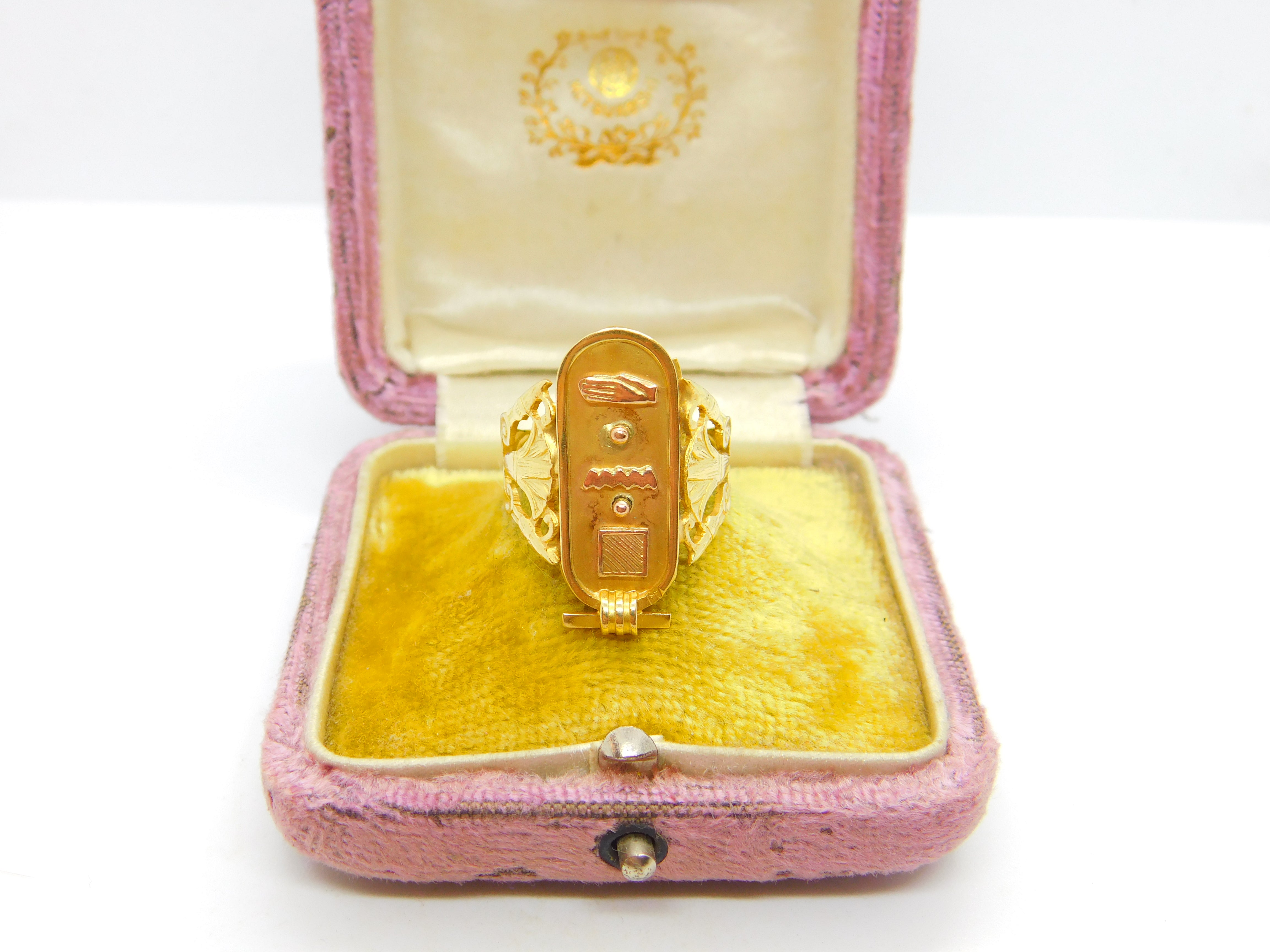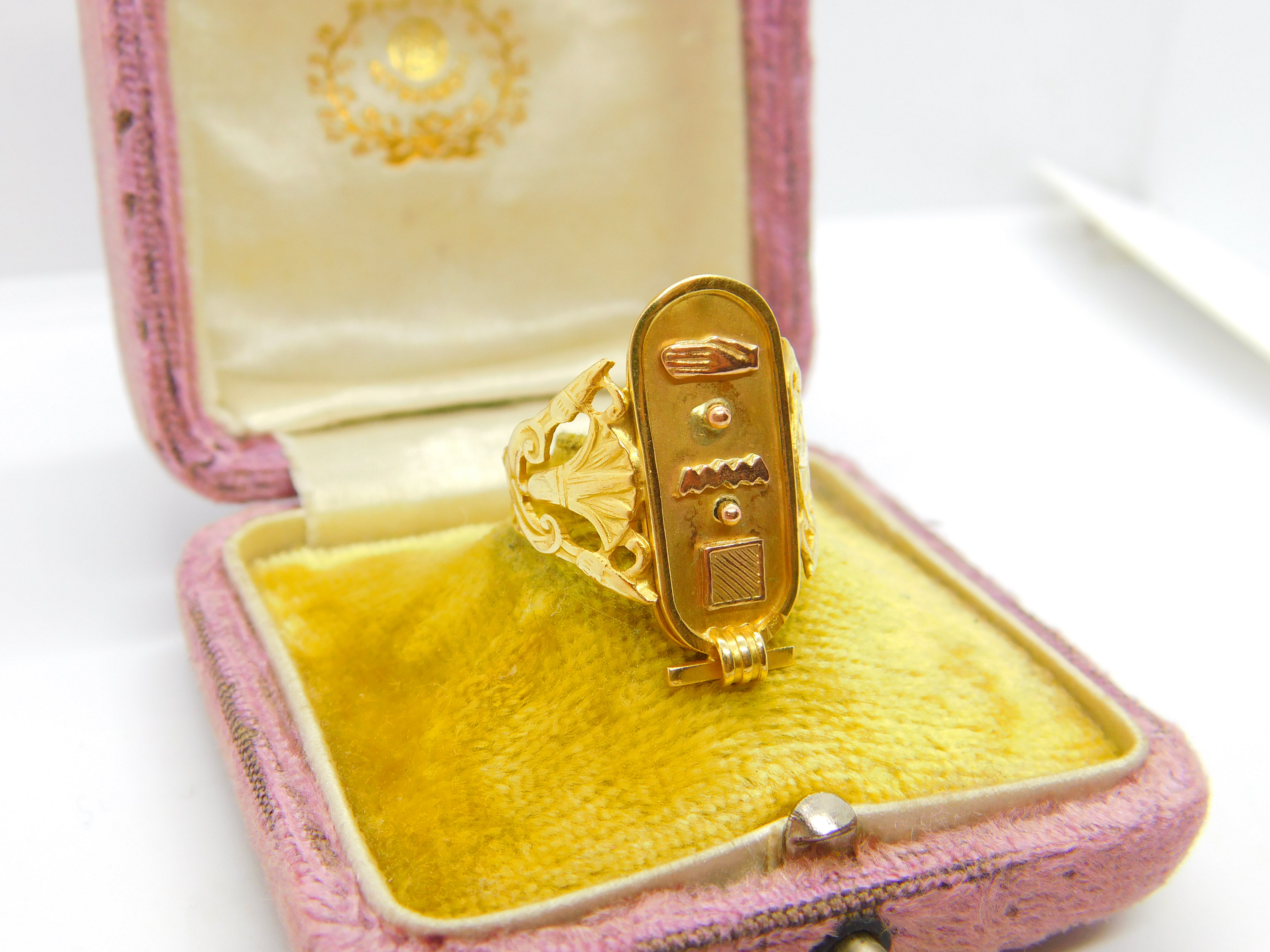 Details: A fantastic and wonderfully designed antique art deco Egyptian 21ct yellow gold hieroglyphic ingot form signet ring hallmarked to the interior band and XRF tested c1920. This is a wonderful item that would make a perfect gift or addition to any collection. The BOX pictured is for PRESENTATION ONLY and is NOT included in the listings but used to frame the pictures unless specifically stated otherwise.