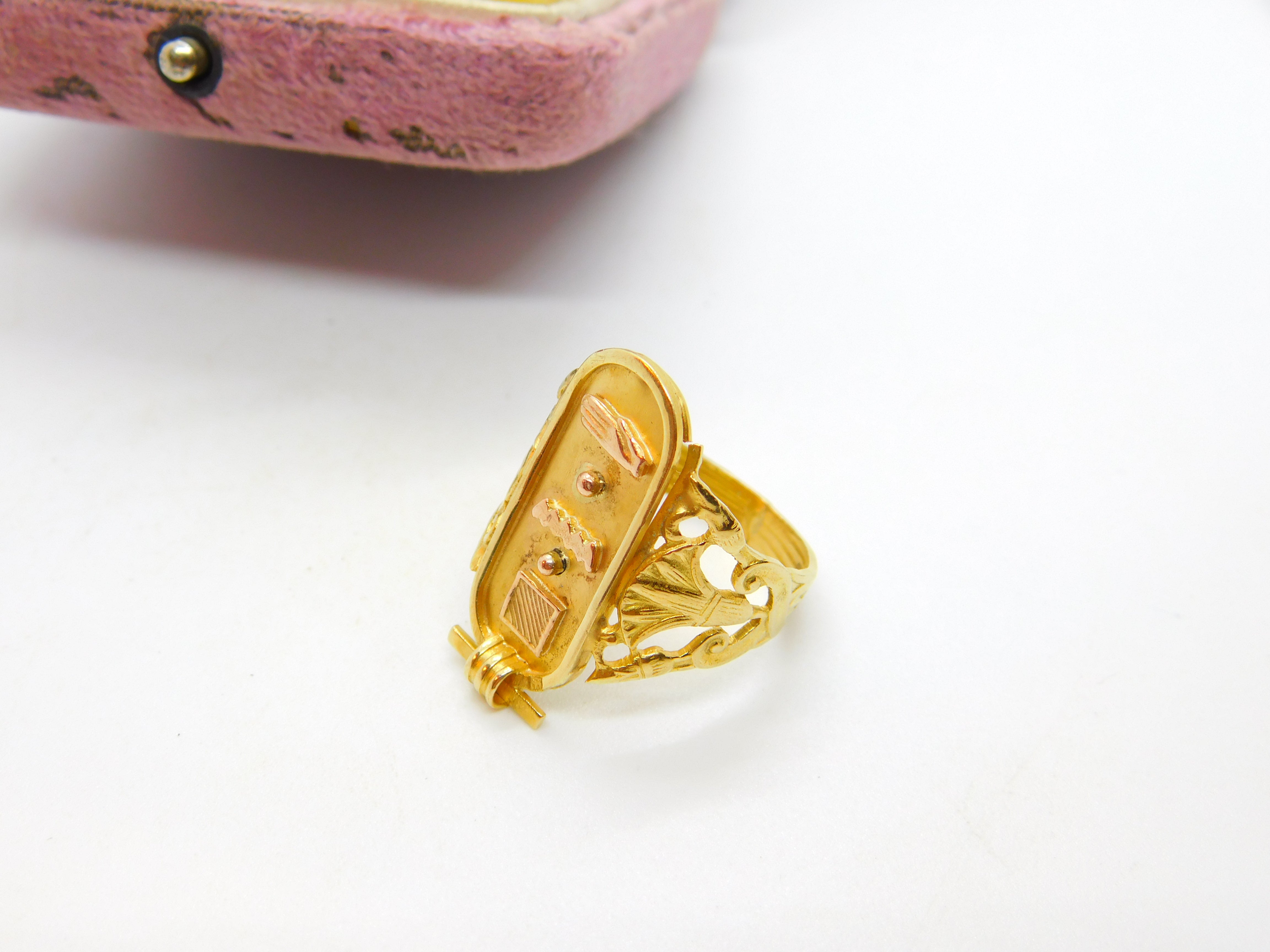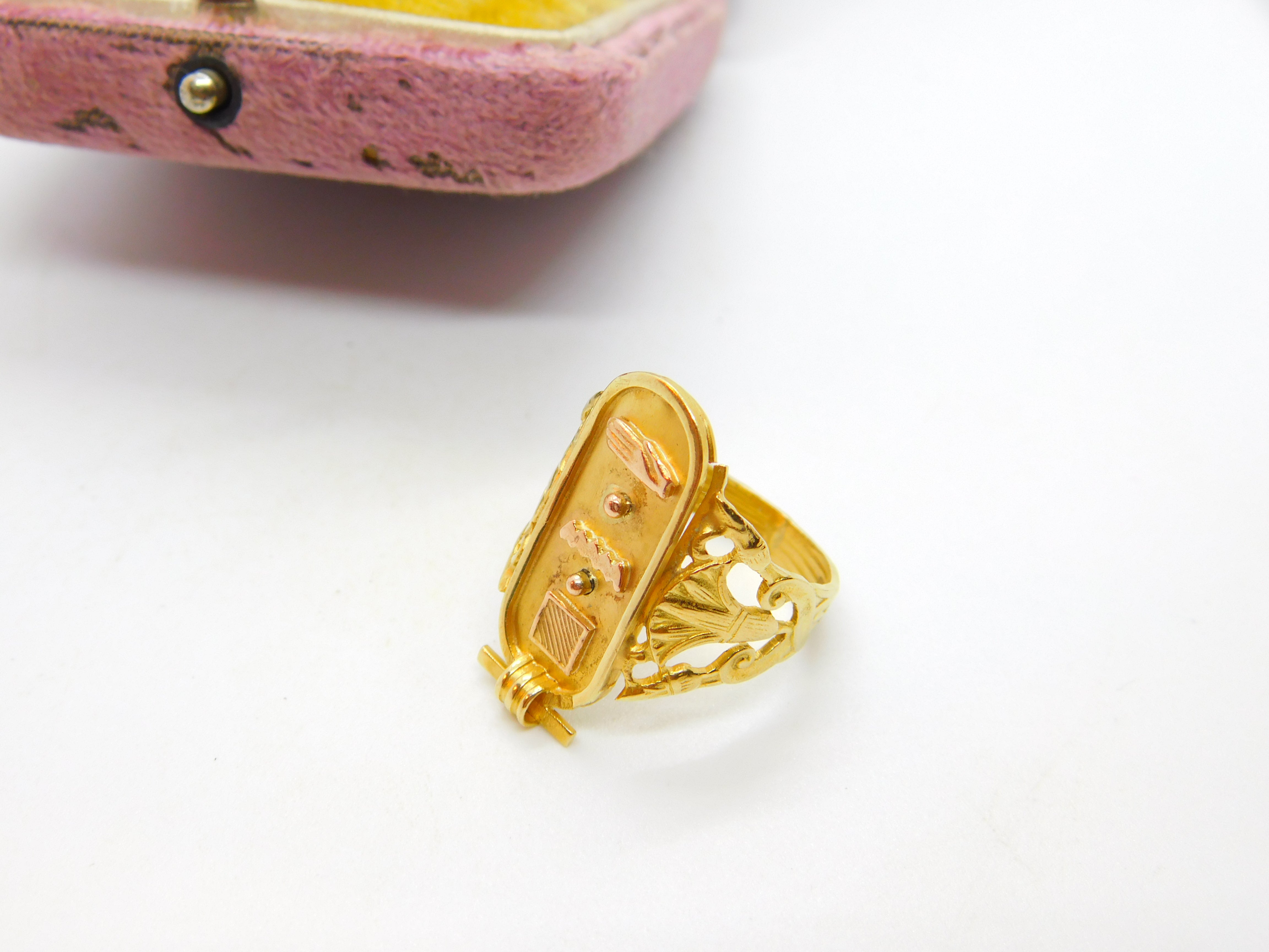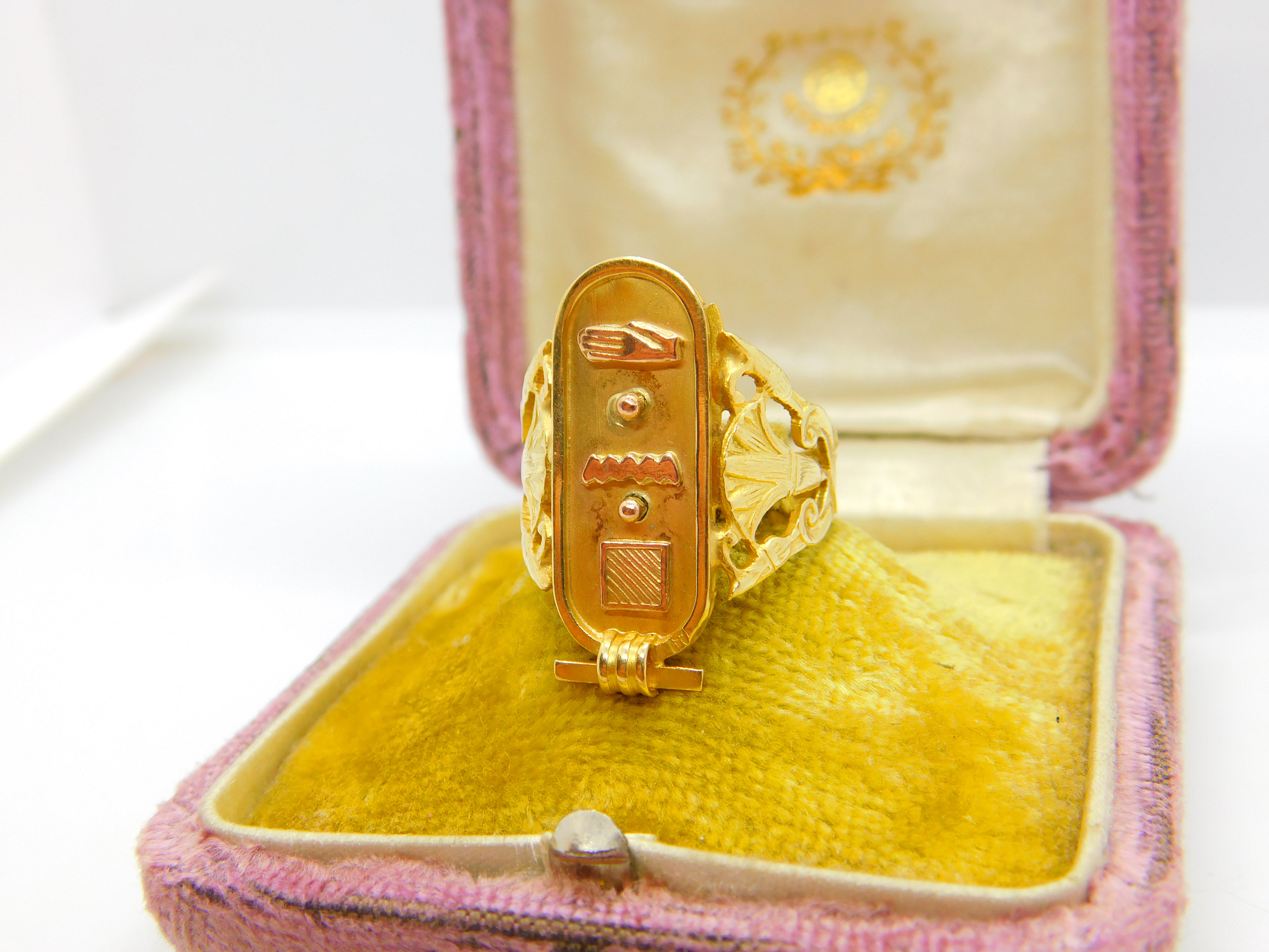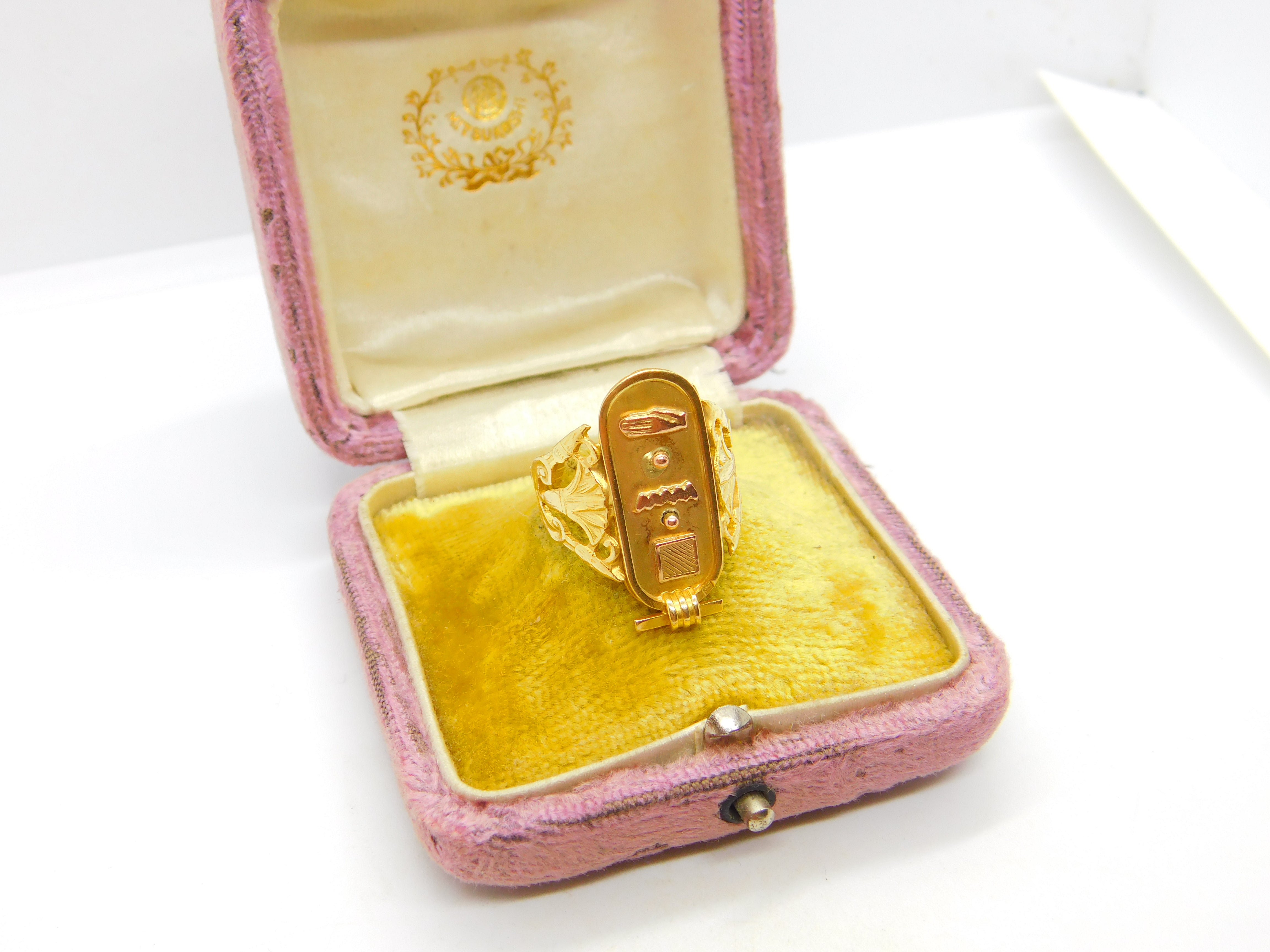 Details: A fantastic and wonderfully designed antique art deco Egyptian 21ct yellow gold hieroglyphic ingot form signet ring hallmarked to the interior band and XRF tested c1920. This is a wonderful item that would make a perfect gift or addition to any collection. The BOX pictured is for PRESENTATION ONLY and is NOT included in the listings but used to frame the pictures unless specifically stated otherwise.