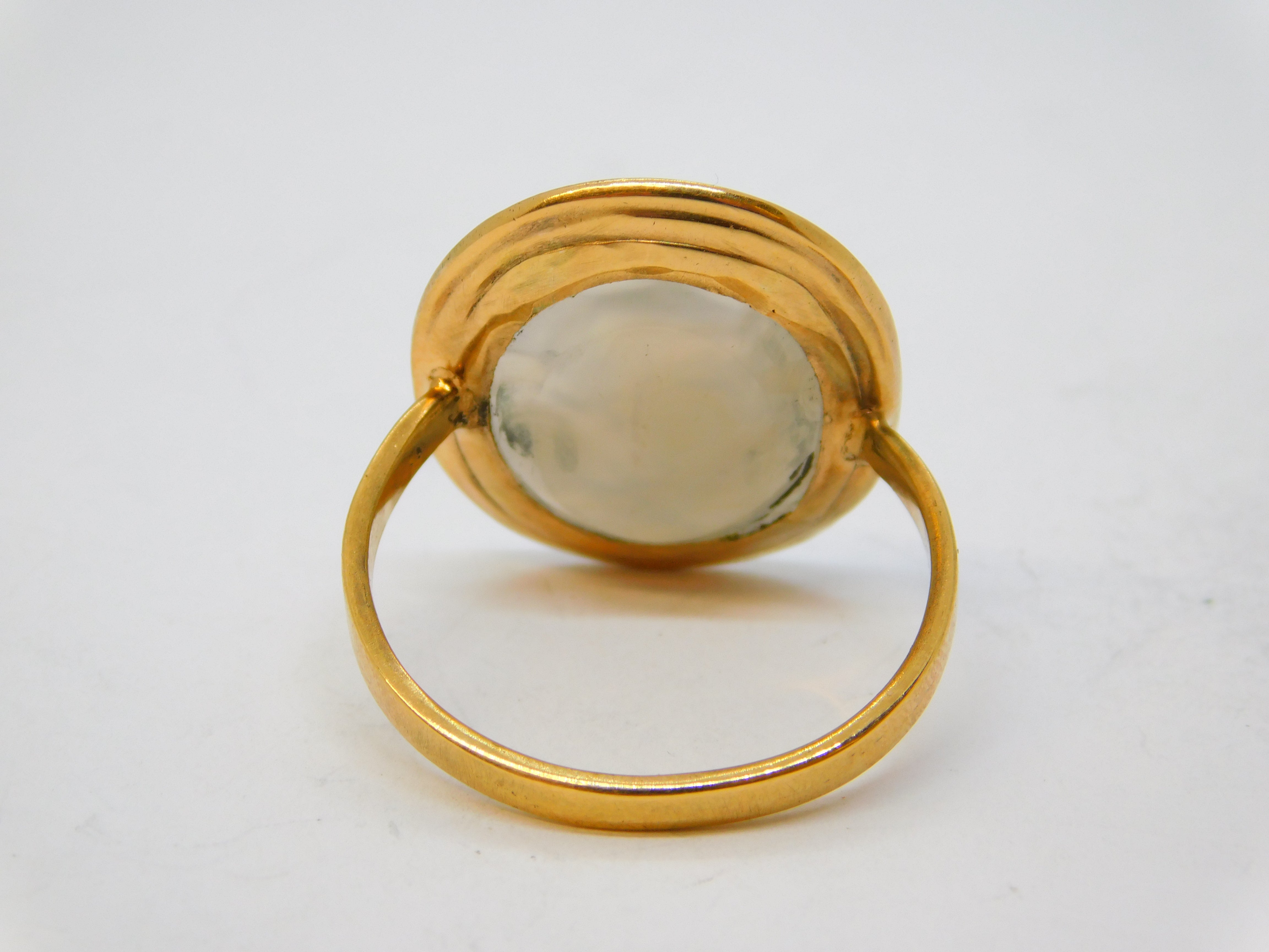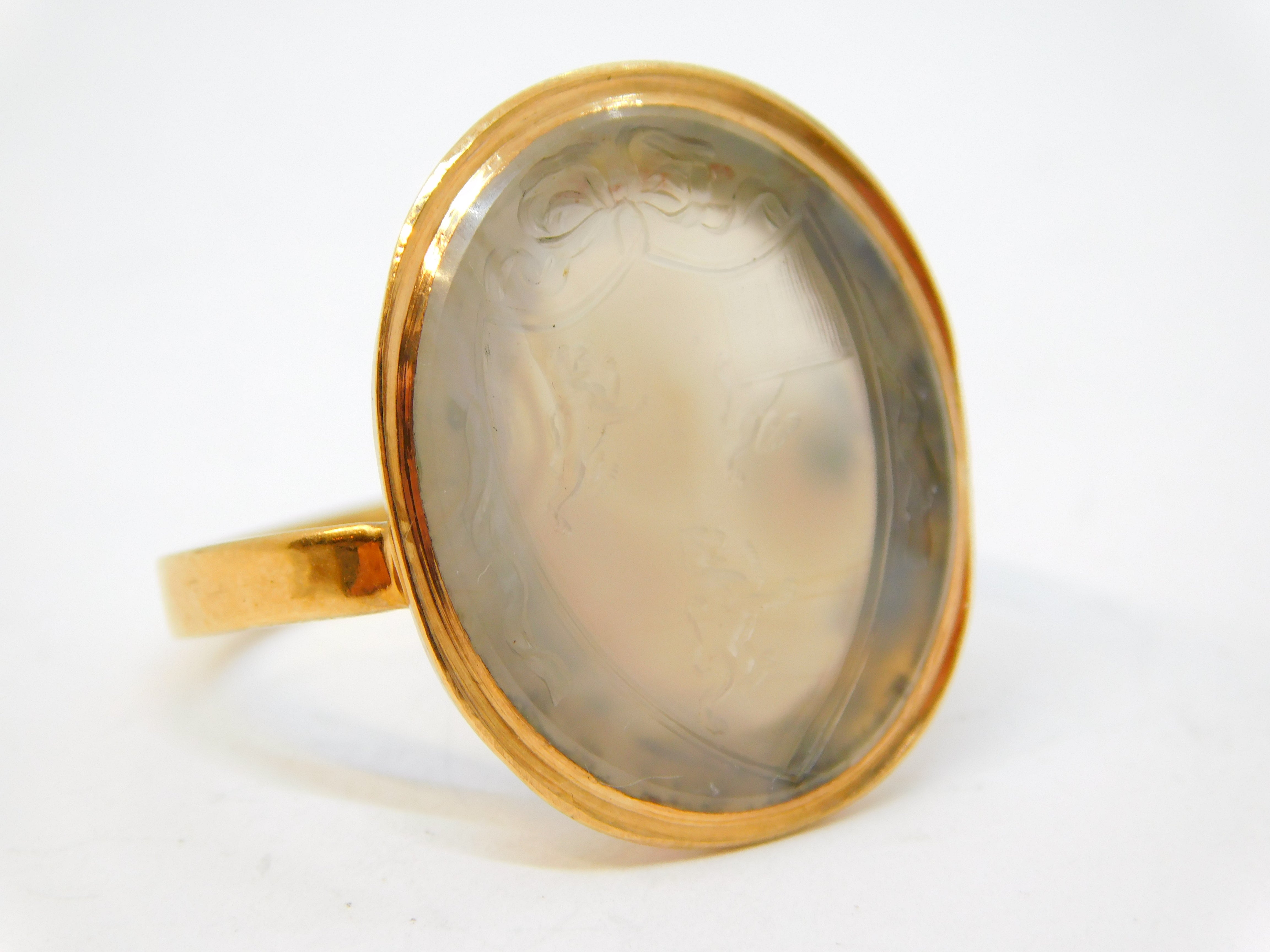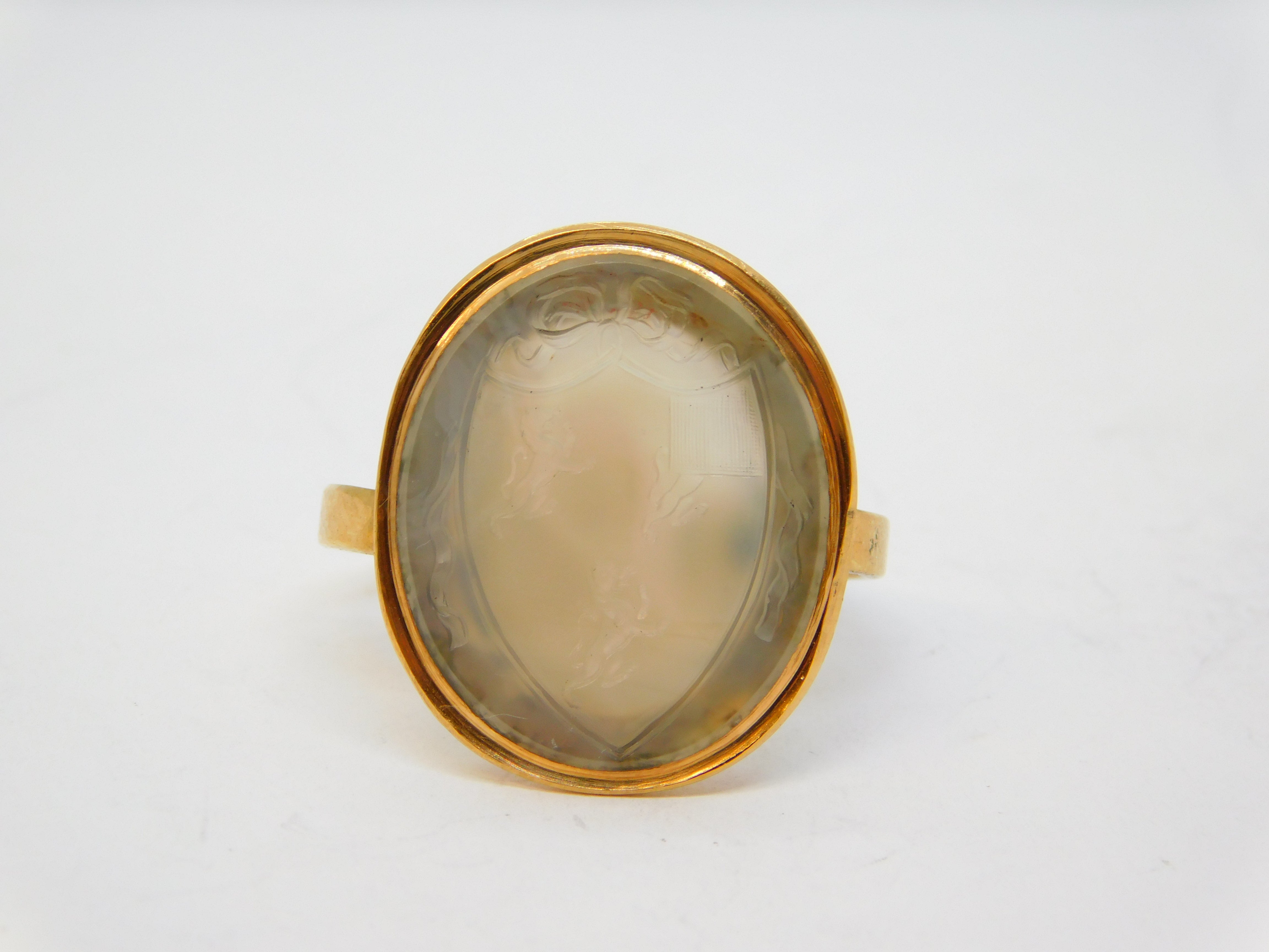 Details: A fantastic and wonderfully designed antique georgian 18ct yellow gold mounted carved chalcedony agate armorial seal signet ring with superb detail, the gold has been XRF tested as it is unmarked. The ring is typical of the period and likely belonged to an aristocratic gentleman designed for sealing letters and documents. This is a wonderful item that would make a perfect gift or addition to any collection. We are more than happy to provide XRF reports for items upon request.