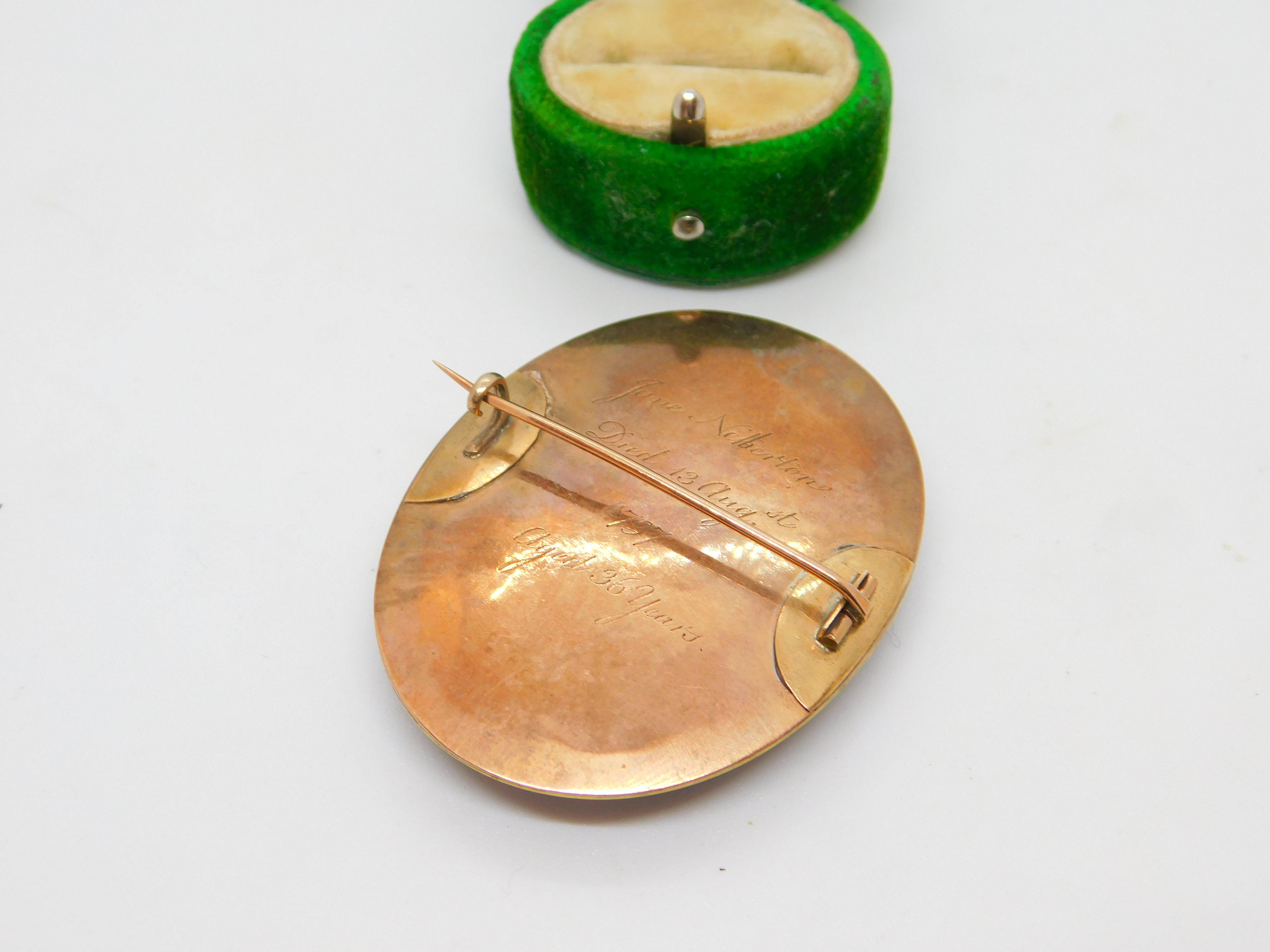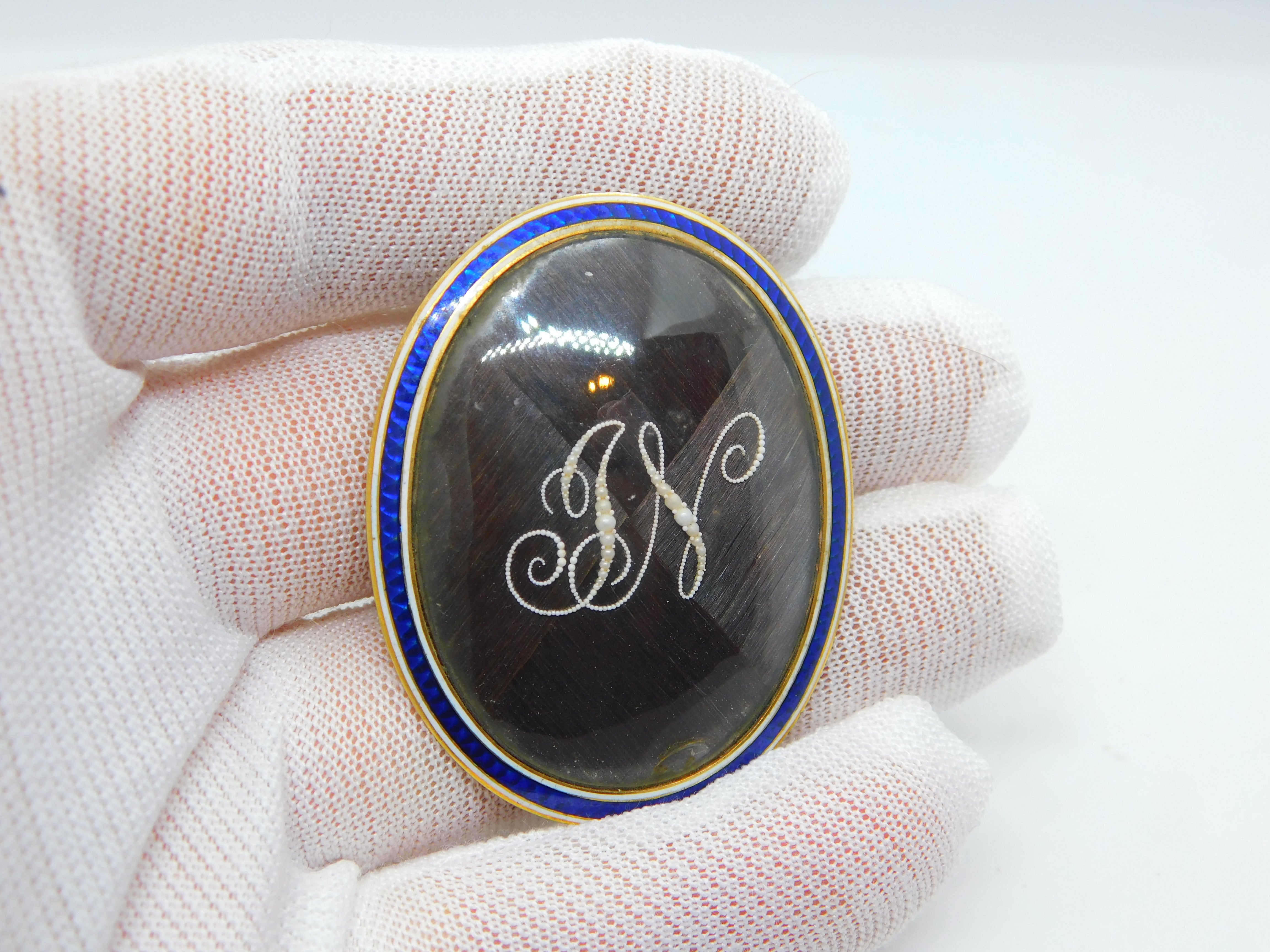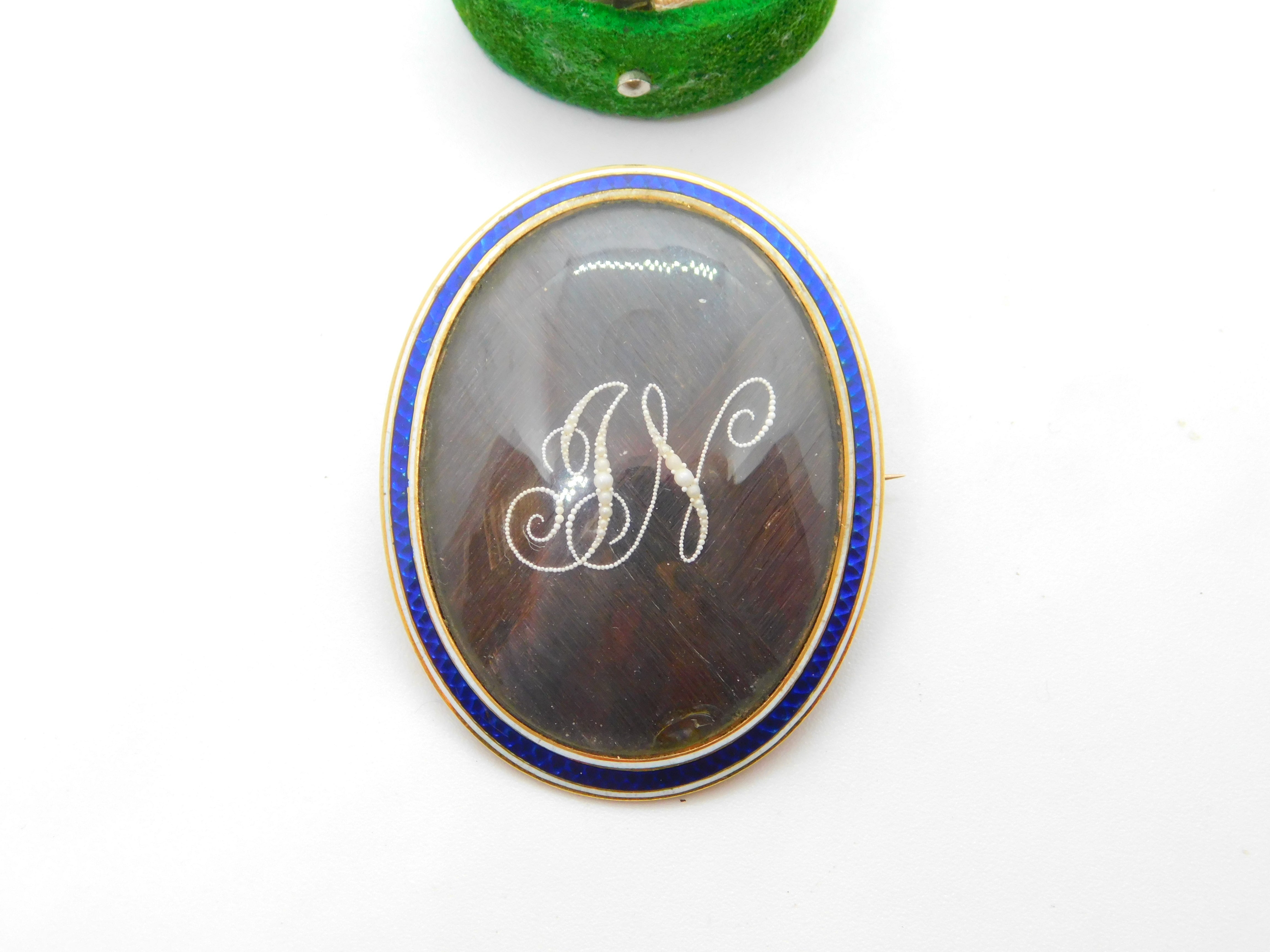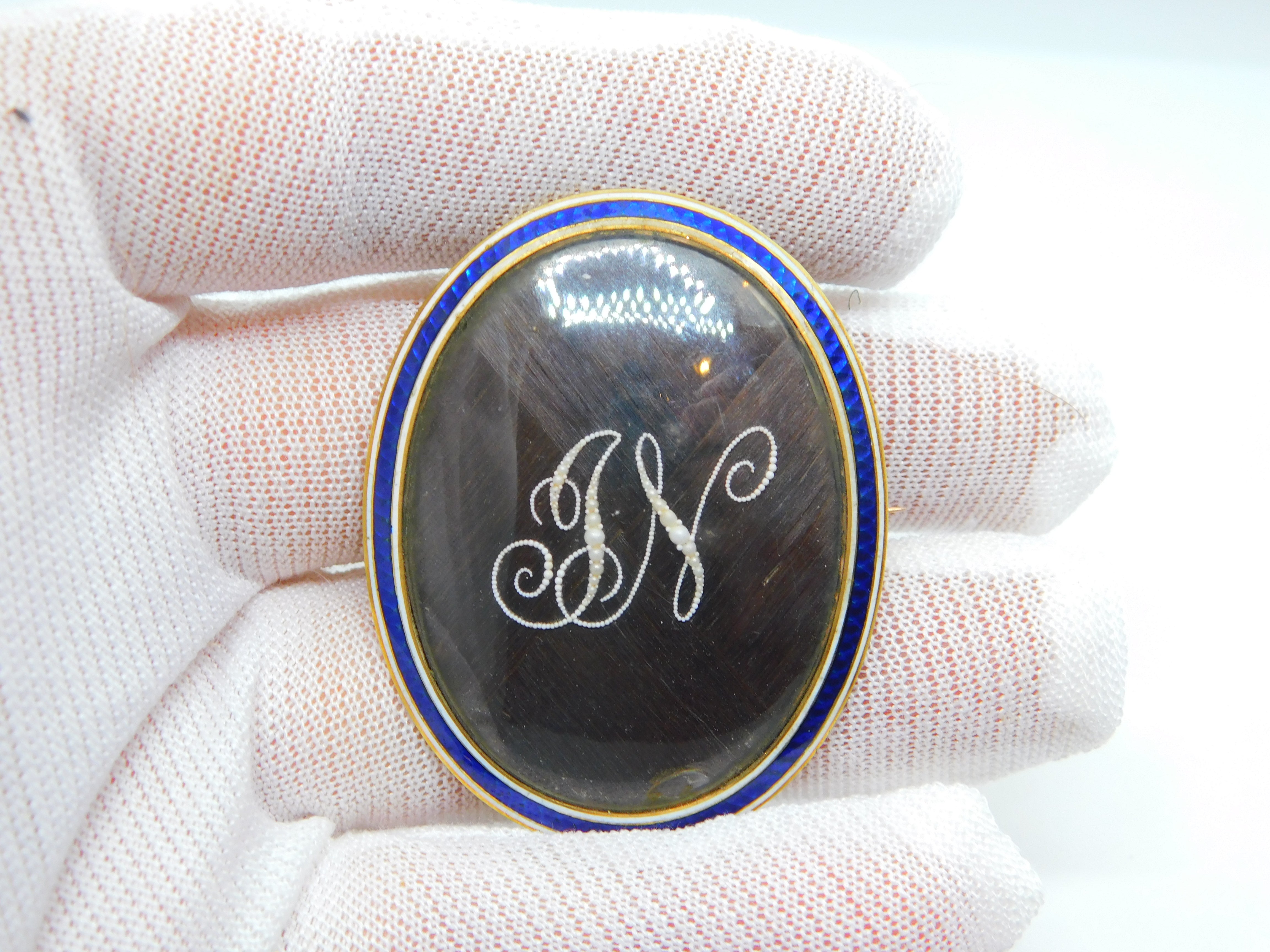 Details: A fantastic and wonderfully designed antique Georgian 9ct rose gold set mourning brooch with blue-white enamel surrounding a central woven hair panel with delicately set seed pearls spelling the initials 'JN'. The brooch is engraved to the reverse reading 'Jane Neitherton, Died 13th Aug.st, 1797, aged 36 years'. The gold has been XRF tested as it is unmarked.