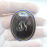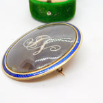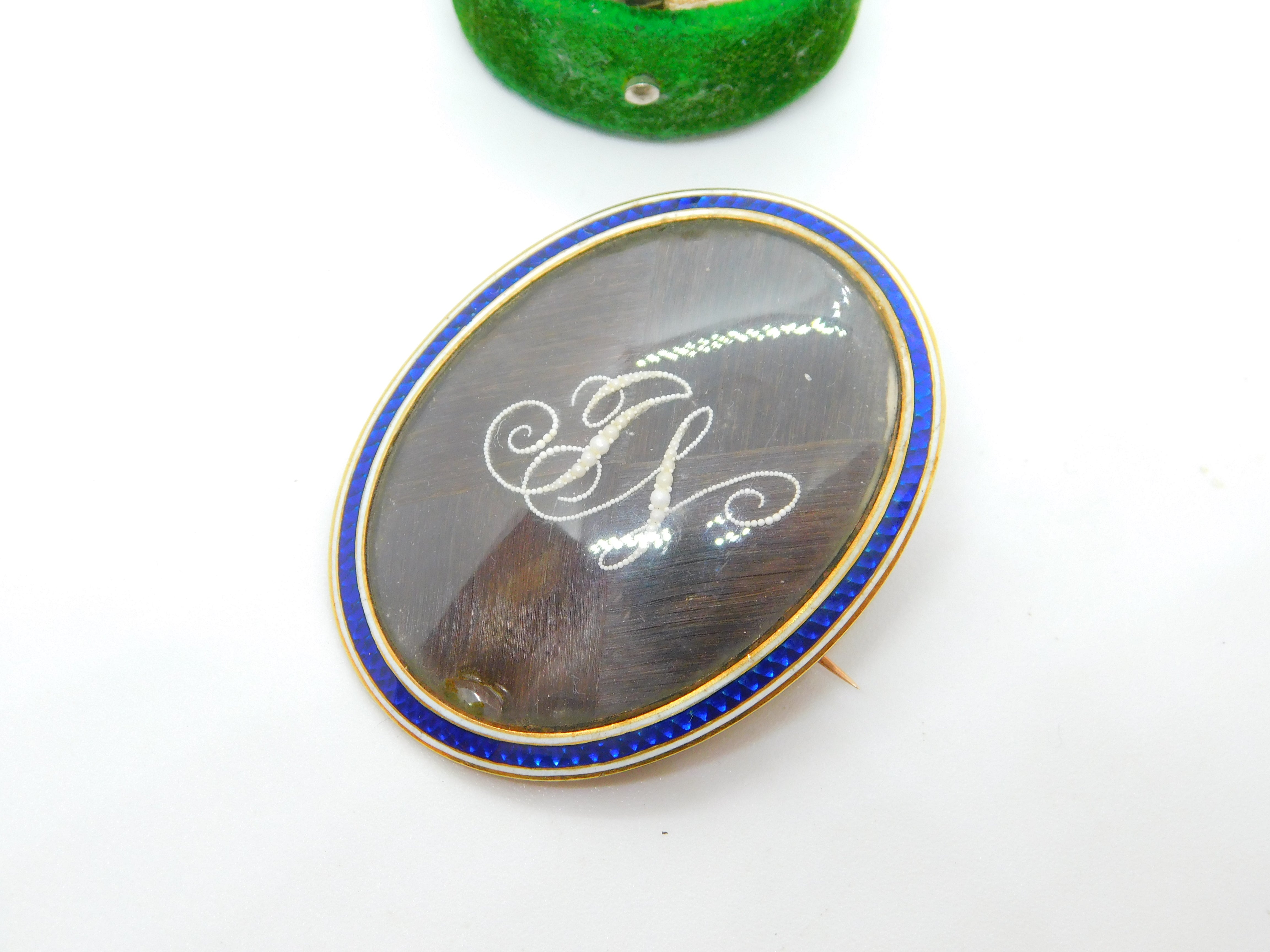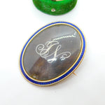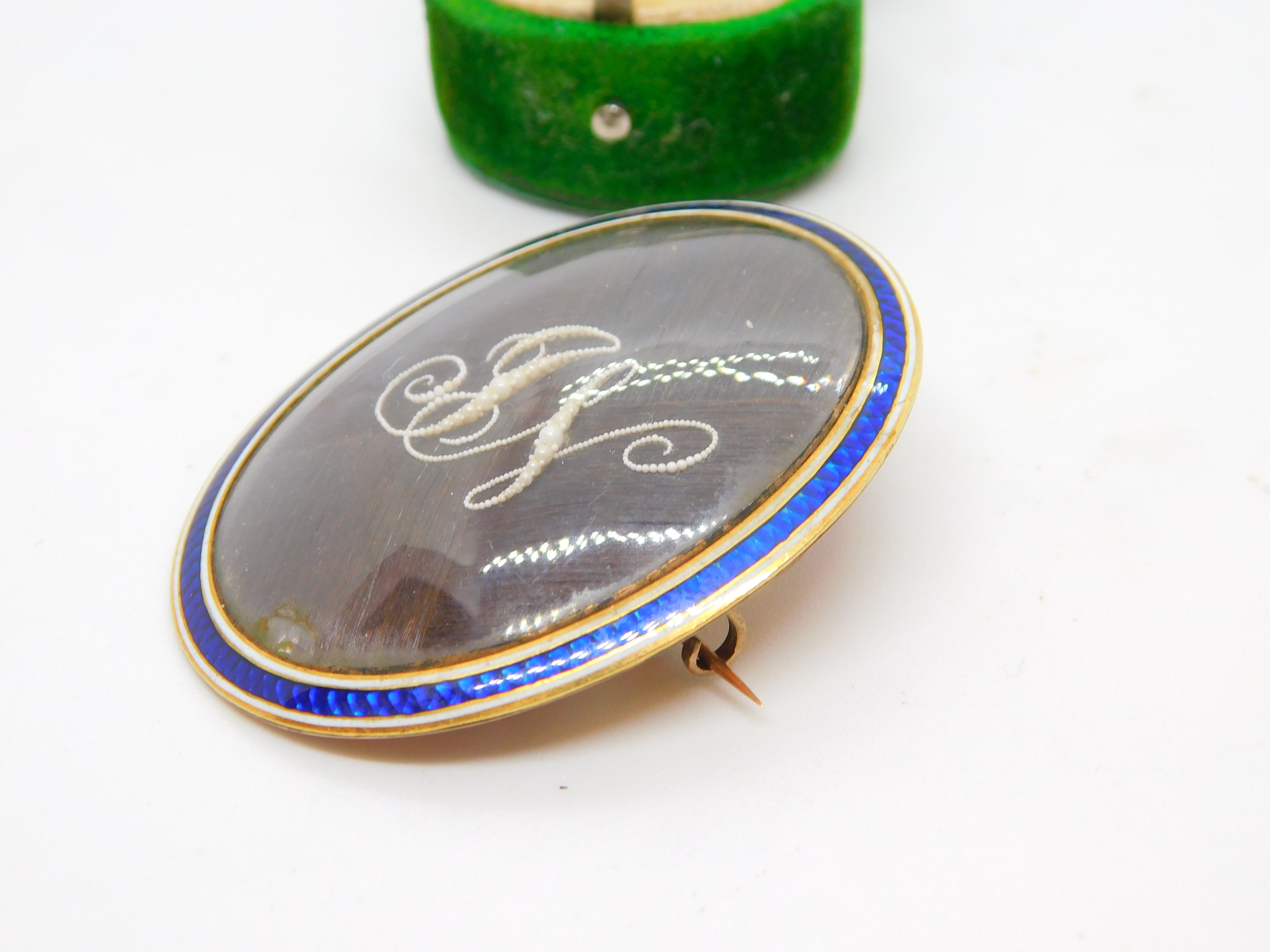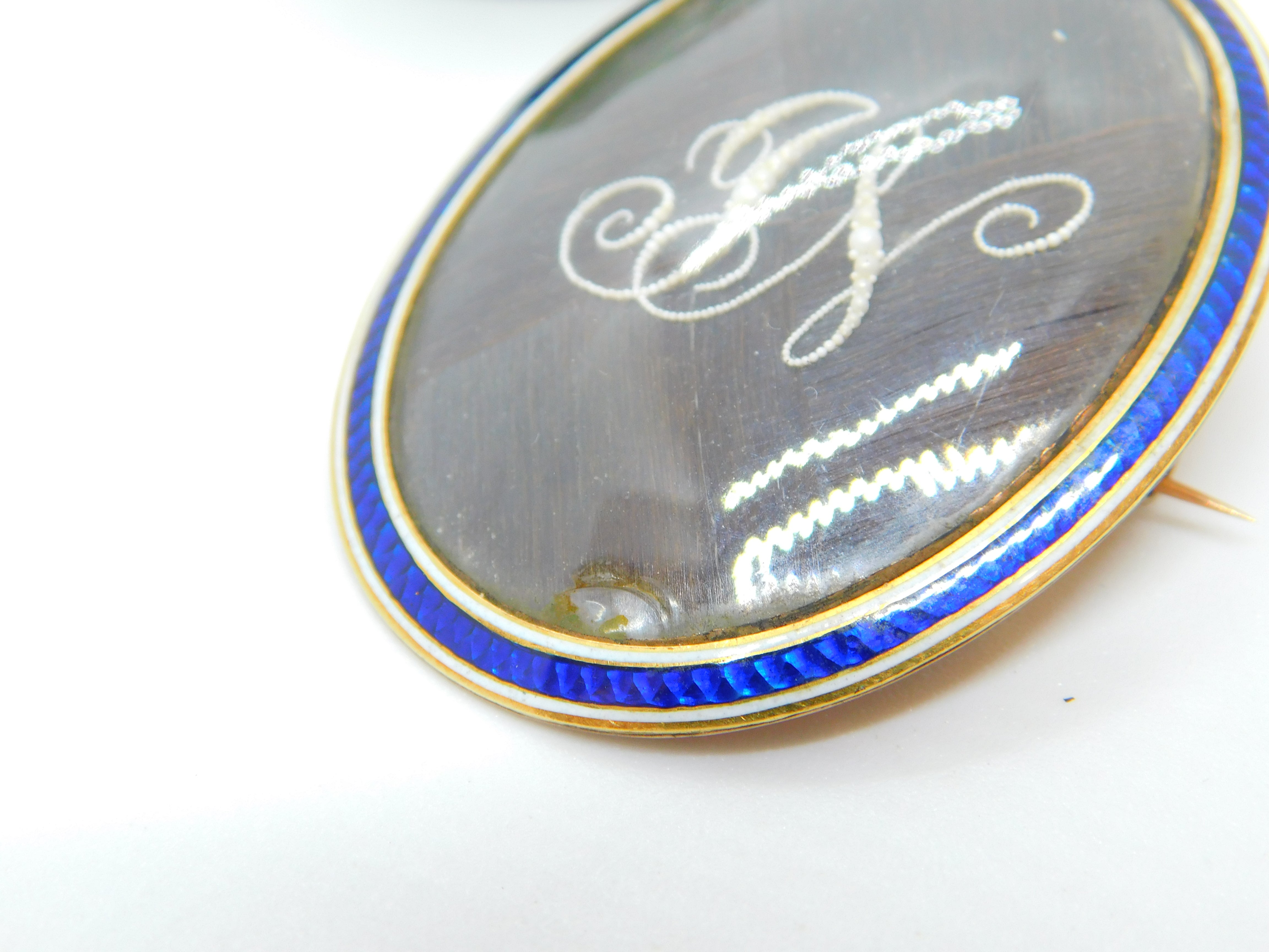 Details: A fantastic and wonderfully designed antique Georgian 9ct rose gold set mourning brooch with blue-white enamel surrounding a central woven hair panel with delicately set seed pearls spelling the initials 'JN'. The brooch is engraved to the reverse reading 'Jane Neitherton, Died 13th Aug.st, 1797, aged 36 years'. The gold has been XRF tested as it is unmarked.