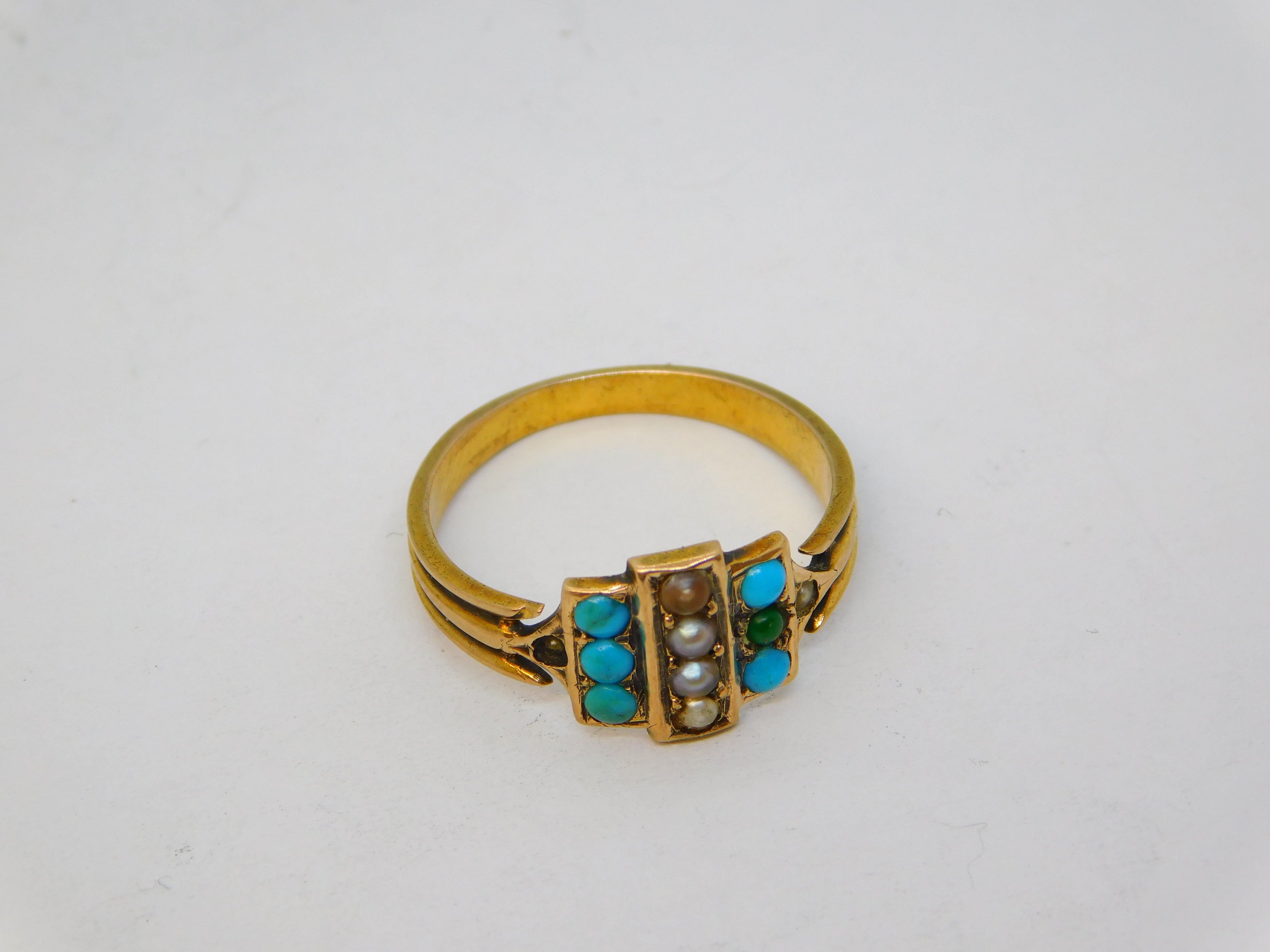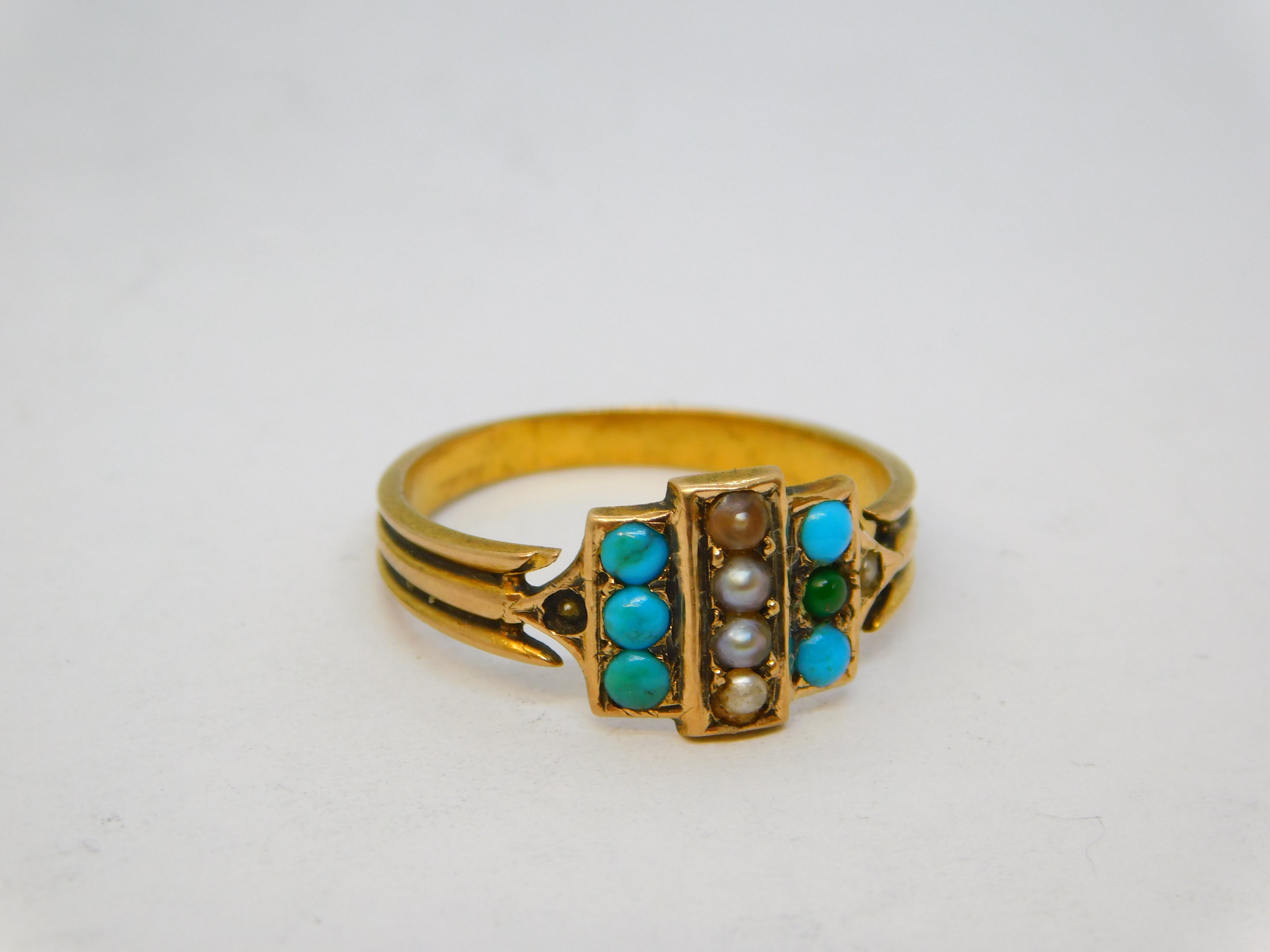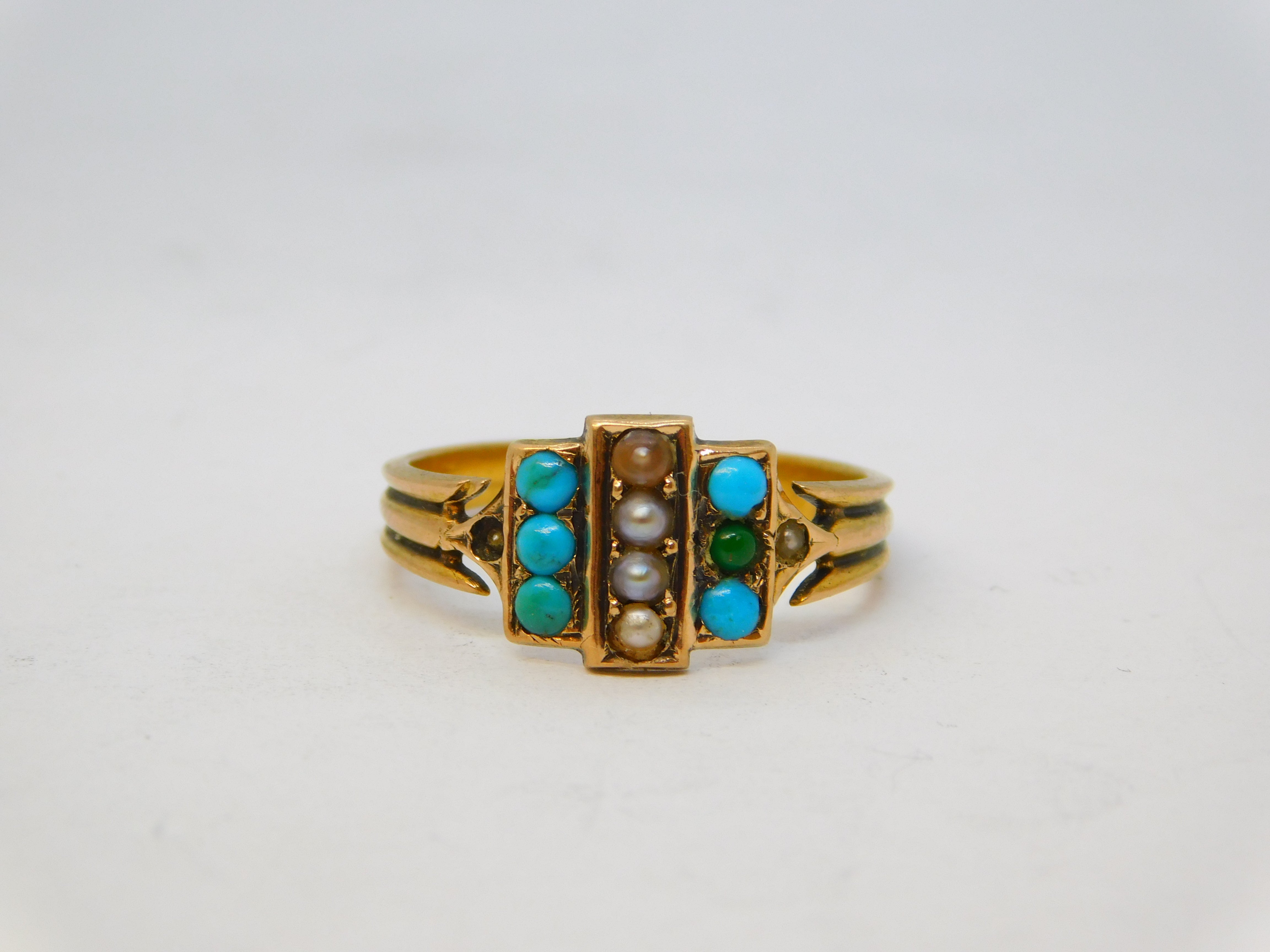 Details: A fantastic and wonderfully designed antique georgian 15ct yellow gold dress ring set with central seed pearls flanked by turquoise stones c1830, the gold has been XRF tested as it is unmarked. This is a wonderful item that would make a perfect gift or addition to any collection.