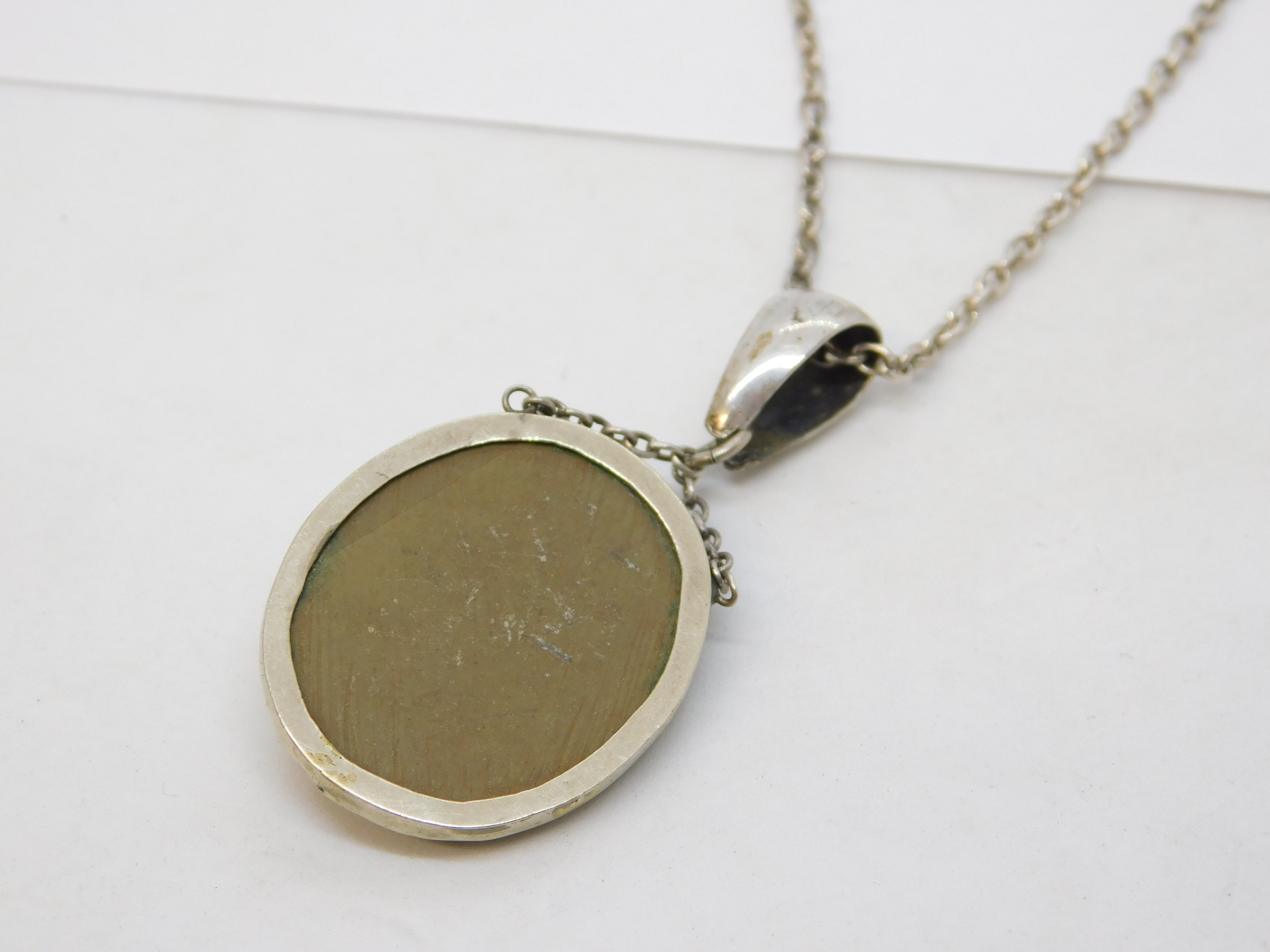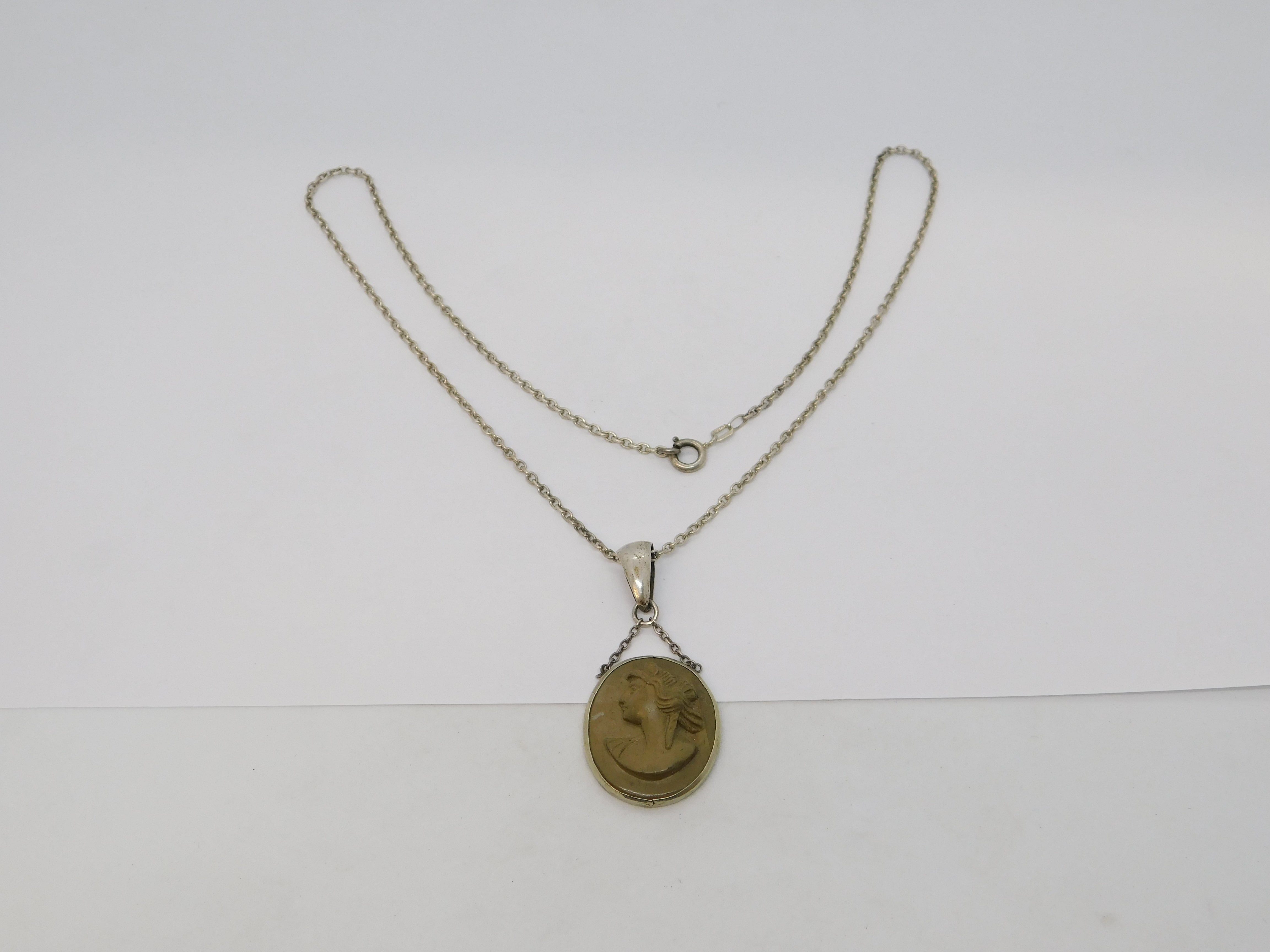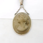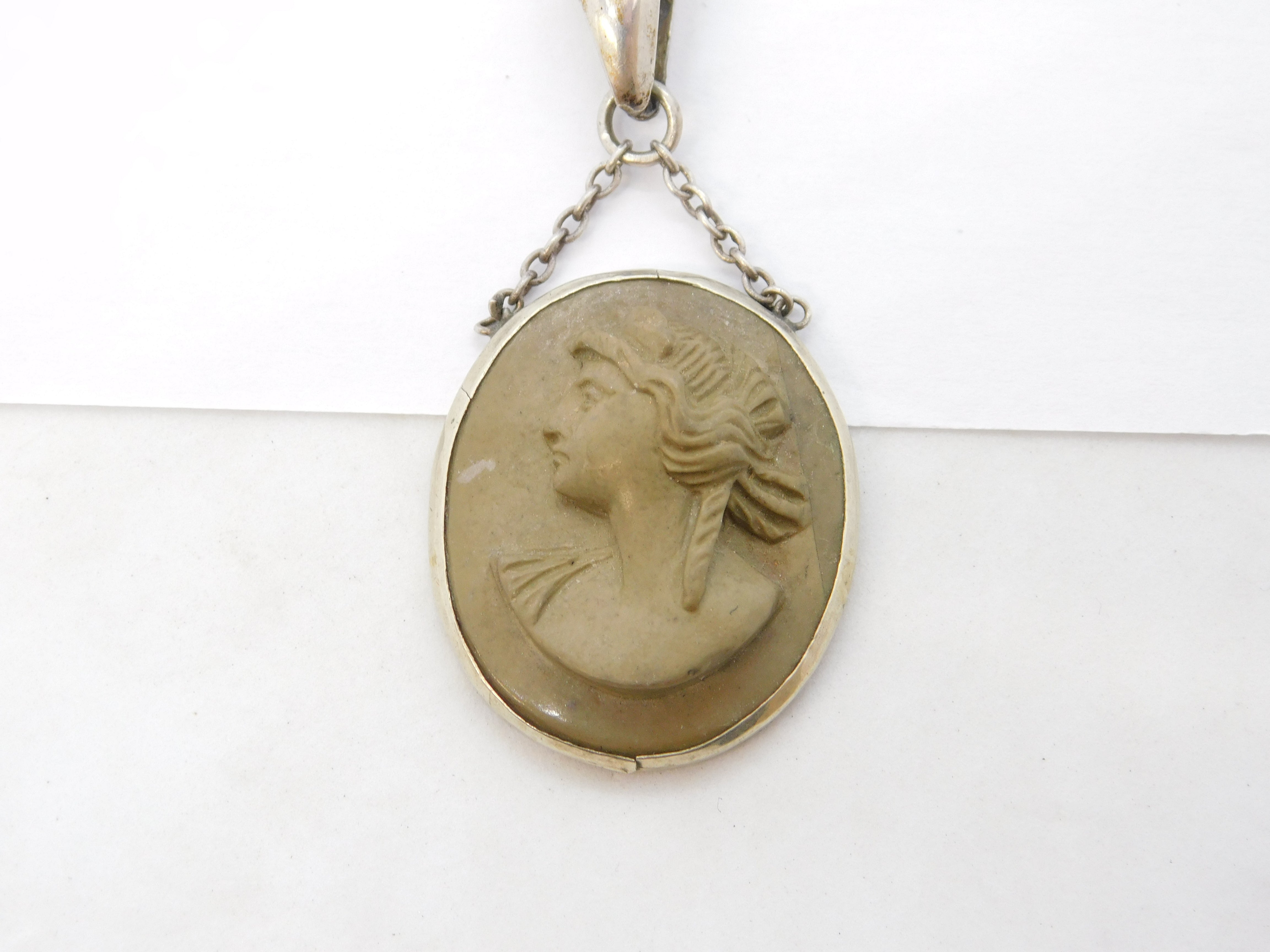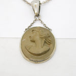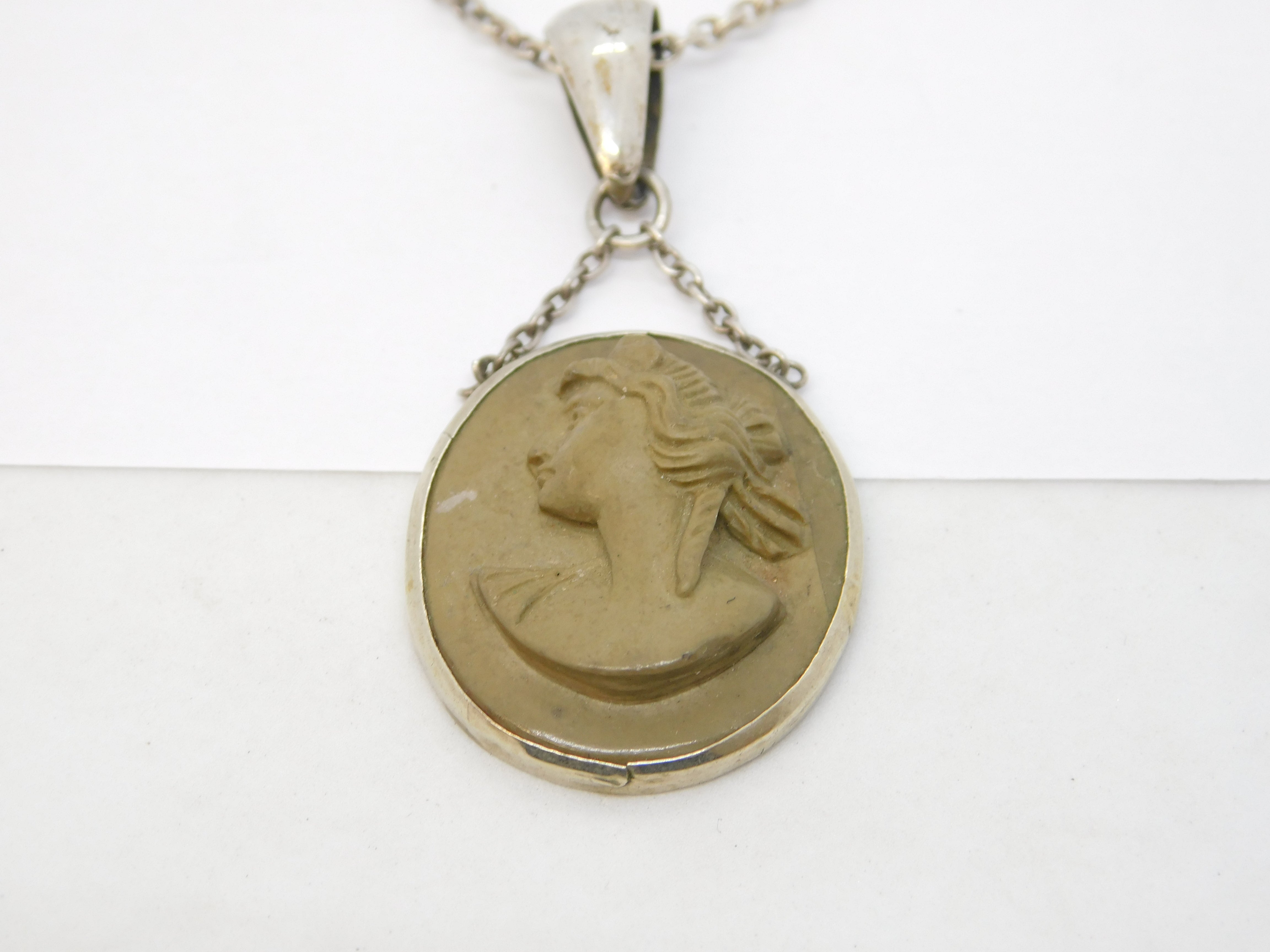 Details: A fantastic and wonderfully designed antique georgian regency period sterling silver mounted high relief cameo depicting a lady in profile crafted from carved lava c1830, set on a later sterling silver chain. The silver has been XRF tested as it is unmarked. This is a wonderful item that would make a perfect gift or addition to any collection.