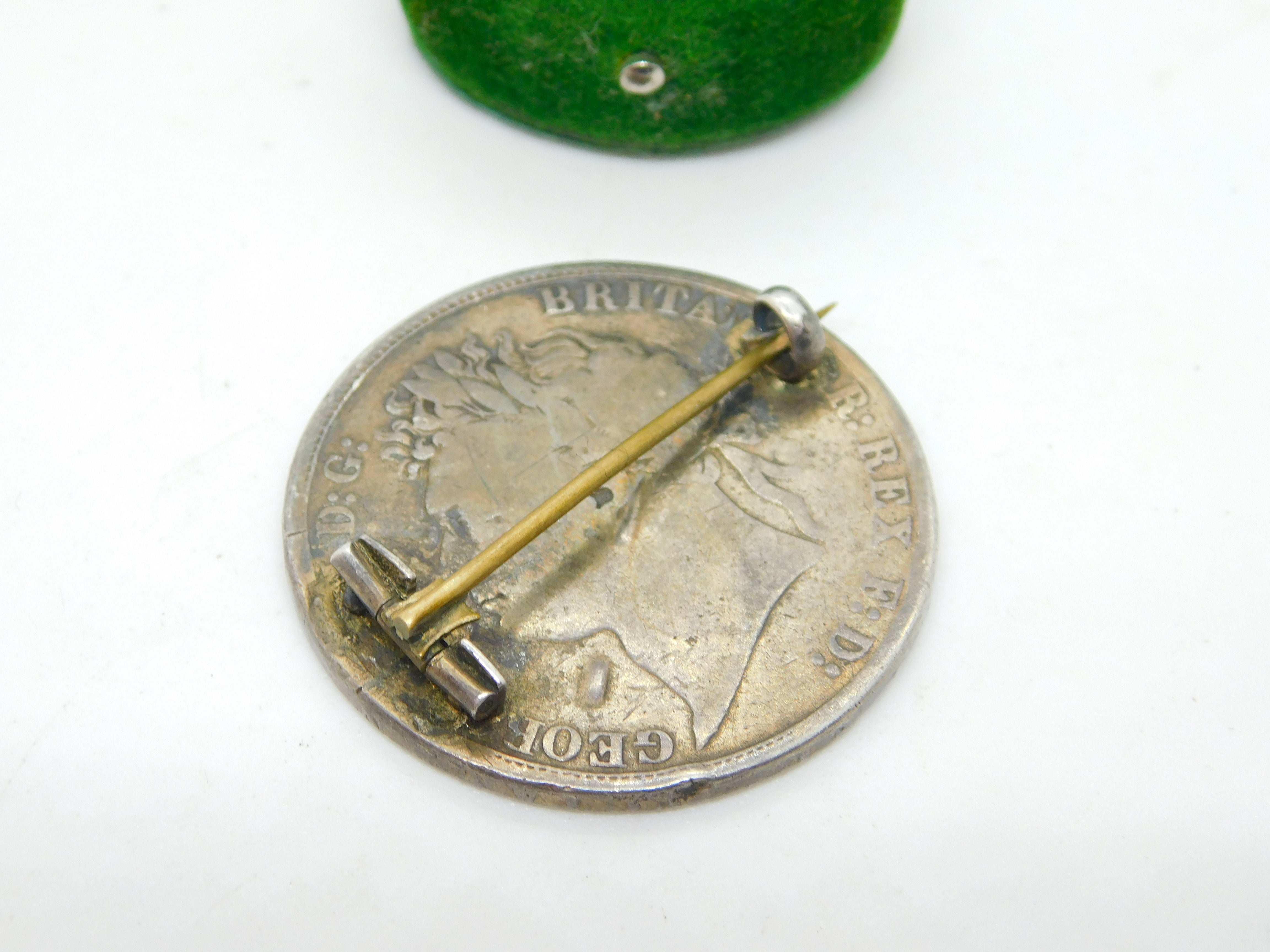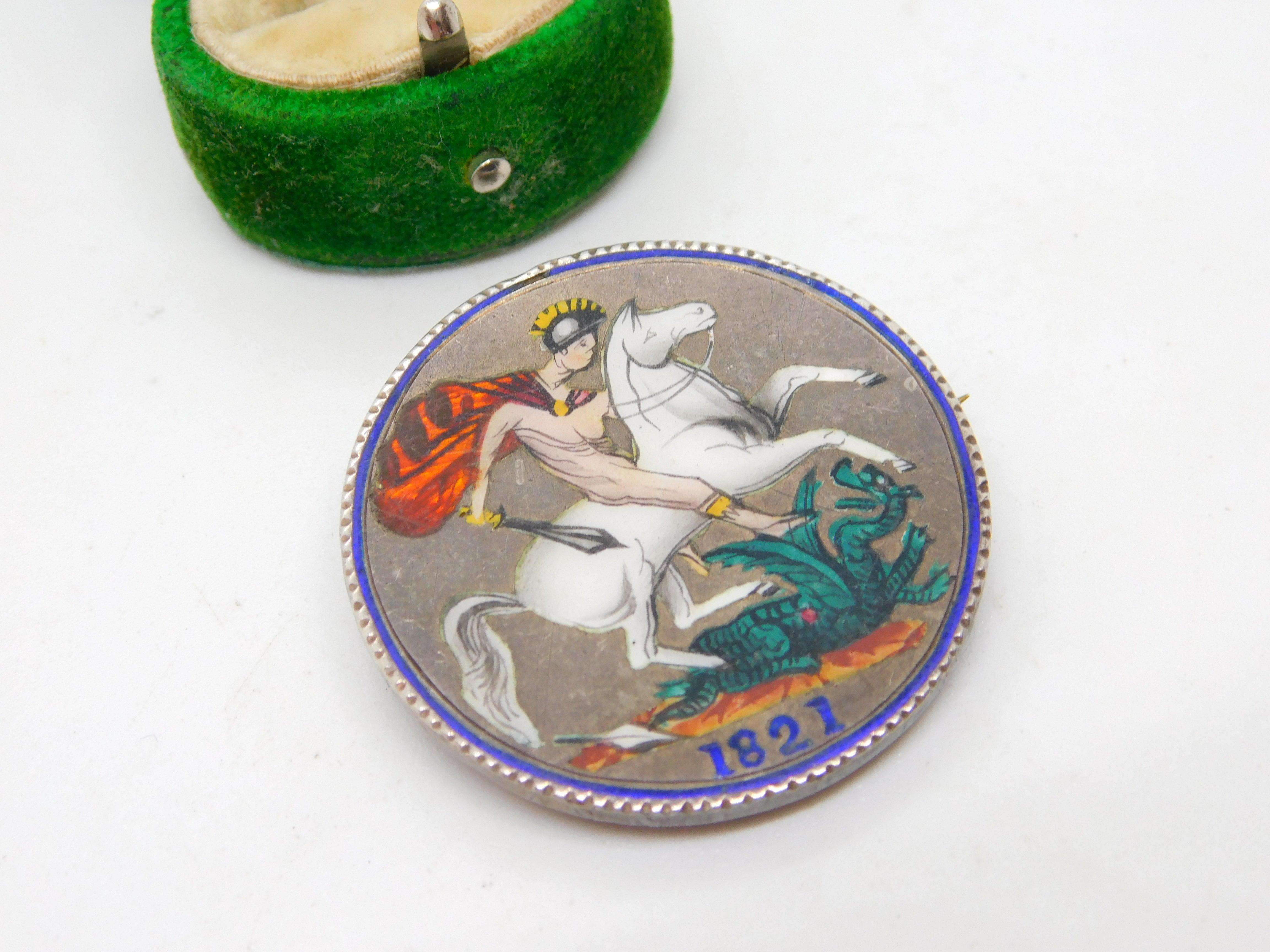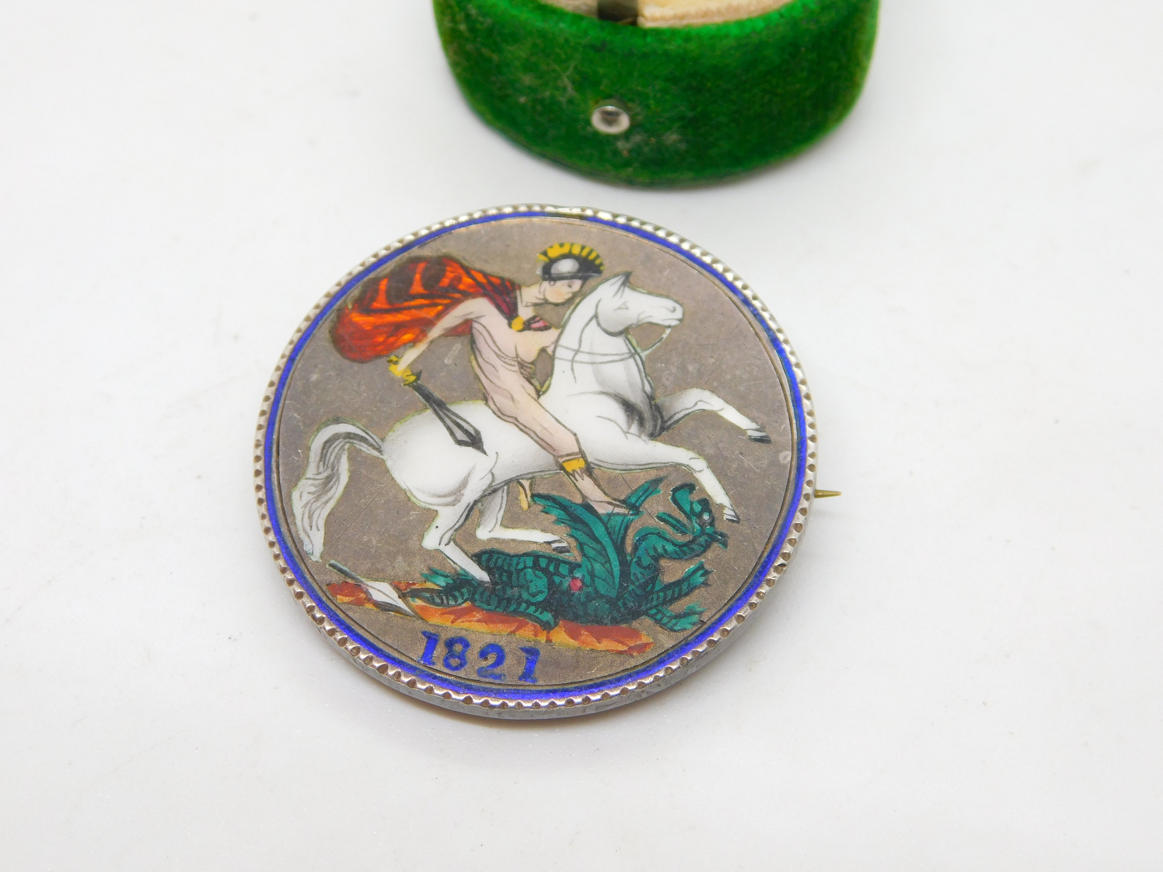 George IV Sterling Silver & Enamel Crown Coin Brooch Antique 1821