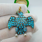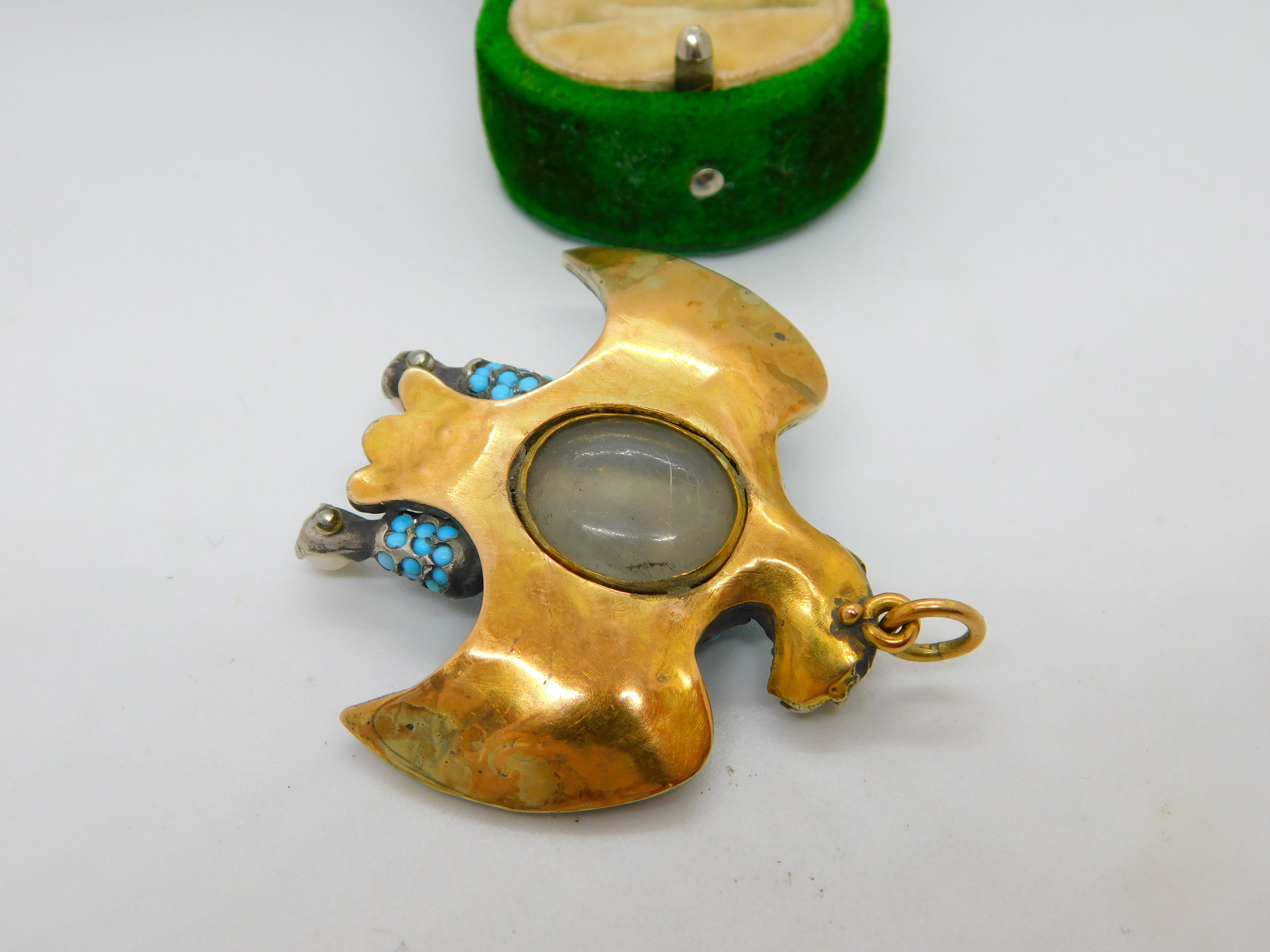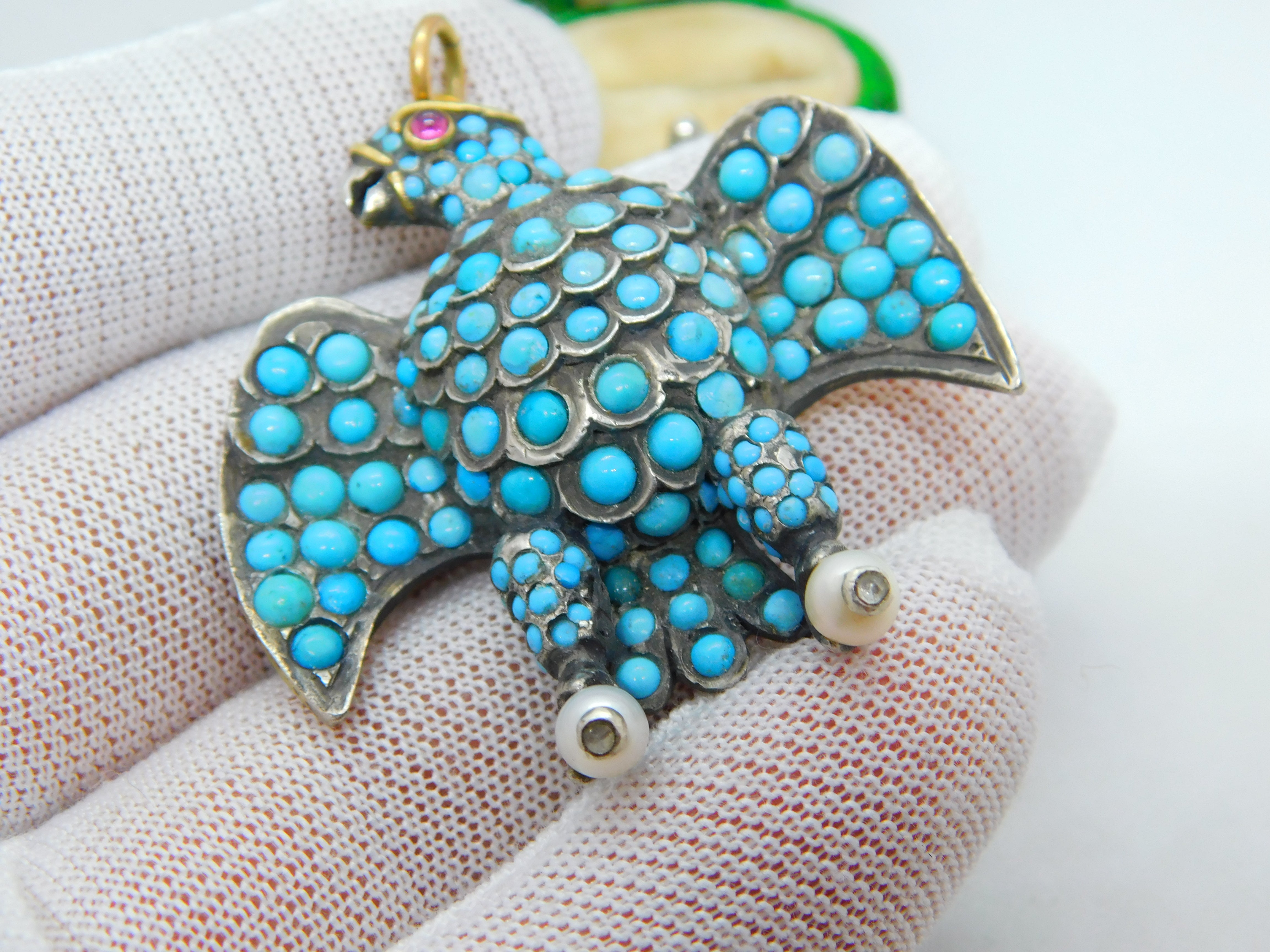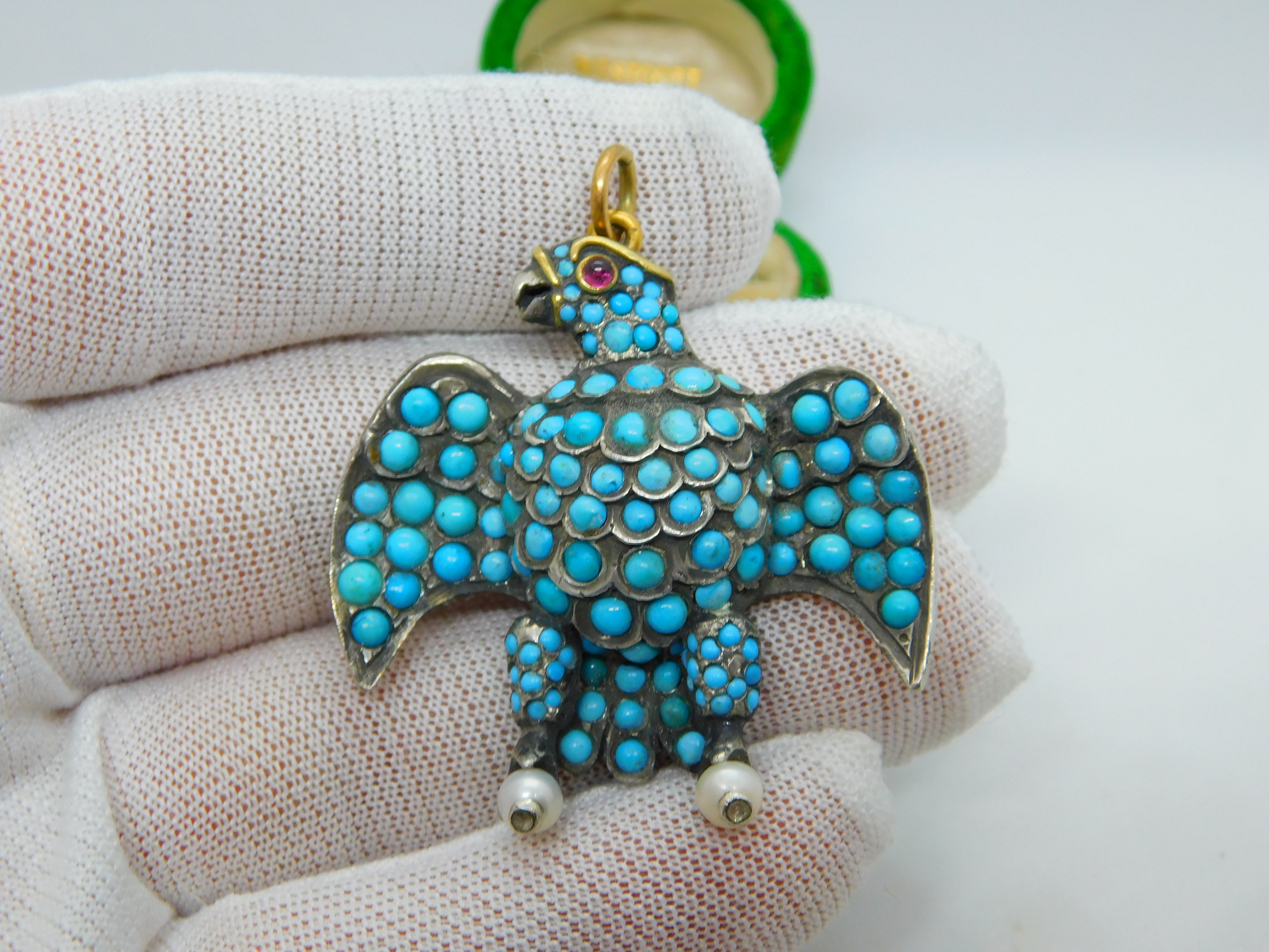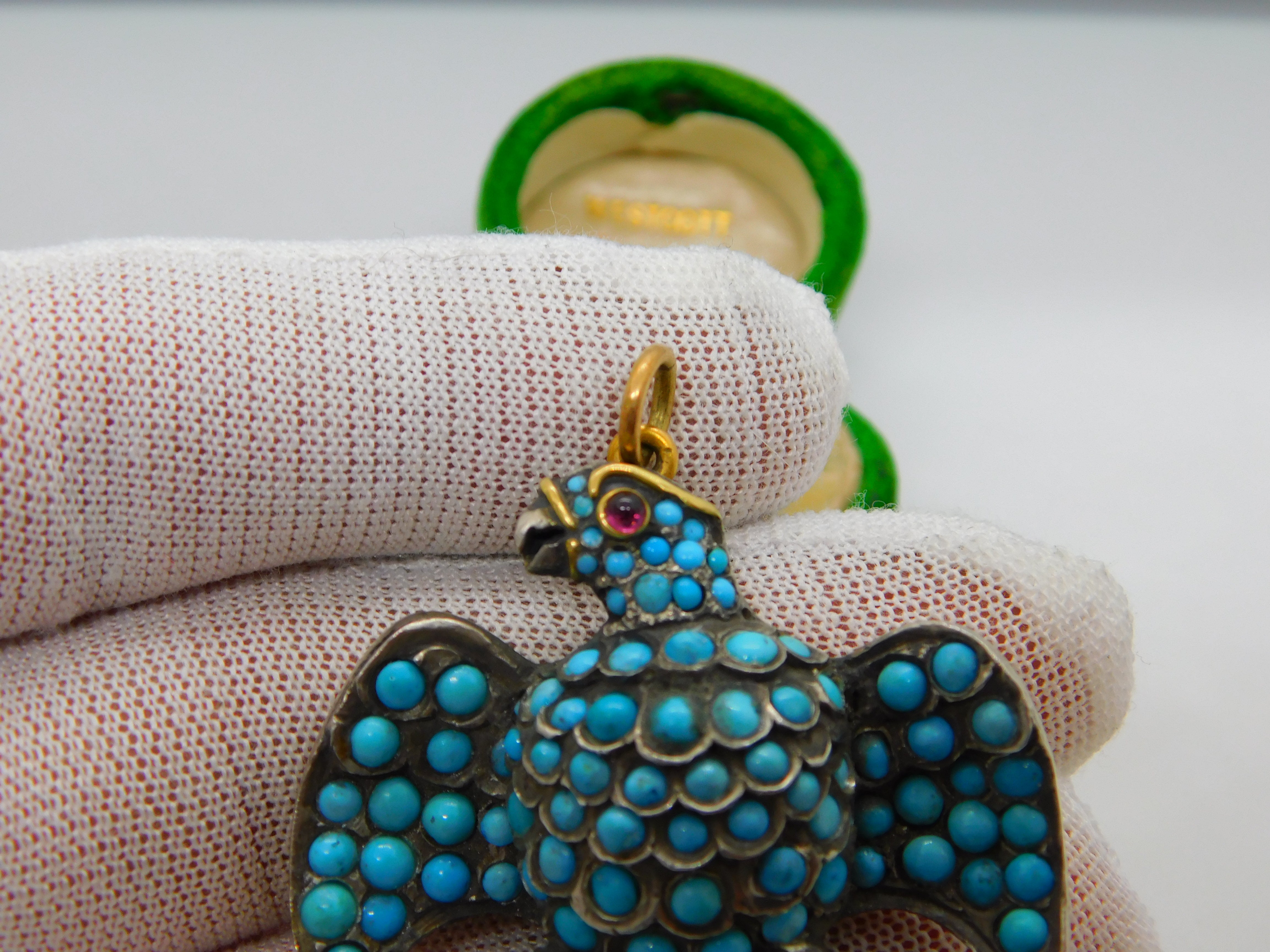 Details: A fantastic and wonderfully designed antique regency period large Georgian 18ct yellow gold eagle bird mourning pendant set adorned with turquoise stones pave set in sterling silver c1830. The eagle features a locket to the reverse and as such was almost certainly a mourning pendant. The eyes of the eagle are set with a natural ruby and two old cut diamonds to the claws which also features pearls. The gold has been XRF tested as it is unmarked. A stunning eagle of mourning jewellery almost certainly austro-hungarian. This is a wonderful item that would make a perfect gift or addition to any collection. The BOX pictured is for PRESENTATION ONLY and is NOT included in the listings but used to frame the pictures unless specifically stated otherwise.