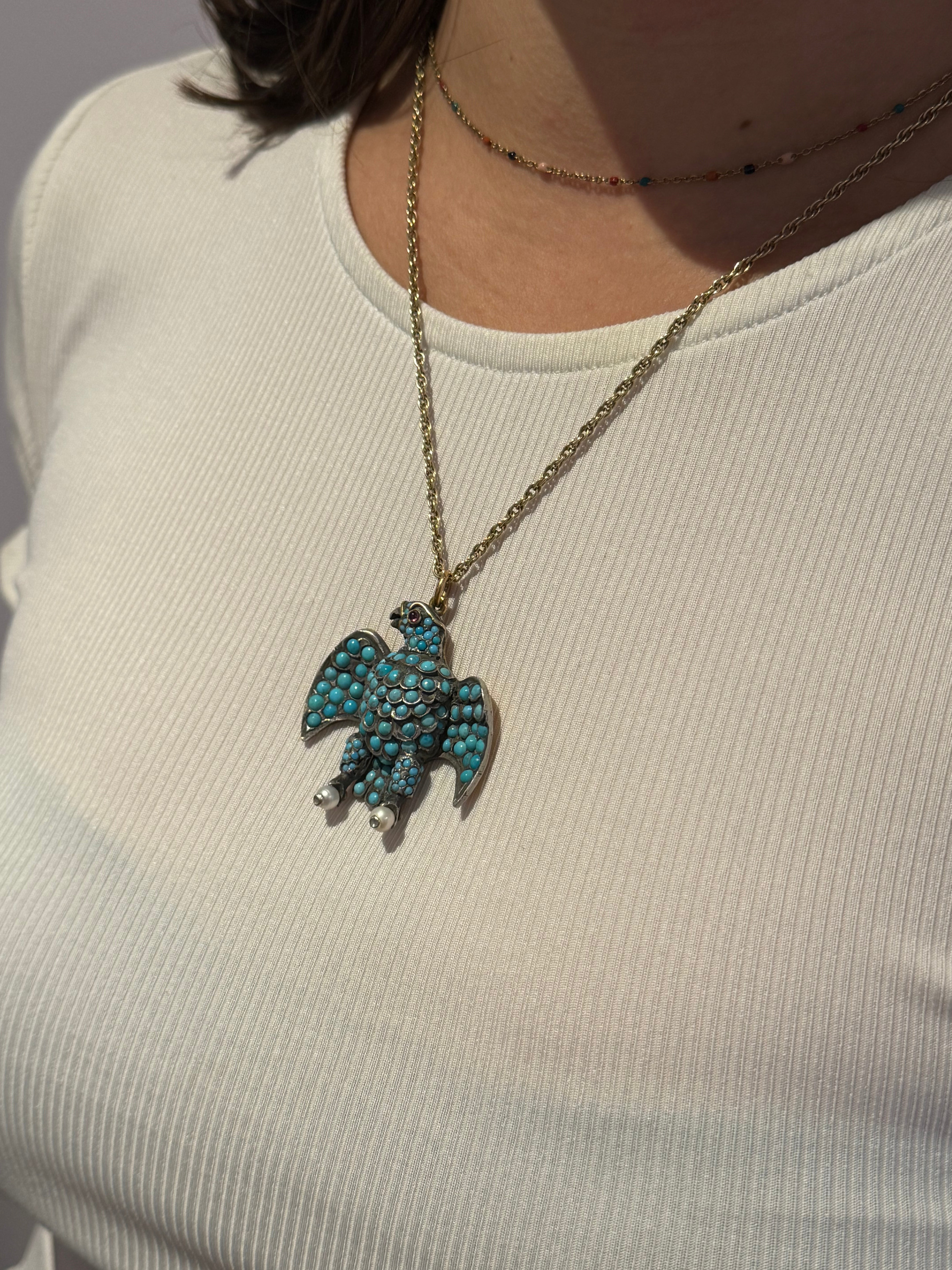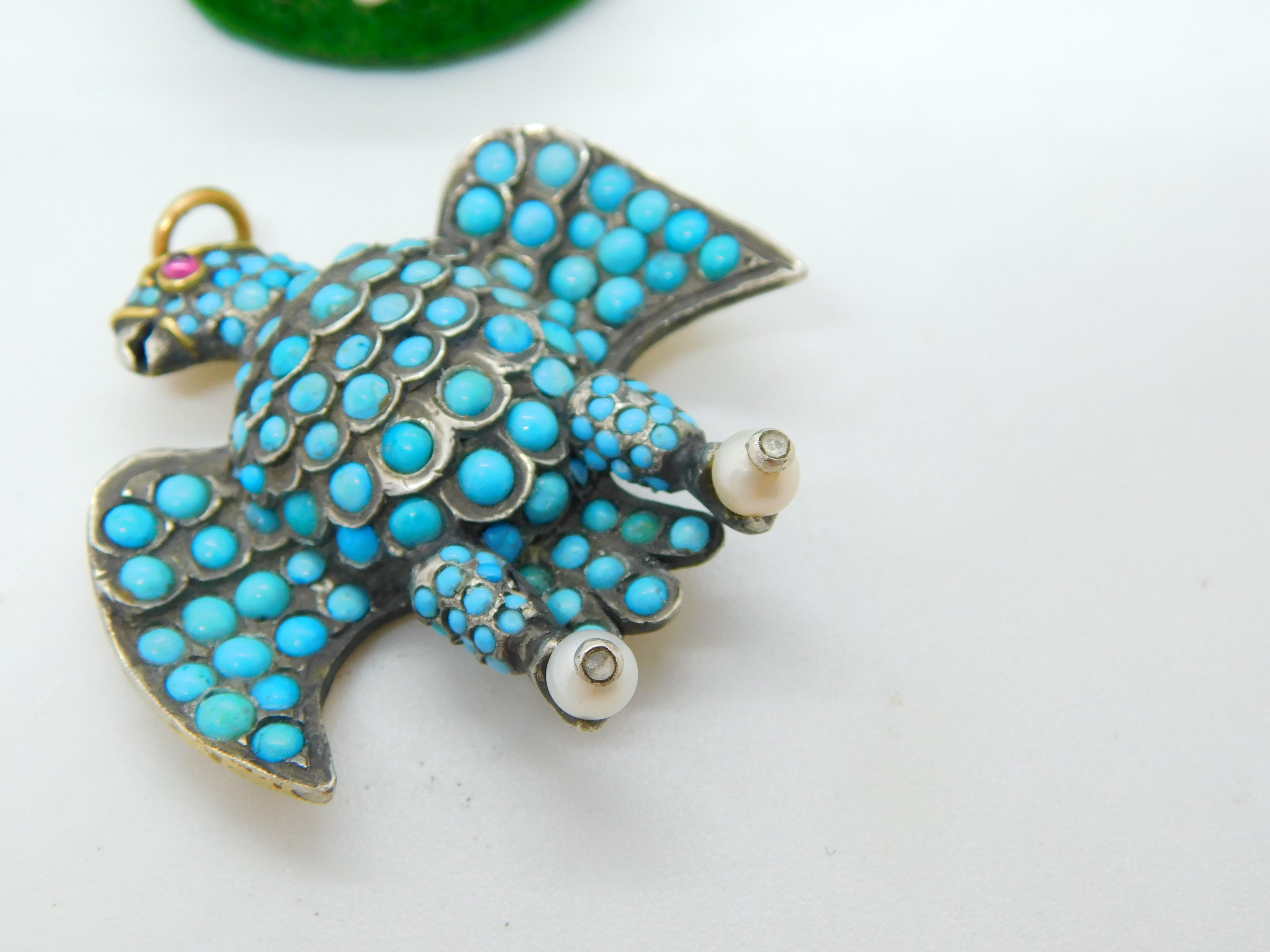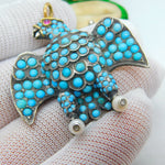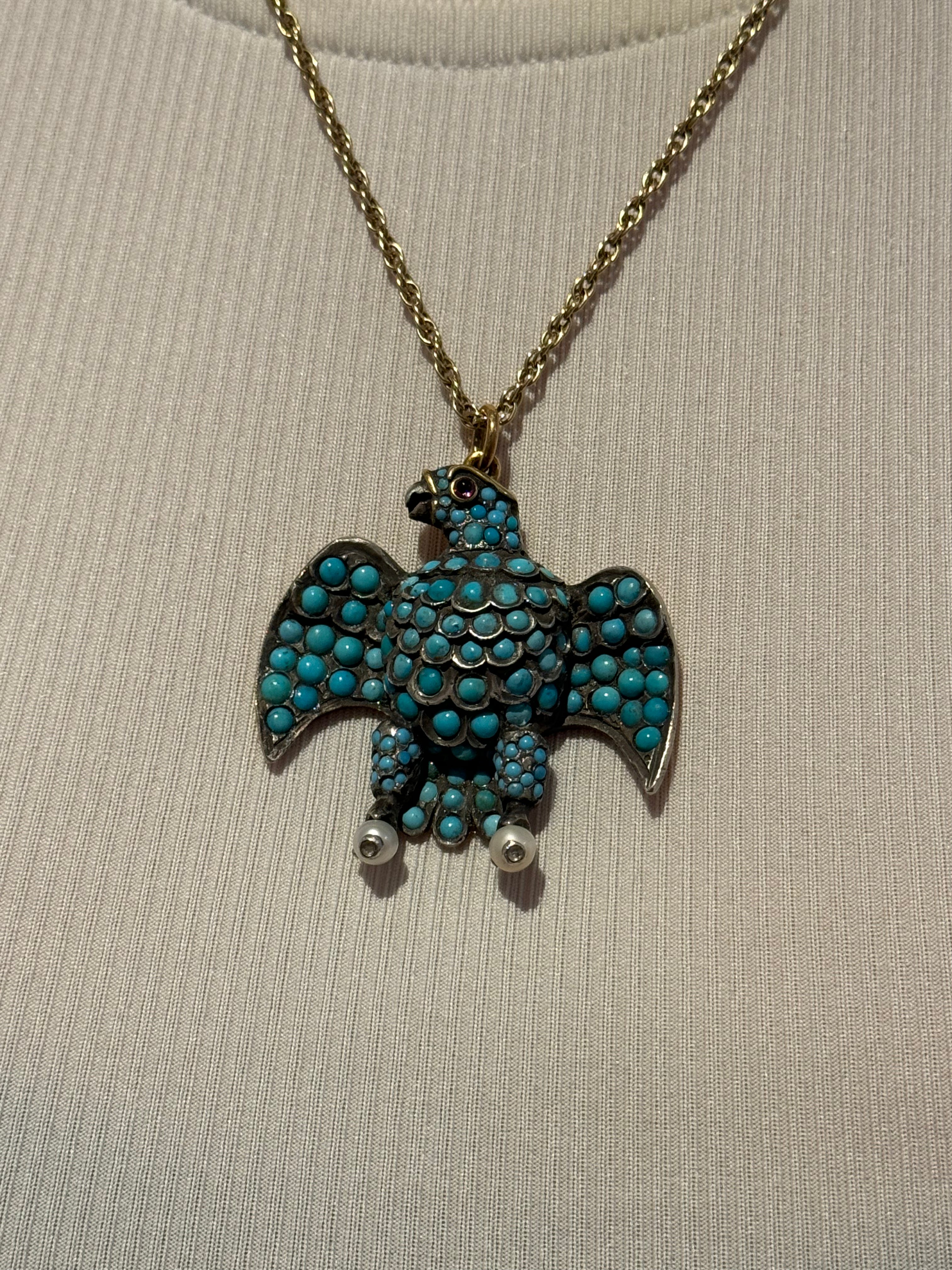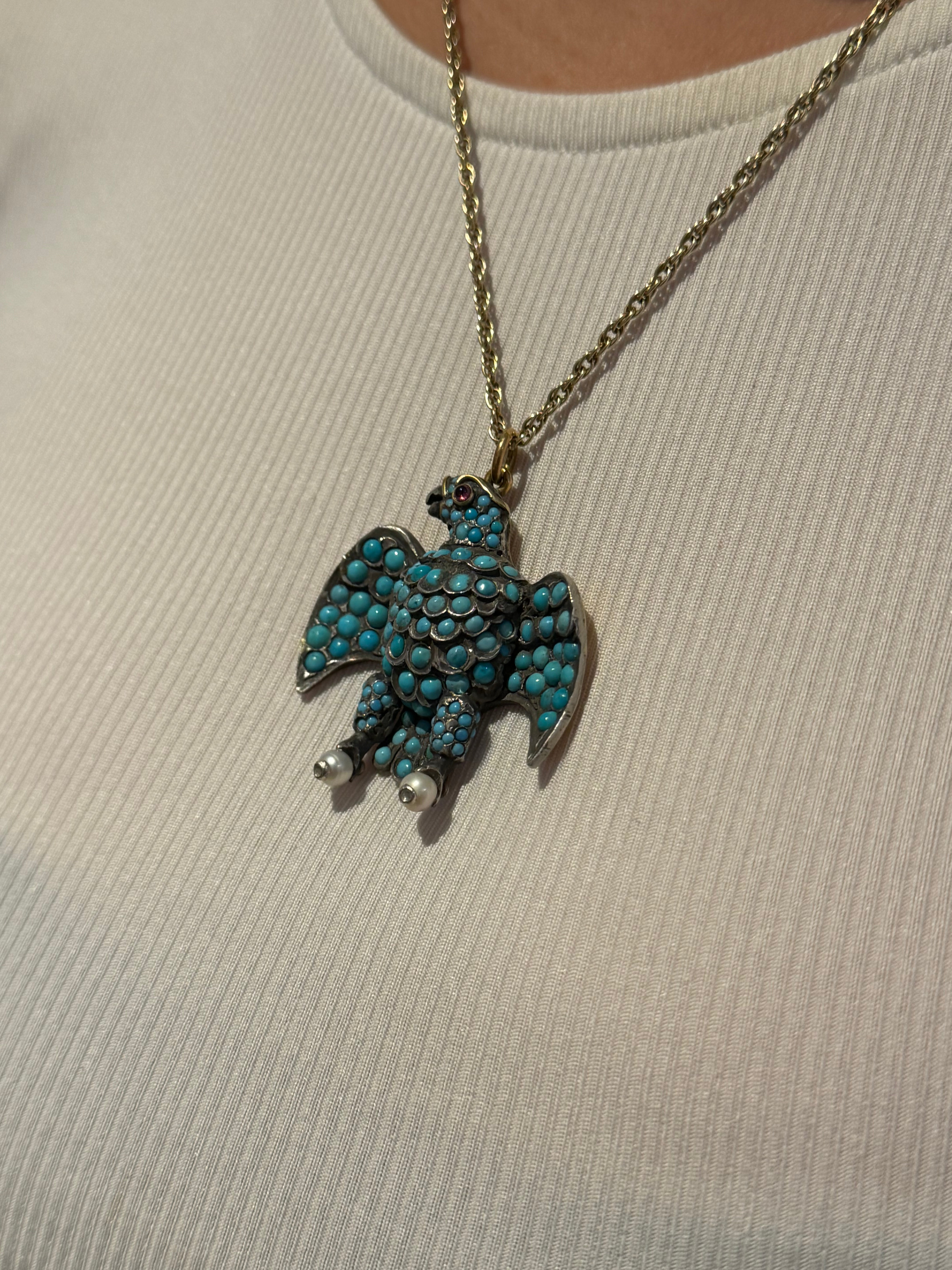 Details: A fantastic and wonderfully designed antique regency period large Georgian 18ct yellow gold eagle bird mourning pendant set adorned with turquoise stones pave set in sterling silver c1830. The eagle features a locket to the reverse and as such was almost certainly a mourning pendant. The eyes of the eagle are set with a natural ruby and two old cut diamonds to the claws which also features pearls. The gold has been XRF tested as it is unmarked. A stunning eagle of mourning jewellery almost certainly austro-hungarian. This is a wonderful item that would make a perfect gift or addition to any collection. The BOX pictured is for PRESENTATION ONLY and is NOT included in the listings but used to frame the pictures unless specifically stated otherwise.