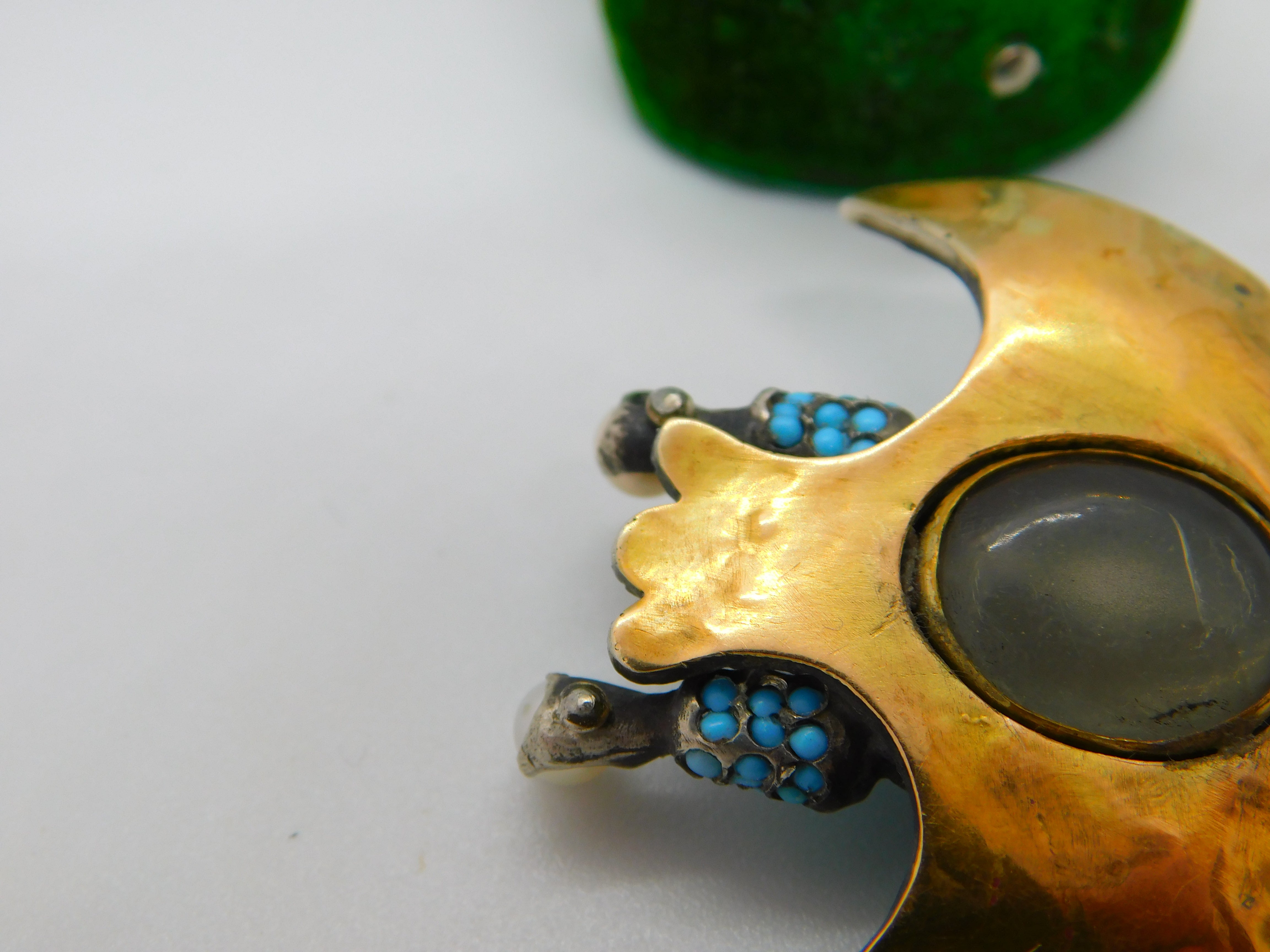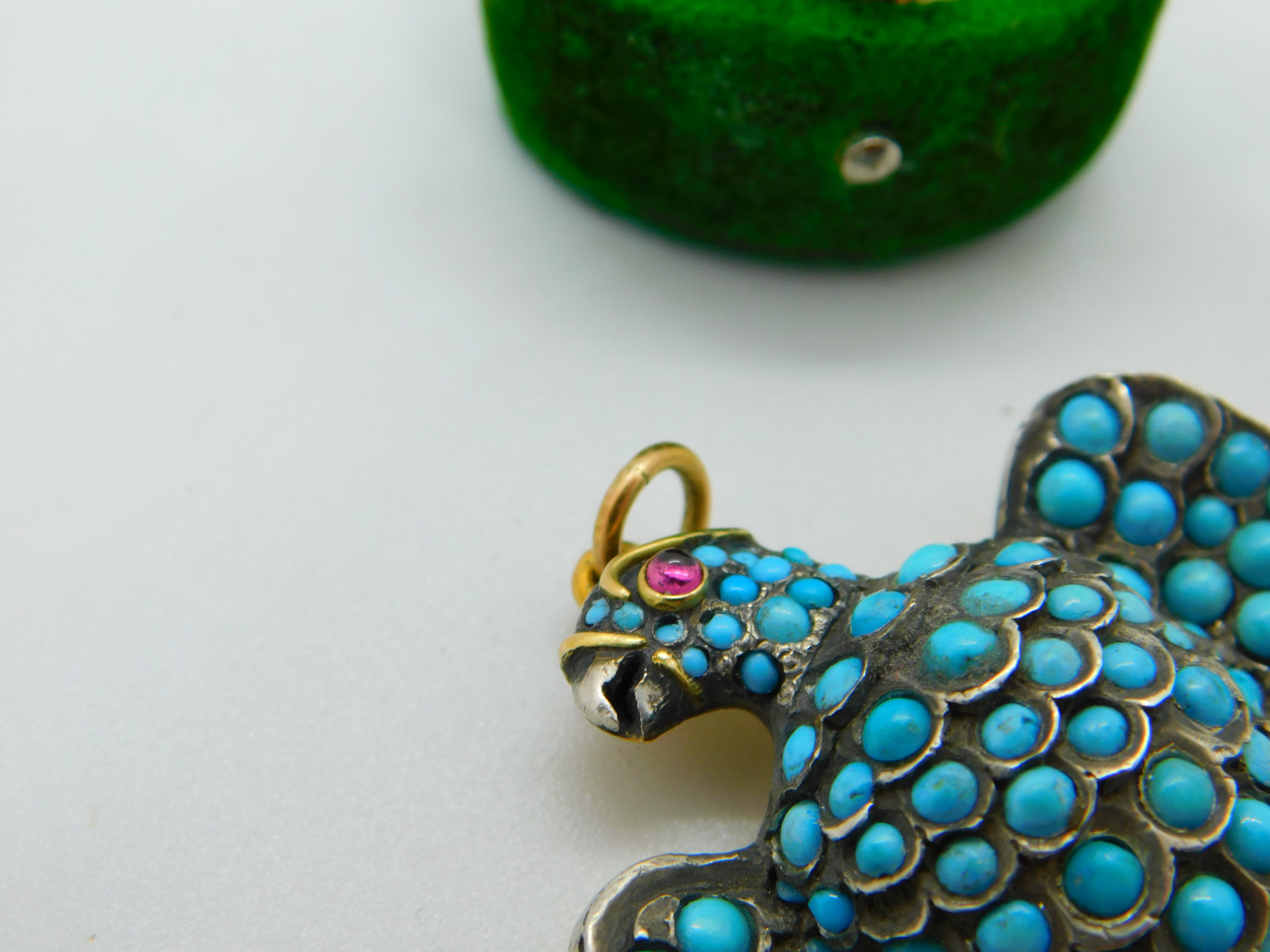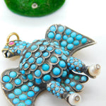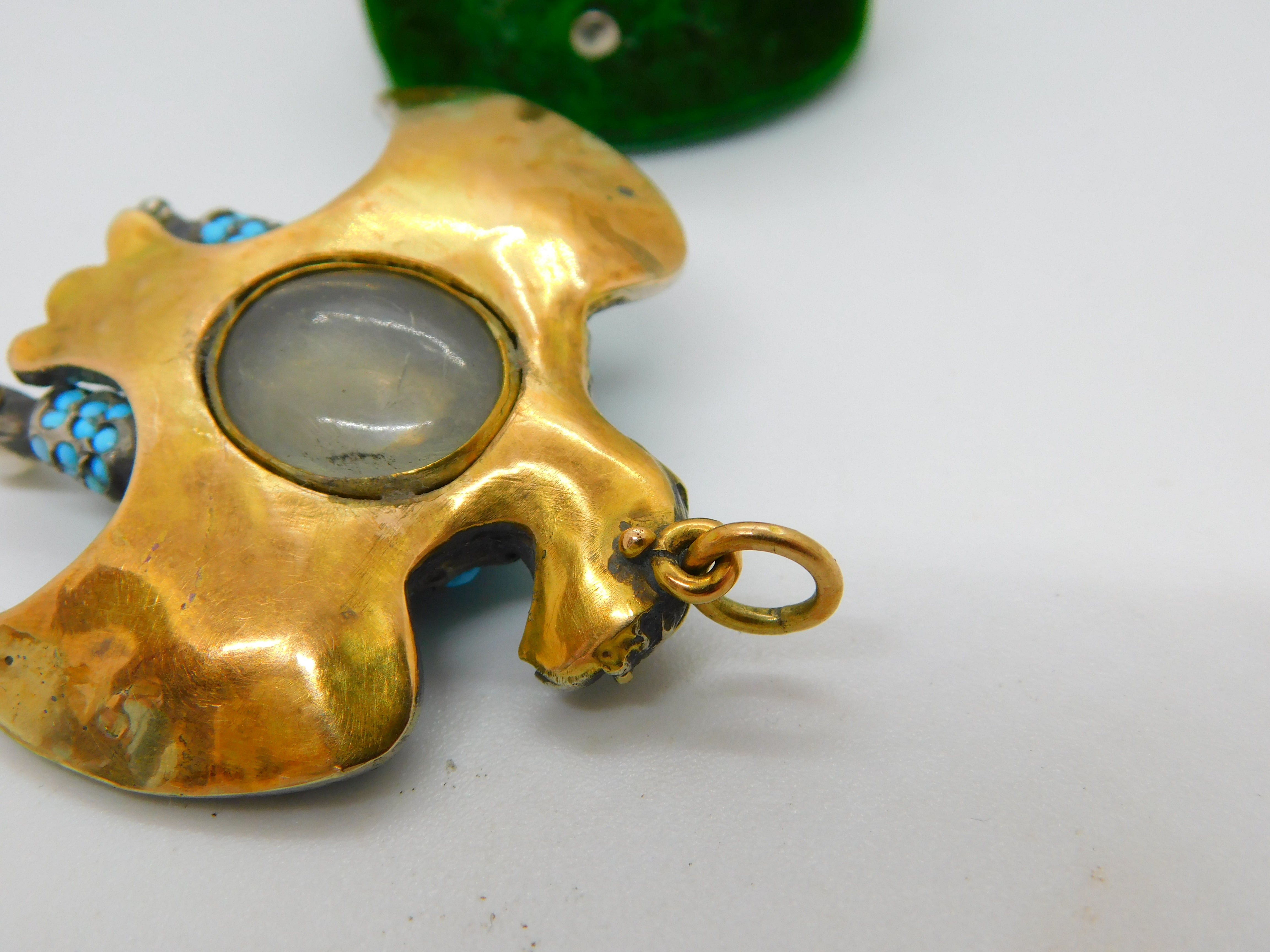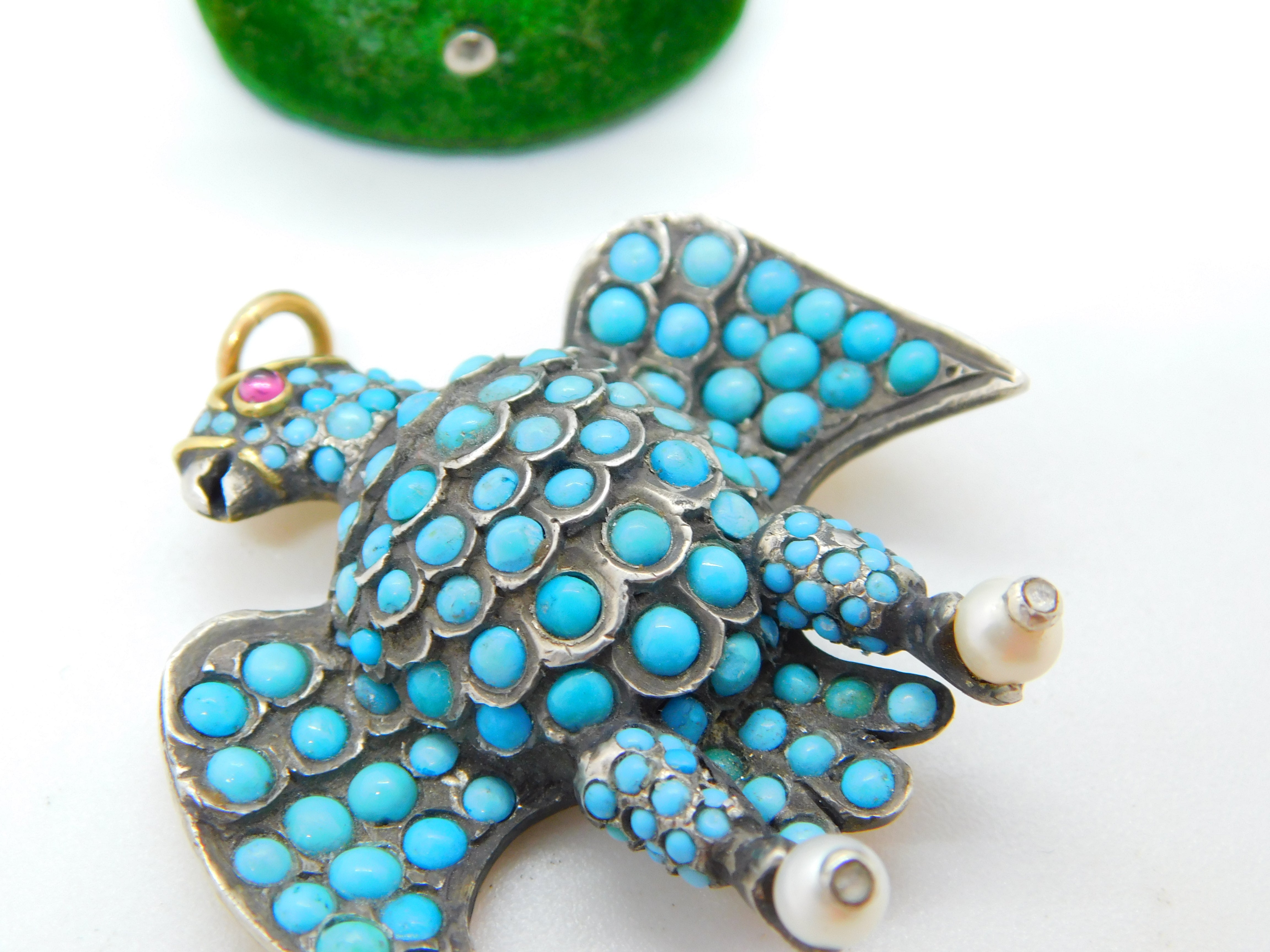 Details: A fantastic and wonderfully designed antique regency period large Georgian 18ct yellow gold eagle bird mourning pendant set adorned with turquoise stones pave set in sterling silver c1830. The eagle features a locket to the reverse and as such was almost certainly a mourning pendant. The eyes of the eagle are set with a natural ruby and two old cut diamonds to the claws which also features pearls. The gold has been XRF tested as it is unmarked. A stunning eagle of mourning jewellery almost certainly austro-hungarian. This is a wonderful item that would make a perfect gift or addition to any collection. The BOX pictured is for PRESENTATION ONLY and is NOT included in the listings but used to frame the pictures unless specifically stated otherwise.