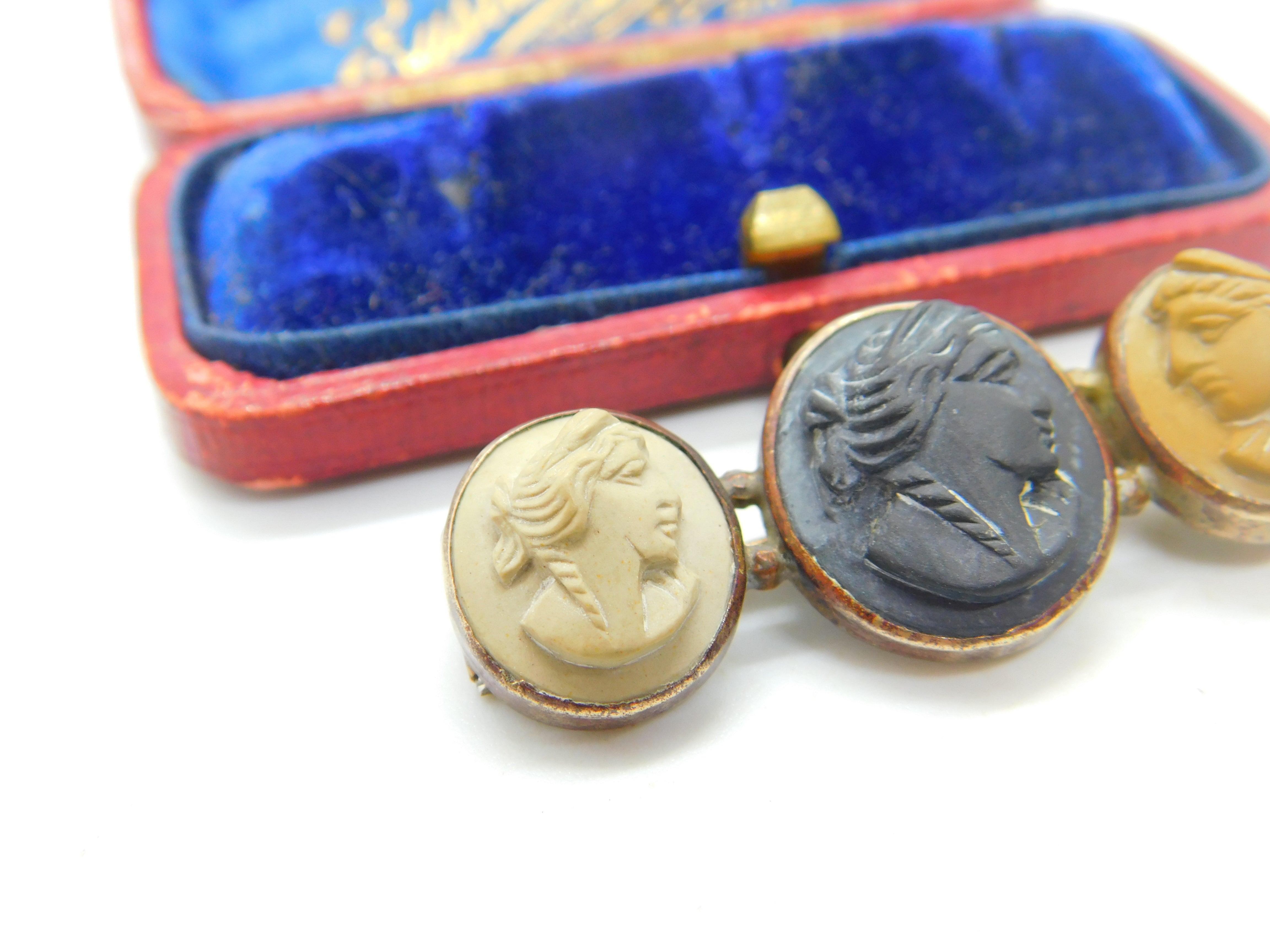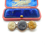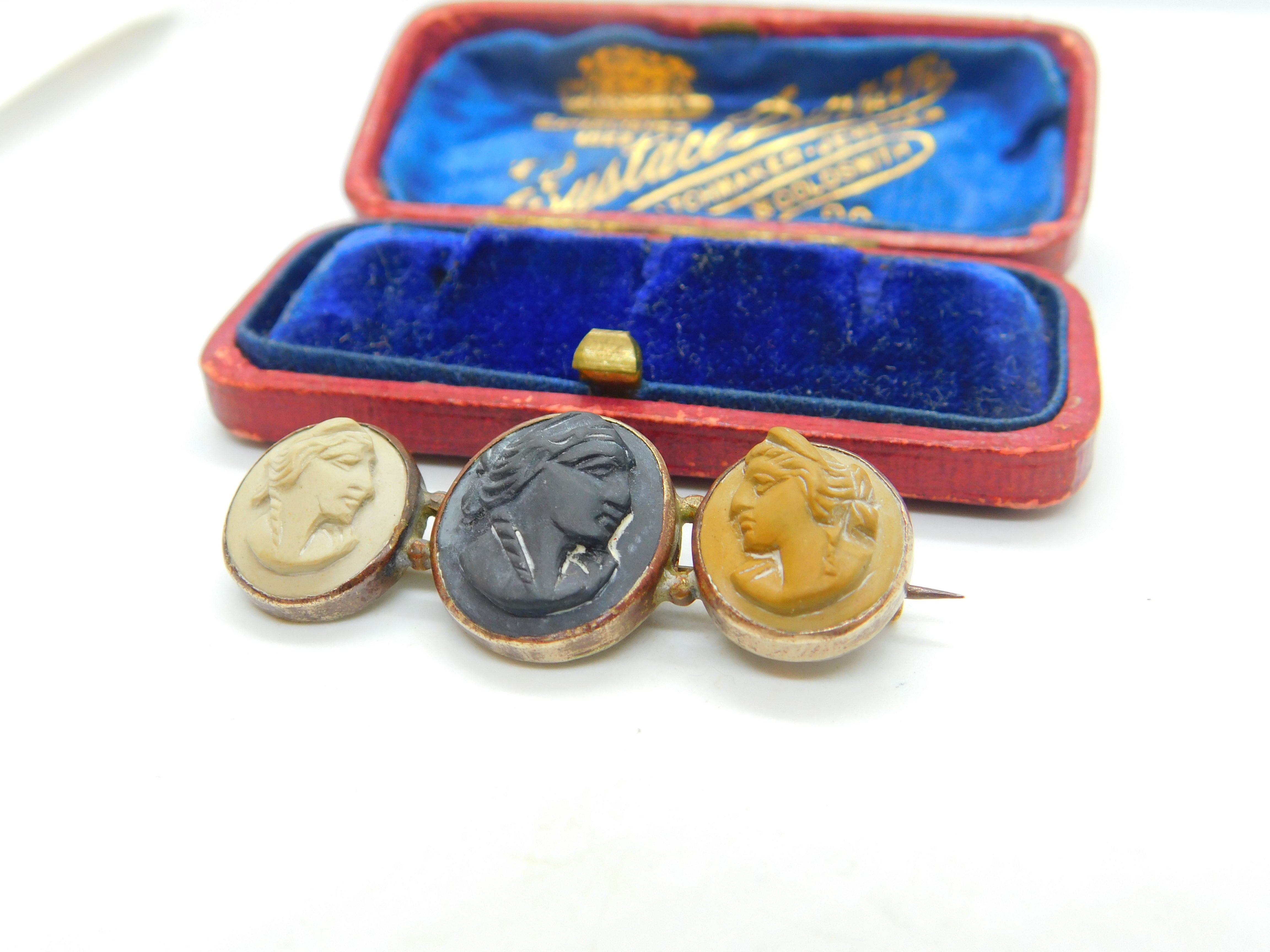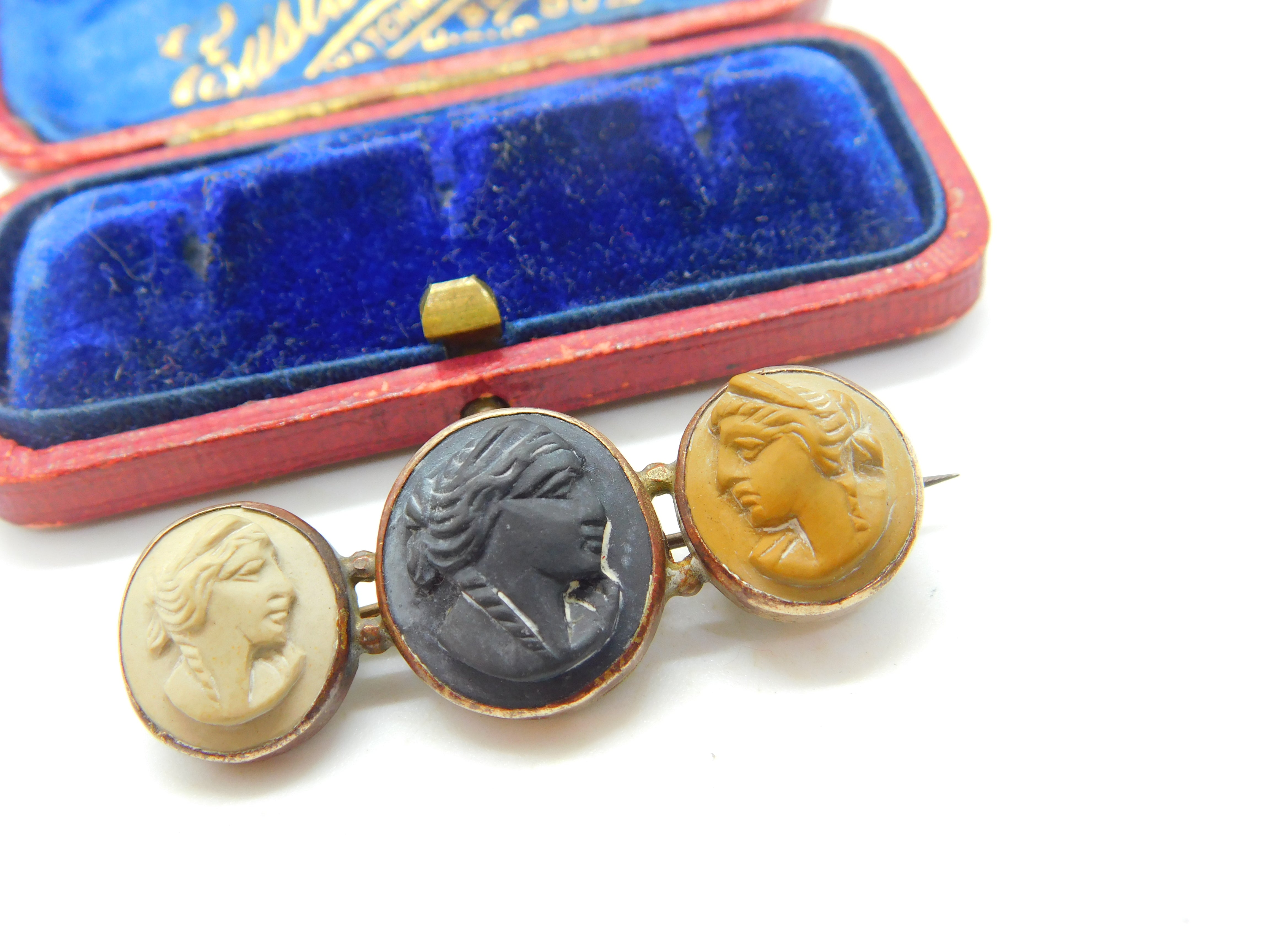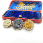 Details: A fantastic and wonderfully designed antique Georgian 9ct rose gold Grand Tour period brooch set with three high relief cameos carved from basalt and lava c1820. Would polish up nicely - the gold has been XRF tested. This is a wonderful item that would make a perfect gift or addition to any collection. The BOX pictured is for PRESENTATION ONLY and is NOT included in the listings but used to frame the pictures unless specifically stated otherwise.