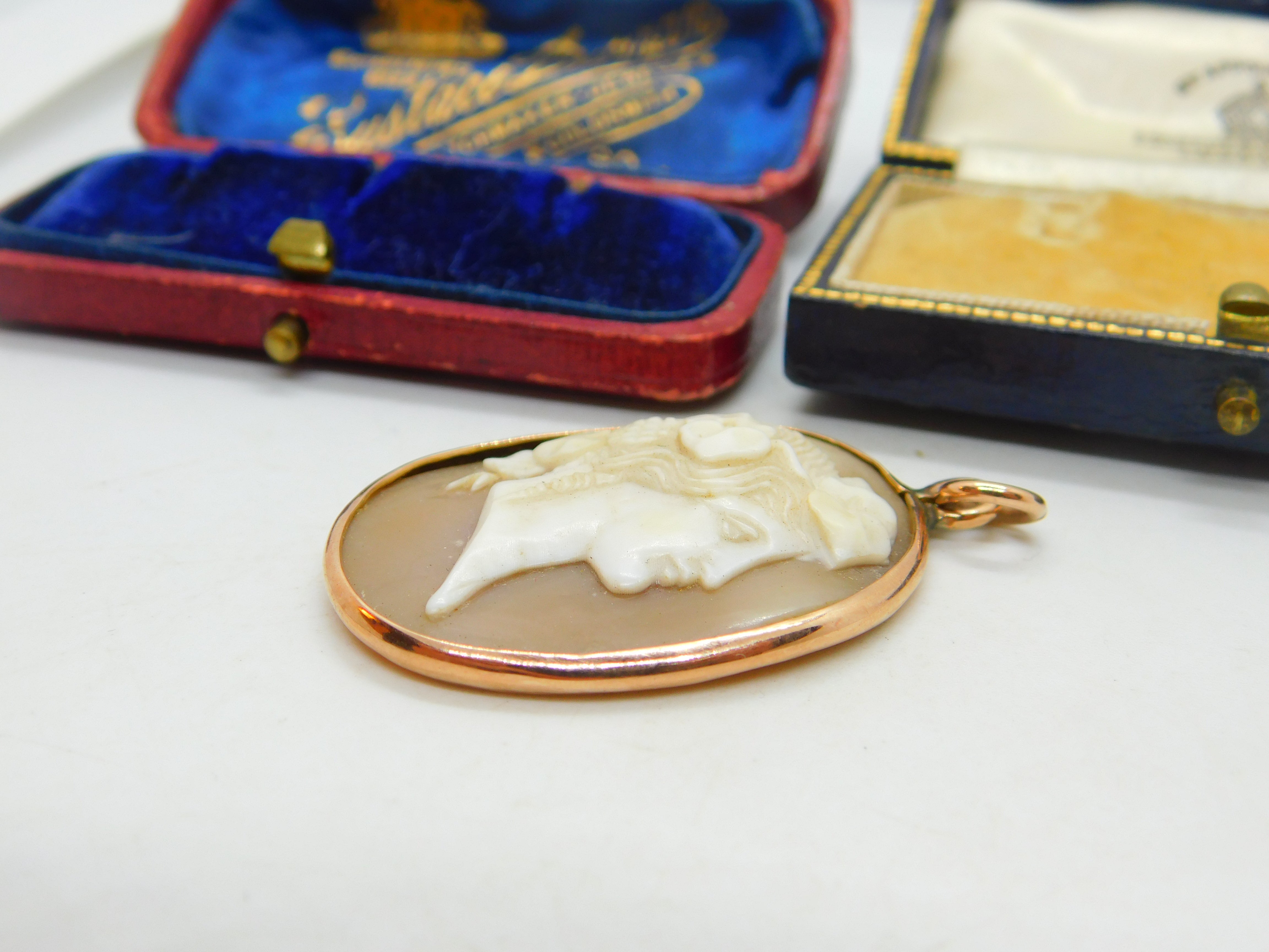 Details: A stunning and wonderfully detailed antique early Georgian 9ct rose gold set carved shell cameo pendant depicting a female Goddess like figure with excellent design c1800. The gold has been tested as it is not marked; a truly excellent example of antique jewellery. This is a wonderful item that would make a perfect gift or addition to any collection. The item is in good condition, all our items are quality conditioned prior to listings however some may have age related signs of wear commensurate with their antique status; please refer to the photos provided as they further inform condition. Please do not hesitate to enquire if you have any questions regarding the product. The box pictured is for presentation and is not included in the listings unless specifically stated otherwise.