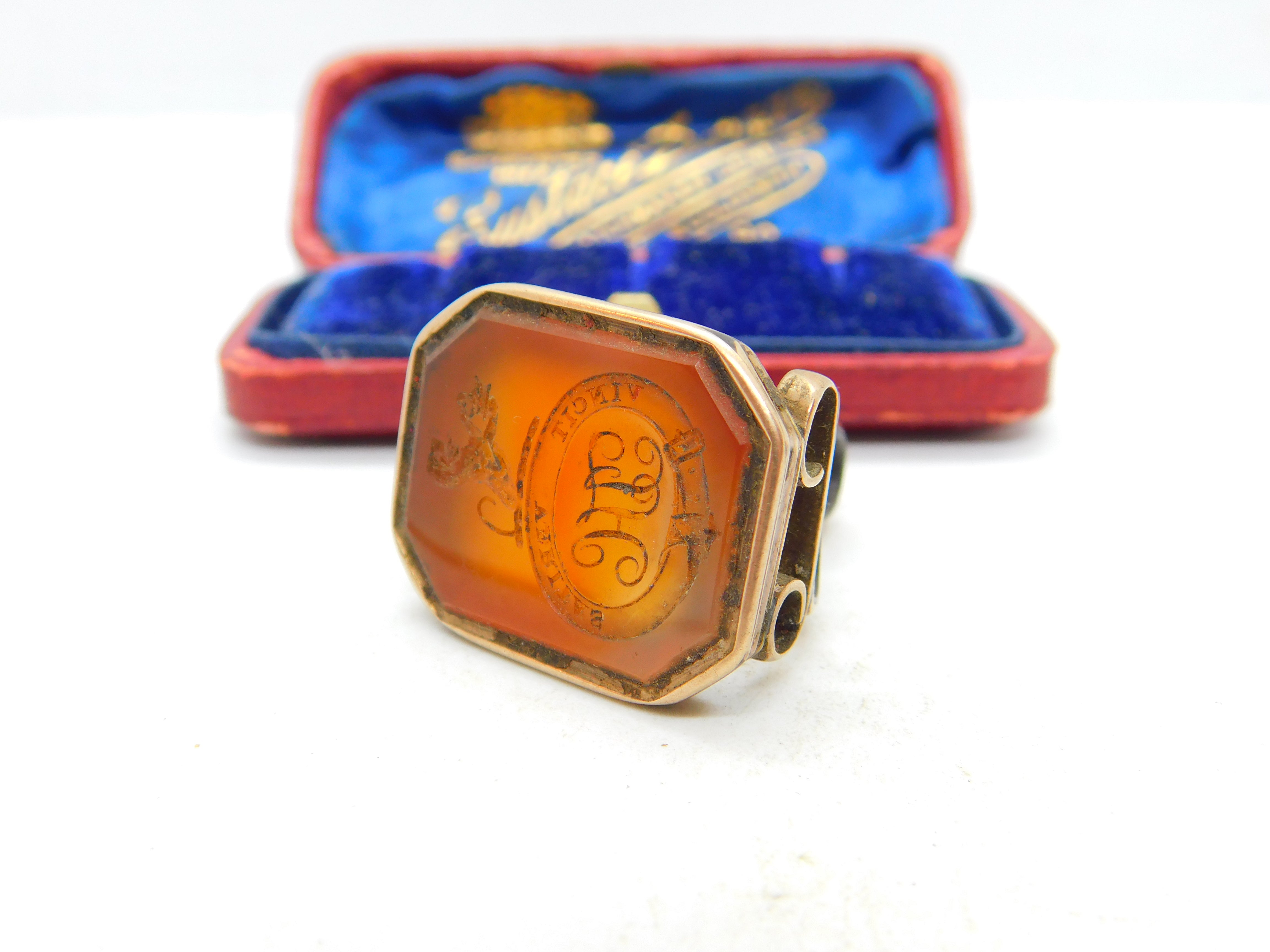 Details: A fantastic and wonderfully designed antique Georgian pinchbeck gold large fob seal with lovely detailing throughout set to the base with a simply wonderful carved carnelian heraldic seal showing a lion and buckle with the words Vincit Veritas or Truth Prevails to the centre c1820. This is a wonderful item that would make a perfect gift or addition to any collection. The BOX pictured is for PRESENTATION ONLY and is NOT included in the listings but used to frame the pictures unless specifically stated otherwise.