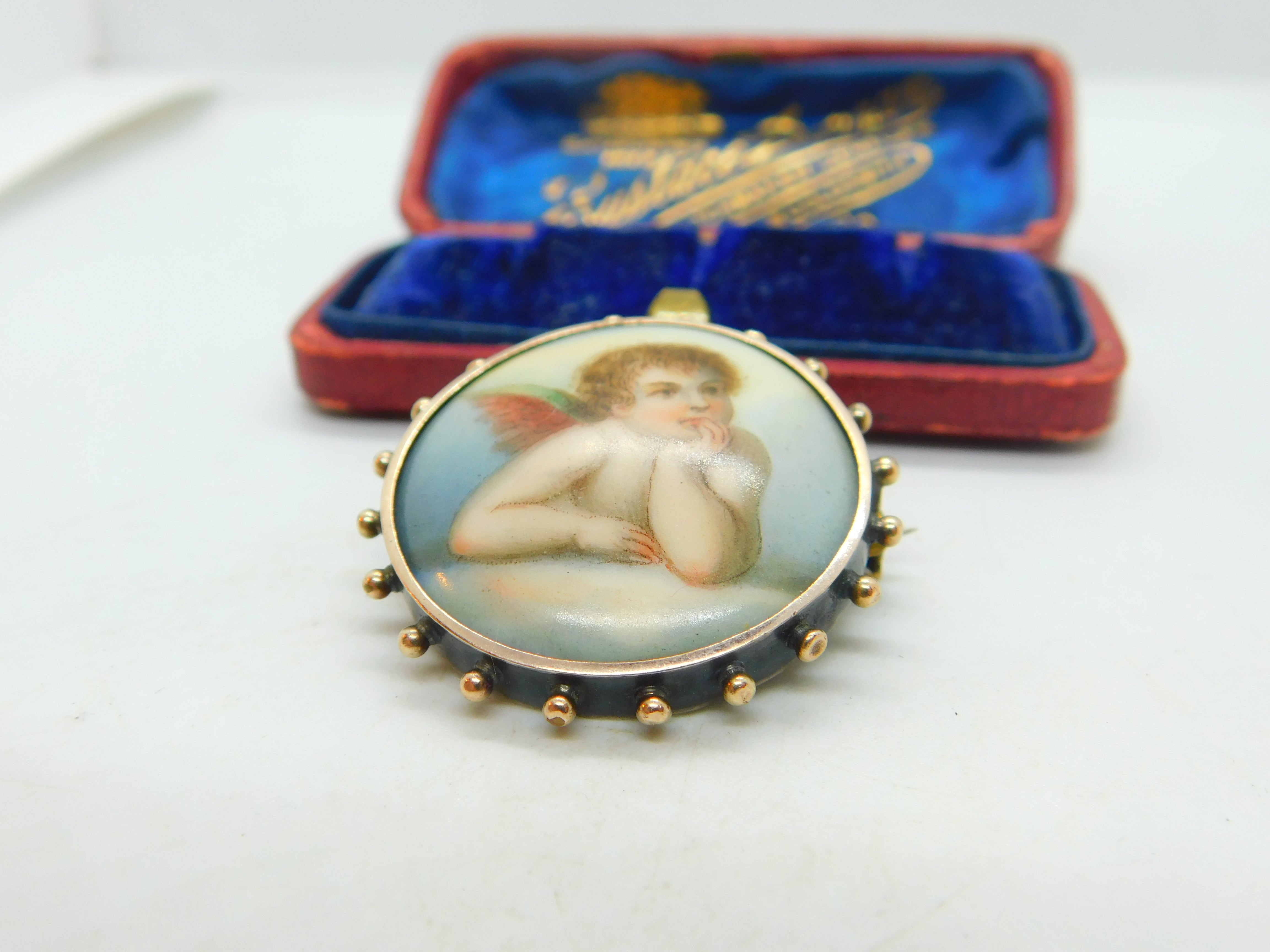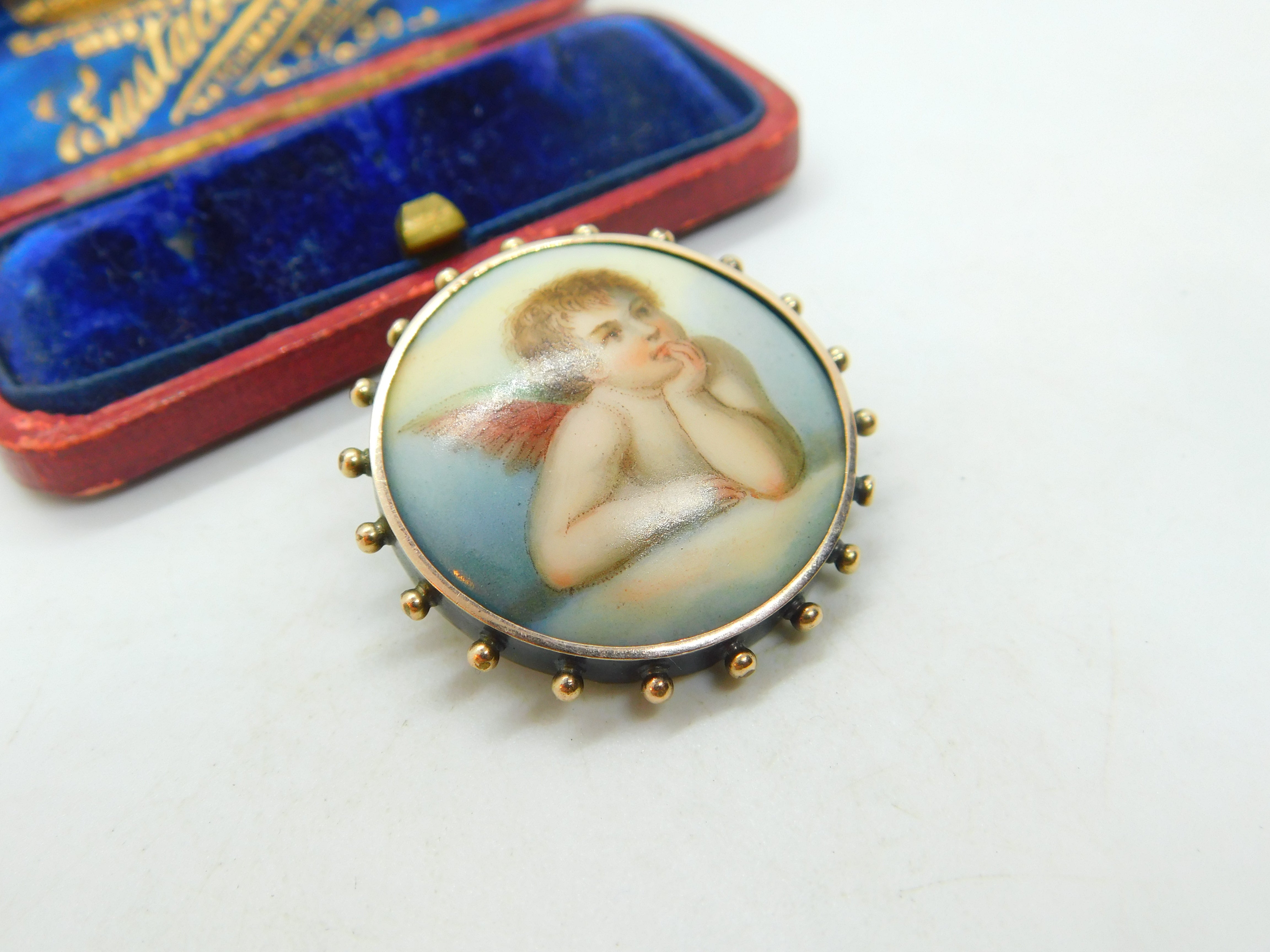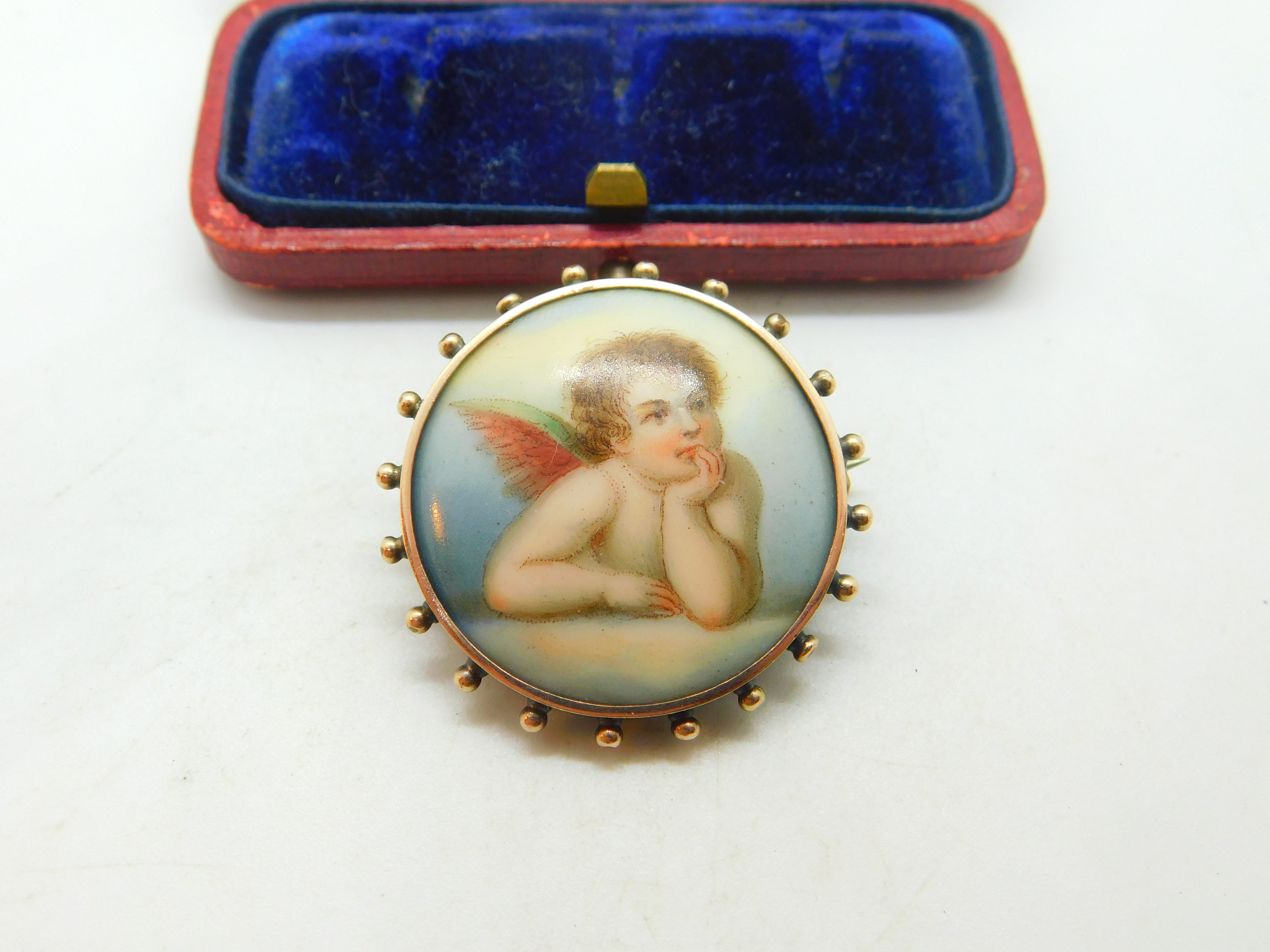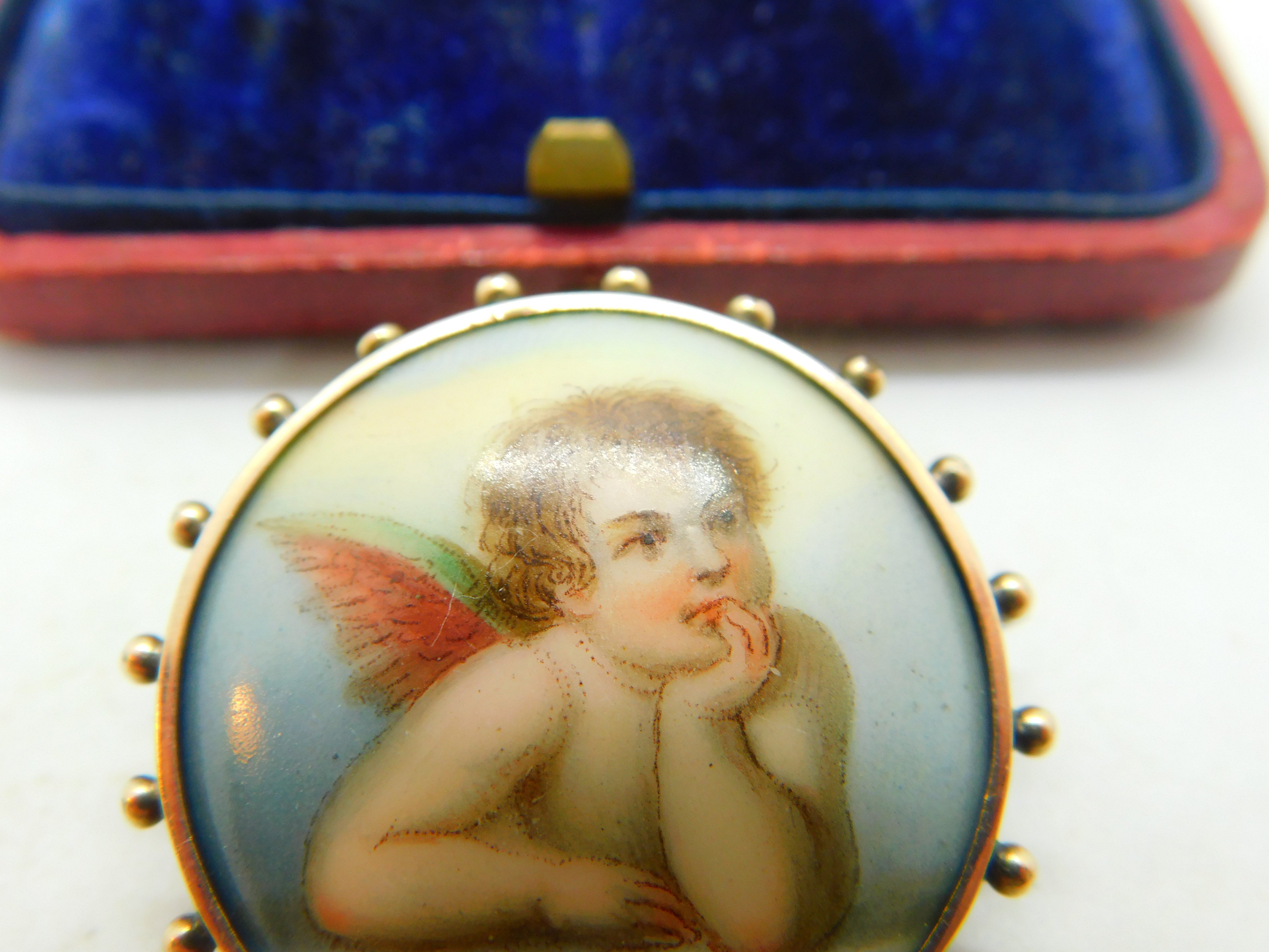 Details: A fantastic and wonderfully designed antique Georgian sterling set brooch set with a painted porcelain panel in the form of Raphael's cherub c1820. Superb detail. This is a wonderful item that would make a perfect gift or addition to any collection. The BOX pictured is for PRESENTATION ONLY and is NOT included in the listings but used to frame the pictures unless specifically stated otherwise.