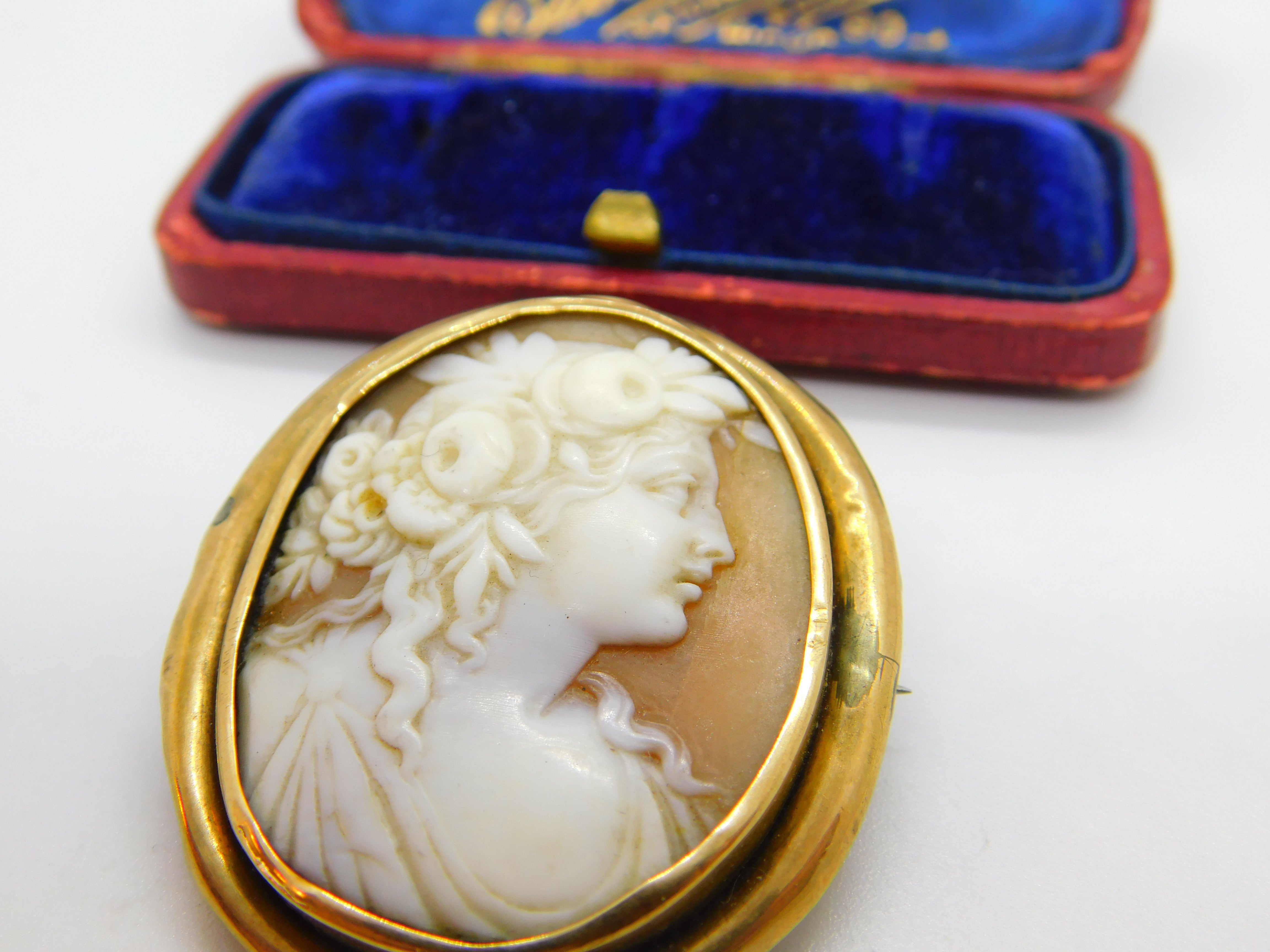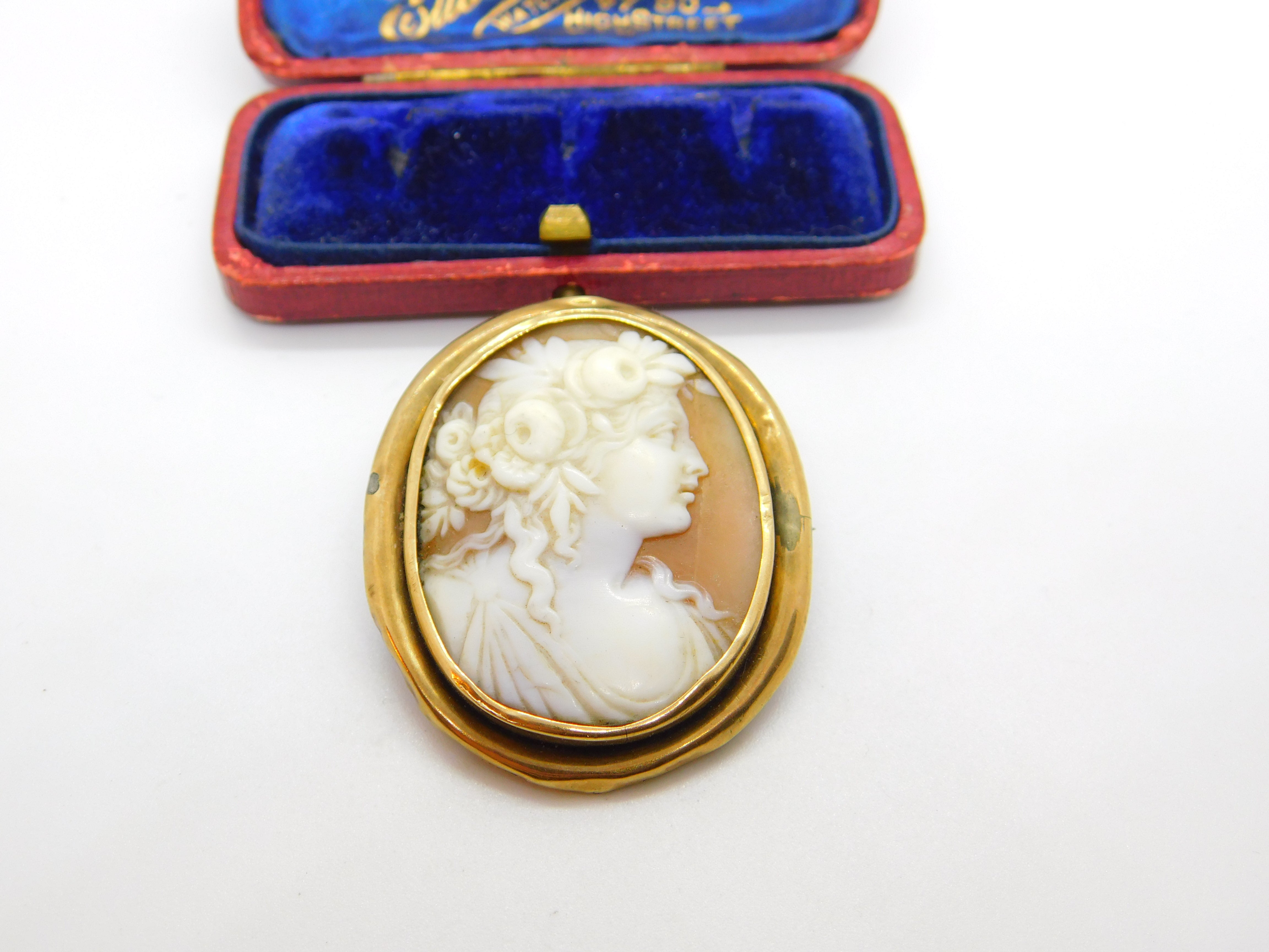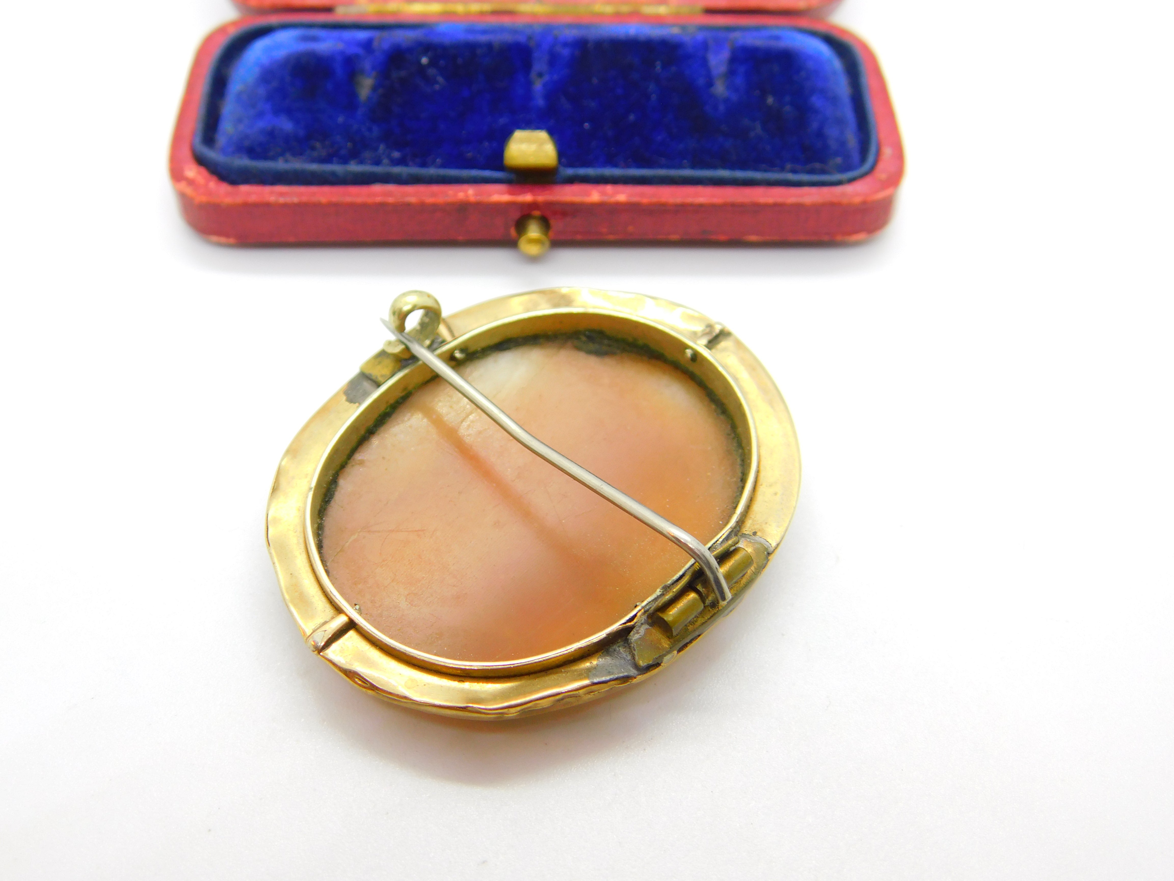 Details: A fantastic and wonderfully designed antique Georgian yellow metal (tests as 9ct) brooch with lovely classical shell cameo of a lady figure with beautiful detail c1820 - the item is dented throughout the rim and has acid test marks please see pictures. This is a wonderful item that would make a perfect gift or addition to any collection. The BOX pictured is for PRESENTATION ONLY and is NOT included in the listings but used to frame the pictures unless specifically stated otherwise.