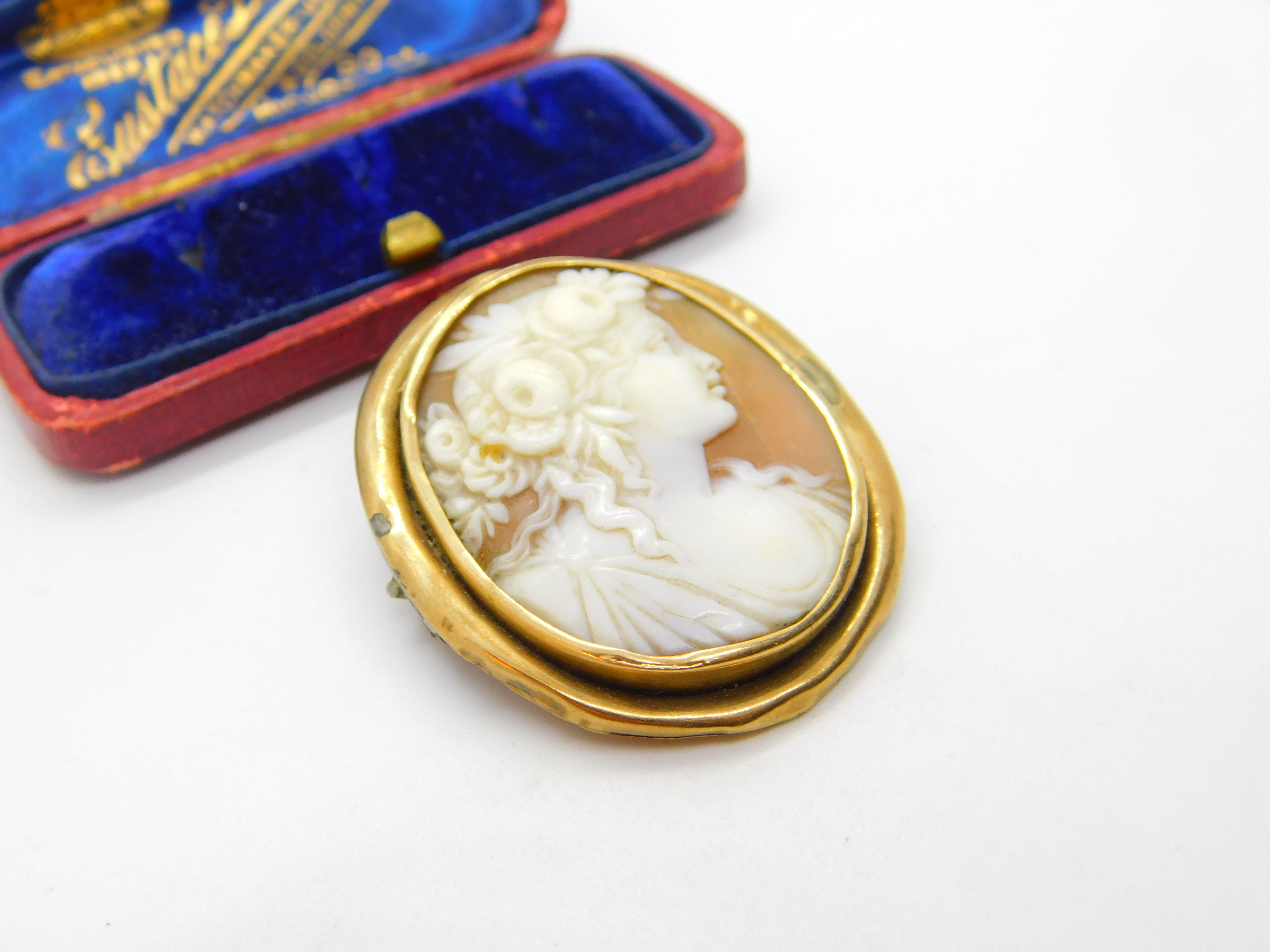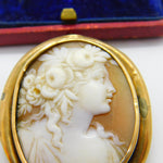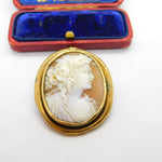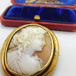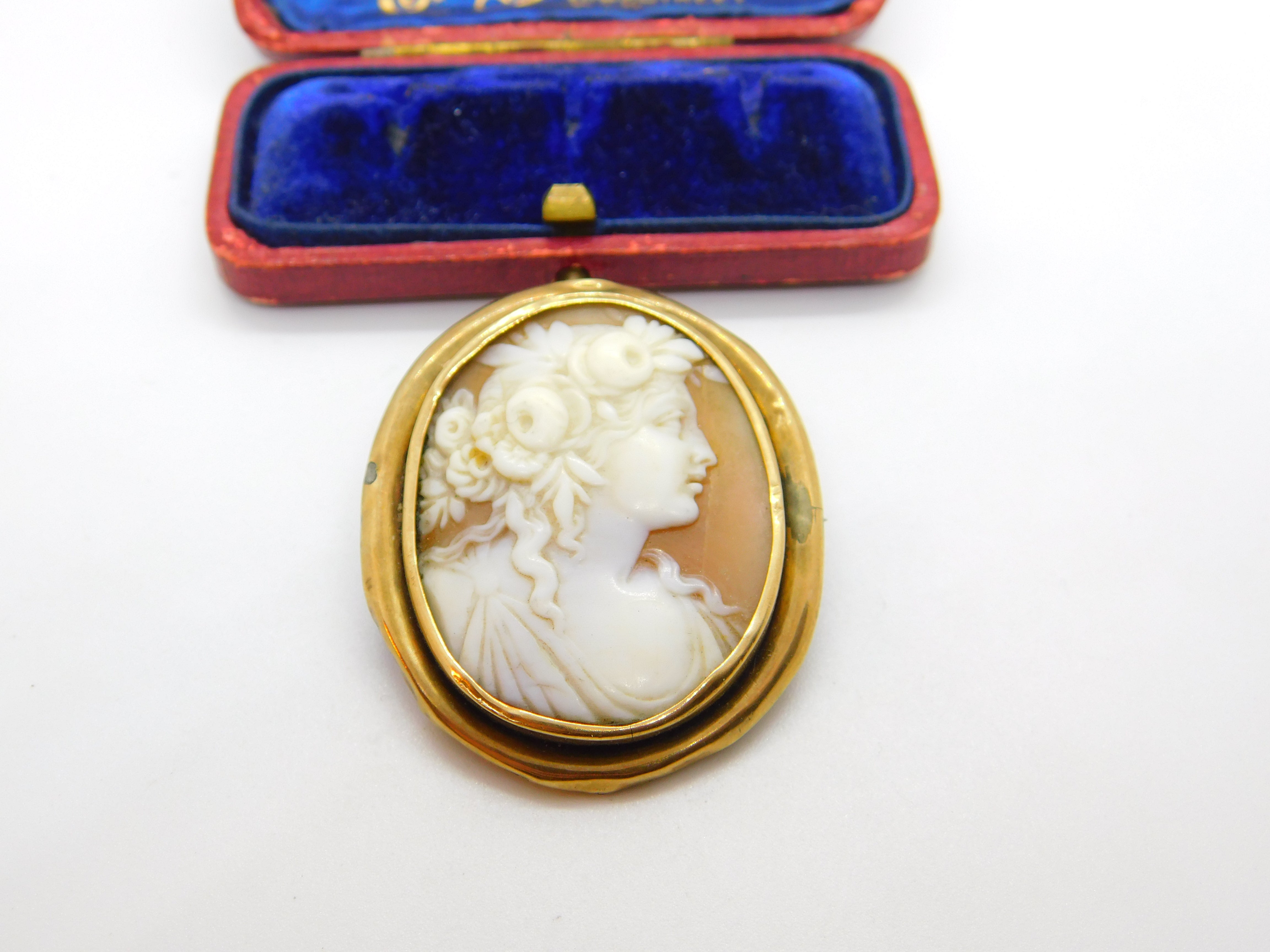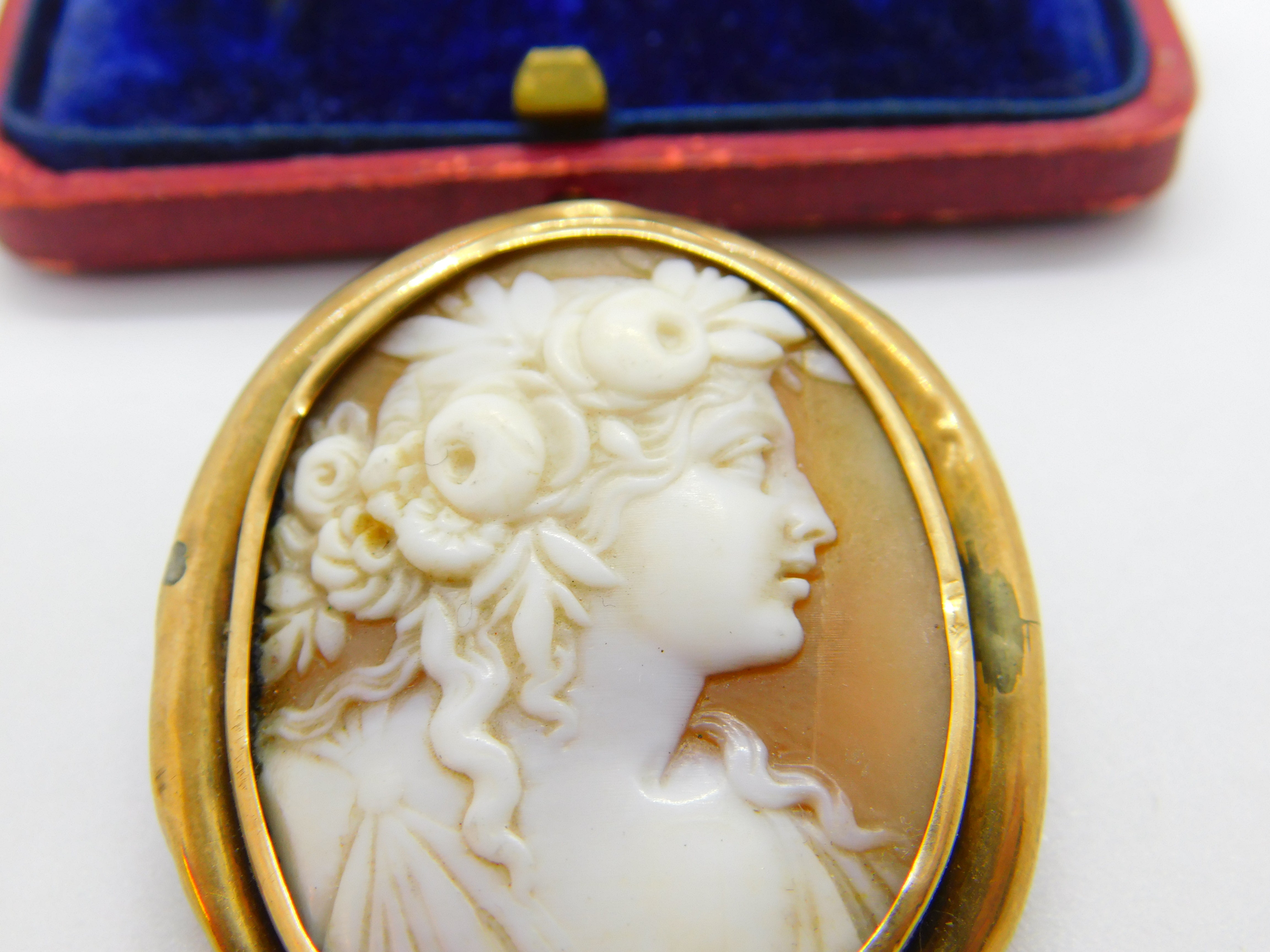 Details: A fantastic and wonderfully designed antique Georgian yellow metal (tests as 9ct) brooch with lovely classical shell cameo of a lady figure with beautiful detail c1820 - the item is dented throughout the rim and has acid test marks please see pictures. This is a wonderful item that would make a perfect gift or addition to any collection. The BOX pictured is for PRESENTATION ONLY and is NOT included in the listings but used to frame the pictures unless specifically stated otherwise.