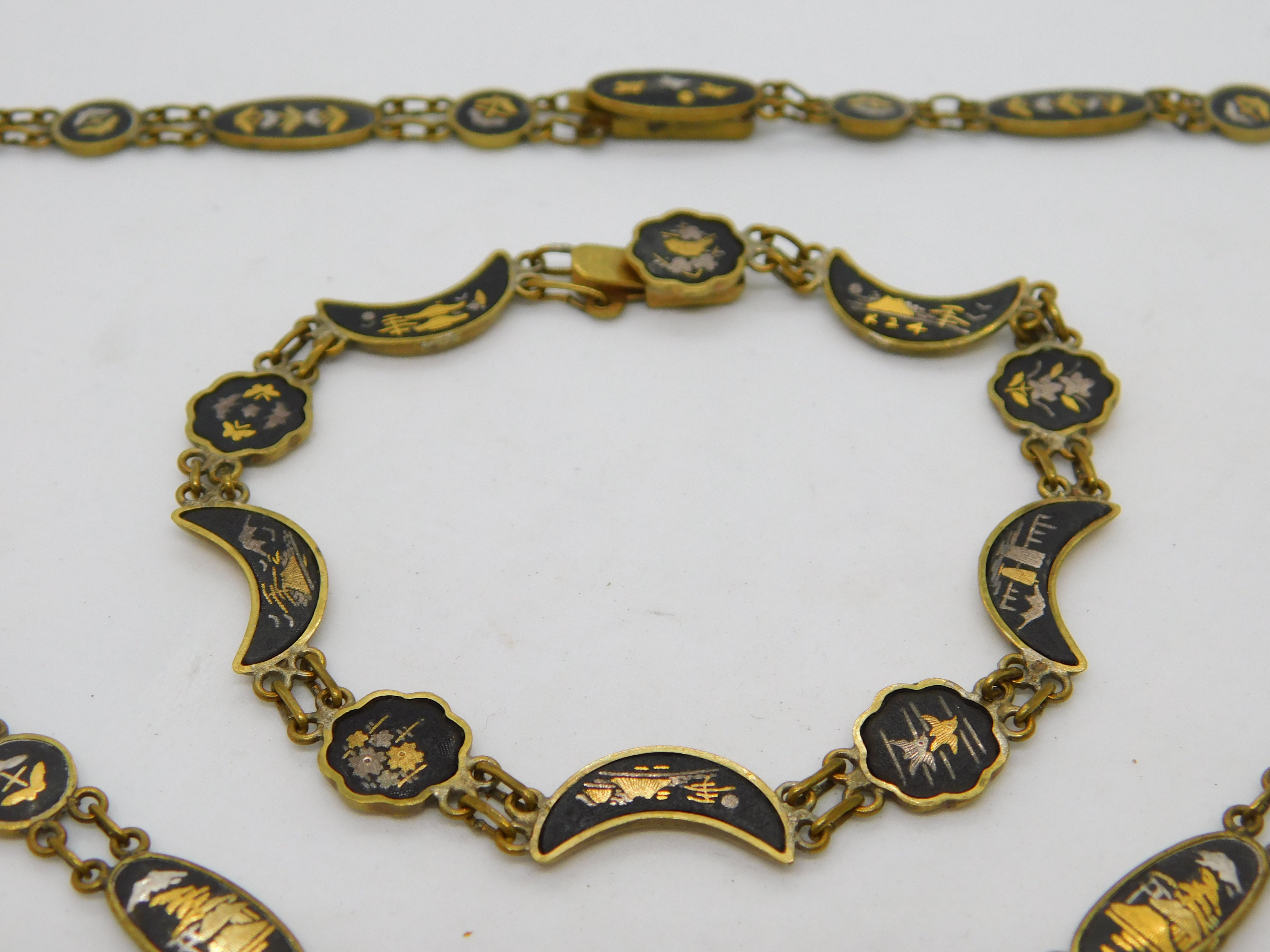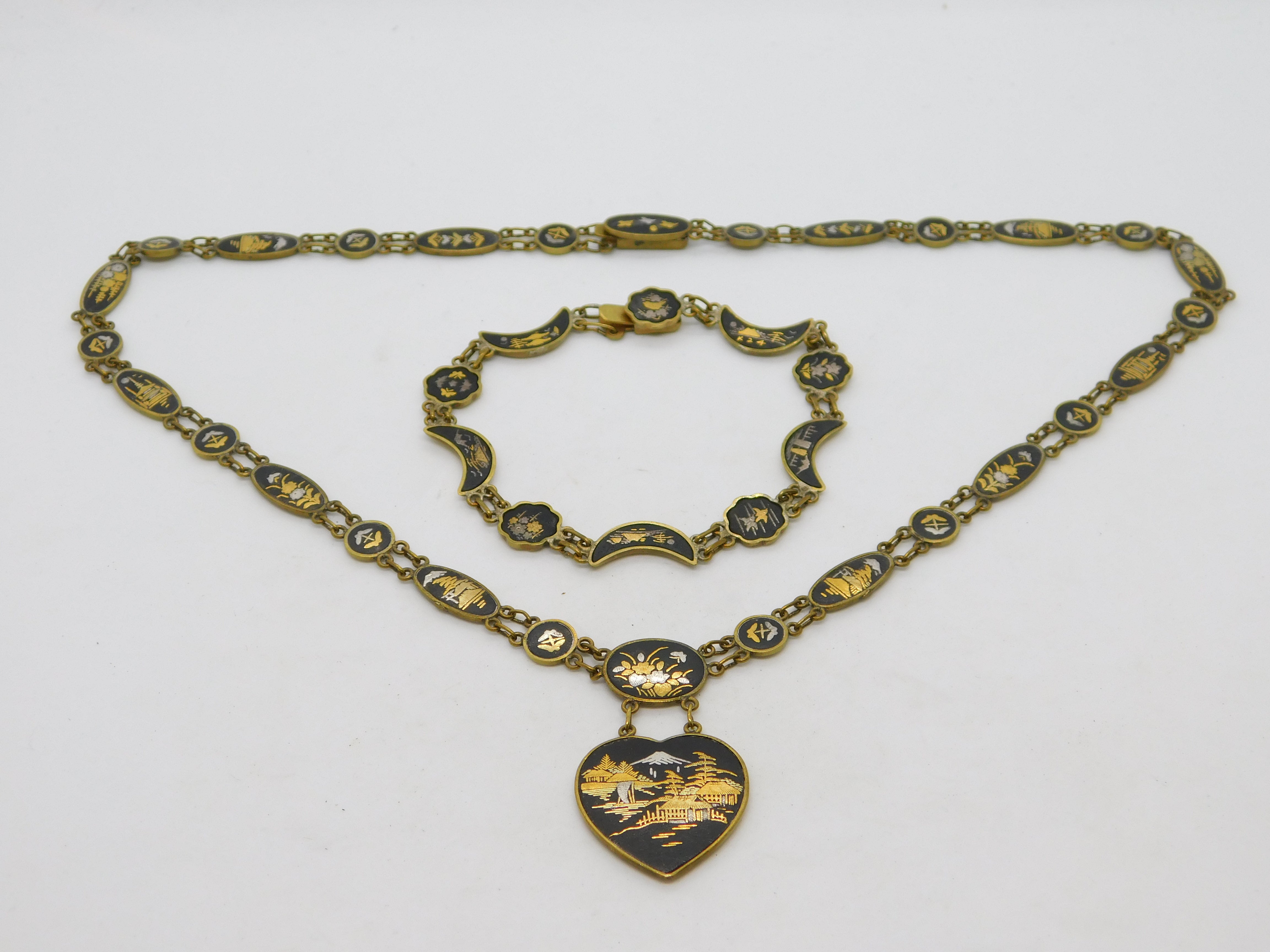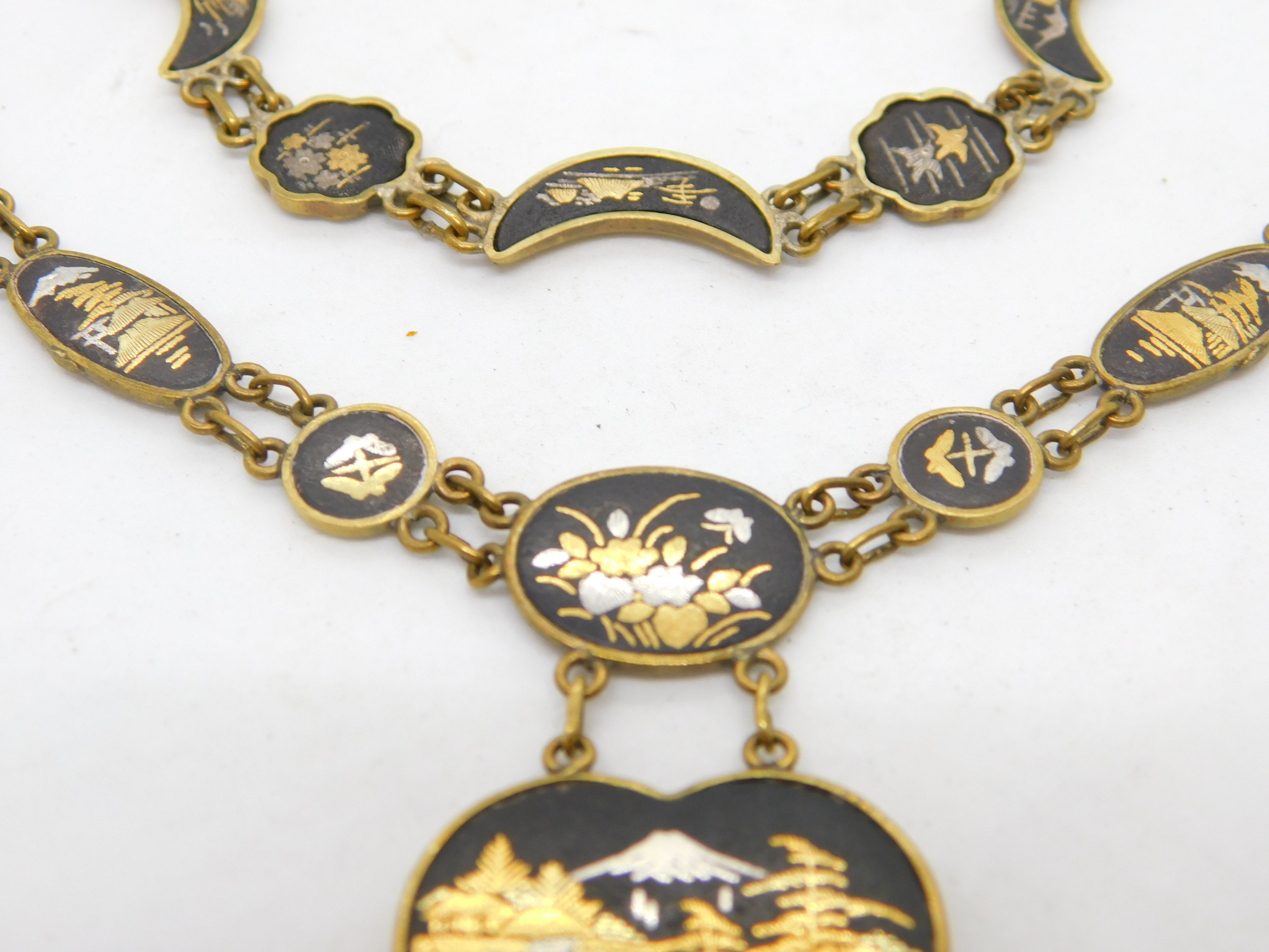 Details: A fantastic and wonderfully designed antique art deco Japanese gilt metal necklace and bracelet with 24k gold shakudo inlay depicting mountain and floral scenes c1930. This is a wonderful item that would make a perfect gift or addition to any collection. The BOX pictured is for PRESENTATION ONLY and is NOT included in the listings but used to frame the pictures unless specifically stated otherwise.