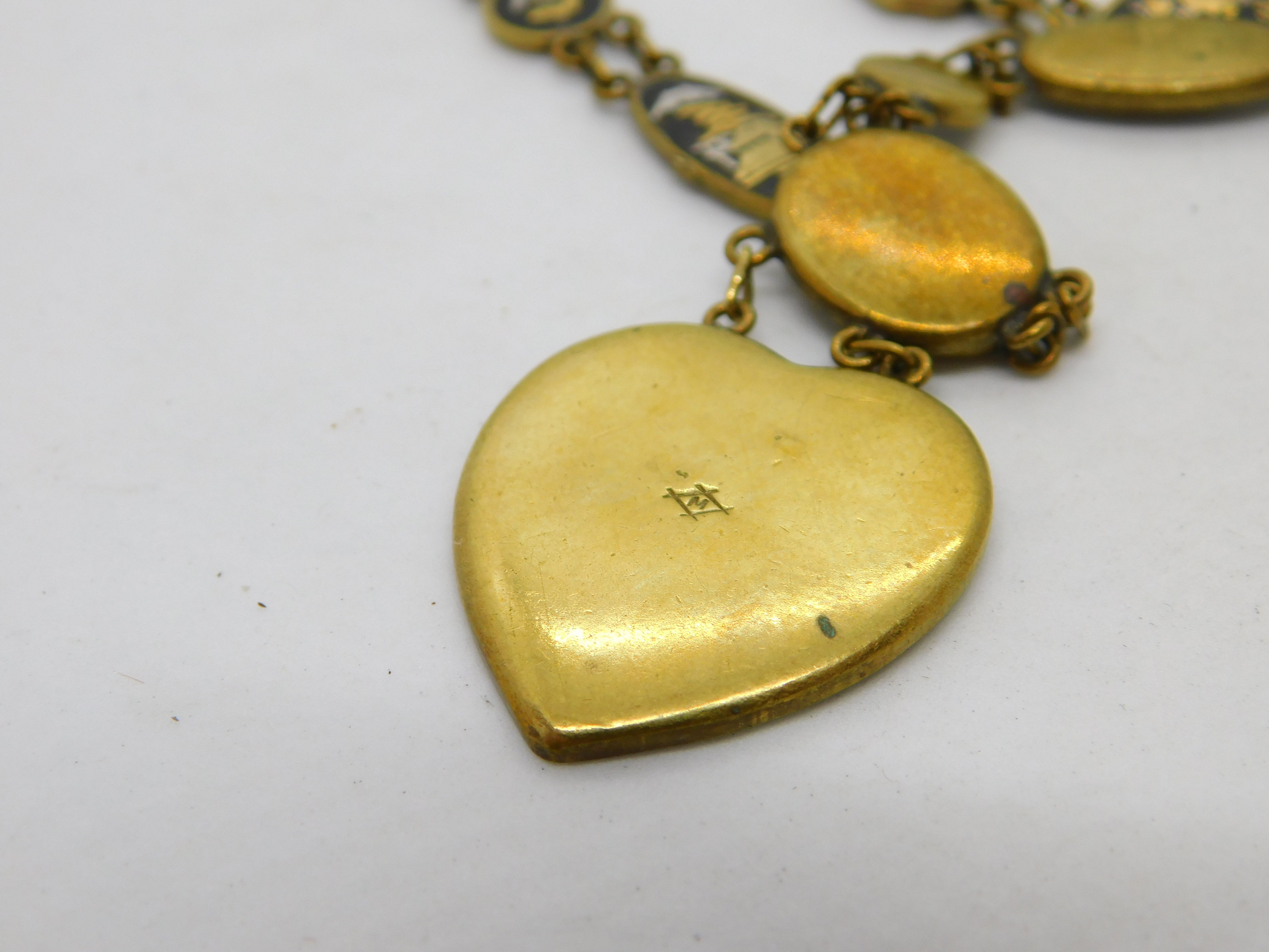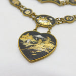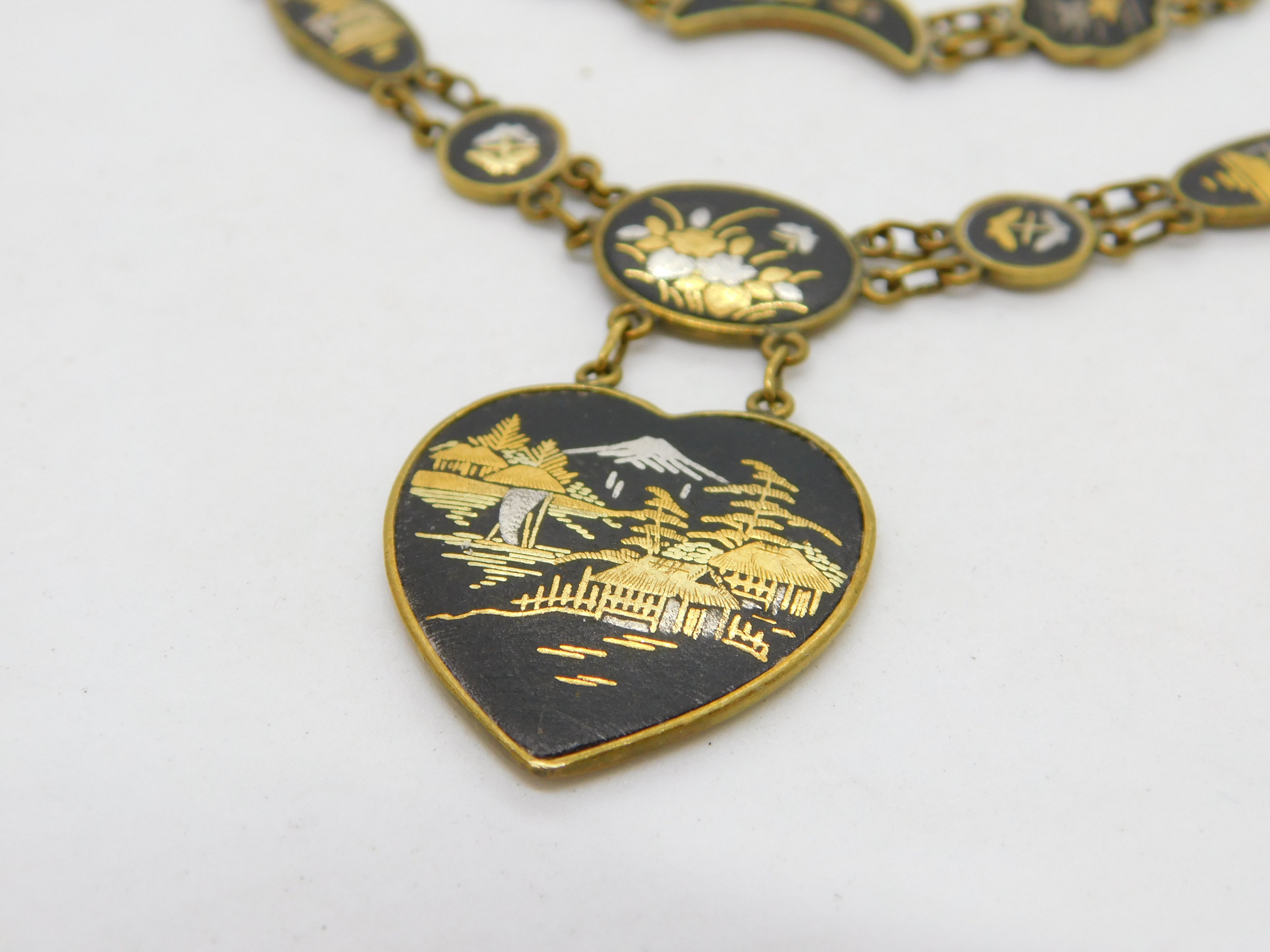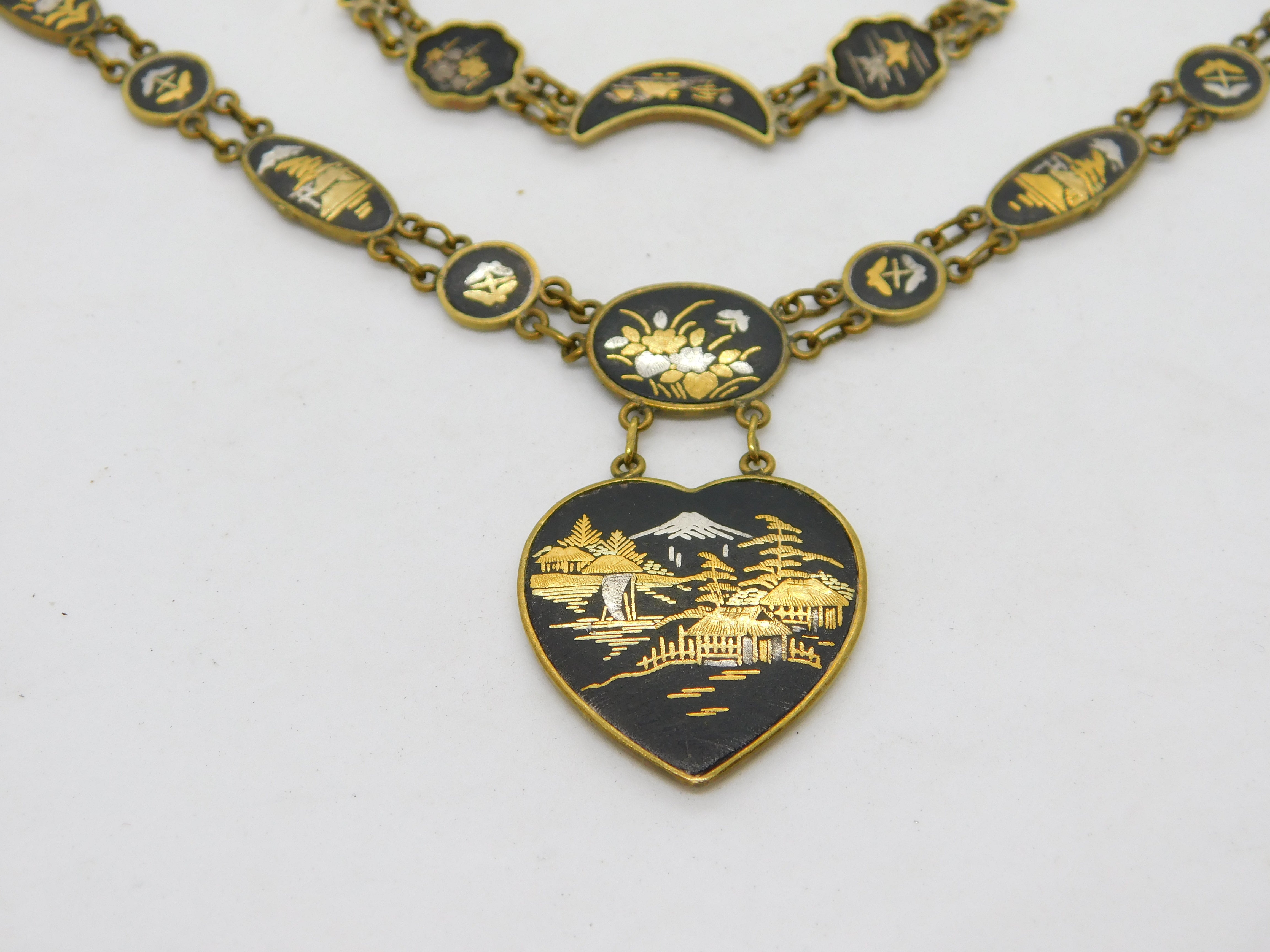 Details: A fantastic and wonderfully designed antique art deco Japanese gilt metal necklace and bracelet with 24k gold shakudo inlay depicting mountain and floral scenes c1930. This is a wonderful item that would make a perfect gift or addition to any collection. The BOX pictured is for PRESENTATION ONLY and is NOT included in the listings but used to frame the pictures unless specifically stated otherwise.