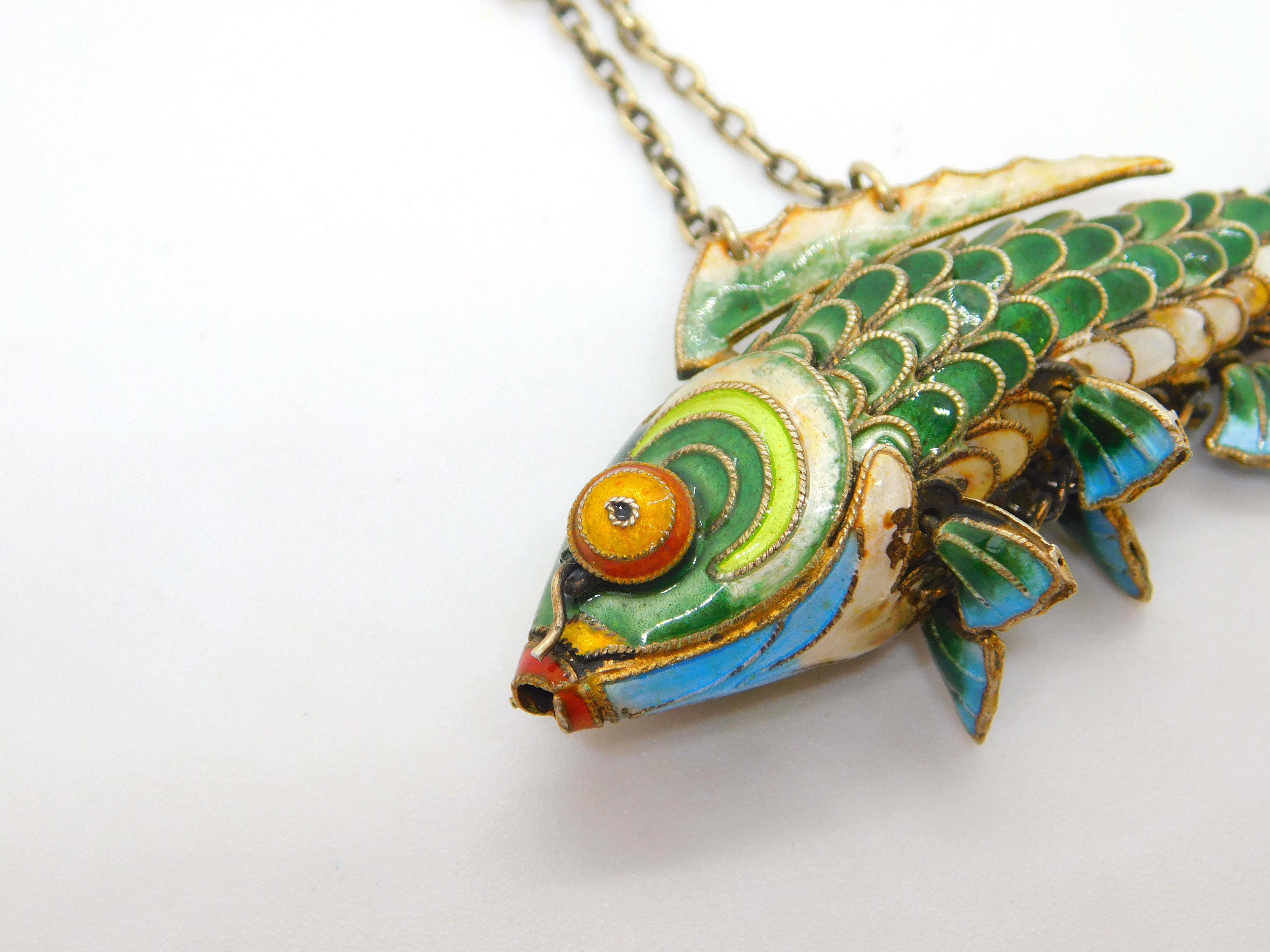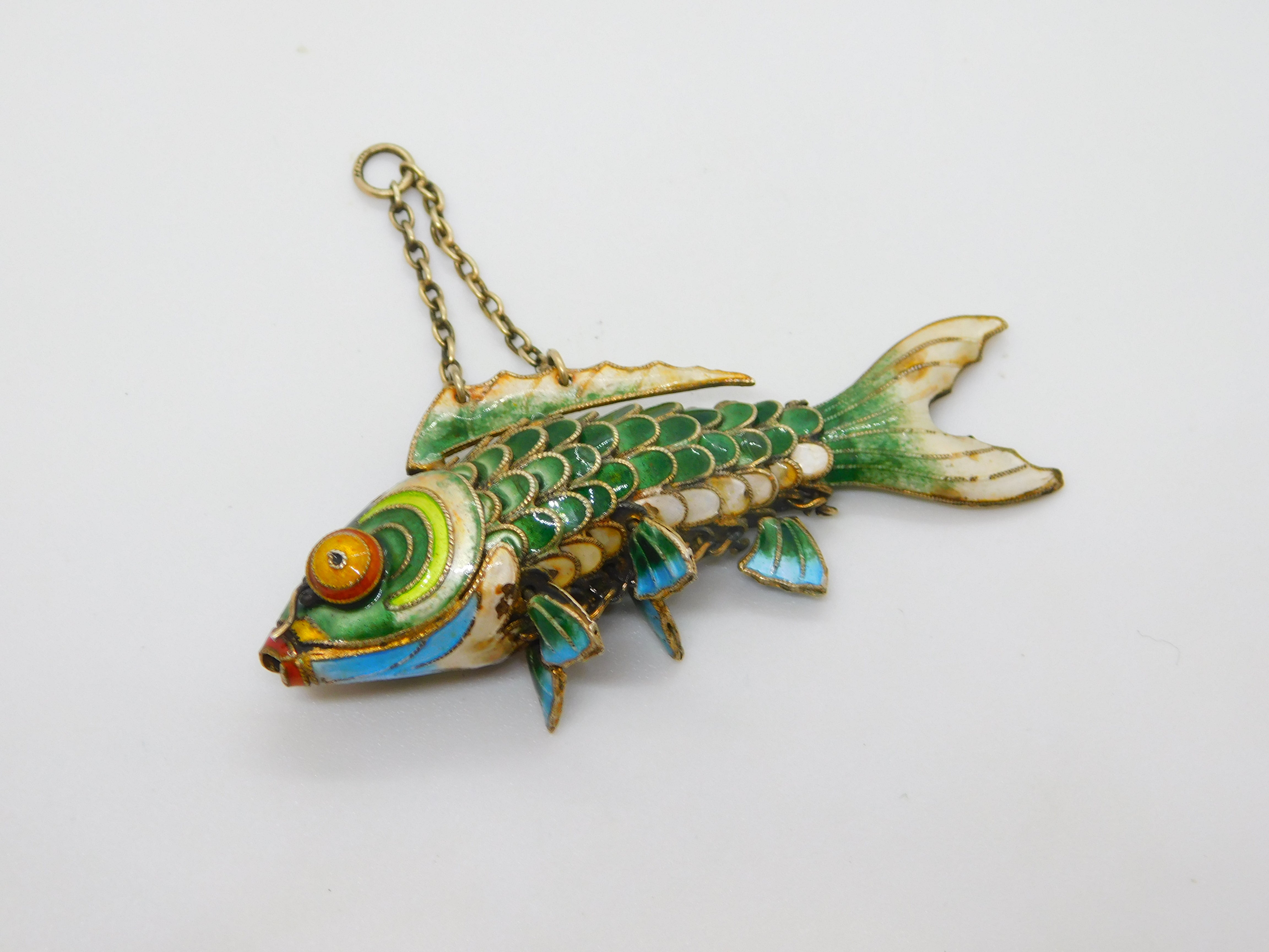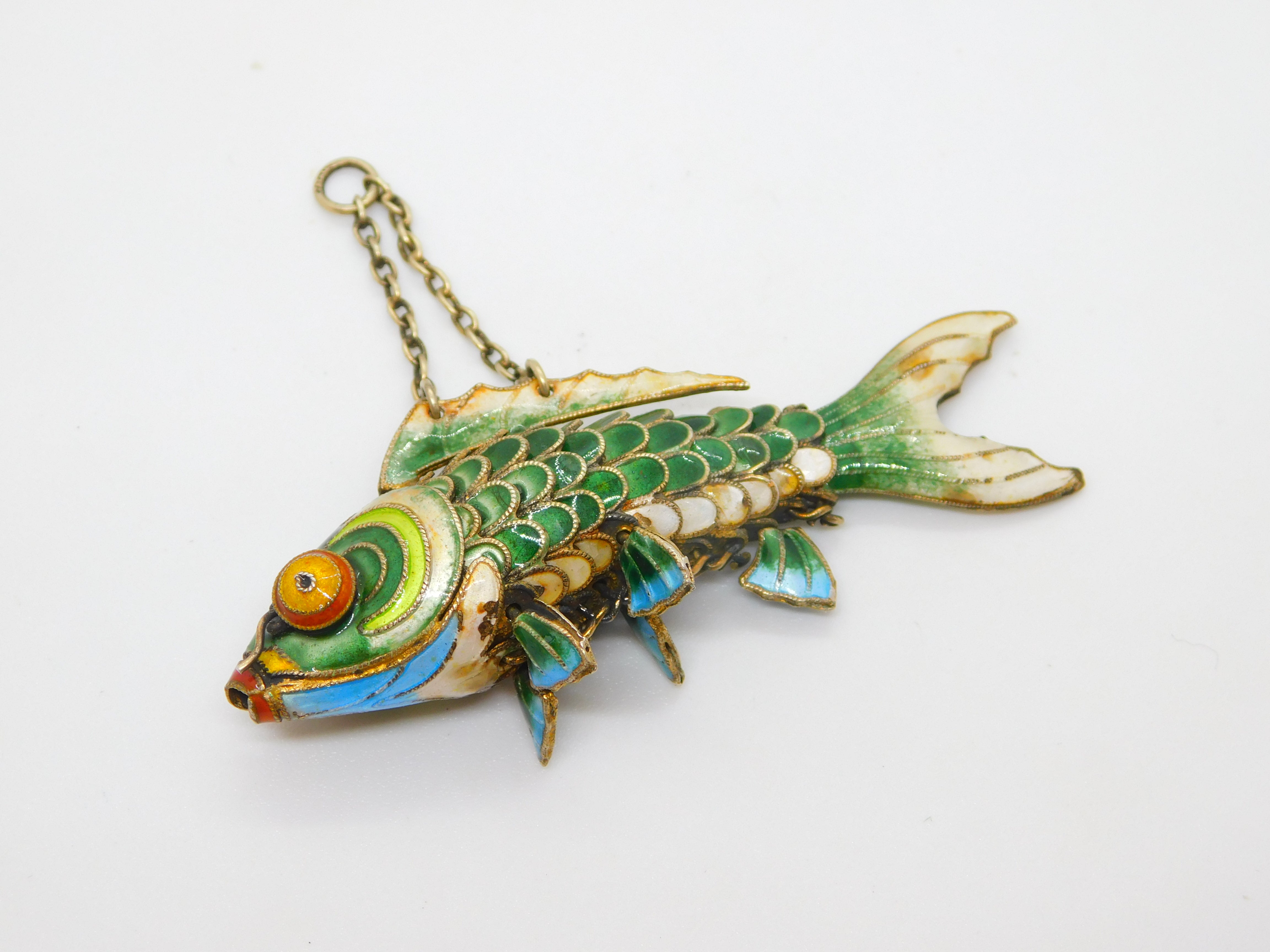 Details: A fantastic and wonderfully designed antique art deco Chinese export sterling silver gilt and enamel articulated koi fish pendant with superb detailing c1940. Minor enamel chips but generally good. This is a wonderful item that would make a perfect gift or addition to any collection. The BOX pictured is for PRESENTATION ONLY and is NOT included in the listings but used to frame the pictures unless specifically stated otherwise.