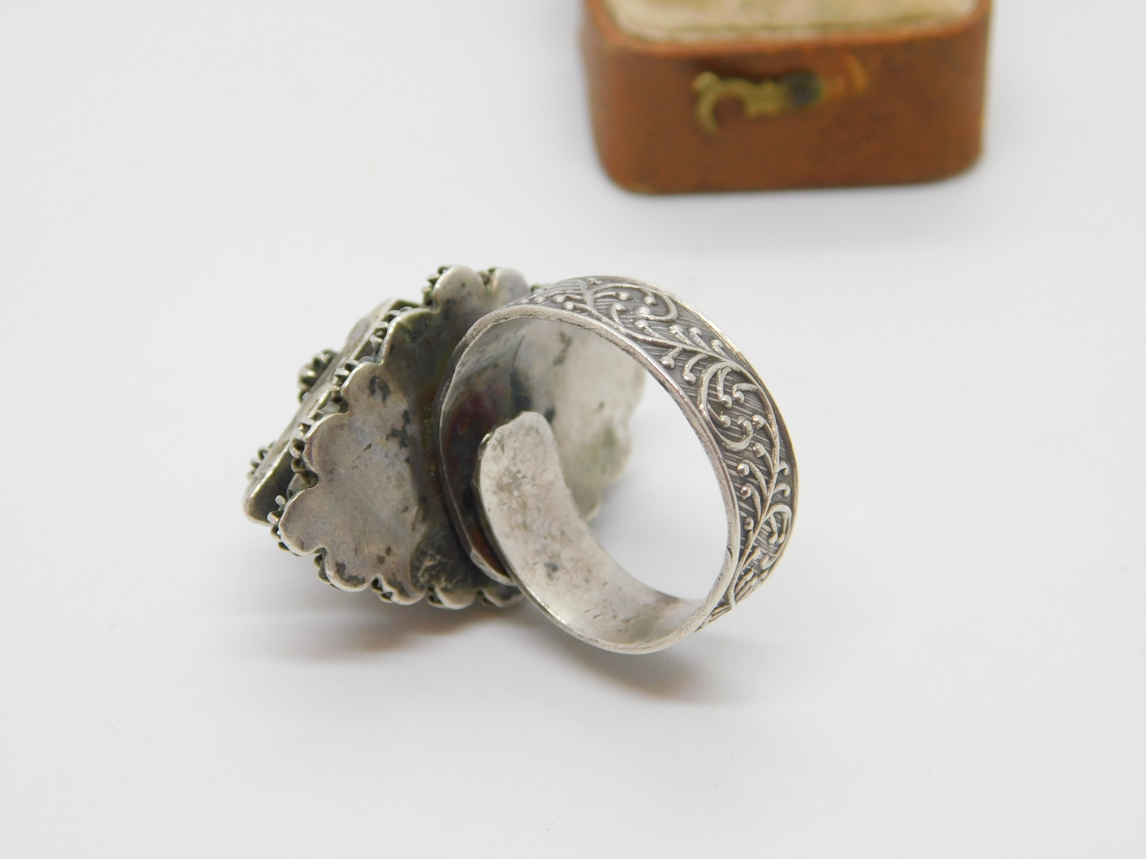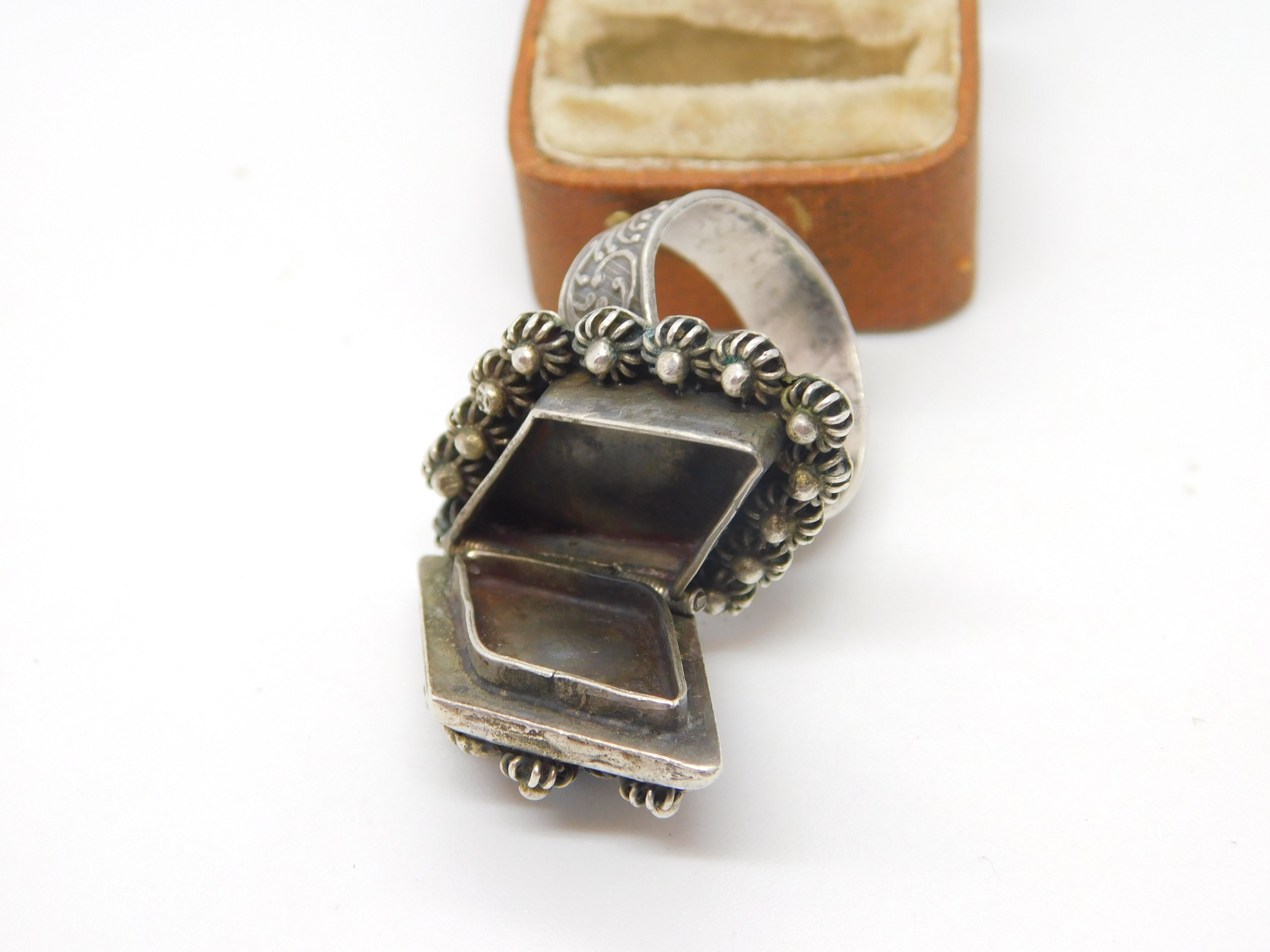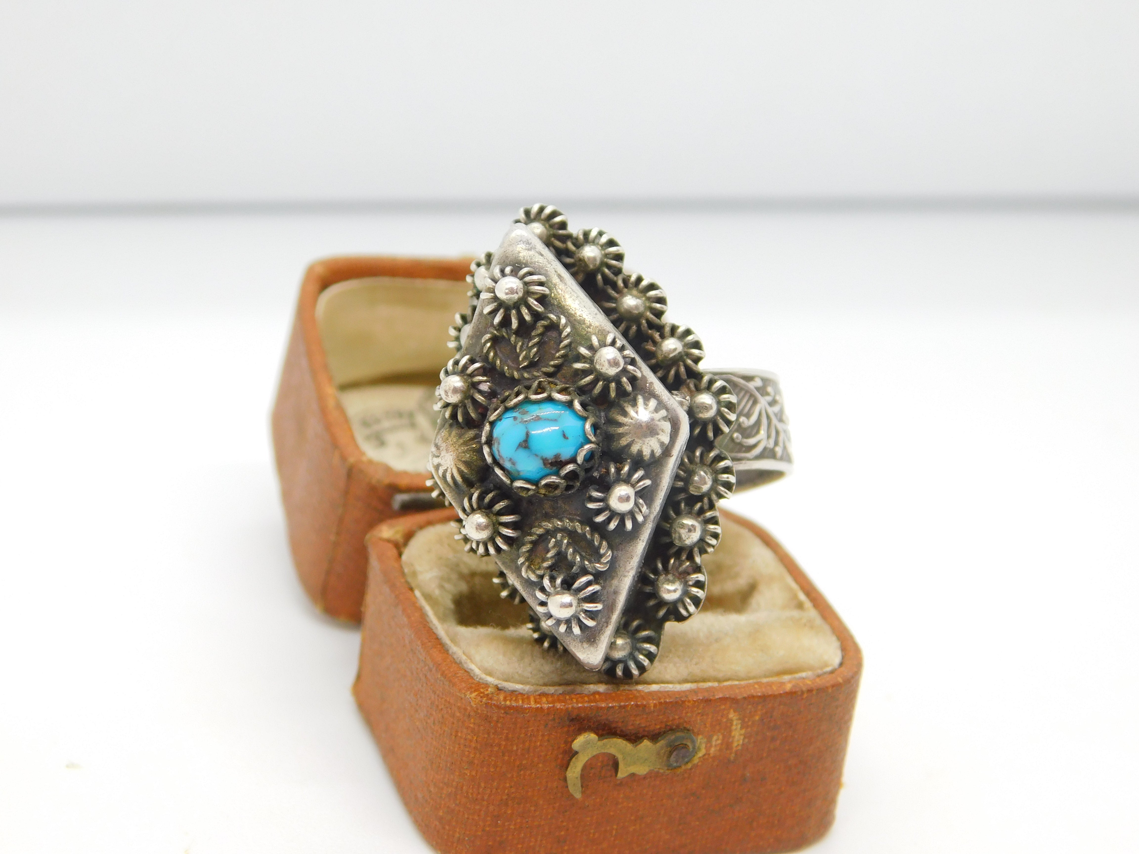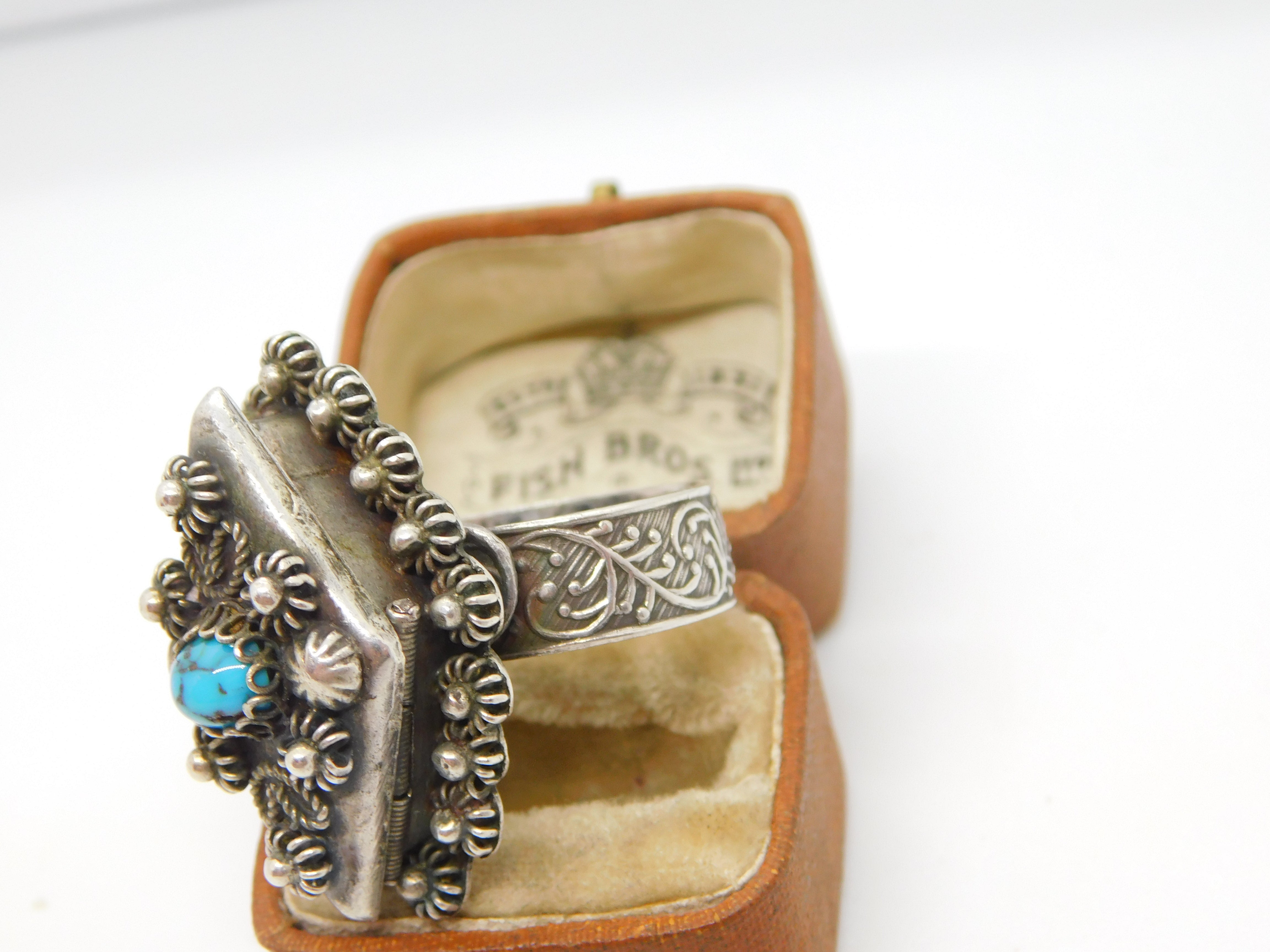 Details: A fantastic and wonderfully designed antique art deco Egyptian .900 grade silver large poison or locket ring set with central turquoise stone hallmarked to the interior band c1930. This is a wonderful item that would make a perfect gift or addition to any collection. The BOX pictured is for PRESENTATION ONLY and is NOT included in the listings but used to frame the pictures unless specifically stated otherwise.