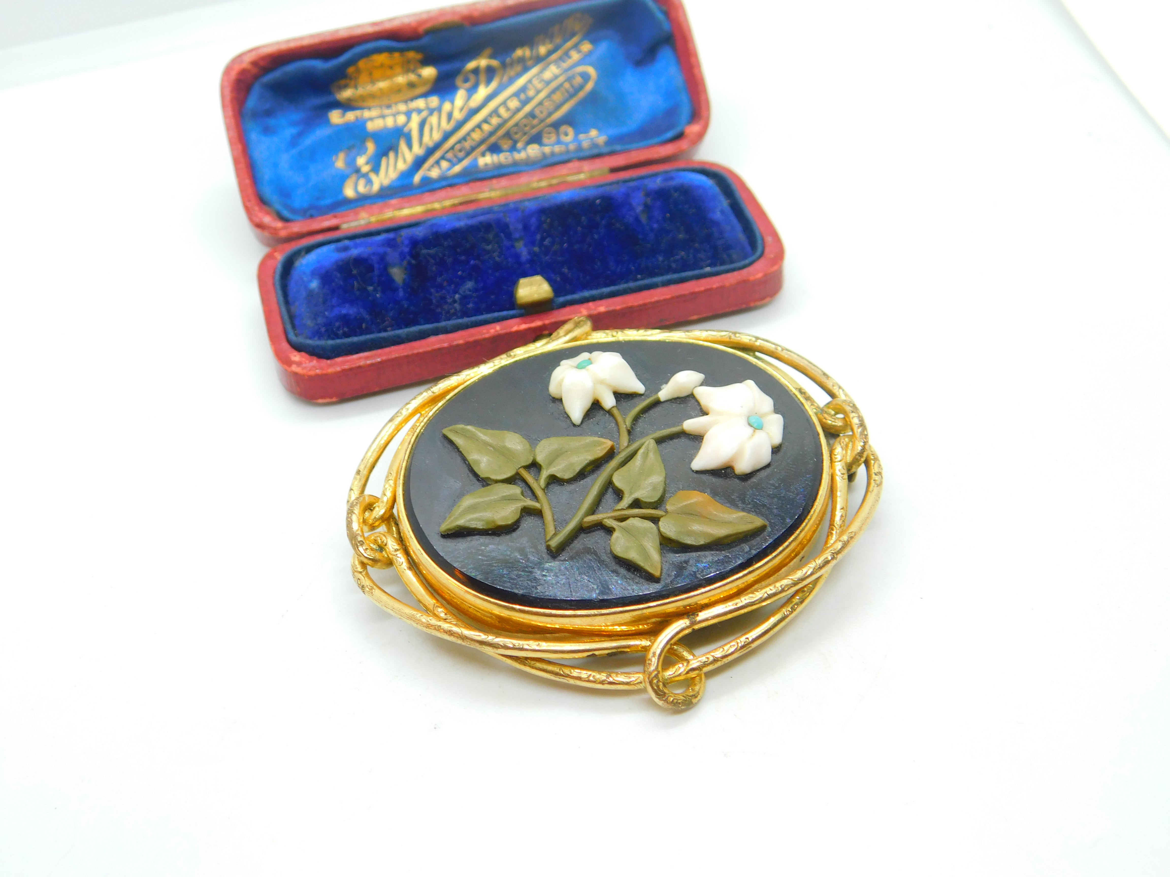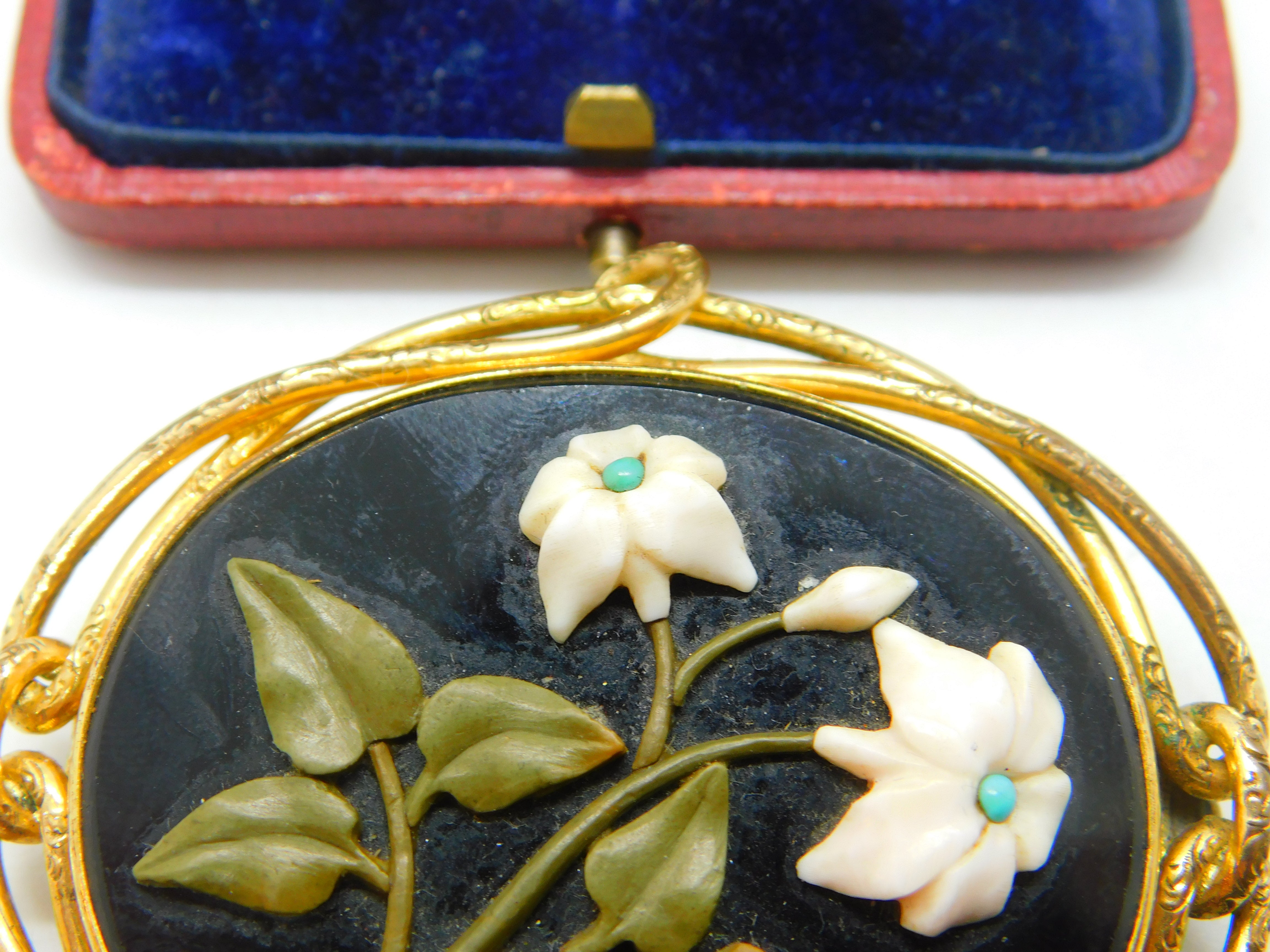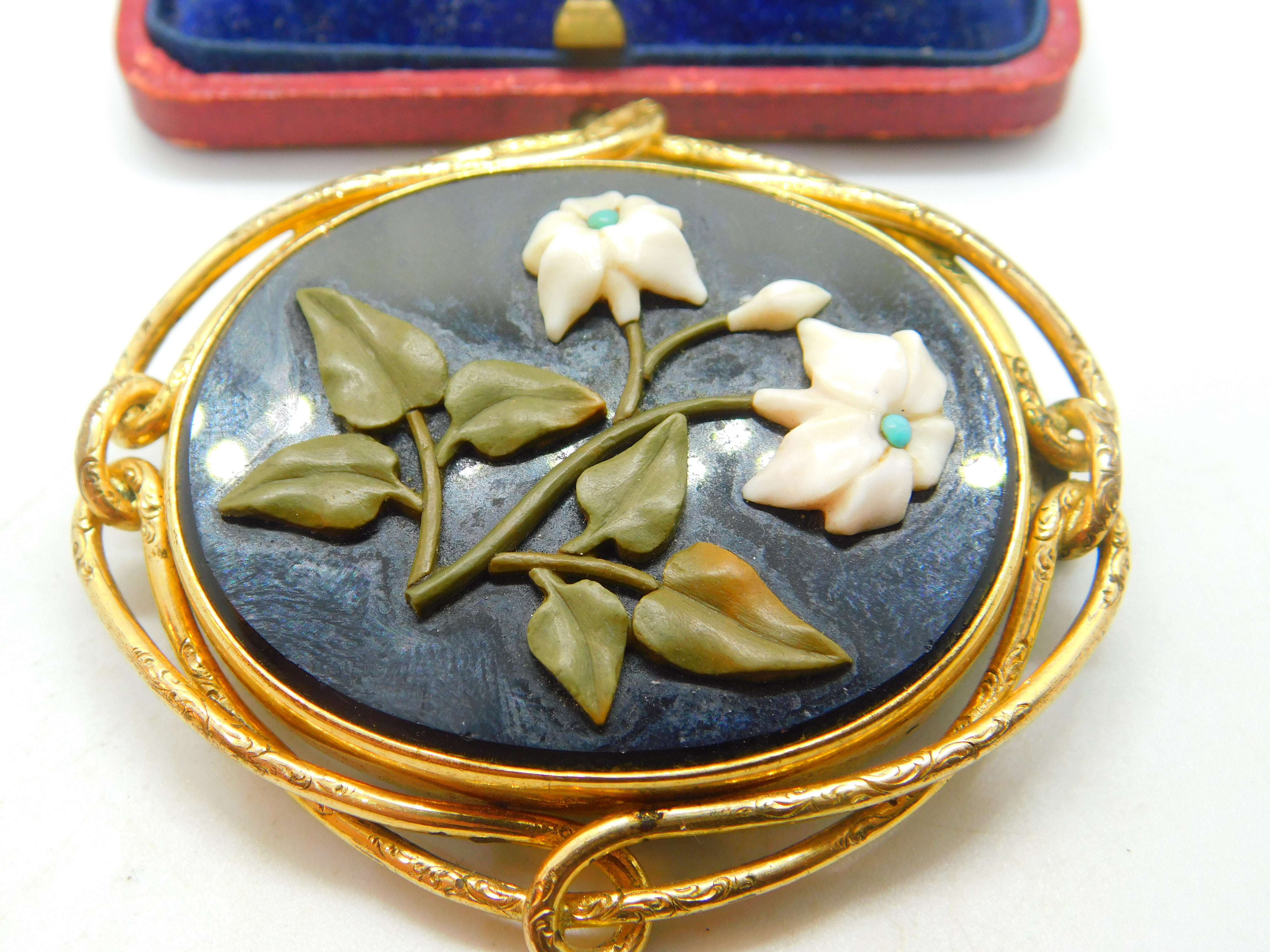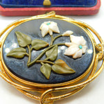 Large Pinchbeck Gold Victorian Pietra Dura Floral Brooch Antique c1860