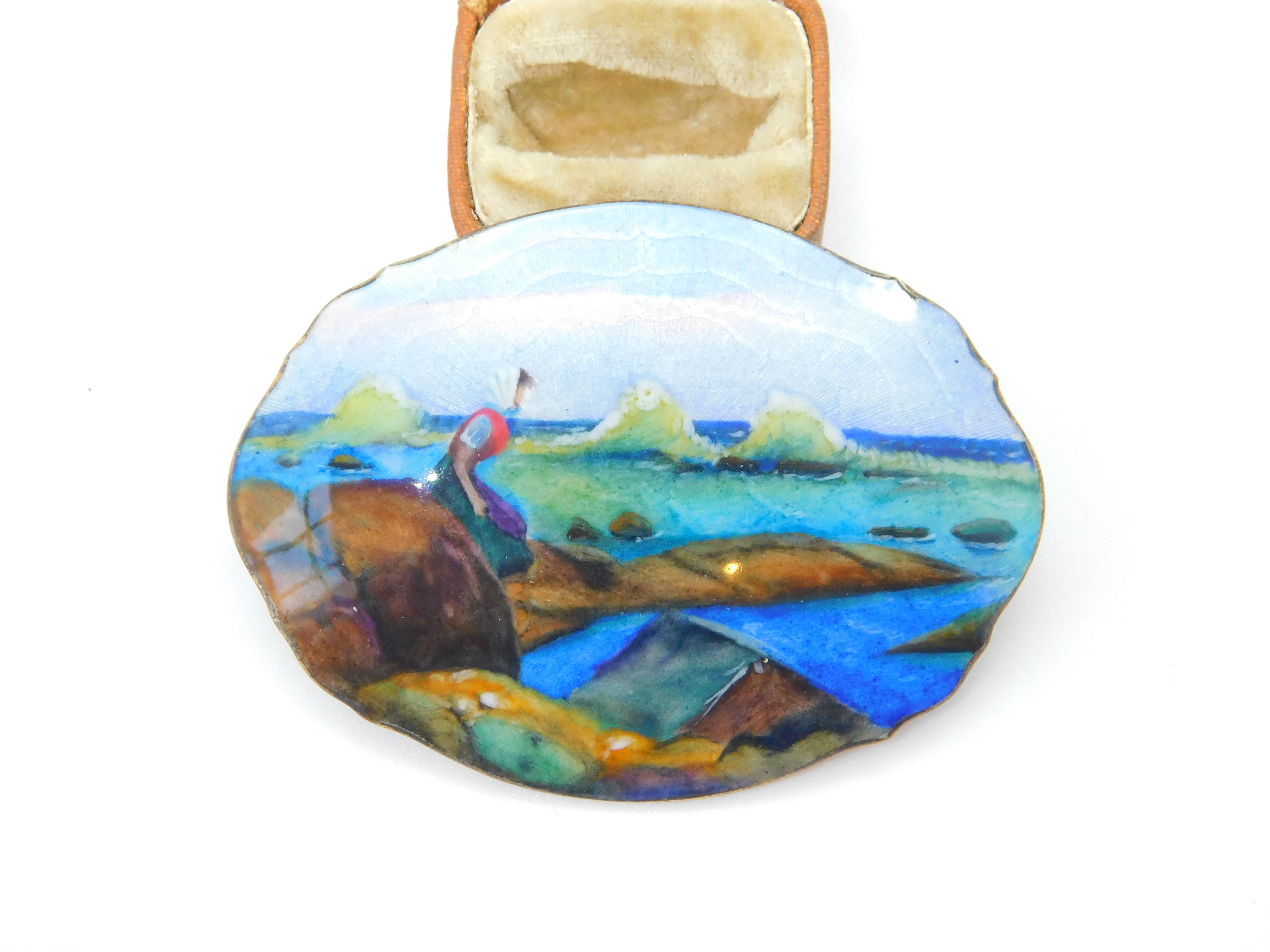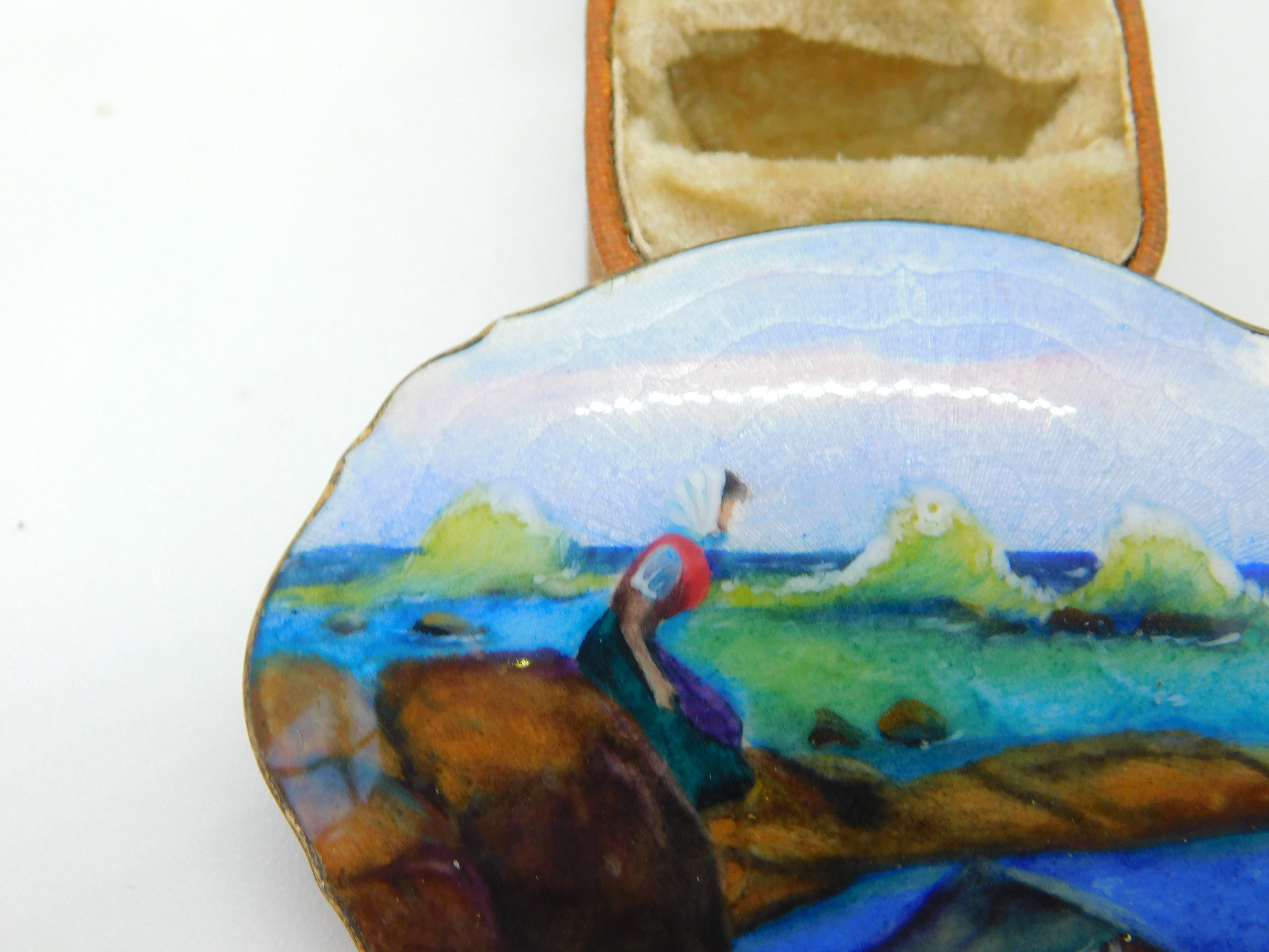 Details: A fantastic and wonderfully designed antique art deco large scandinavian sterling silver guilloche enamel coastal view brooch with superb detailing and colour hallmarked to the reverse c1920 possibly Norwegian. Minor enamel loss to the top right area. This is a wonderful item that would make a perfect gift or addition to any collection. The BOX pictured is for PRESENTATION ONLY and is NOT included in the listings but used to frame the pictures unless specifically stated otherwise.