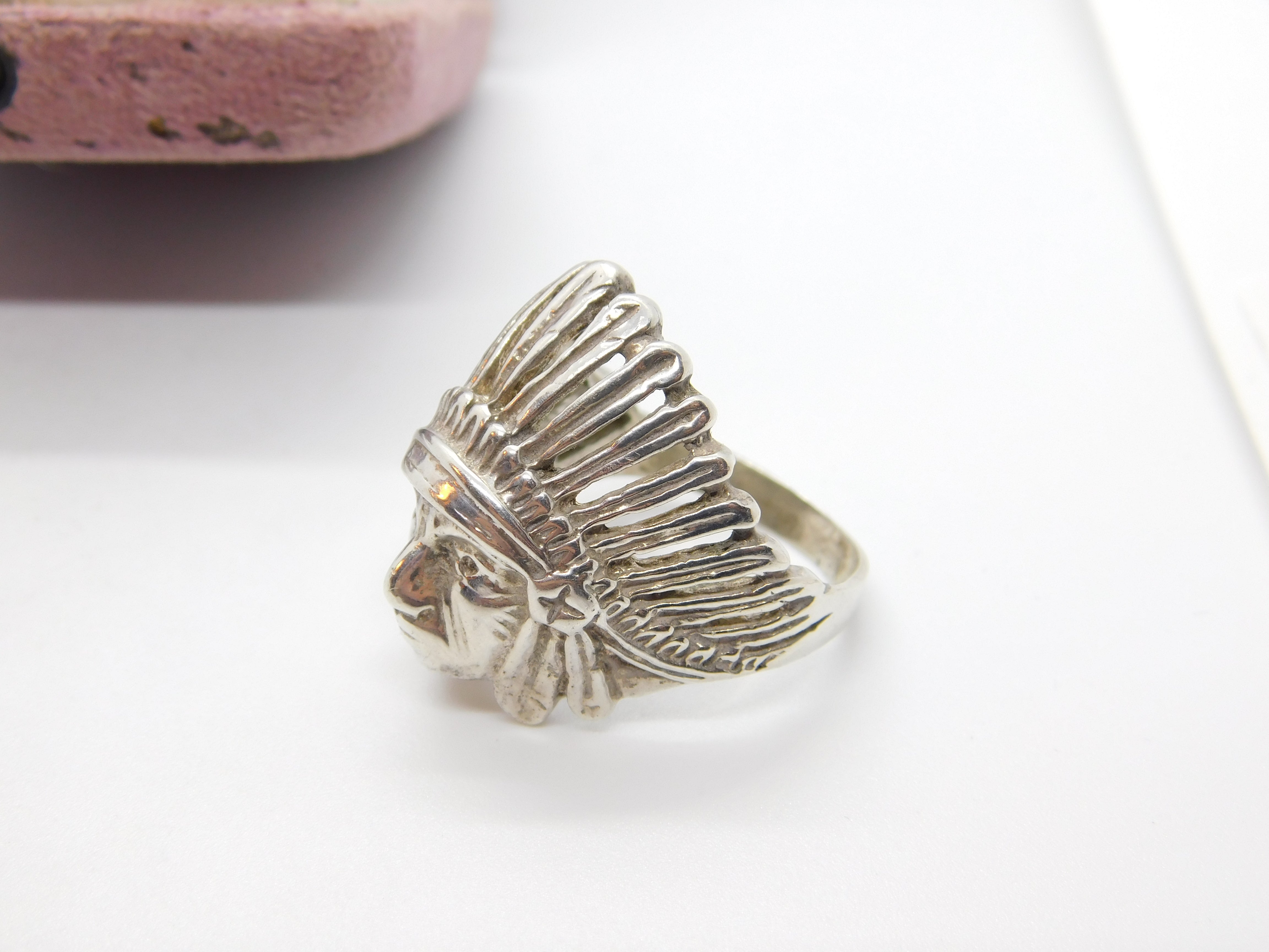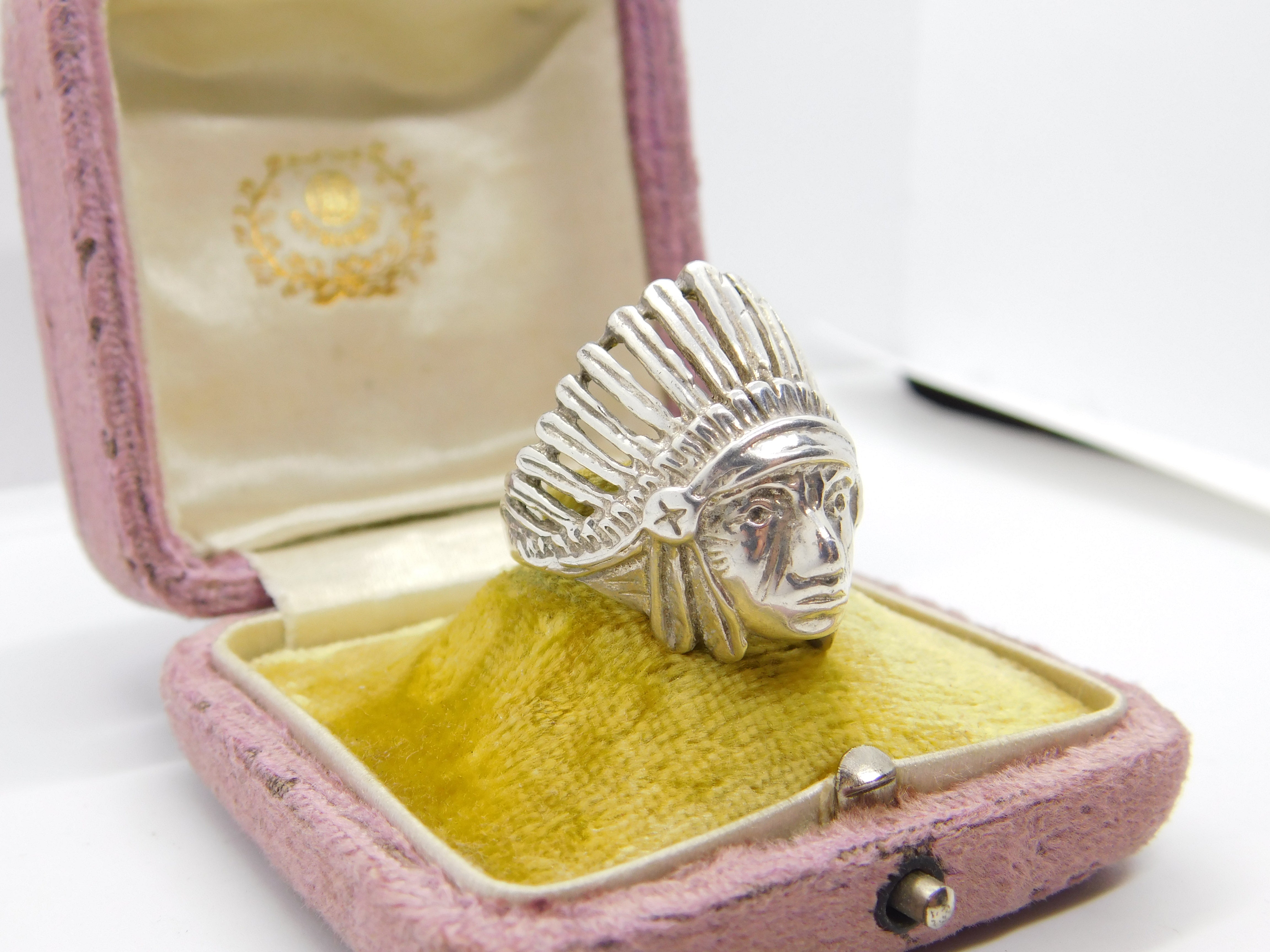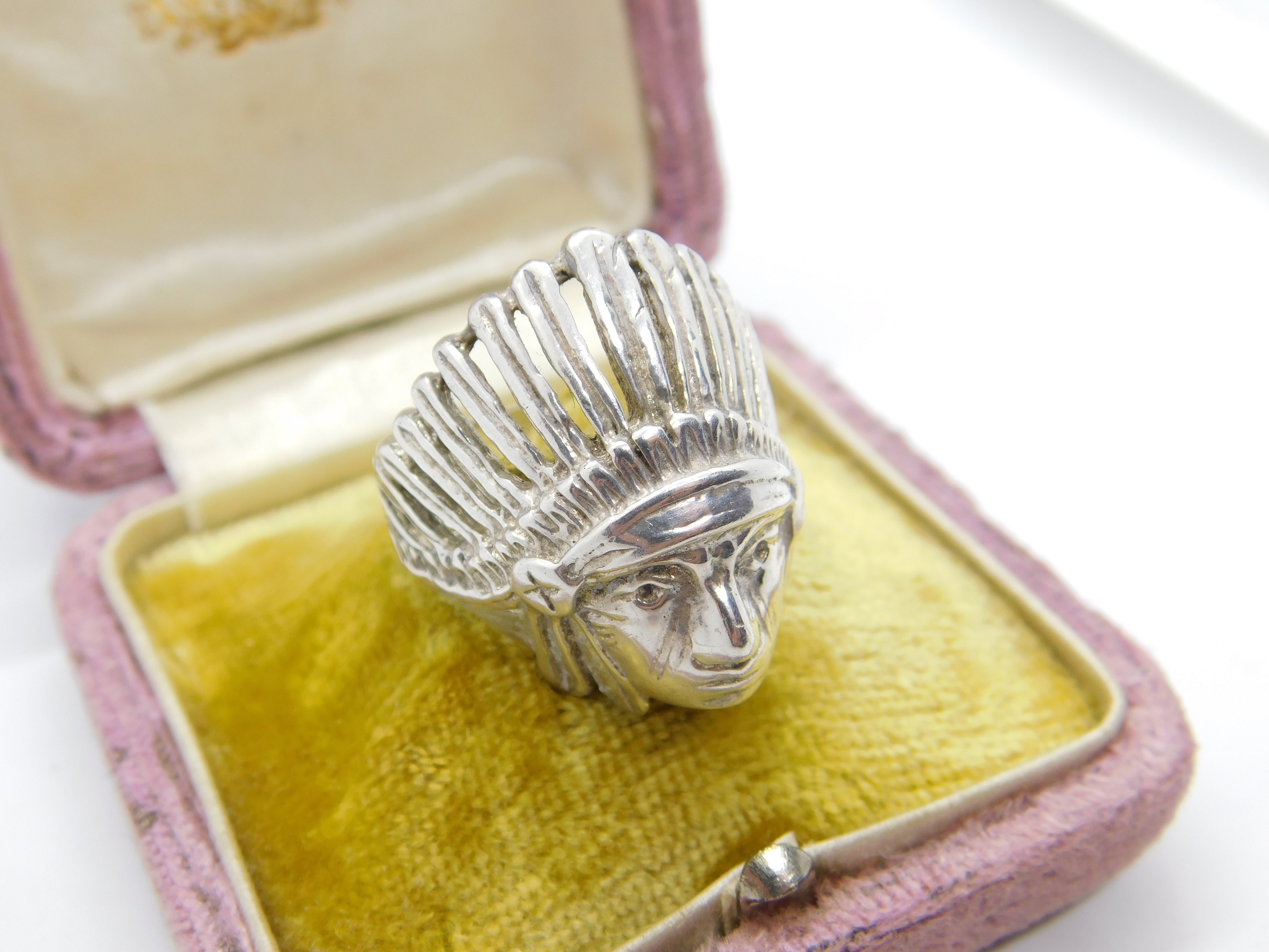 Details: A fantastic and wonderfully designed vintage sterling silver Native American chief statement ring with excellent detail throughout c1970. This is a wonderful item that would make a perfect gift or addition to any collection. The BOX pictured is for PRESENTATION ONLY and is NOT included in the listings but used to frame the pictures unless specifically stated otherwise.