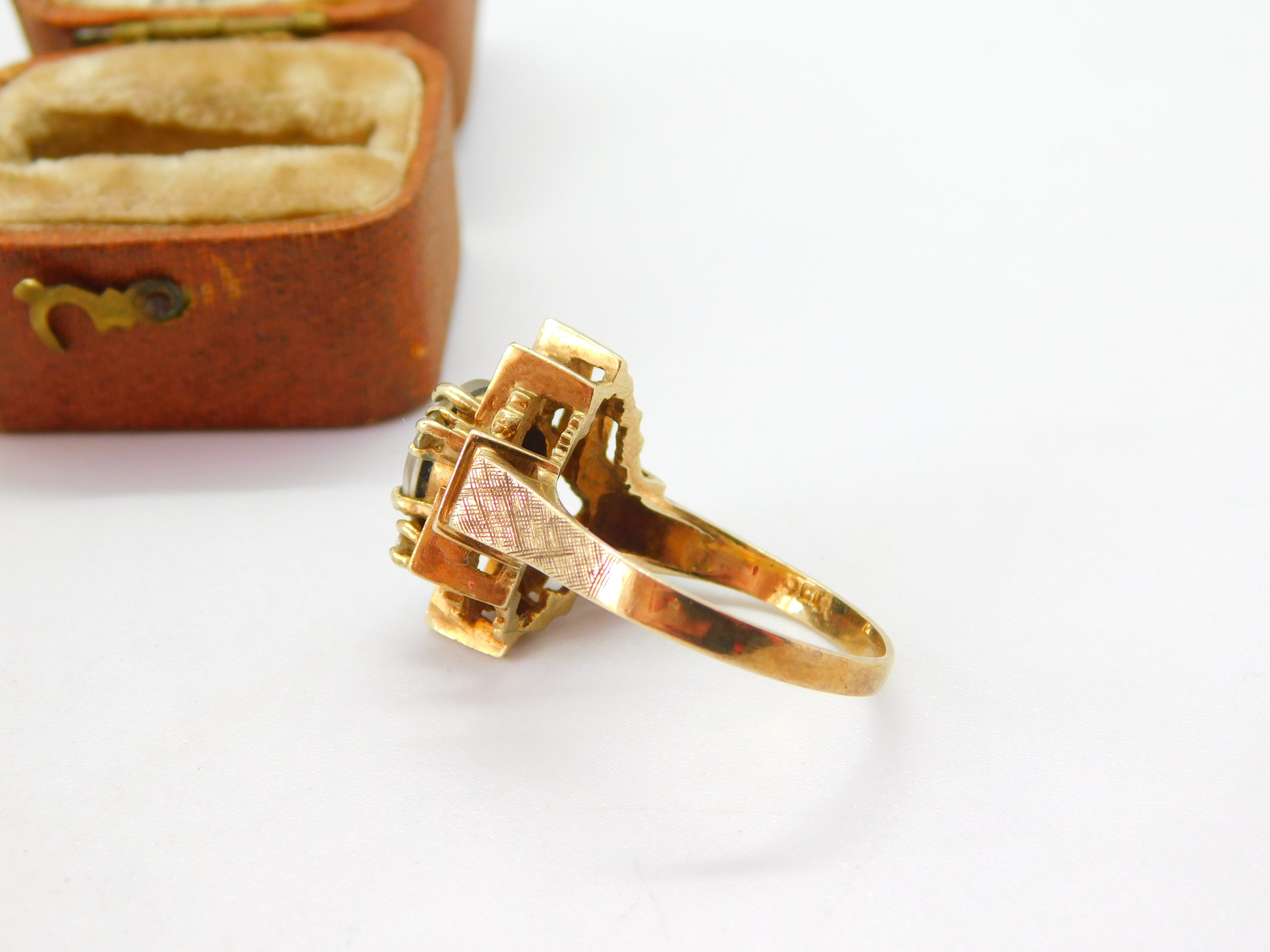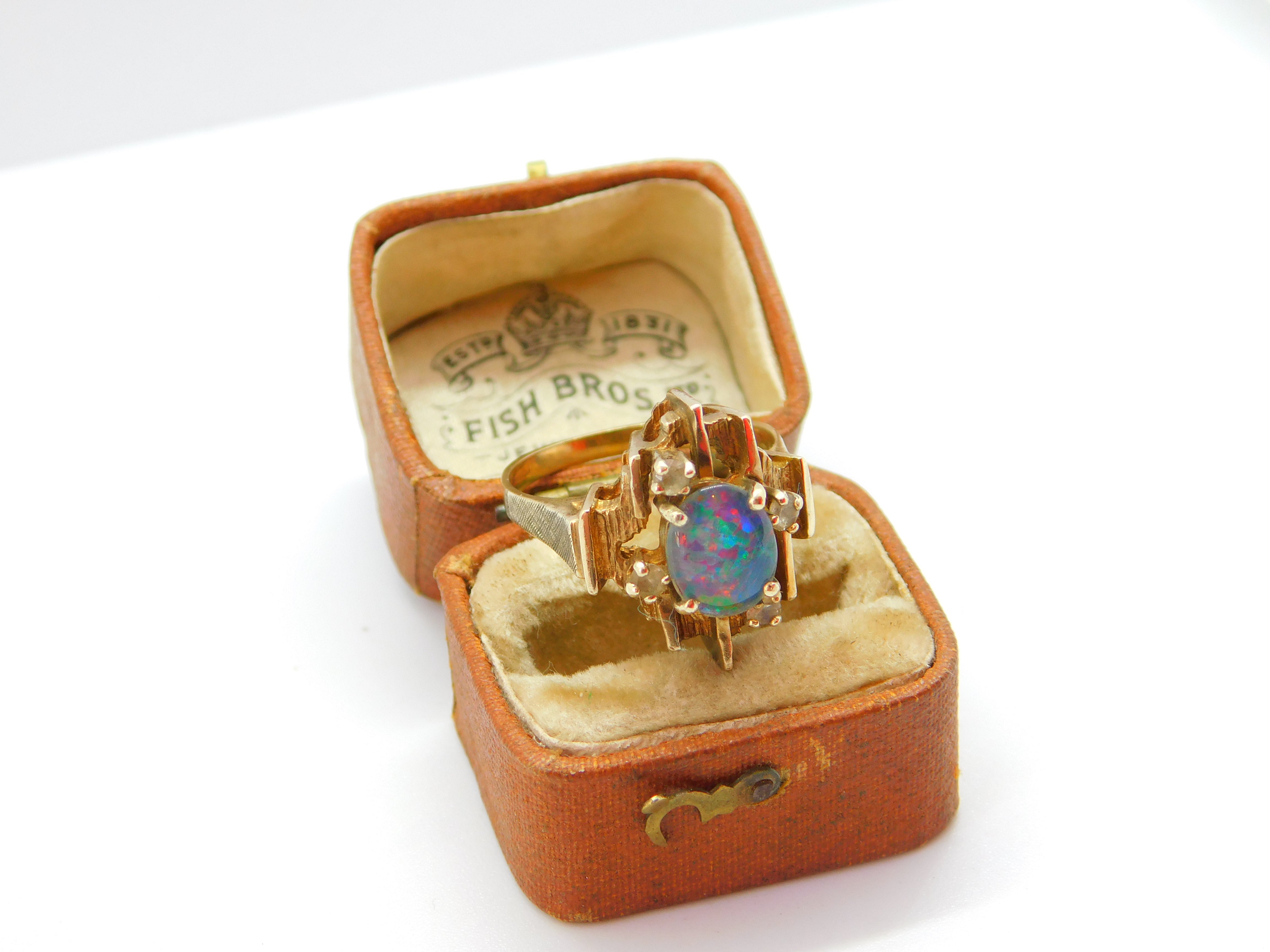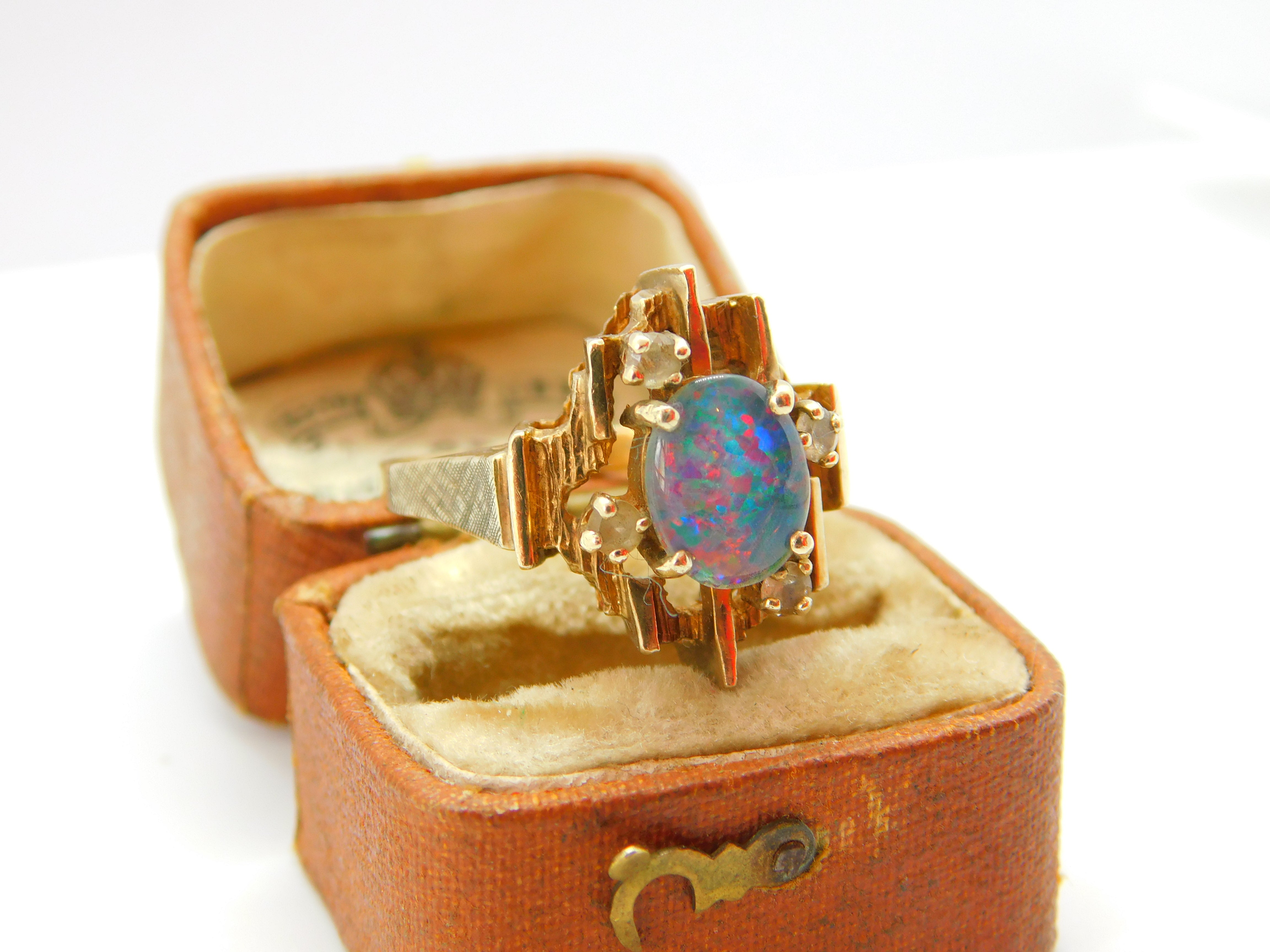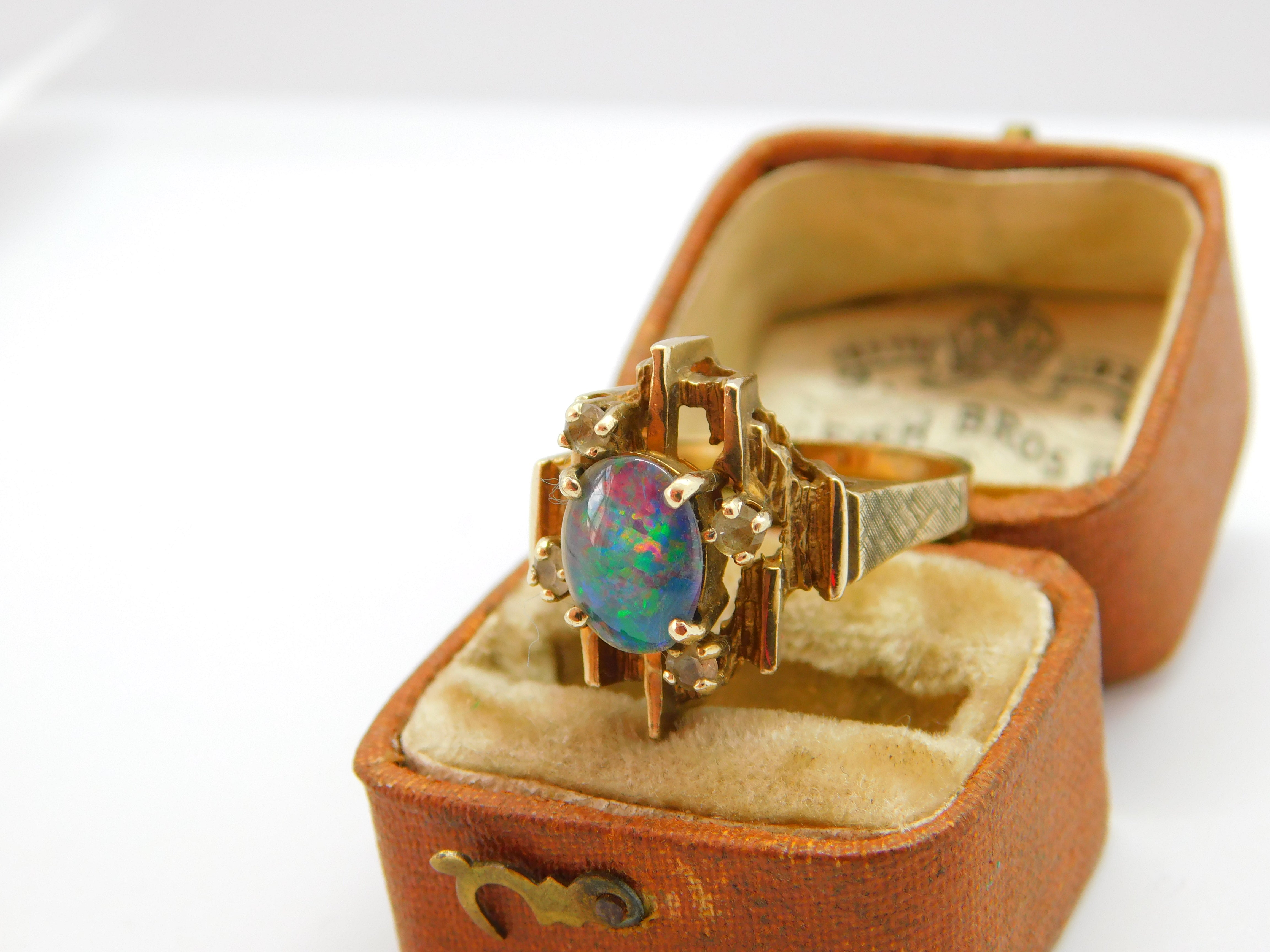 Details: A fantastic and wonderfully designed vintage modernist 9ct yellow gold textured statement ring set with cabochon opal and white spinel stones hallmarked to the interior c1960. This is a wonderful item that would make a perfect gift or addition to any collection. The BOX pictured is for PRESENTATION ONLY and is NOT included in the listings but used to frame the pictures unless specifically stated otherwise.