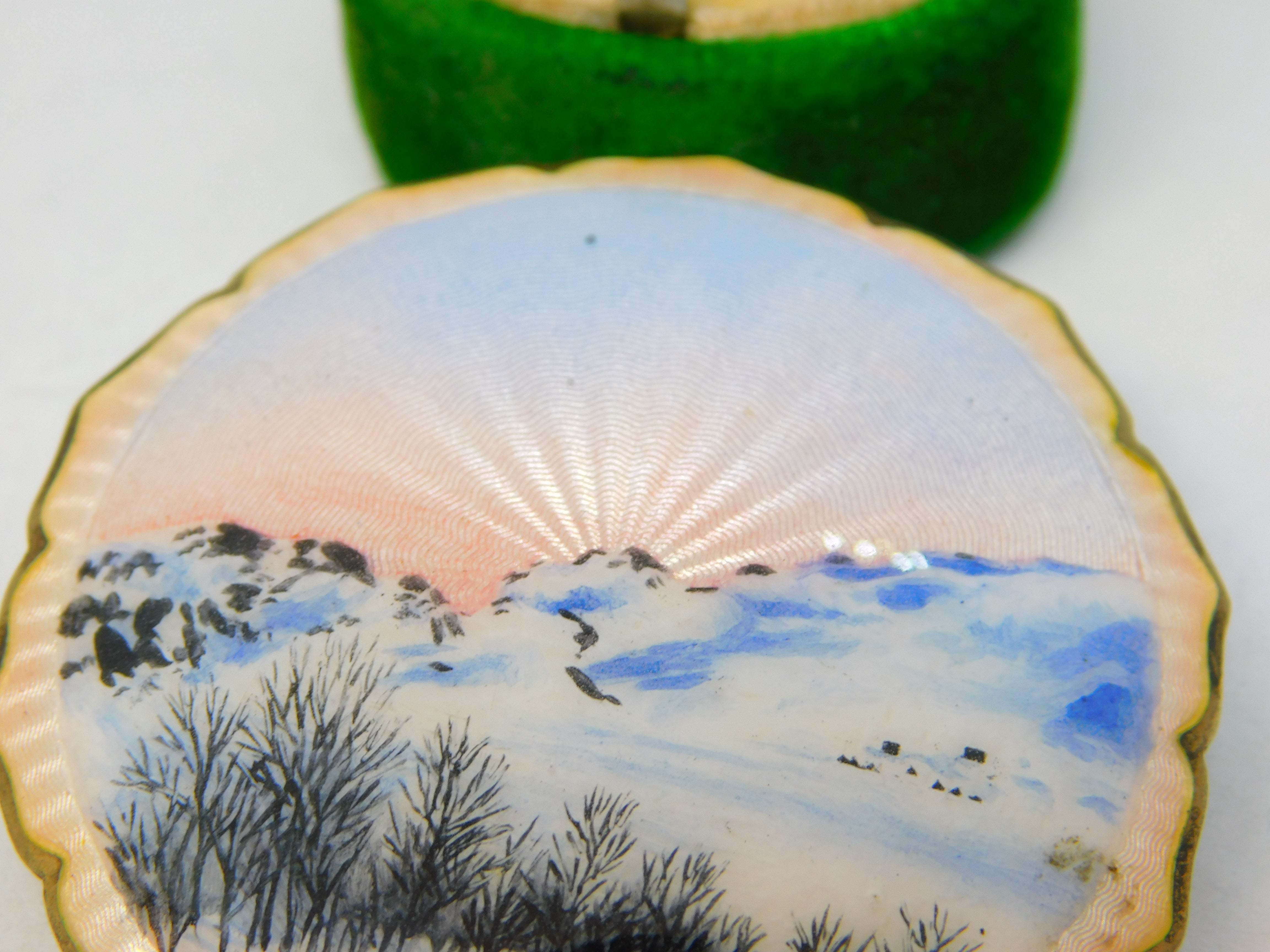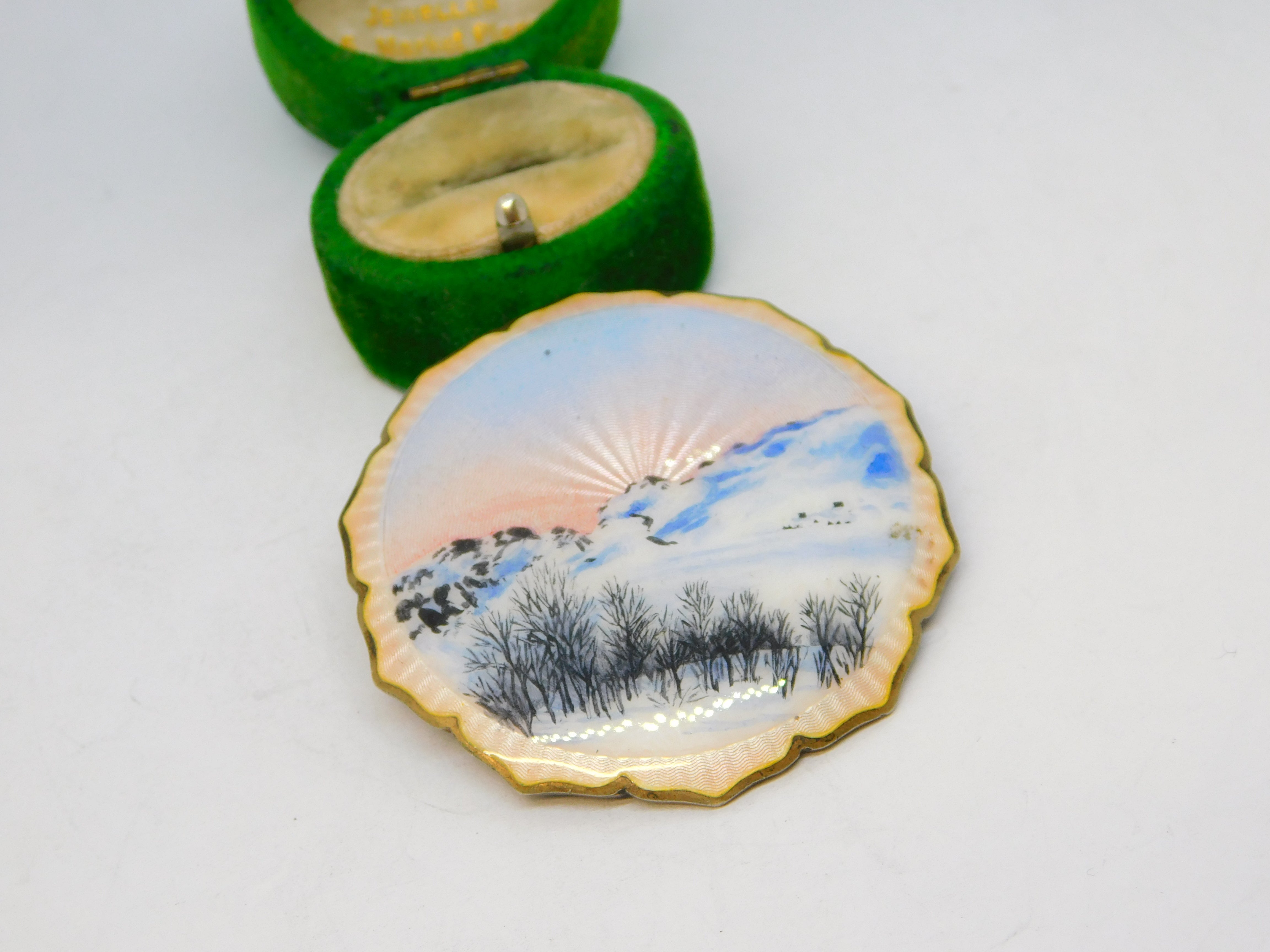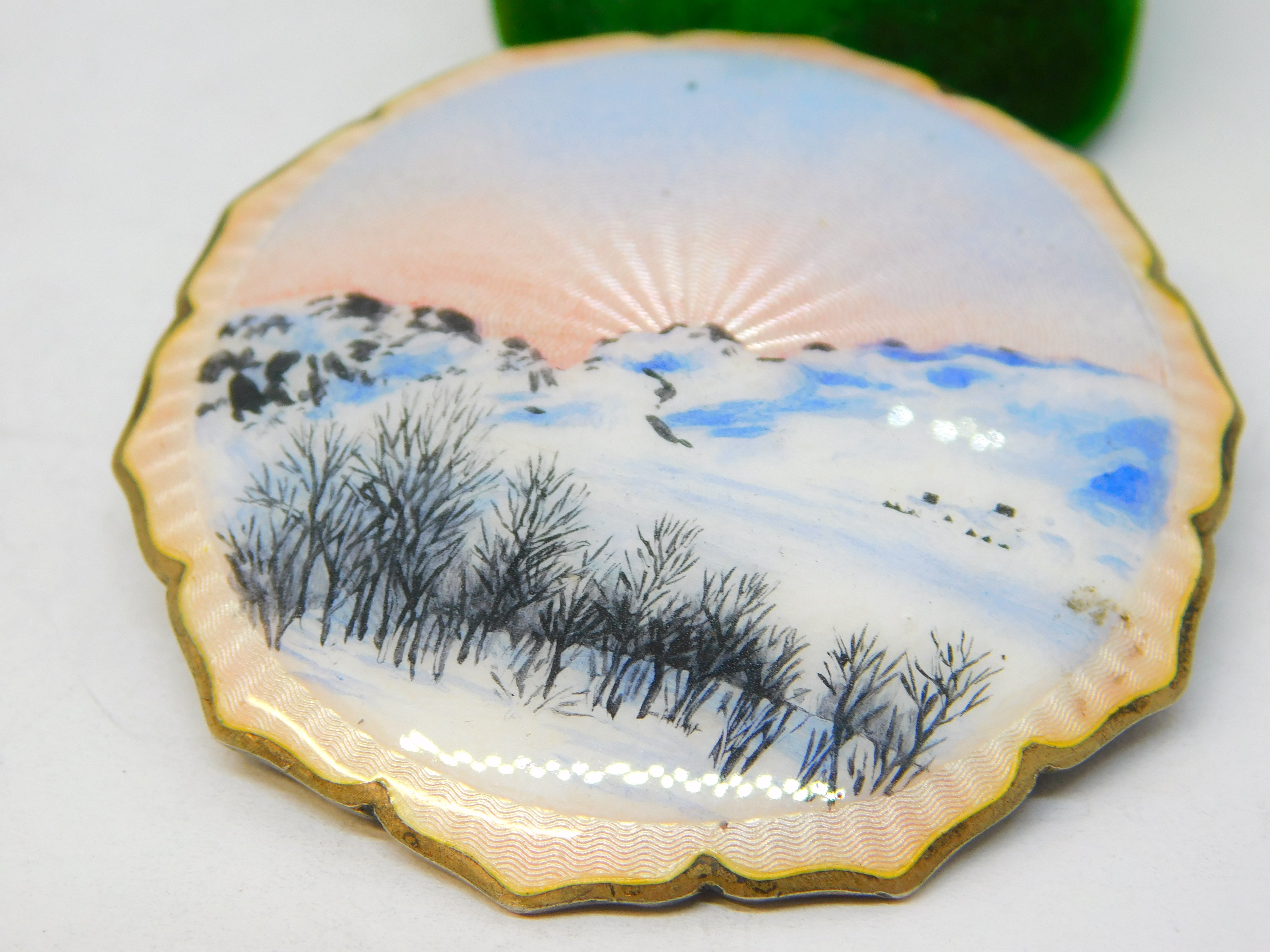 Details: A fantastic and wonderfully designed antique art deco Norwegian sterling silver & guilloche enamel brooch depicting a charming sun rising over a mountain scene hallmarked 925 'K.H' to the reverse c1930. This is a wonderful item that would make a perfect gift or addition to any collection. The BOX pictured is for PRESENTATION ONLY and is NOT included in the listings but used to frame the pictures unless specifically stated otherwise.