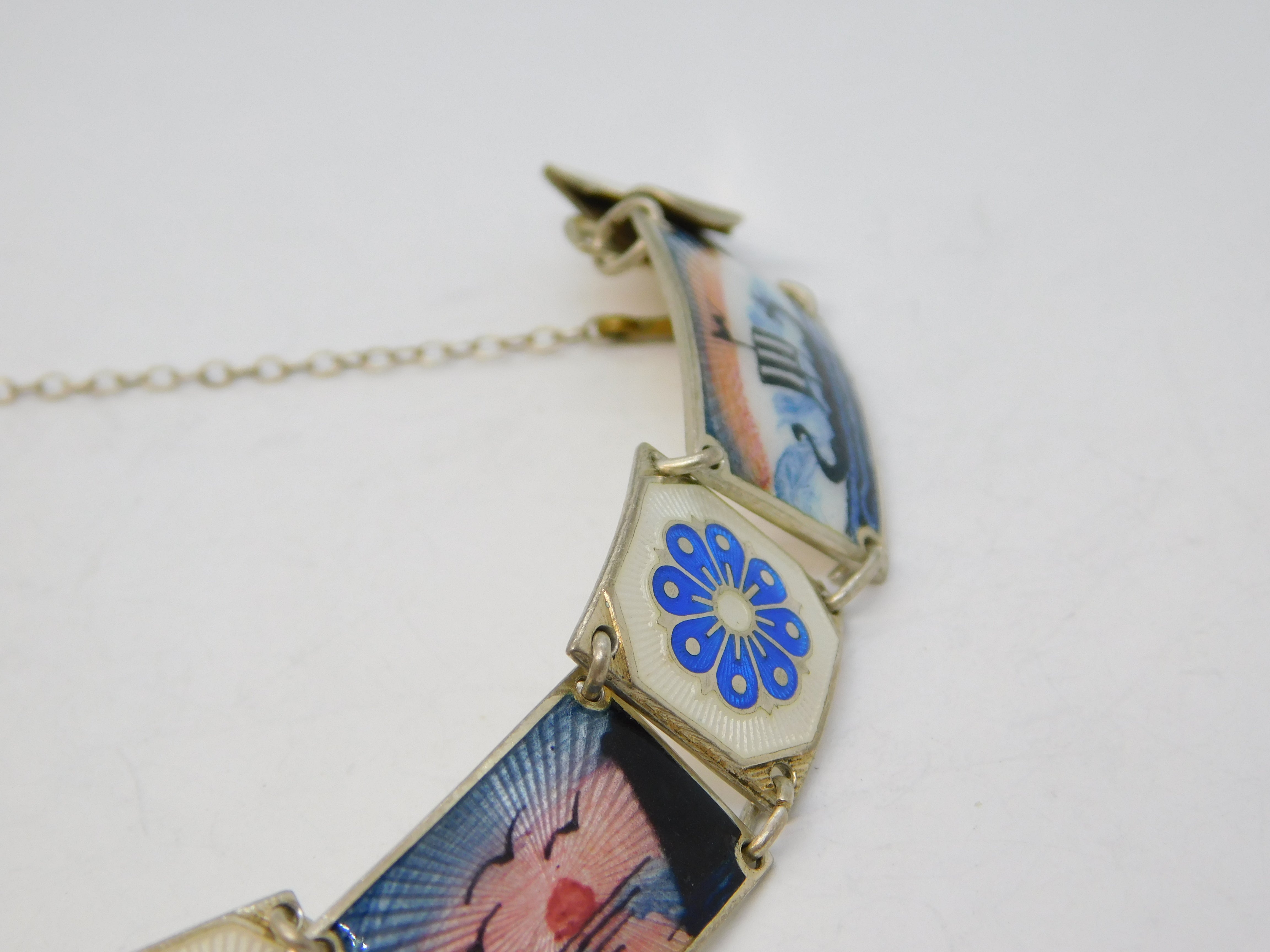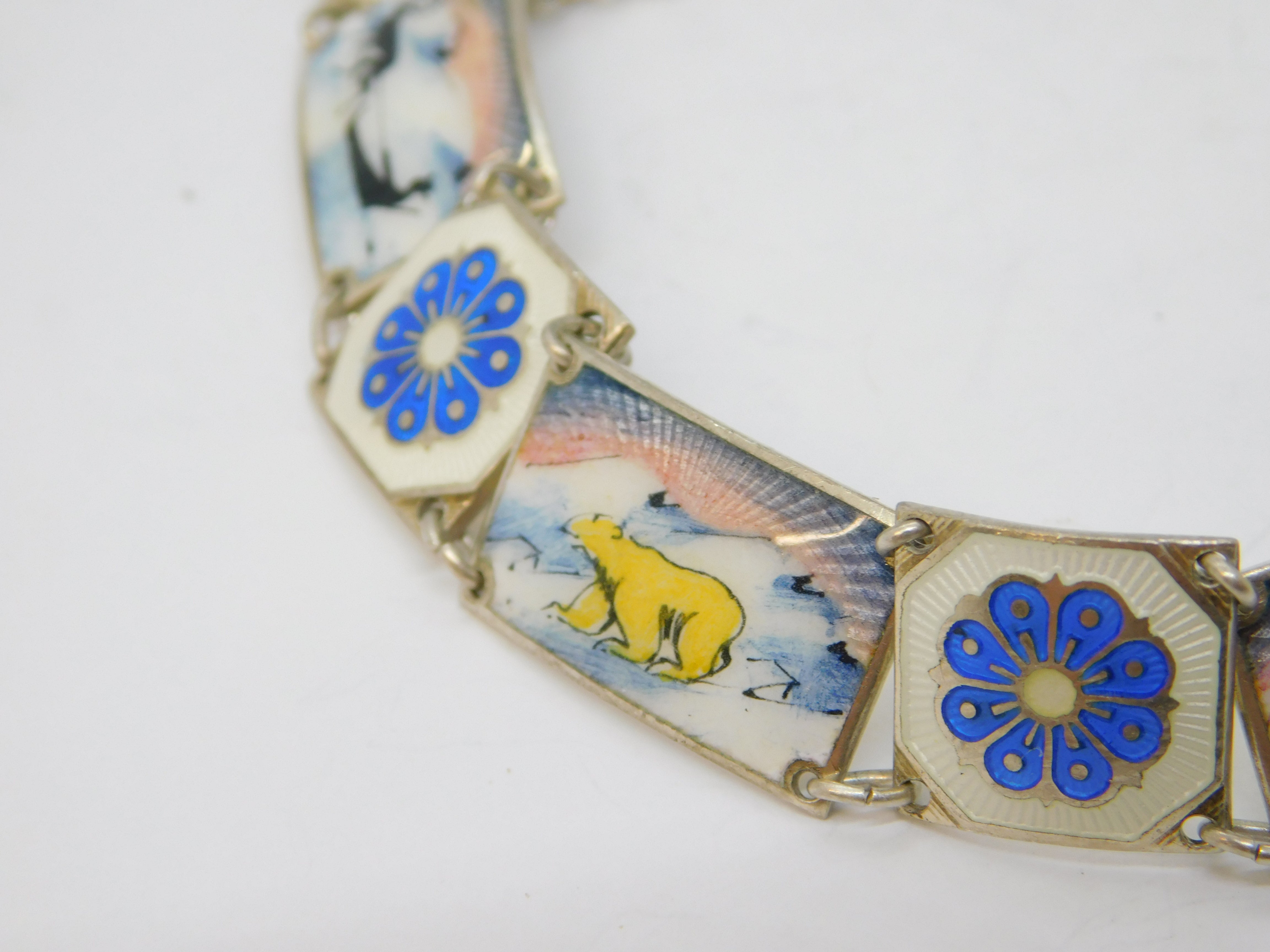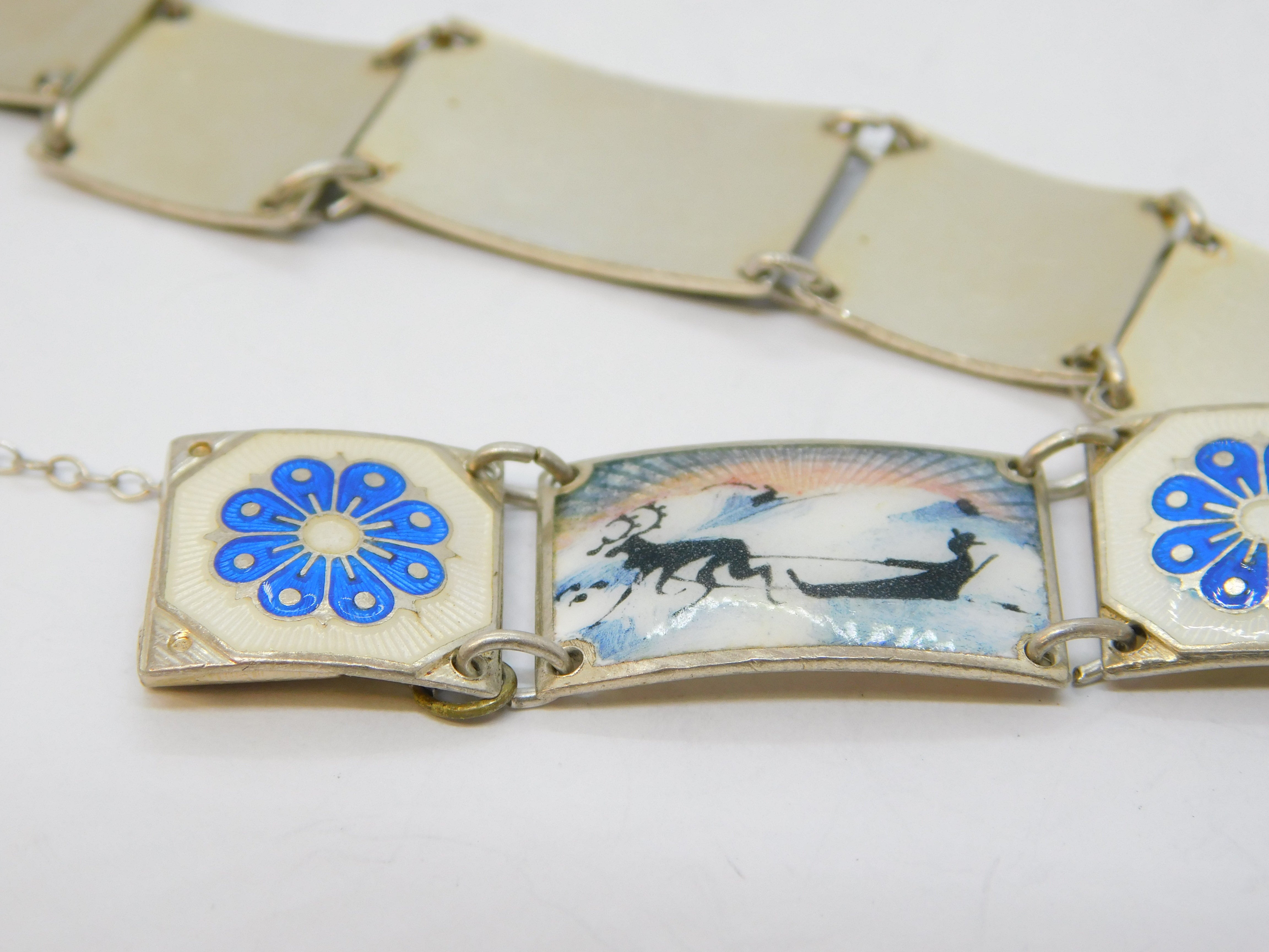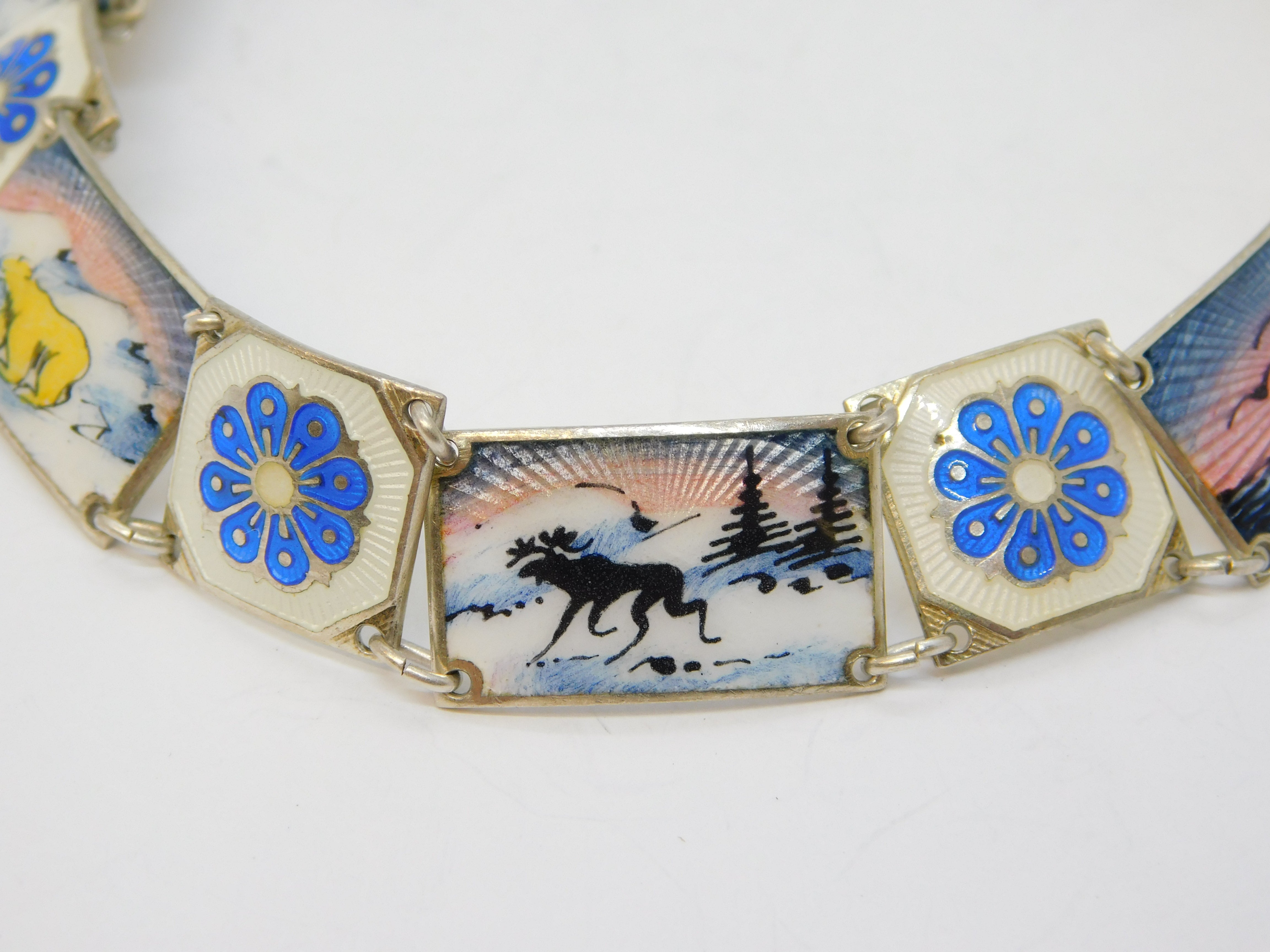 Norwegian Sterling Silver Enamel Winter Scenes Panel Bracelet Antique c1930