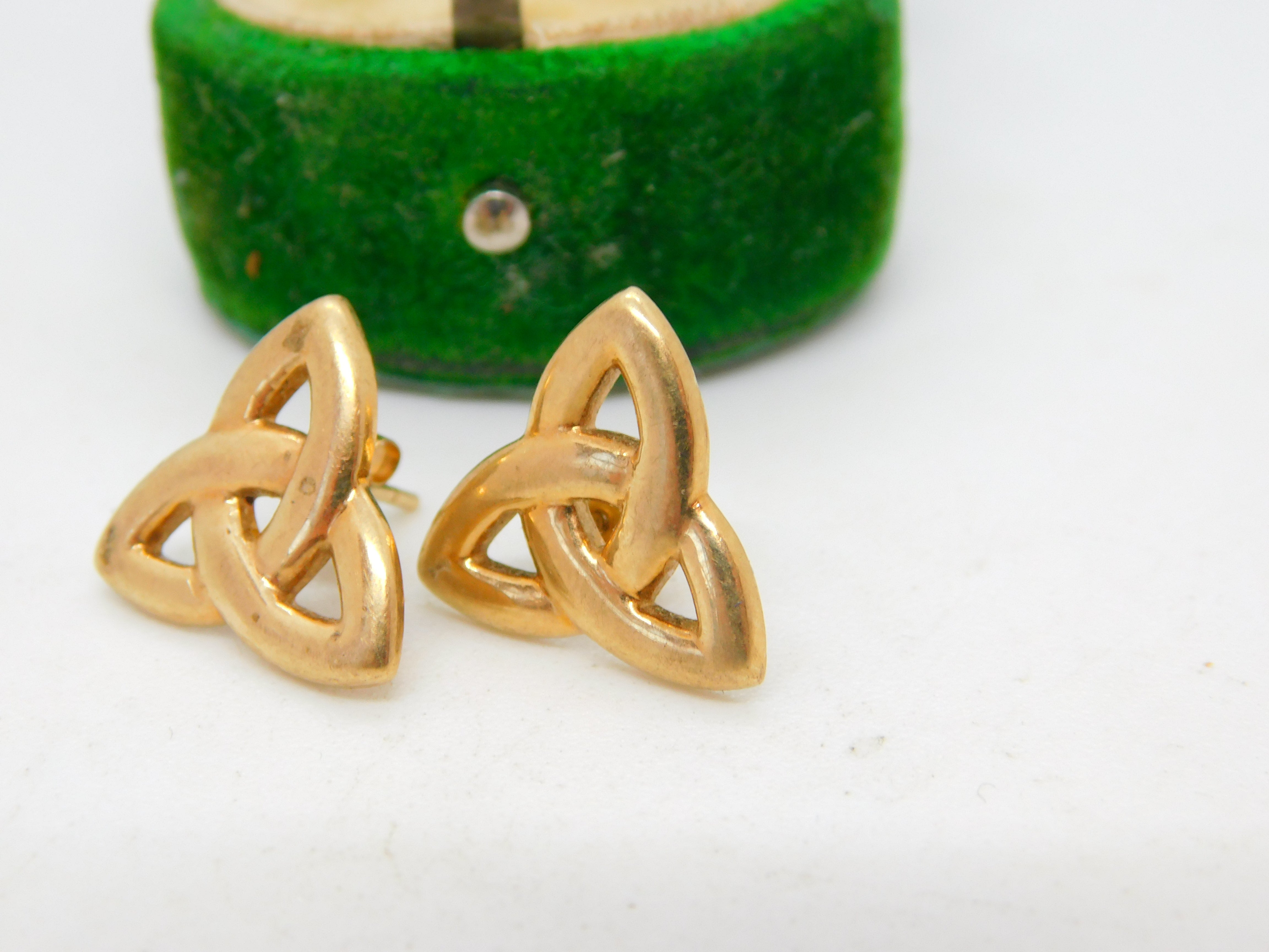 Details: A fantastic and wonderfully designed pair of vintage 9ct yellow gold celtic knot pattern stud earrings hallmarked to the backs Birmingham c1980. This is a wonderful item that would make a perfect gift or addition to any collection. The BOX pictured is for PRESENTATION ONLY and is NOT included in the listings but used to frame the pictures unless specifically stated otherwise.