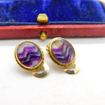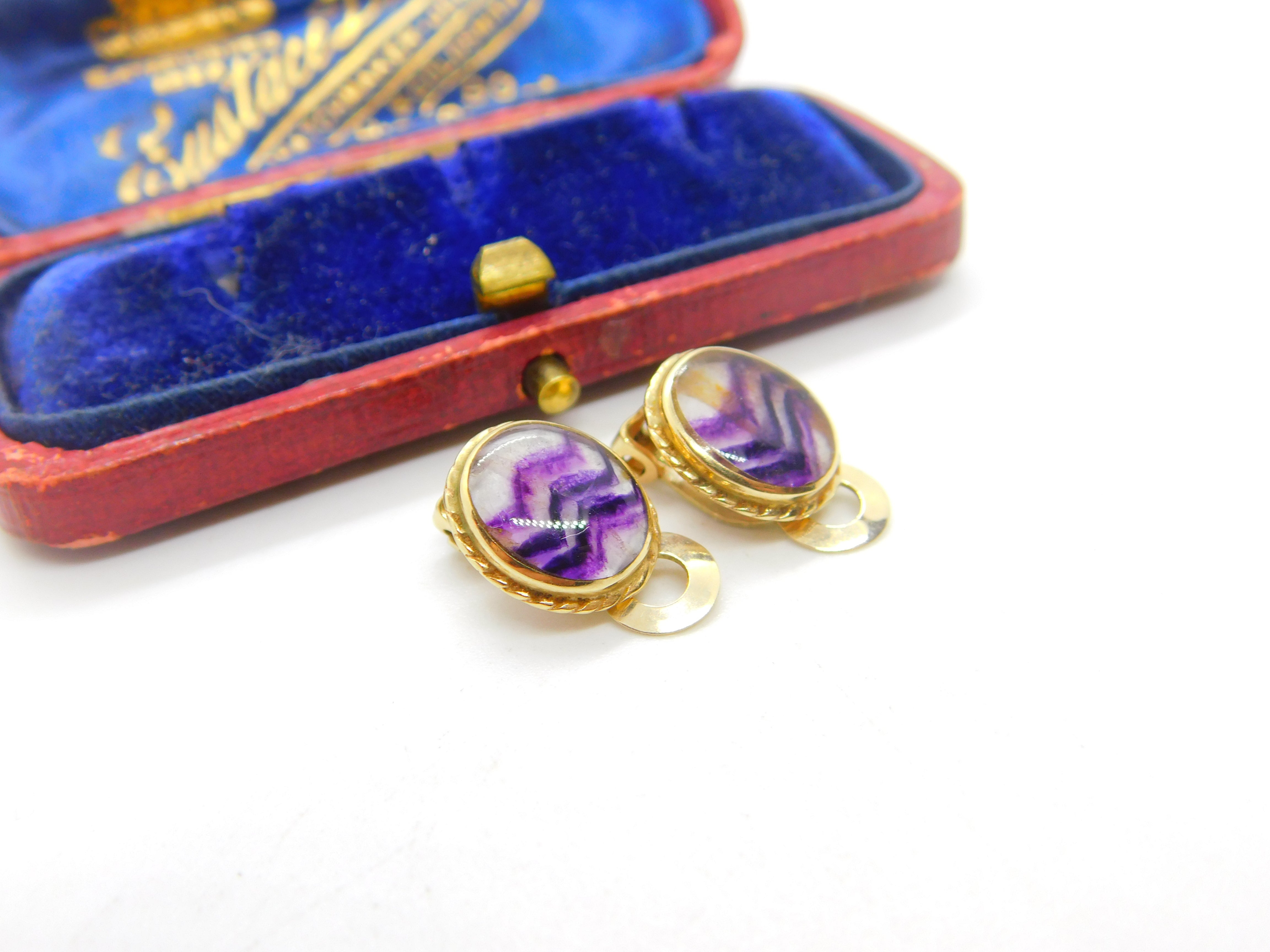 Details: A fantastic and wonderfully designed pair of vintage 9ct yellow gold clip on earrings set with beautifully coloured Derbyshire Blue John stone hallmarked Sheffield 1991 to the backs. This is a wonderful item that would make a perfect gift or addition to any collection. The BOX pictured is for PRESENTATION ONLY and is NOT included in the listings but used to frame the pictures unless specifically stated otherwise.