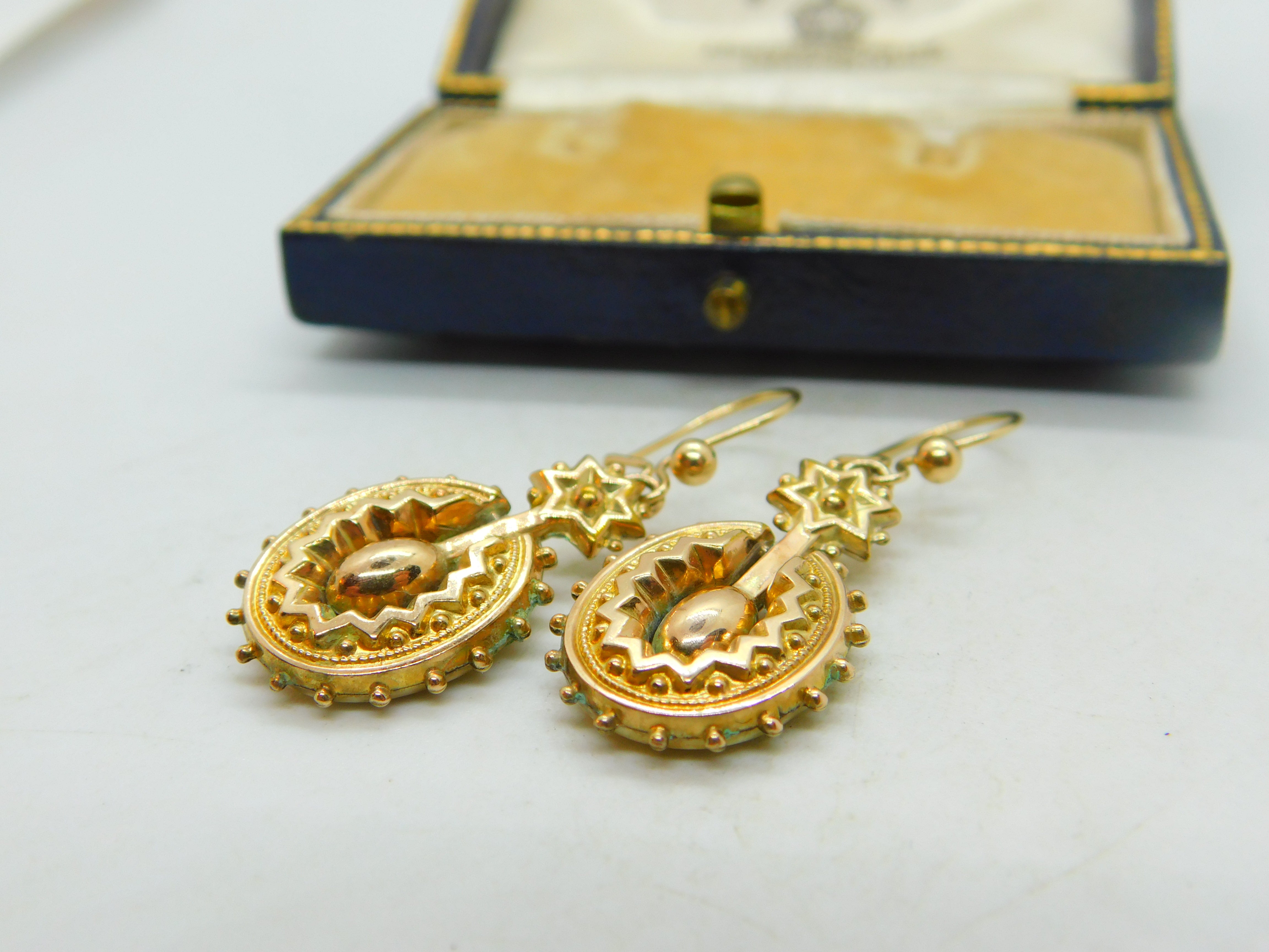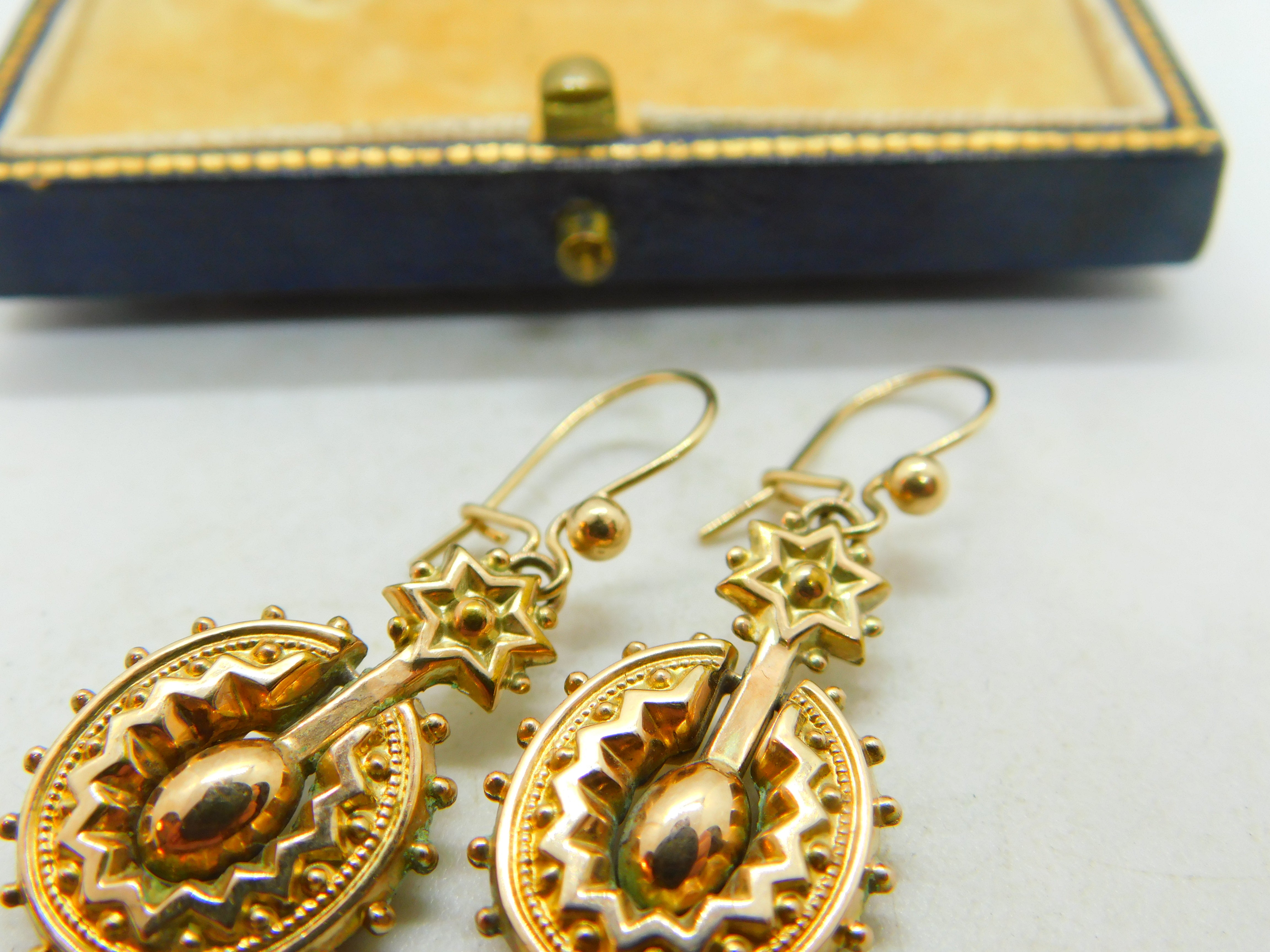 Details: A fantastic and wonderfully designed pair of antique Victorian 9ct yellow gold etruscan style star form earrings c1860 with lovely articulated design. The gold has been XRF tested. This is a wonderful item that would make a perfect gift or addition to any collection. The BOX pictured is for PRESENTATION ONLY and is NOT included in the listings but used to frame the pictures unless specifically stated otherwise.