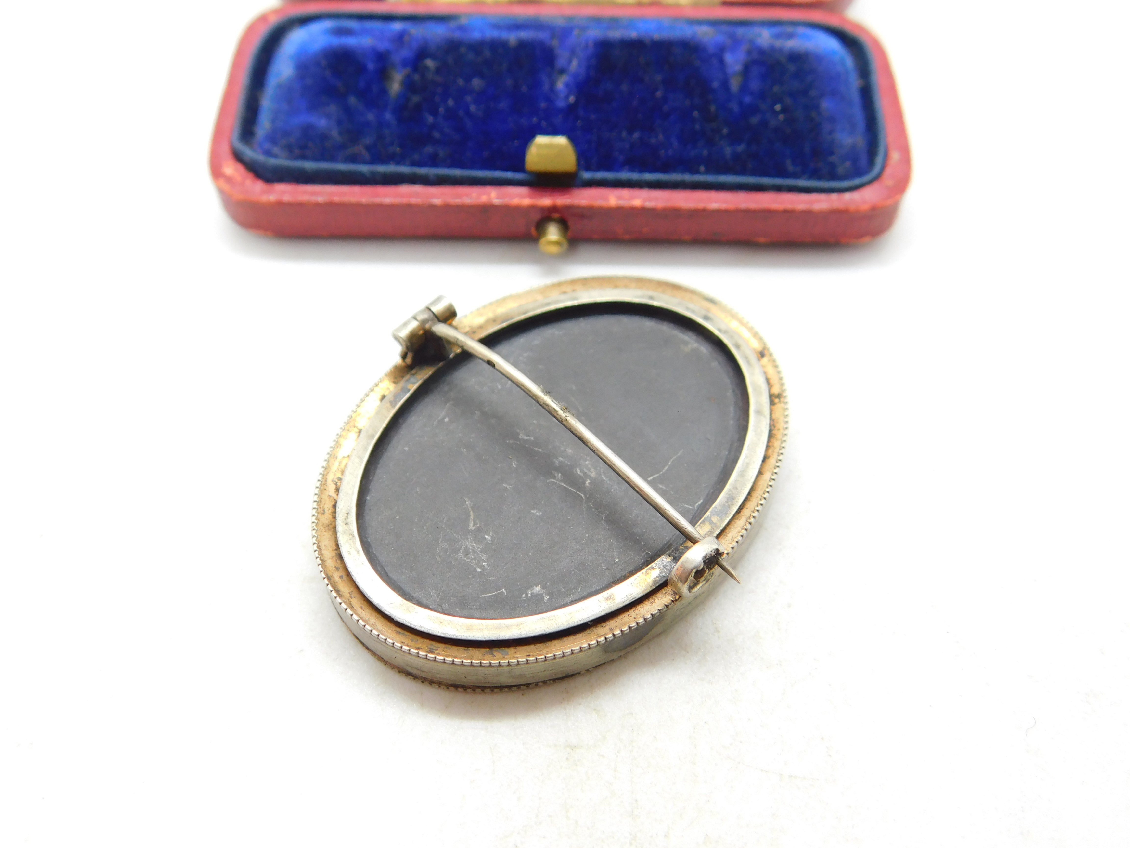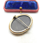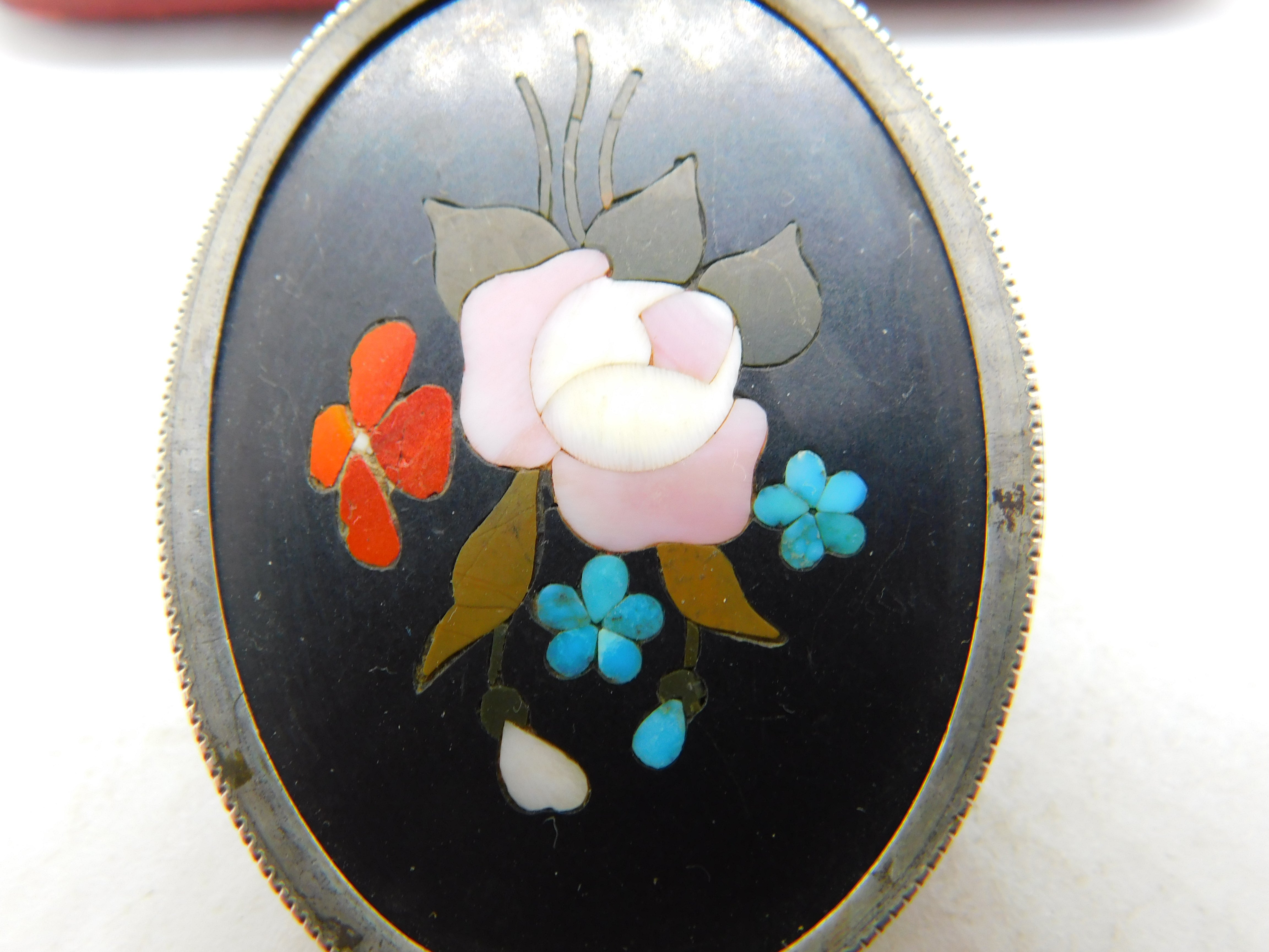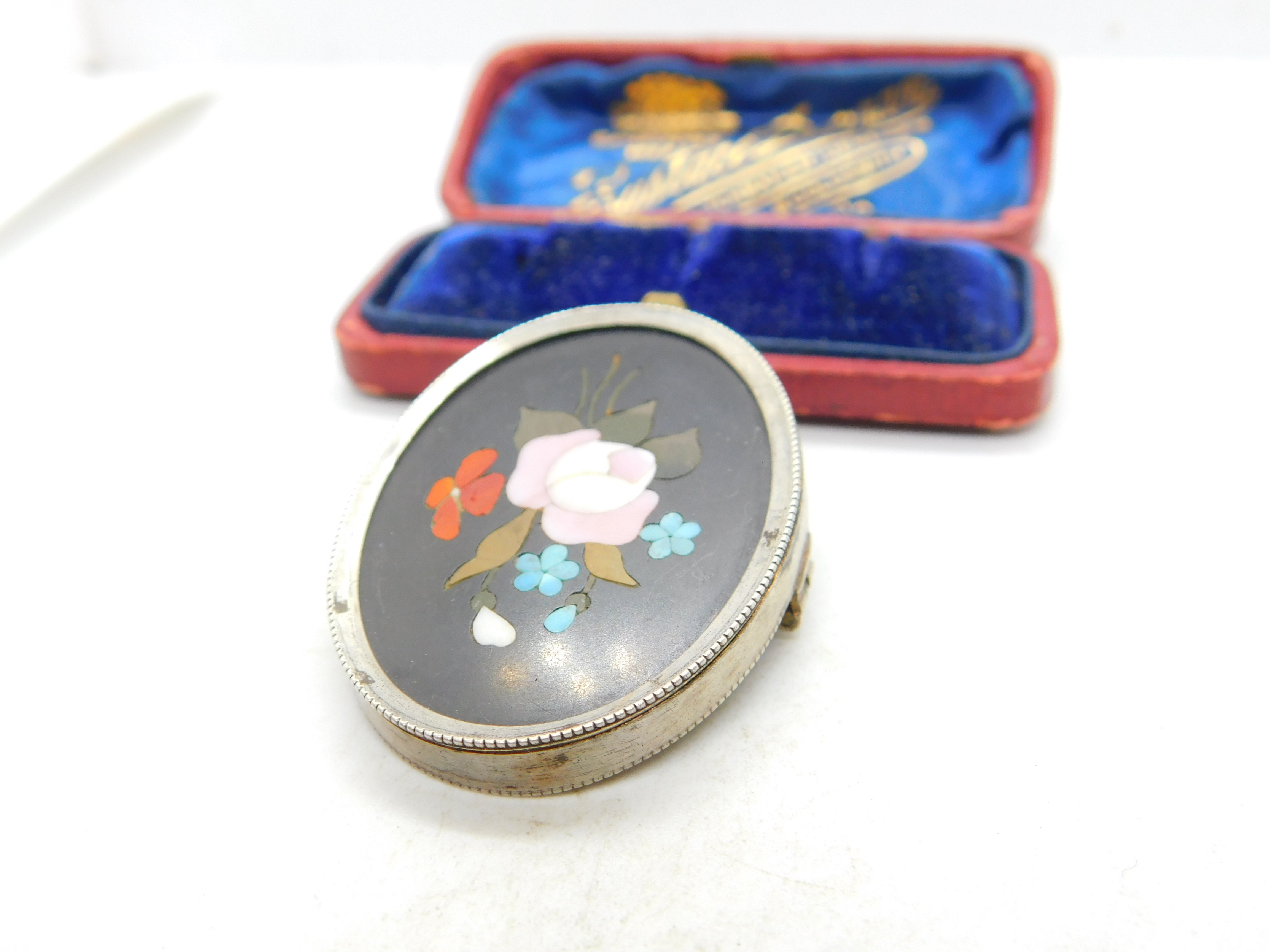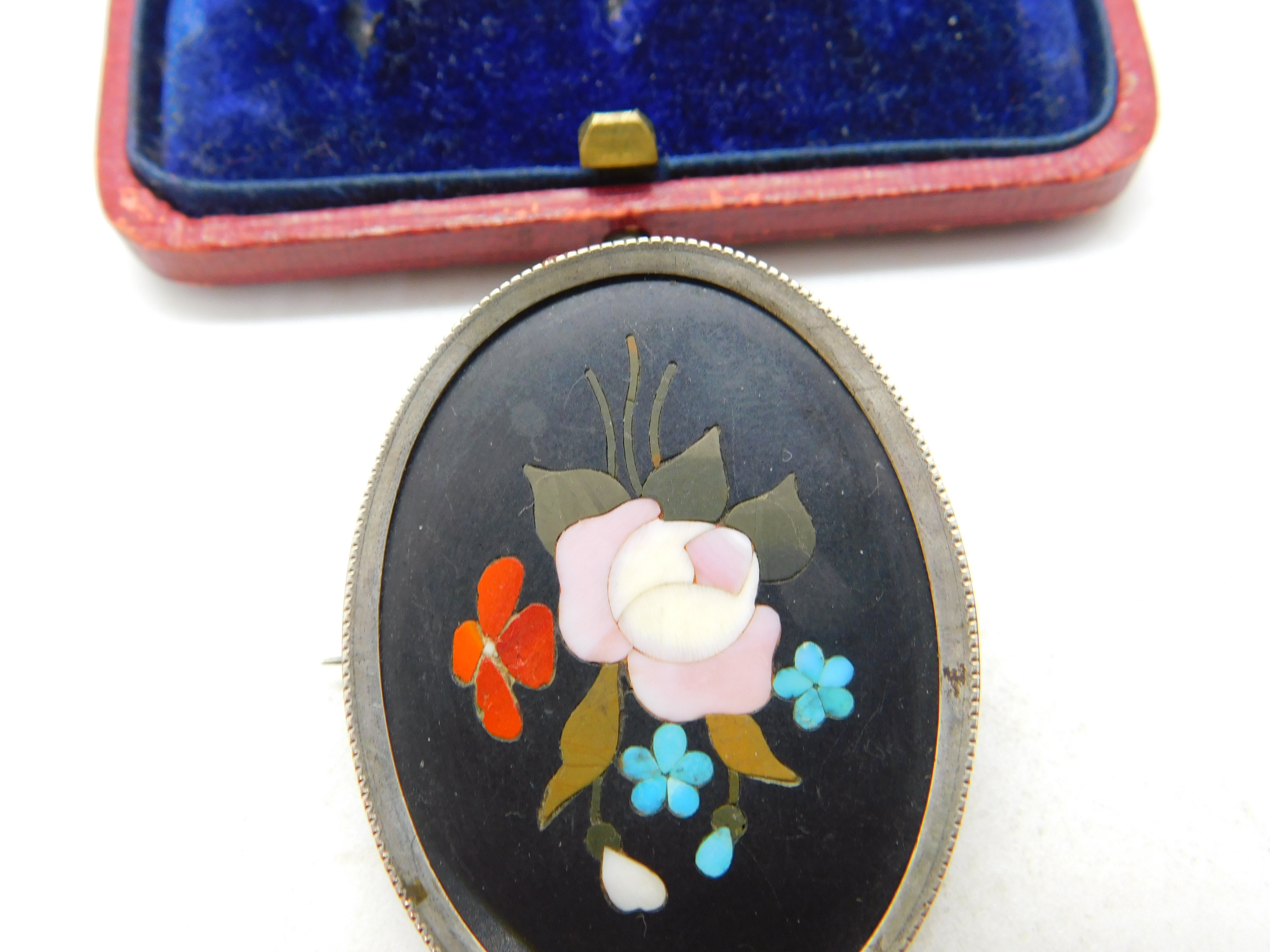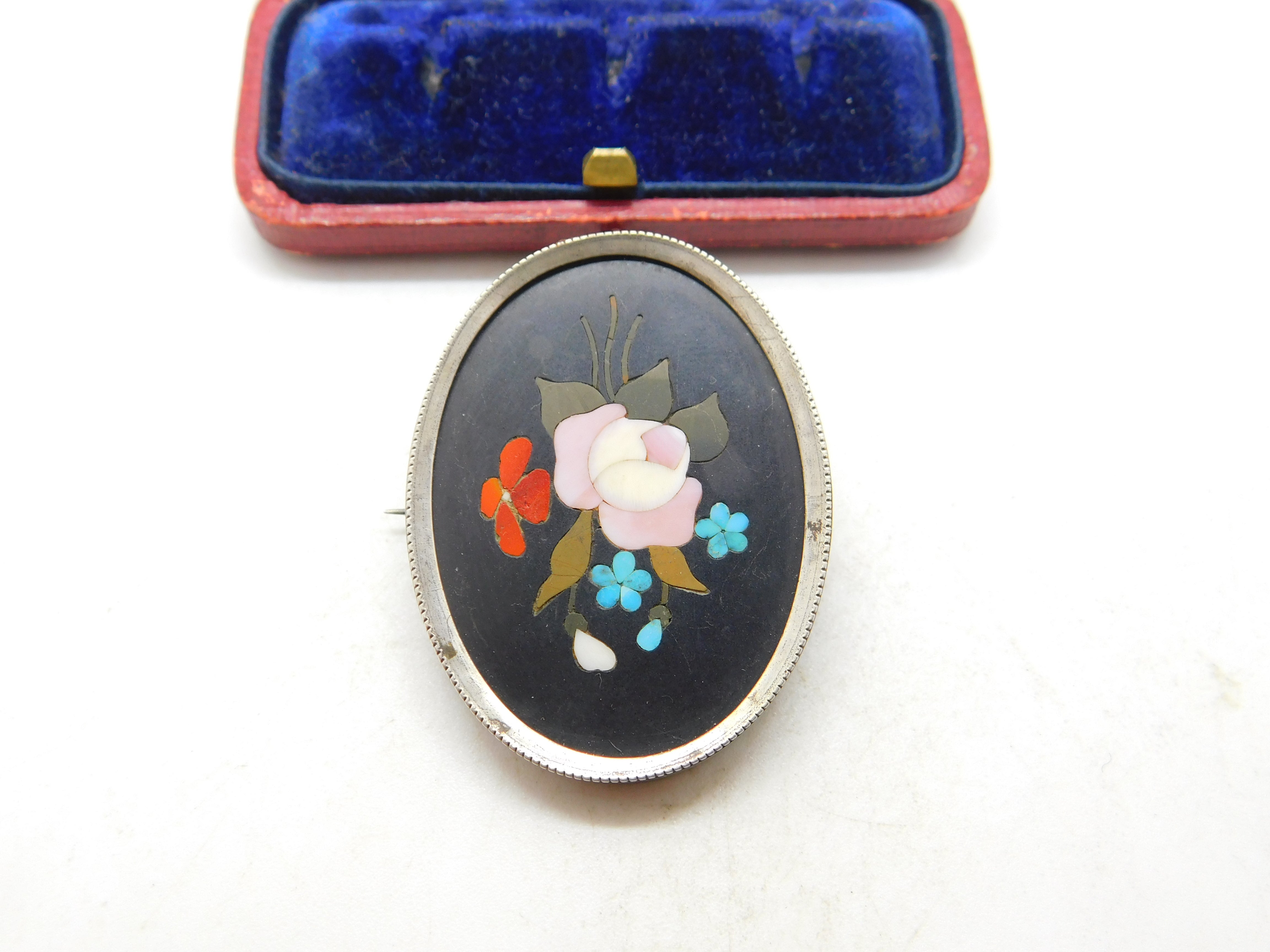 Charming pink rose and blue forget me not flowers to the centre of this pietra dura brooch or pin dating from the late Victorian period. The flower stones are set in black slate with a sterling silver frame, the silver has been tested as there are no marks. Very minor dings to the stones visible only on close inspection and not to the naked eye so in my opinion do not detract, please see the pictures. Good secure clasp and pin. A wonderful example of a Victorian pietra dura brooch.