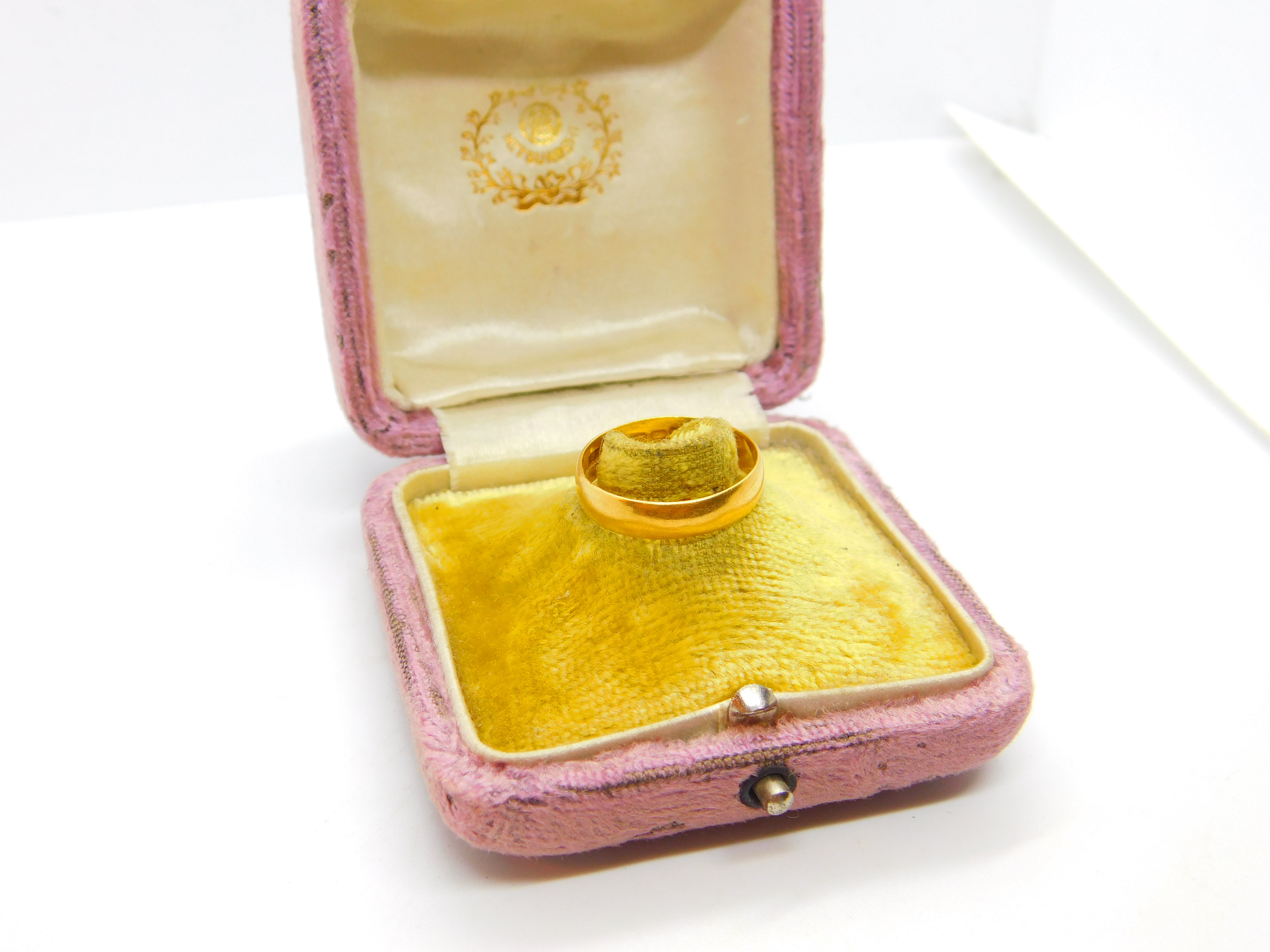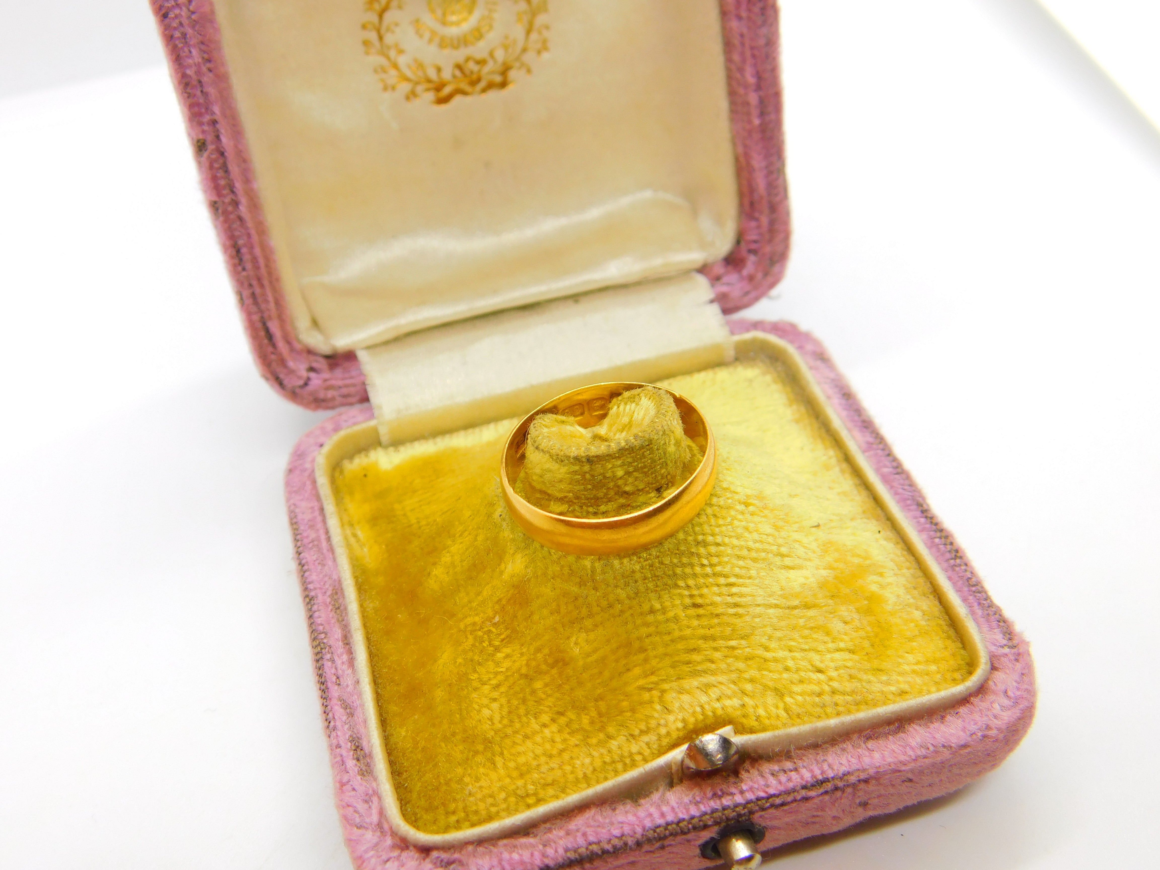 Fabulous antique English 22ct yellow gold wedding band or marriage ring dating from the Edwardian era. The gold is marked to the inside of the band, Birmingham assay with the date letter for the year 1911. Very slightly oval rather than round in shape, clearly has been worn and loved in the past.