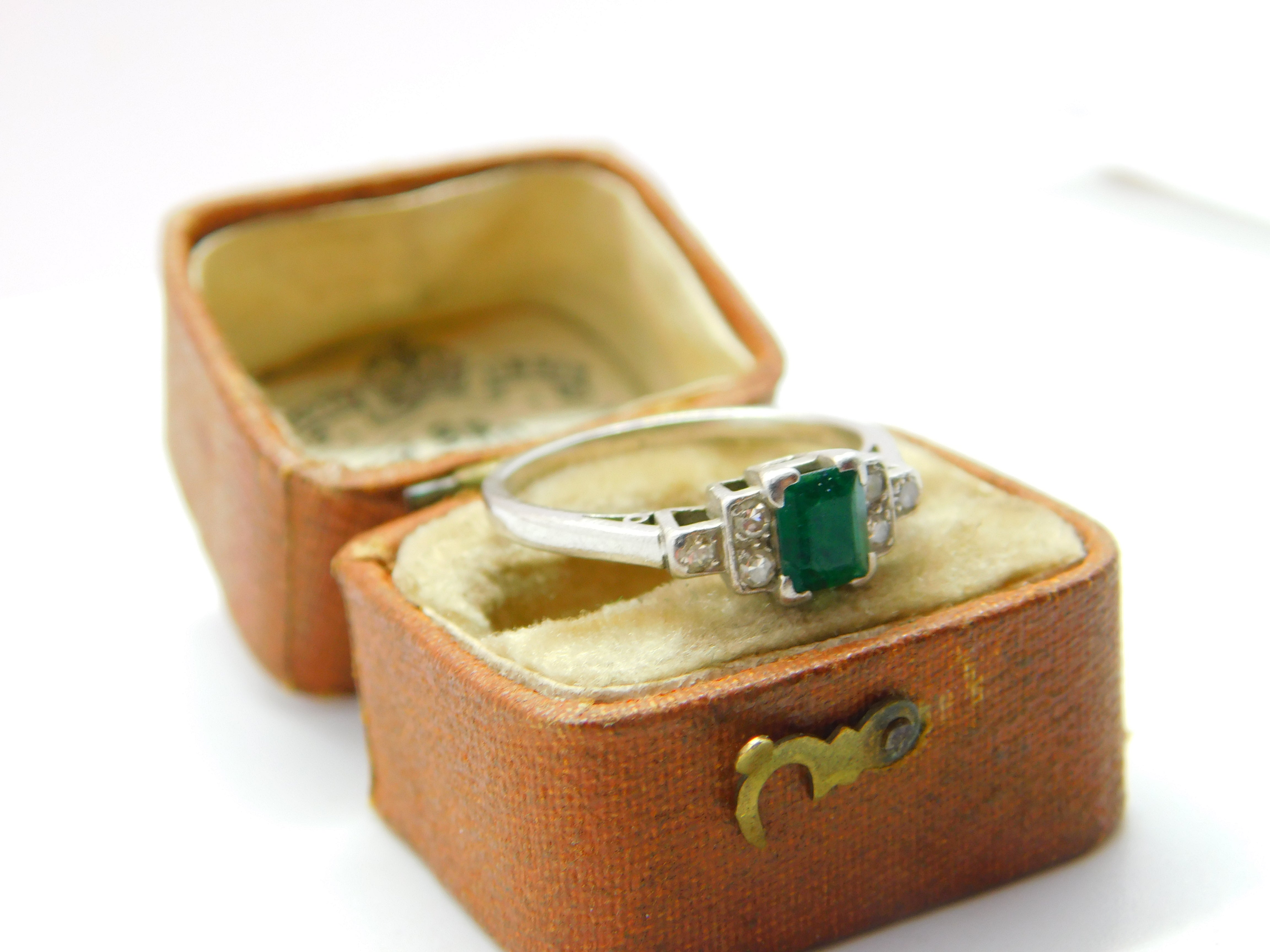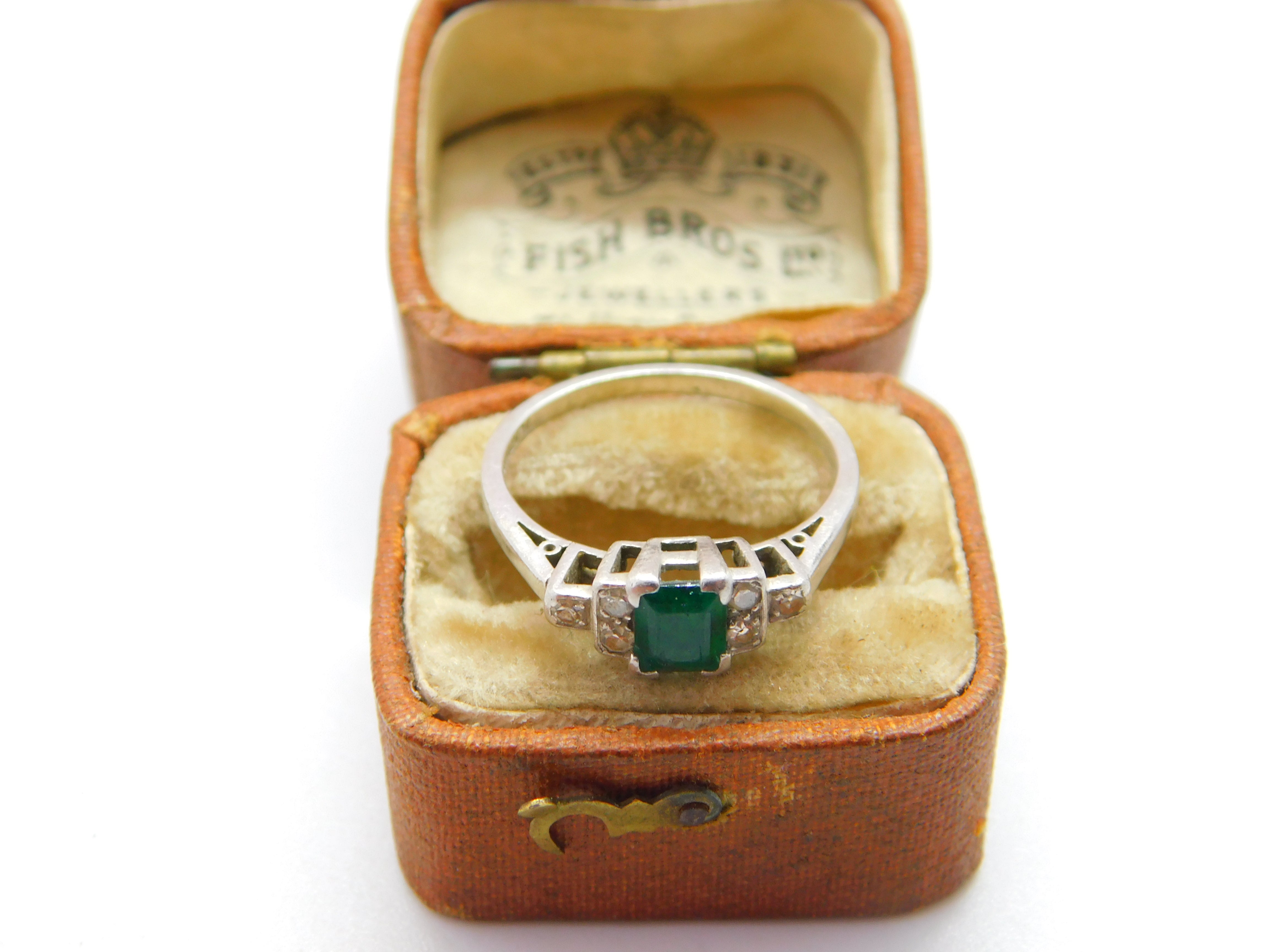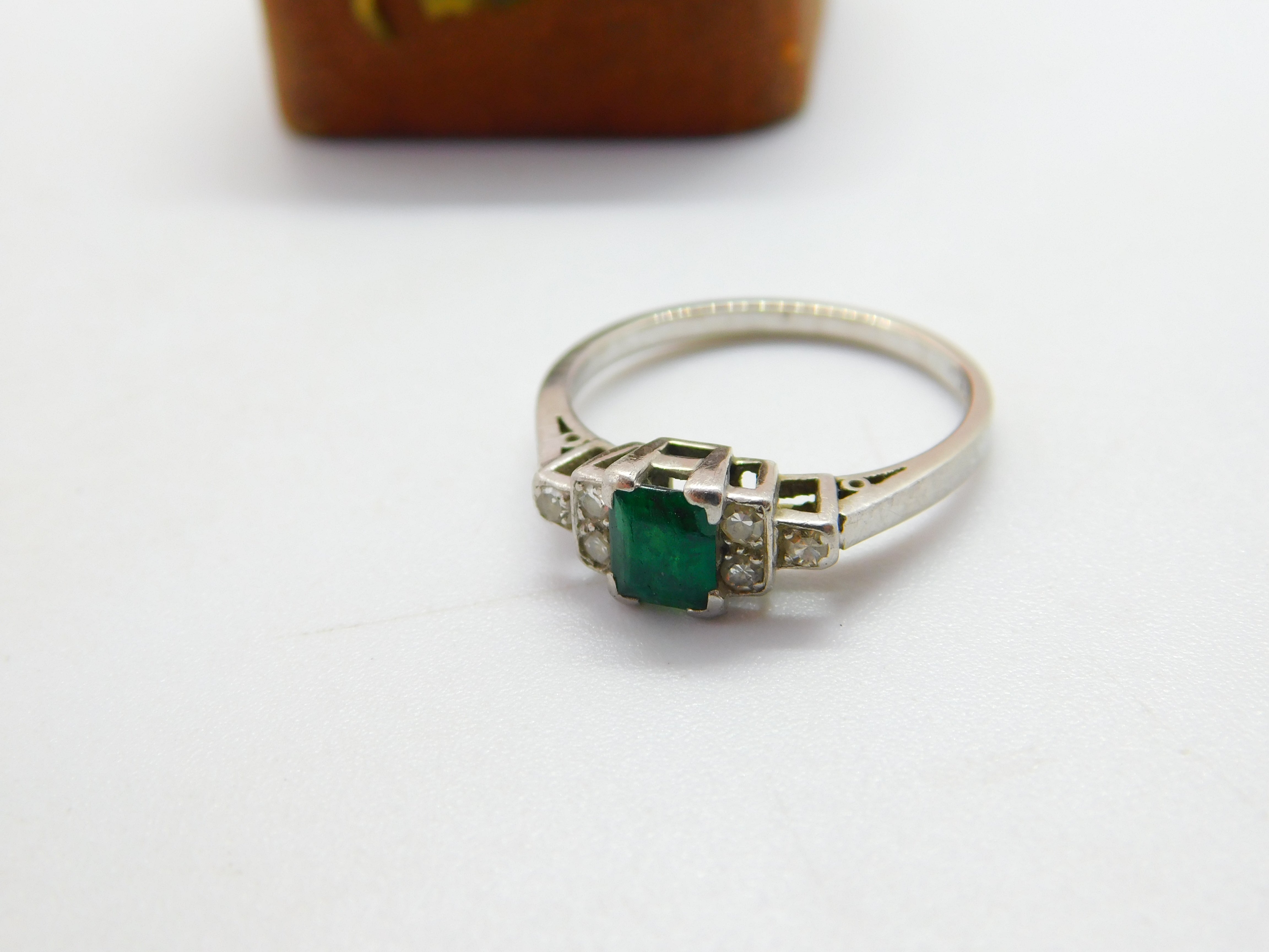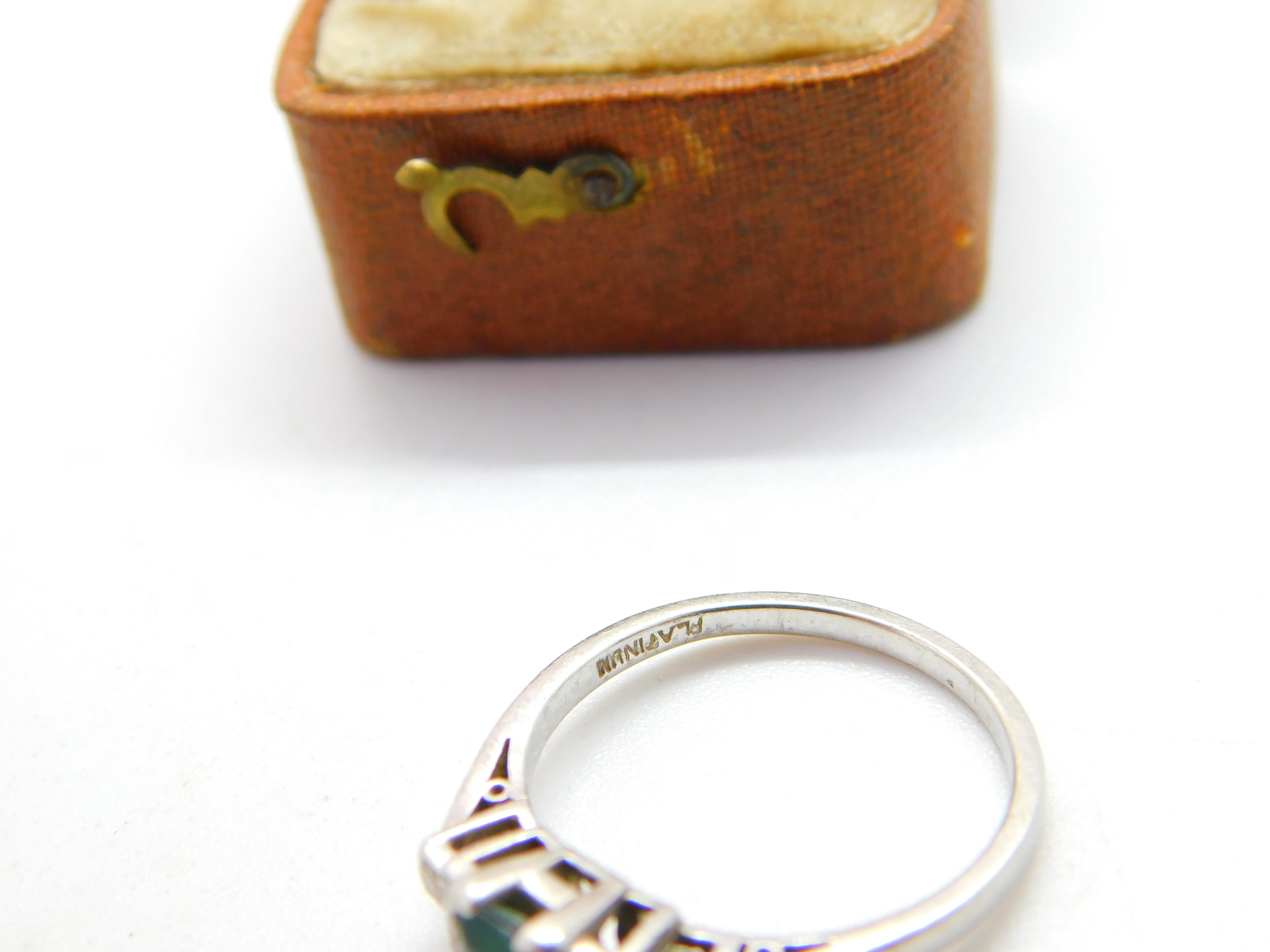 Details: A fantastic and wonderfully designed antique art deco platinum dress ring set with a central baguette cut emerald stone flanked by smaller diamonds hallmarked 'Platinum' to the inner band c1920. This is a wonderful item that would make a perfect gift or addition to any collection. The BOX pictured is for PRESENTATION ONLY and is NOT included in the listings but used to frame the pictures unless specifically stated otherwise.