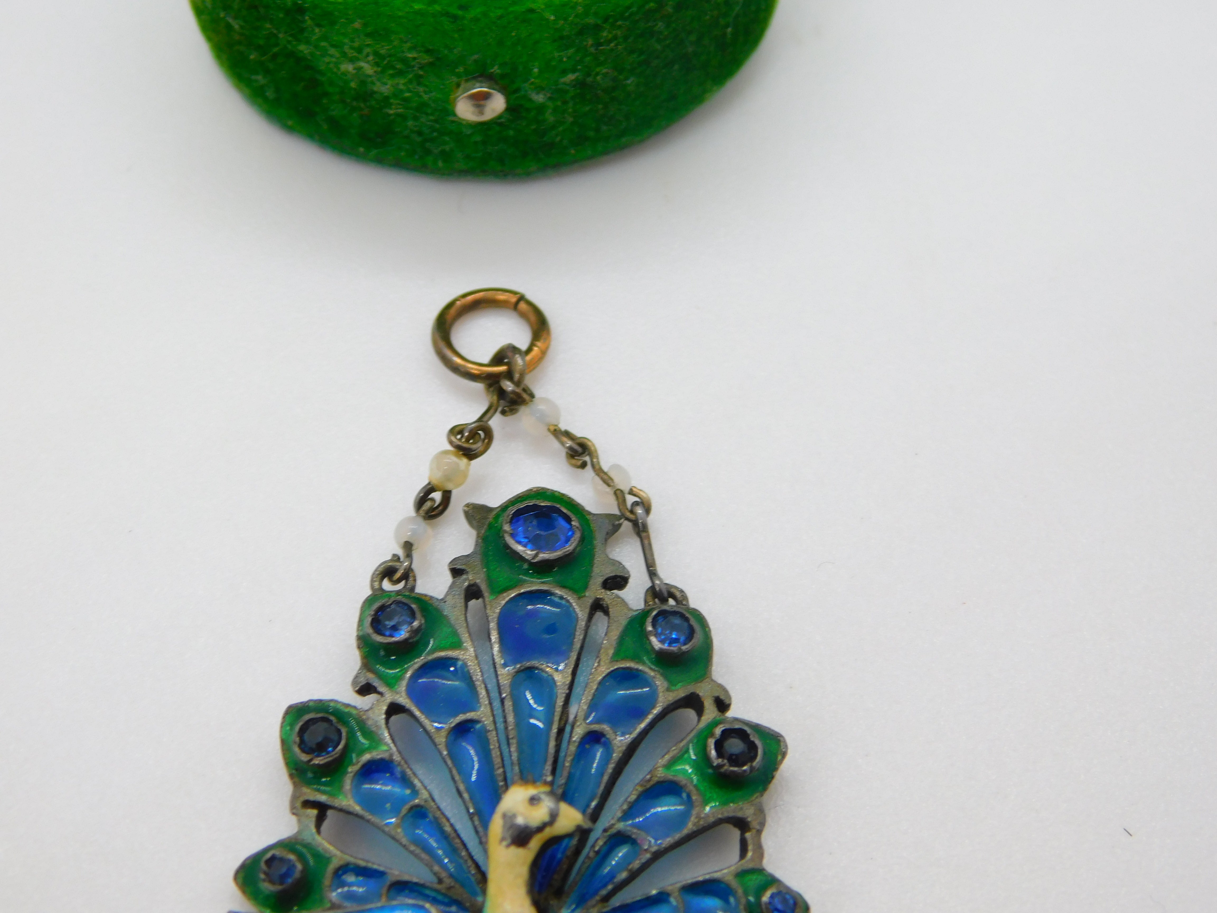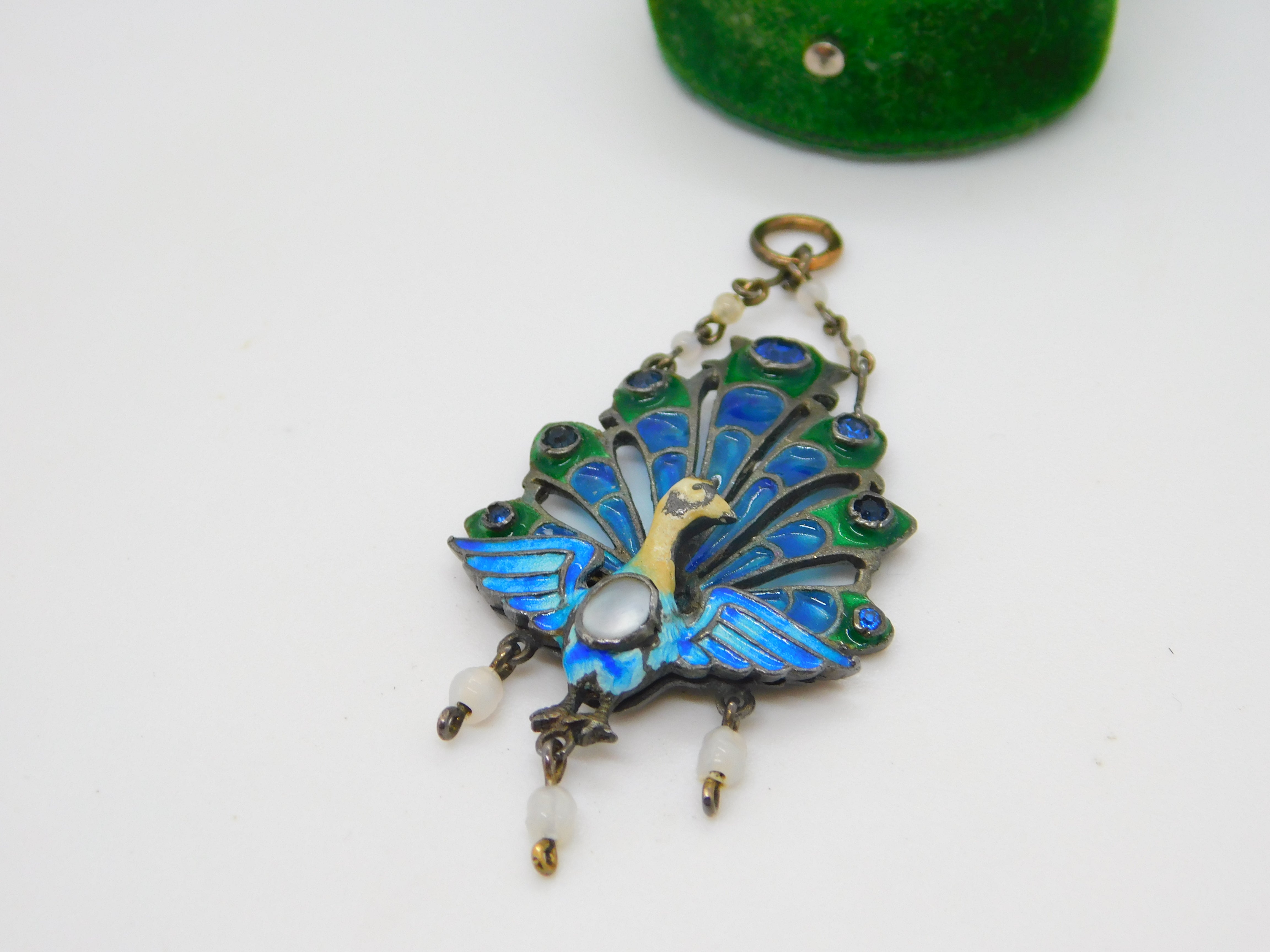 Details: A fantastic and wonderfully designed antique art deco French sterling silver plique-à-jour enamel peacock drop pendant set with mother of pearl and moonstones hallmarked to the reverse c1930. Minor chipping to the enamel but generally a super pendant. This is a wonderful item that would make a perfect gift or addition to any collection. The BOX pictured is for PRESENTATION ONLY and is NOT included in the listings but used to frame the pictures unless specifically stated otherwise.