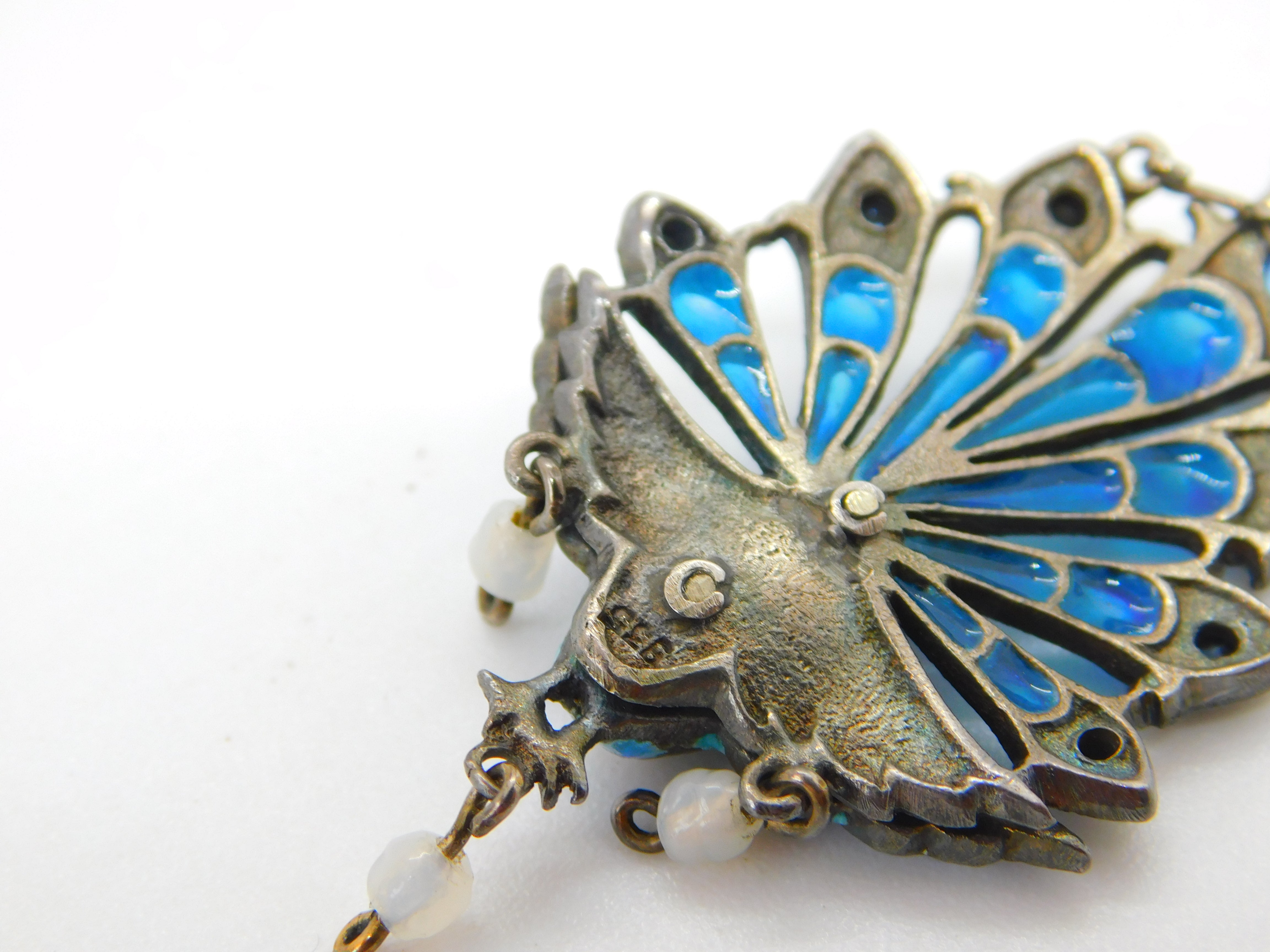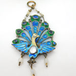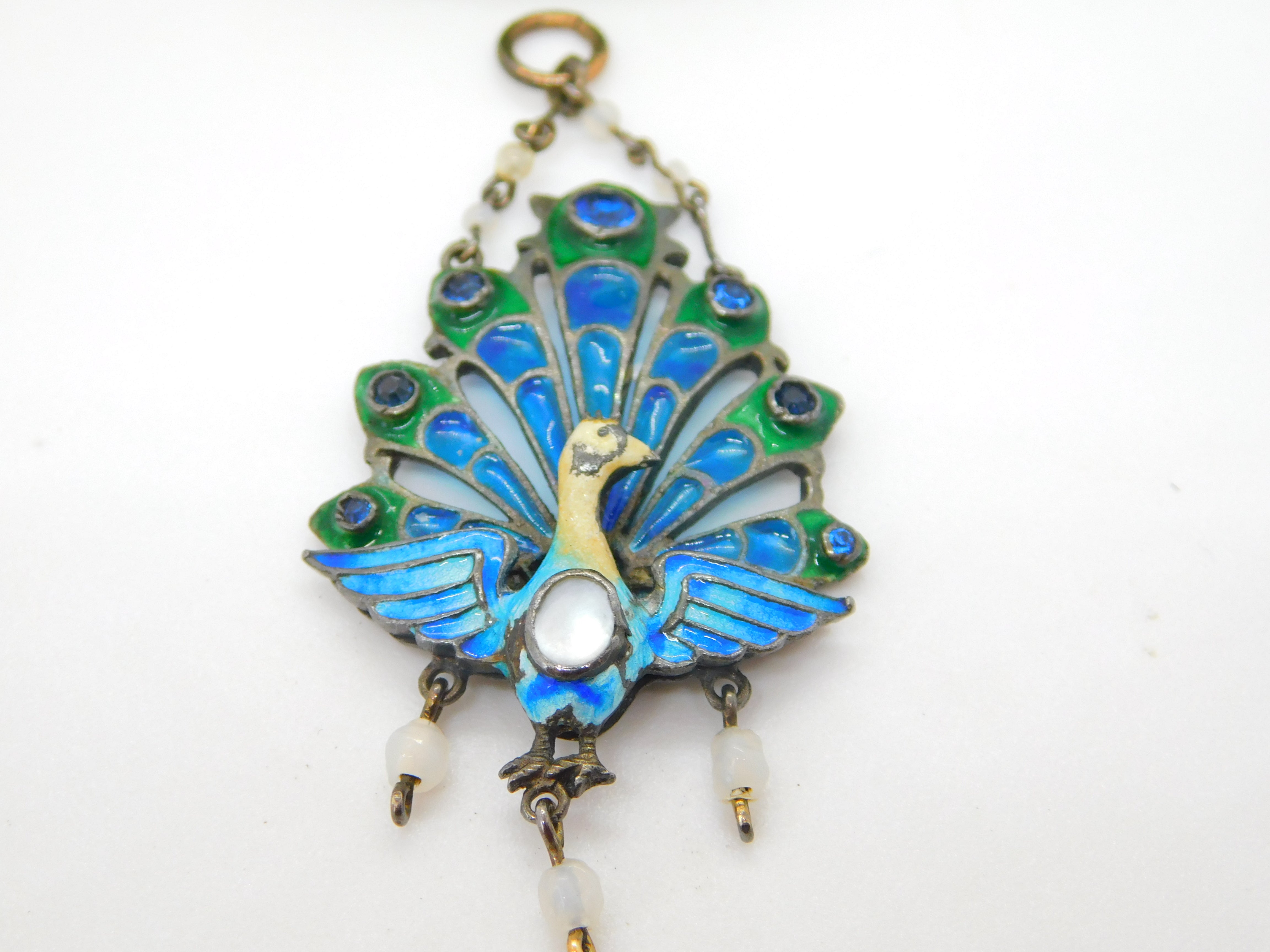 Plique-à-jour Sterling Silver Enamel, Moonstone Peacock Drop Pendant Antique