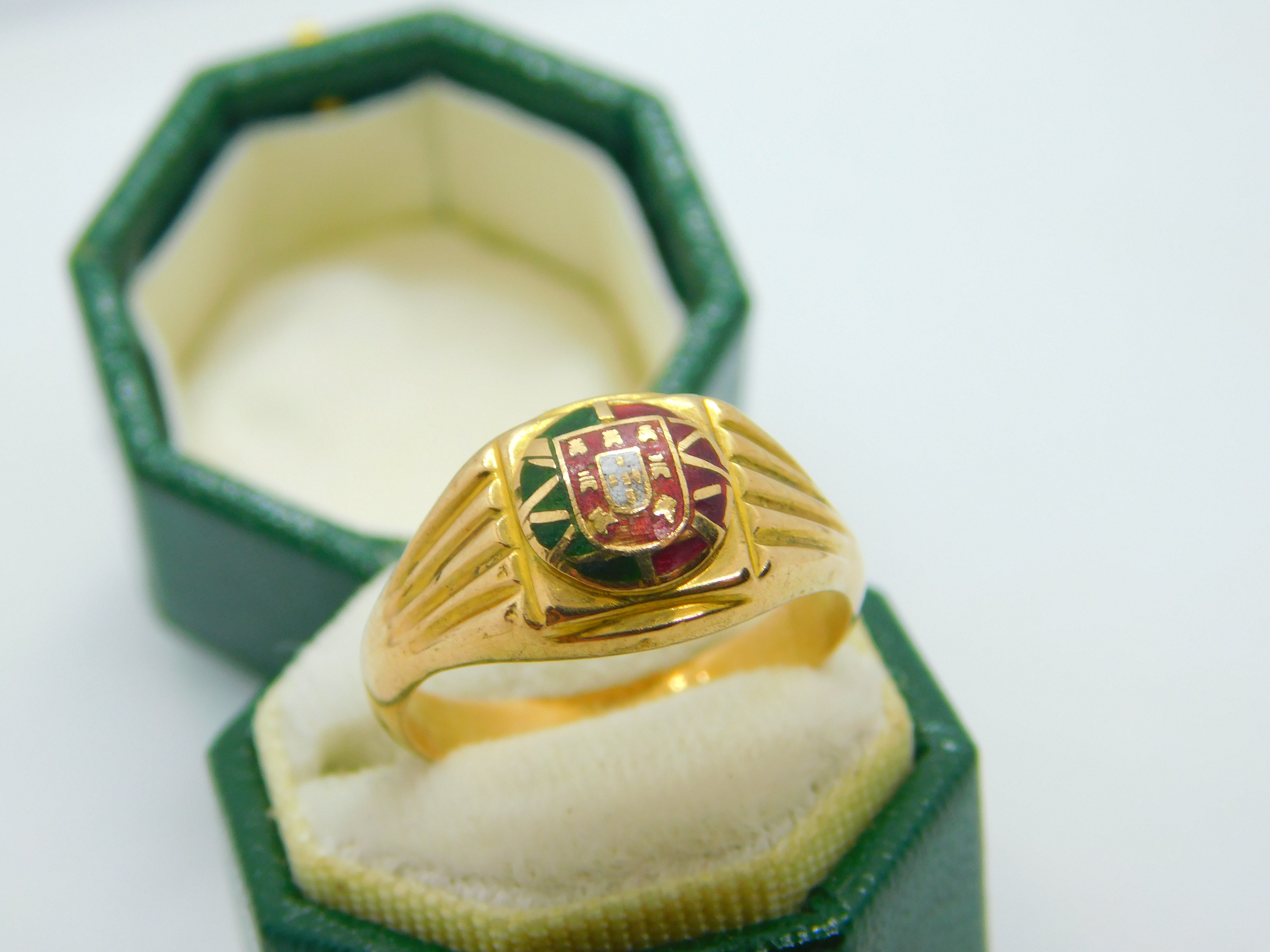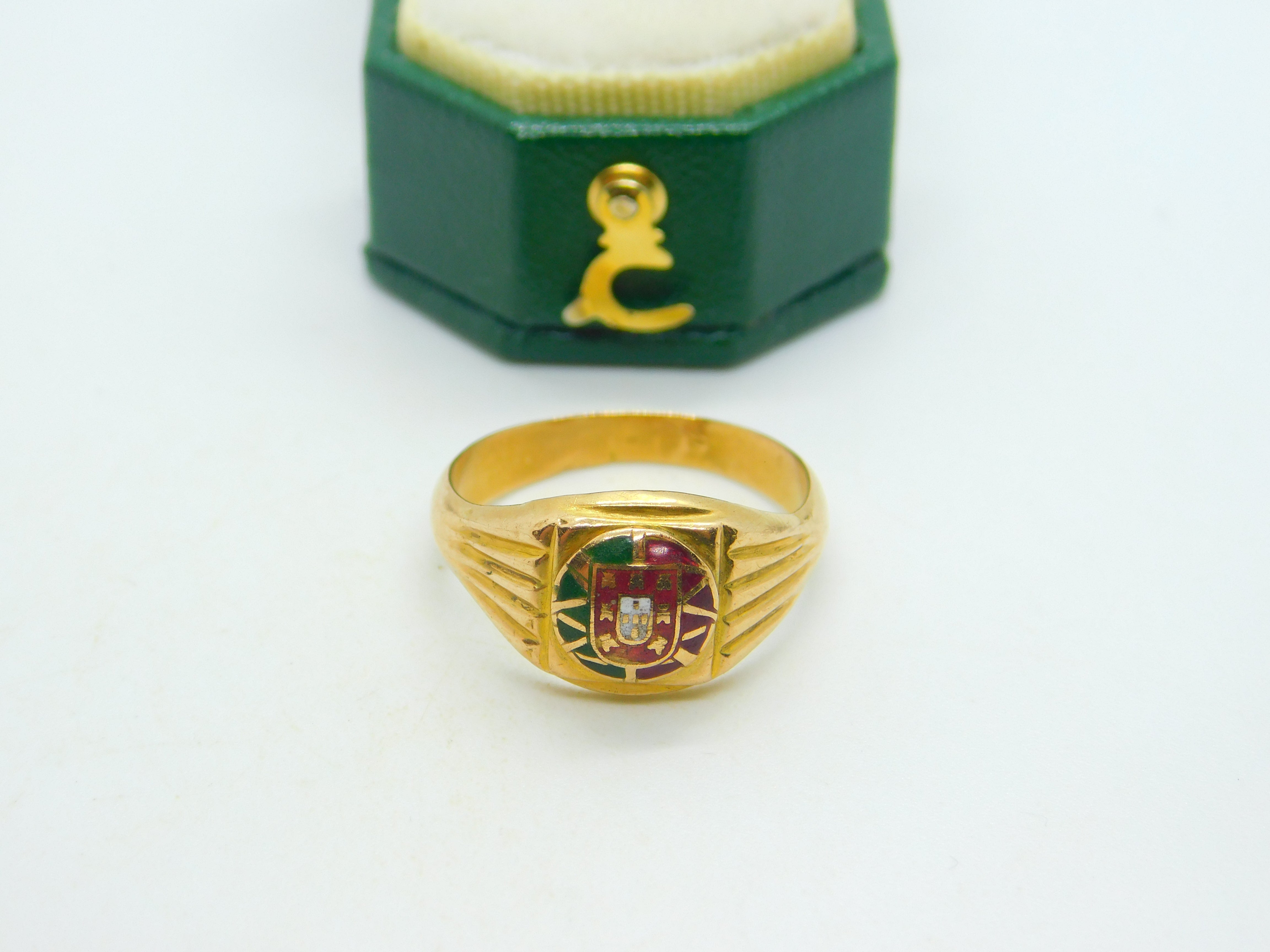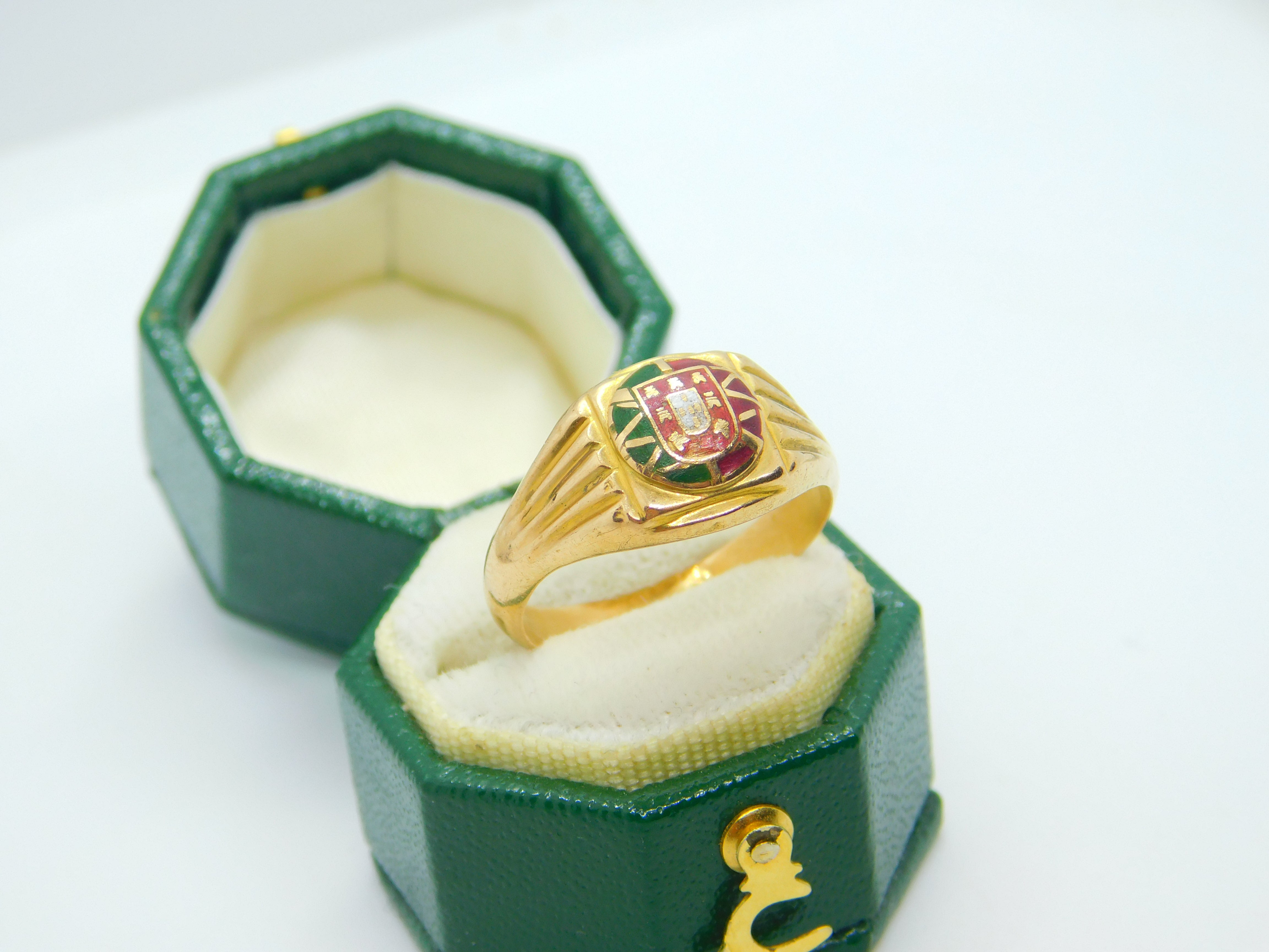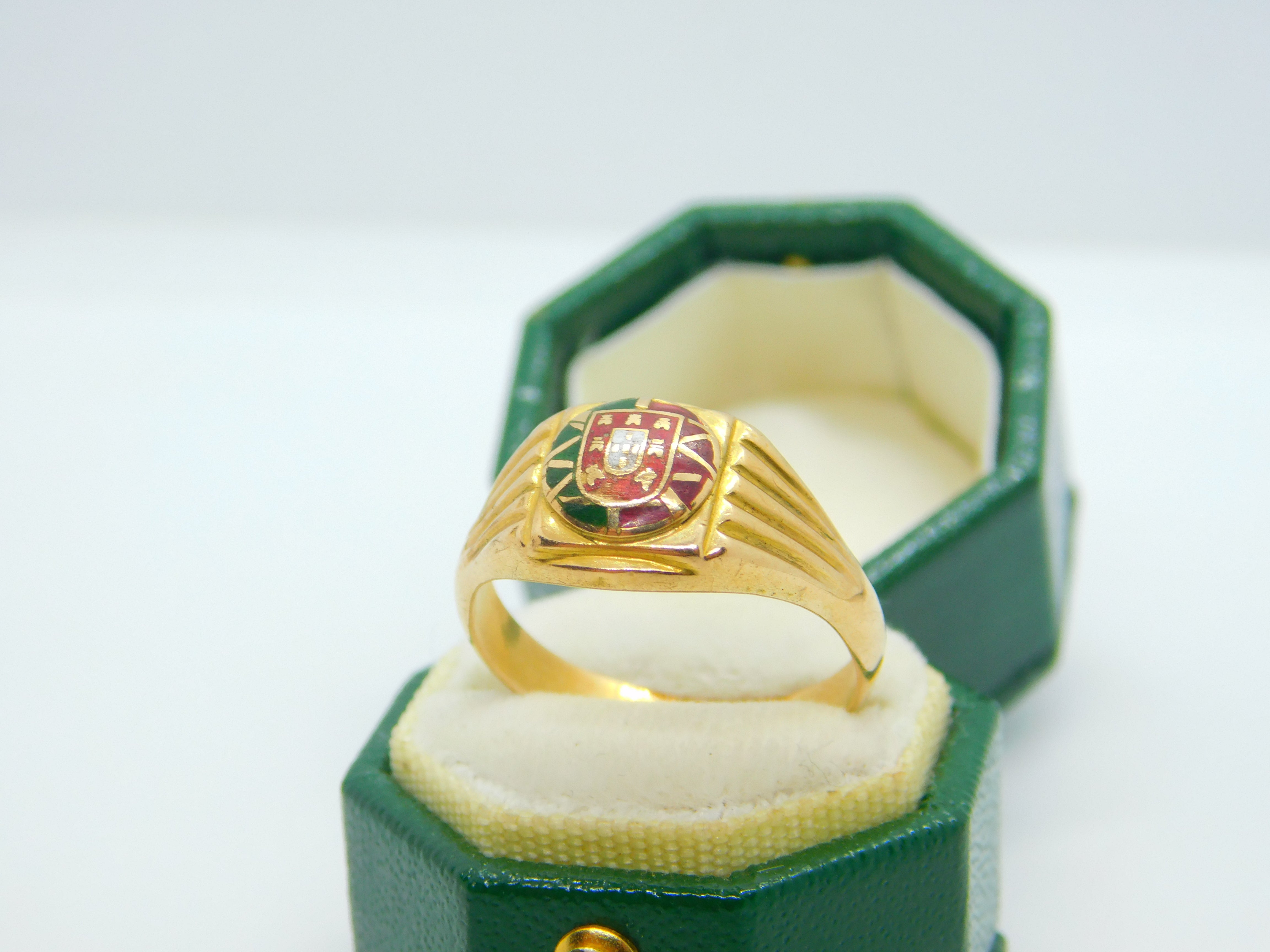 Details: A fantastic and wonderfully designed antique art deco Portuguese 19ct yellow gold signet ring set with central enamel flag crest hallmarked to the reverse of the band and XRF tested c1930. This is a wonderful item that would make a perfect gift or addition to any collection. The BOX pictured is for PRESENTATION ONLY and is NOT included in the listings but used to frame the pictures unless specifically stated otherwise.
