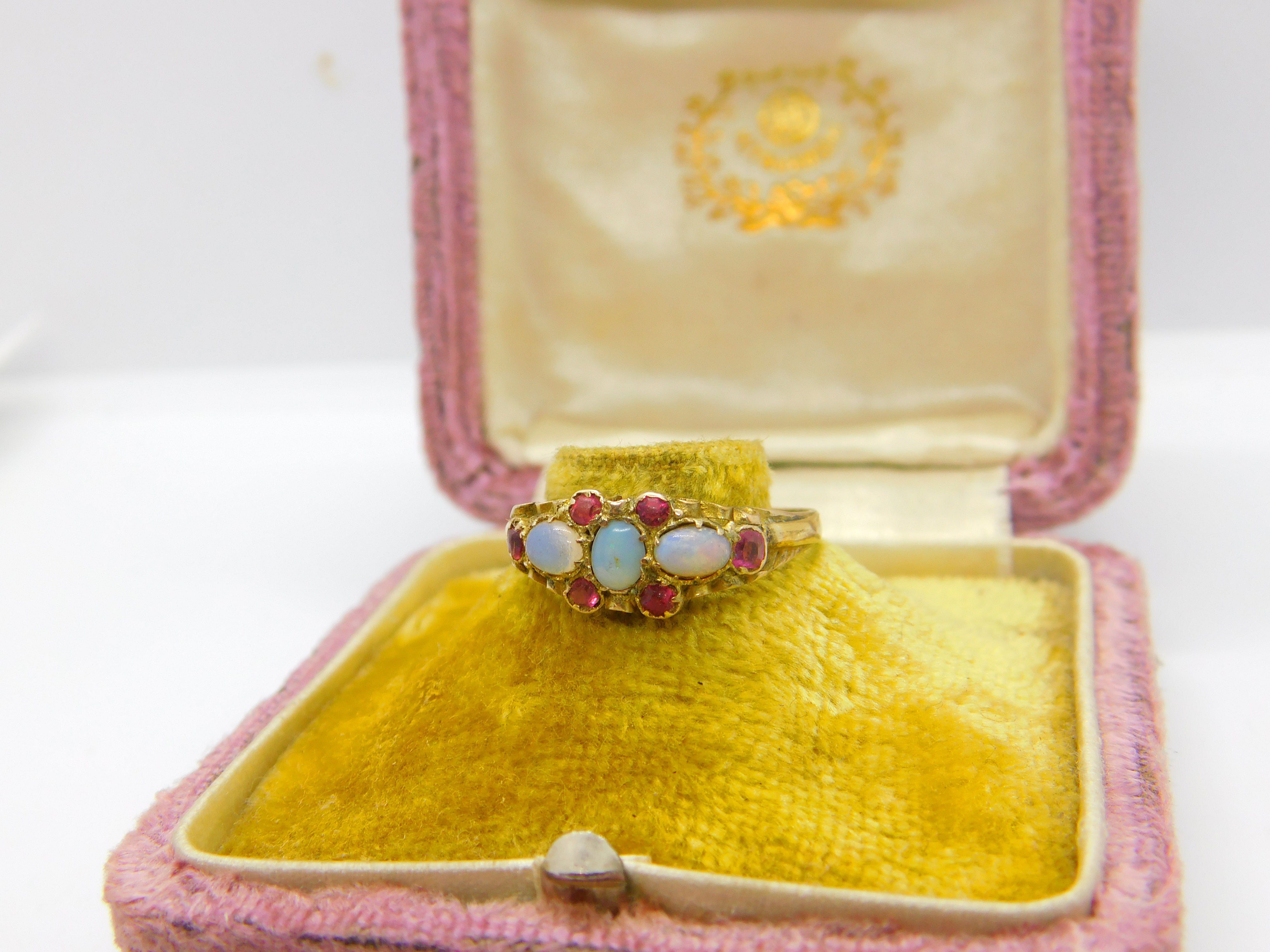 Details: A fantastic and wonderfully designed antique regency period 18ct yellow gold floral pattern band ring set with water opals and natural ruby stones c1840. The opals are all of different opacity and the left side opal appears to be a fire opal rather than a water opal. The gold has been XRF tested. Very minor nibbles to the stones seen under magnification. This is a wonderful item that would make a perfect gift or addition to any collection. The BOX pictured is for PRESENTATION ONLY and is NOT included in the listings but used to frame the pictures unless specifically stated otherwise.
