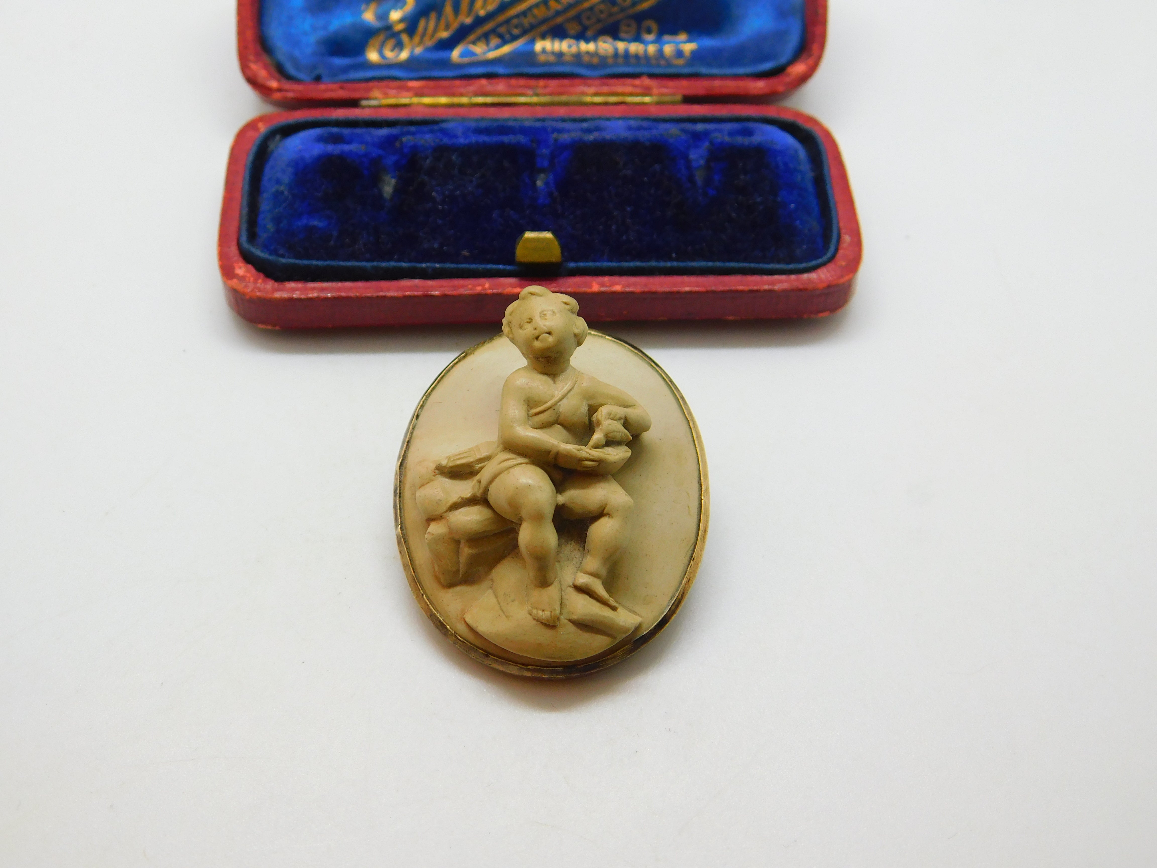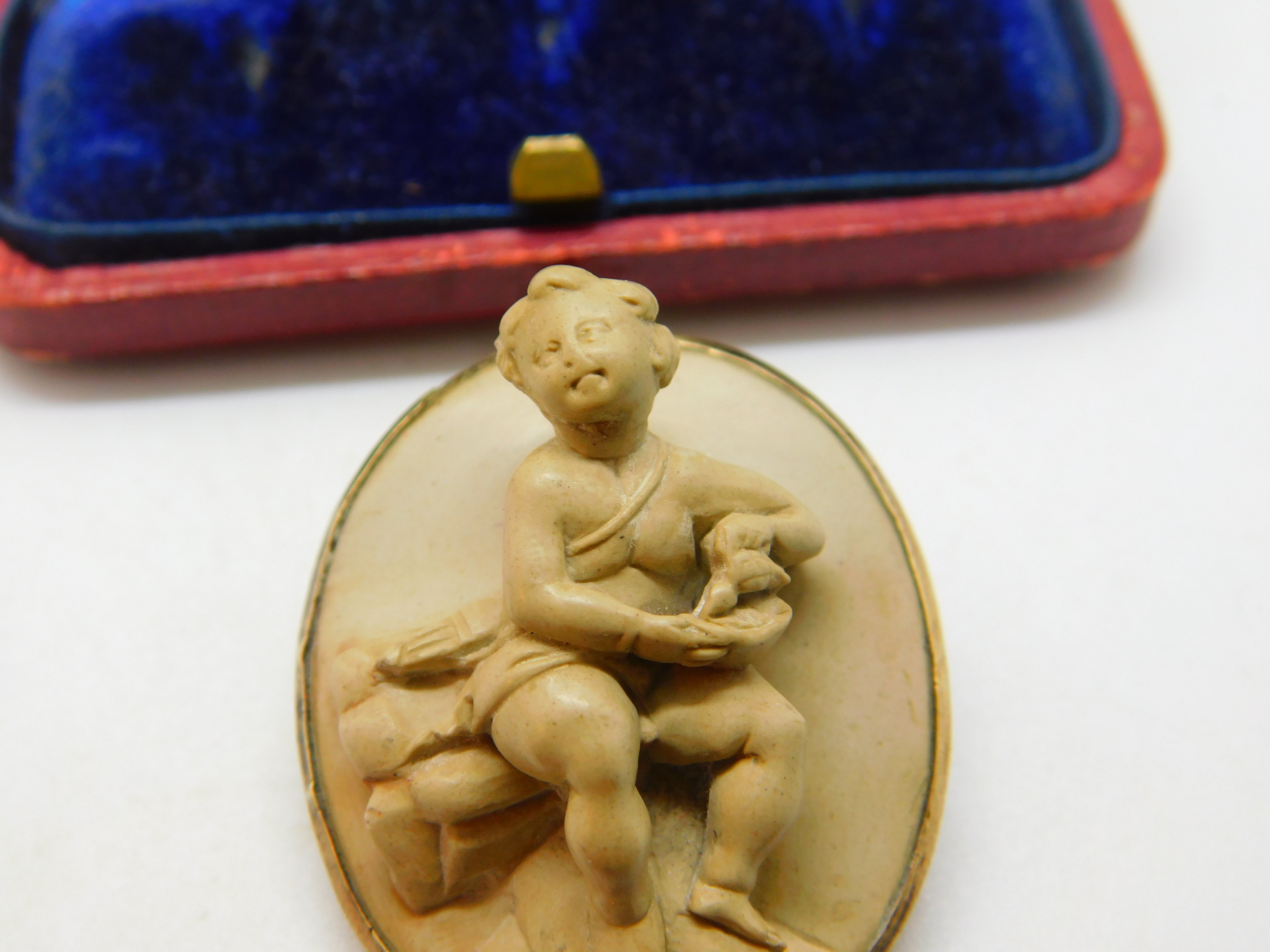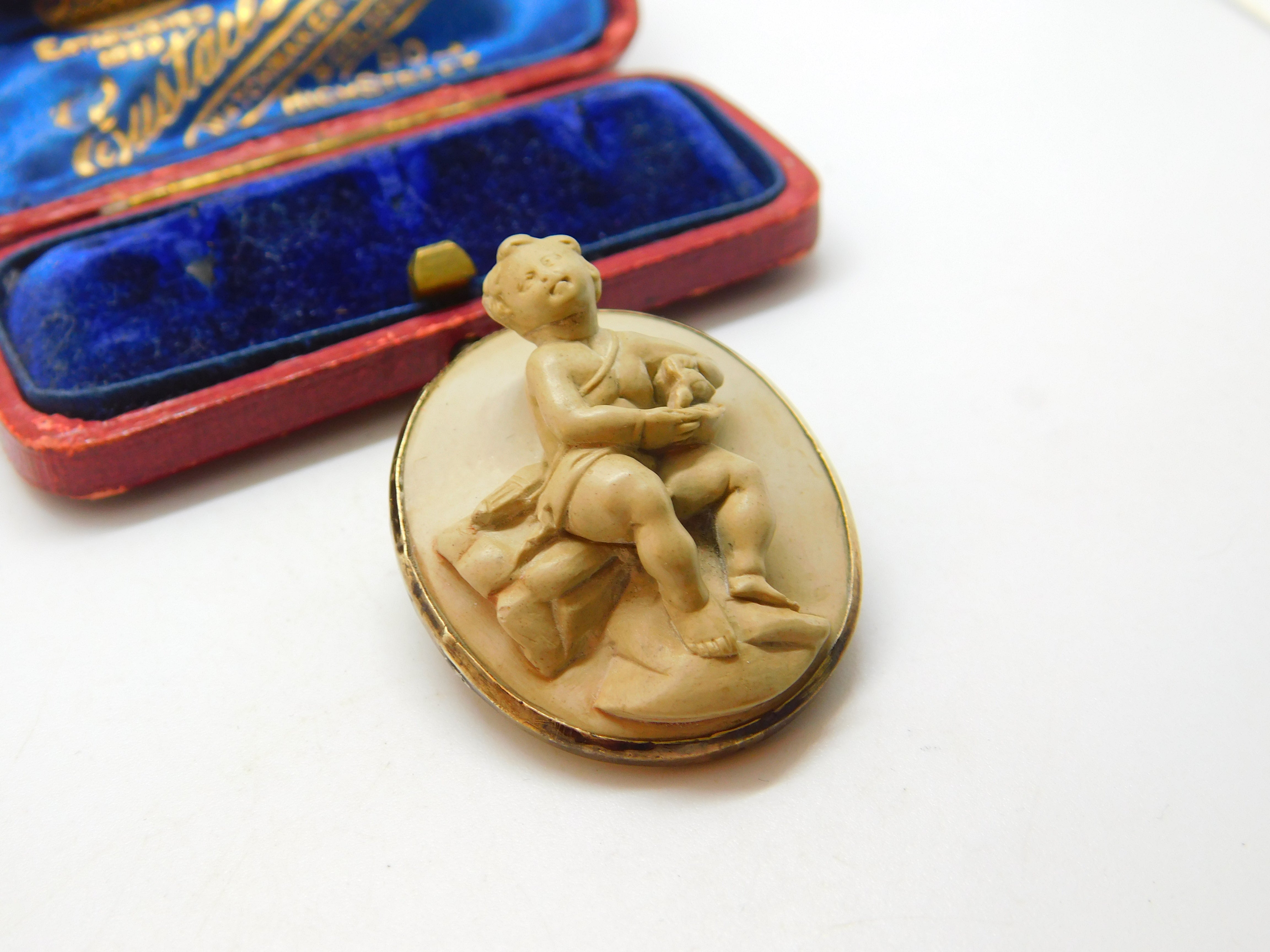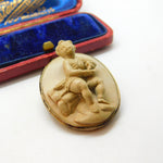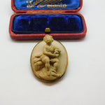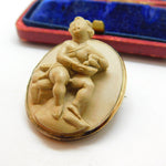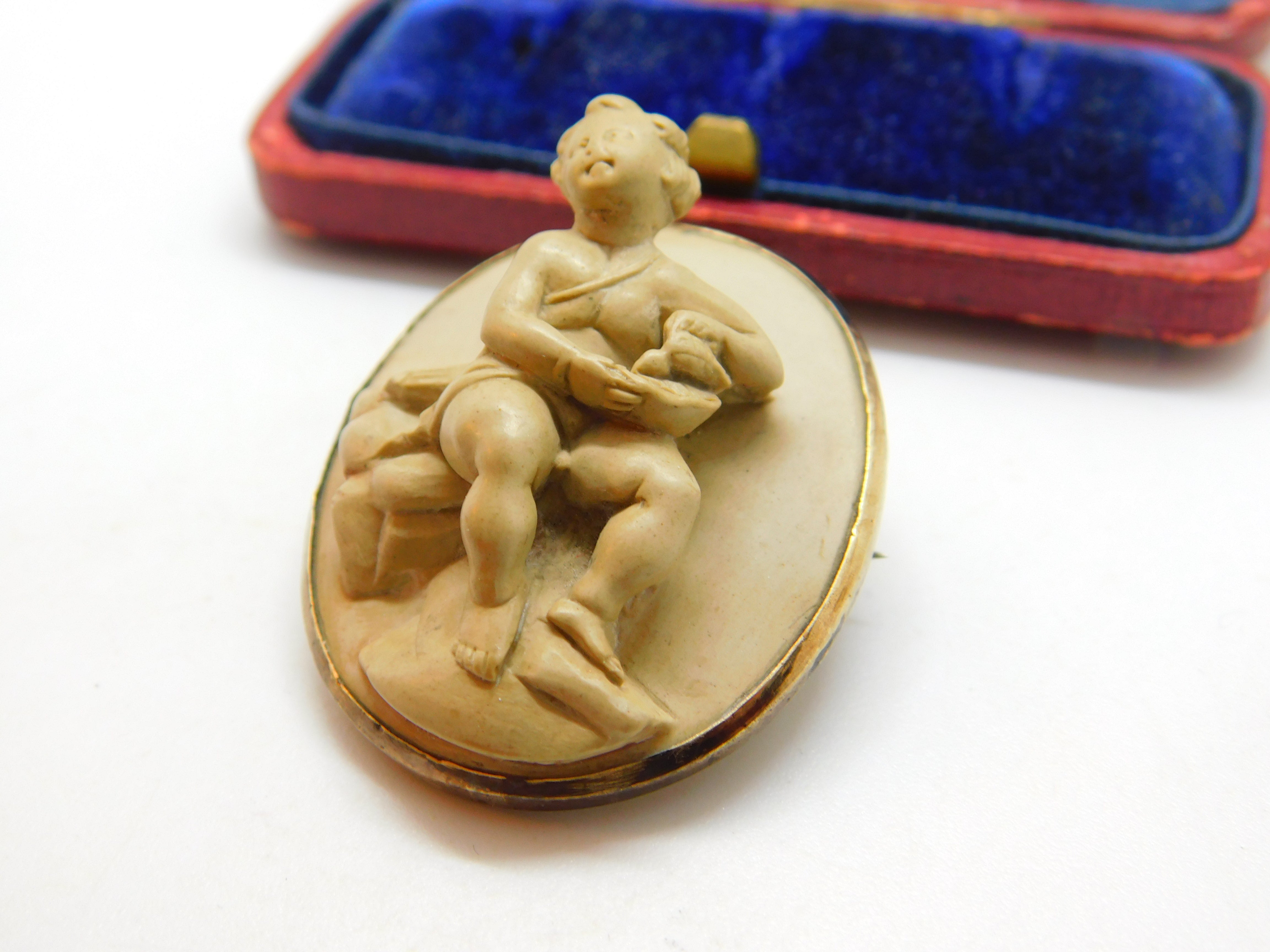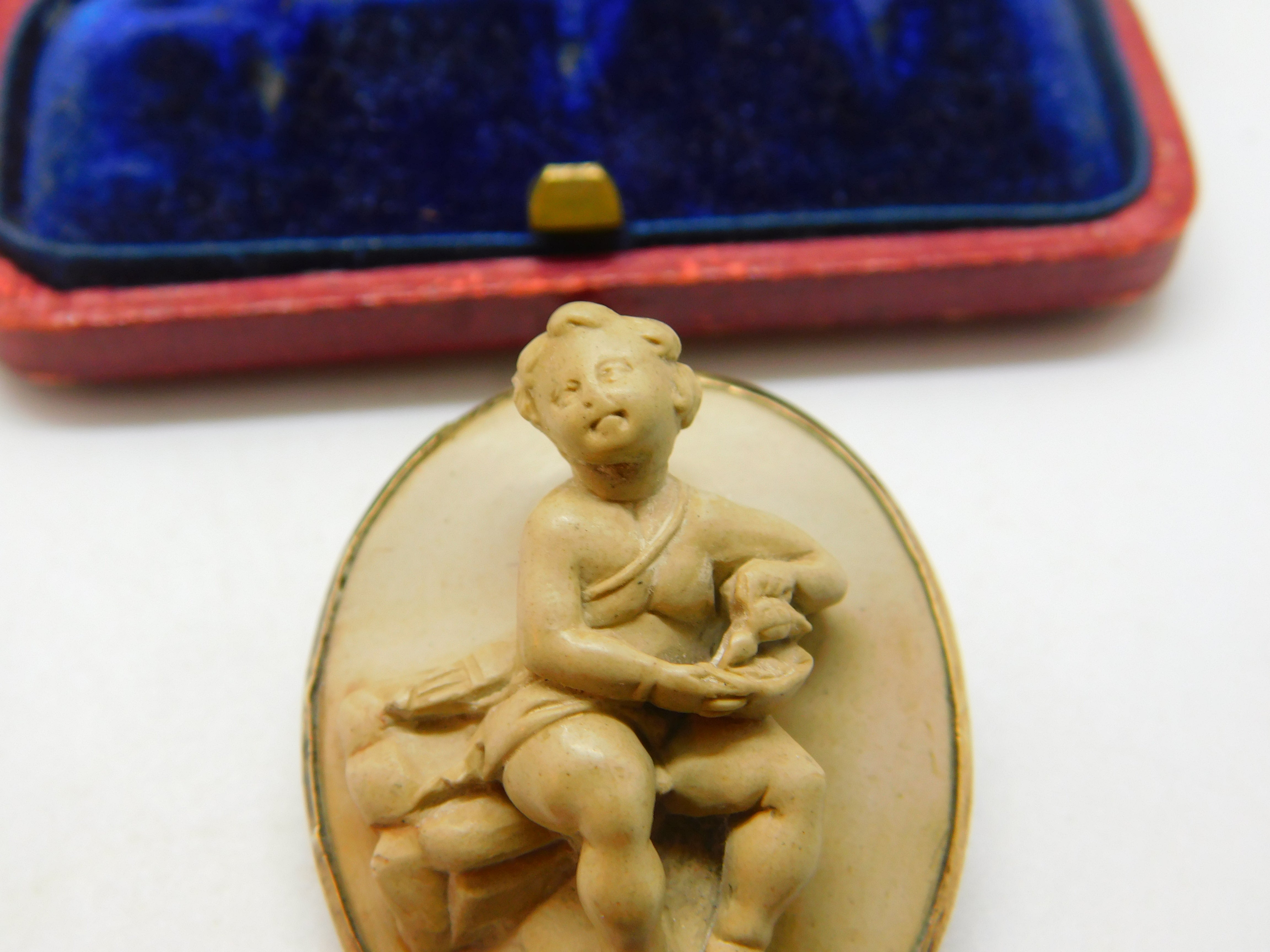 Regency Grand Tour Gold Set Carved Lava Cherub Baby High Relief Cameo Brooch c1830